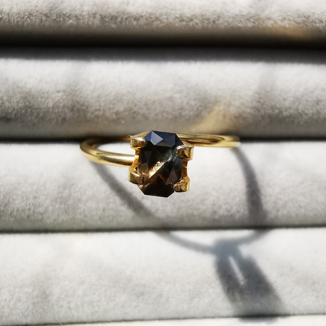 しかし一転、直射日光などの強い光に当たると、シラーがギラリとゴールドにきらめき石を斜めに横断、劇的な効果をもたらします。