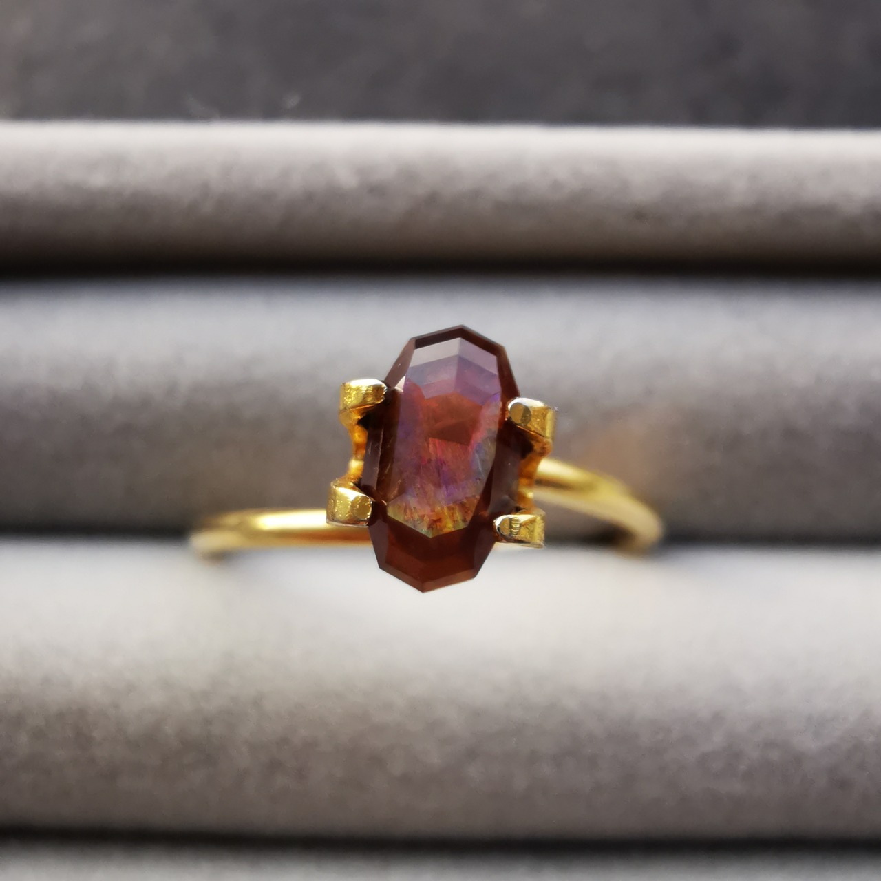 レインボーガーネットの魅力はなんと言っても、とても地味な石からは想像もつかないような虹色がきらめくところです。