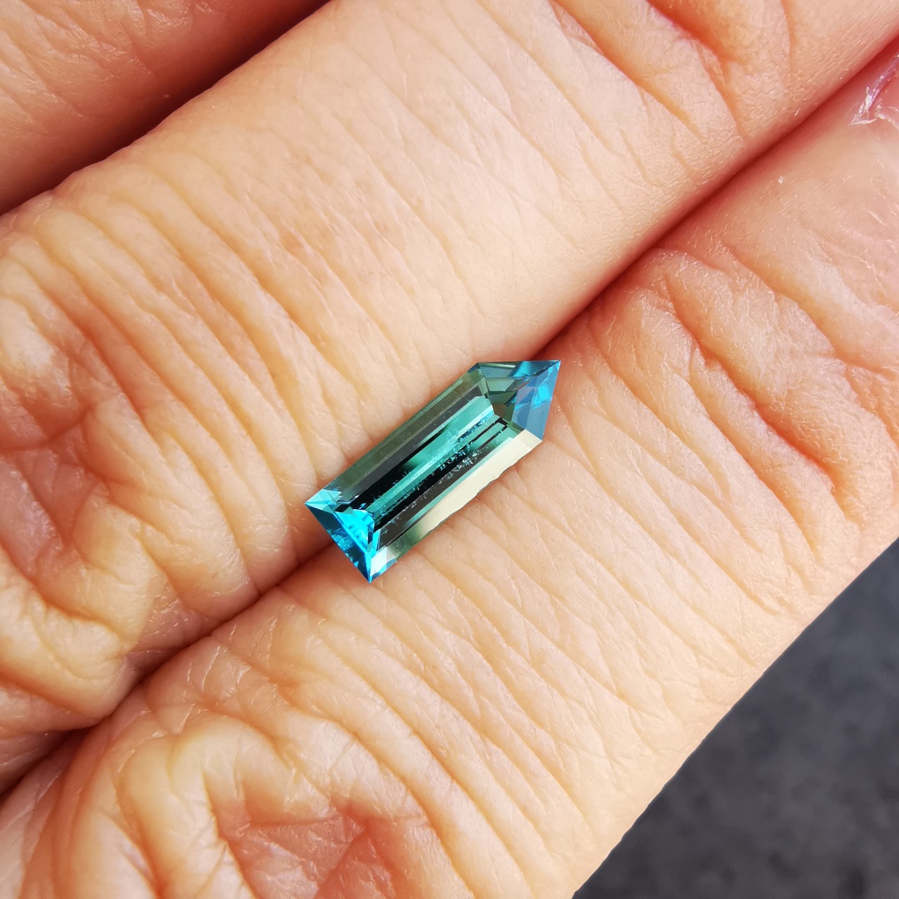 明るい緑みの青、新橋色が眩しいほどにきらめくトルマリンです。