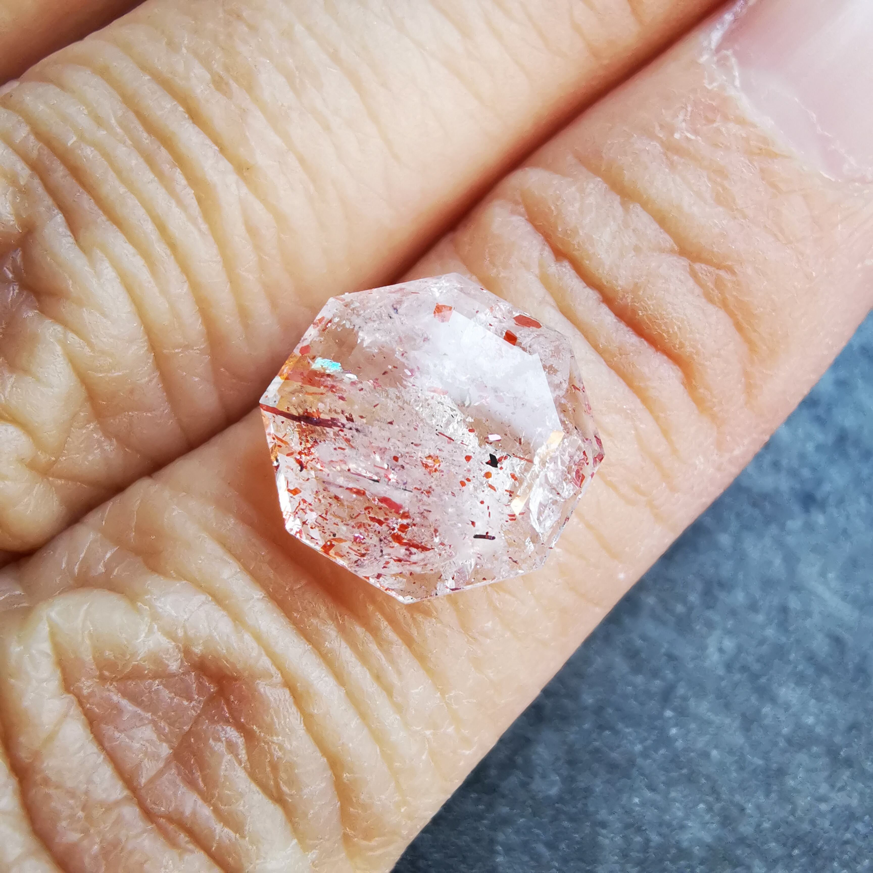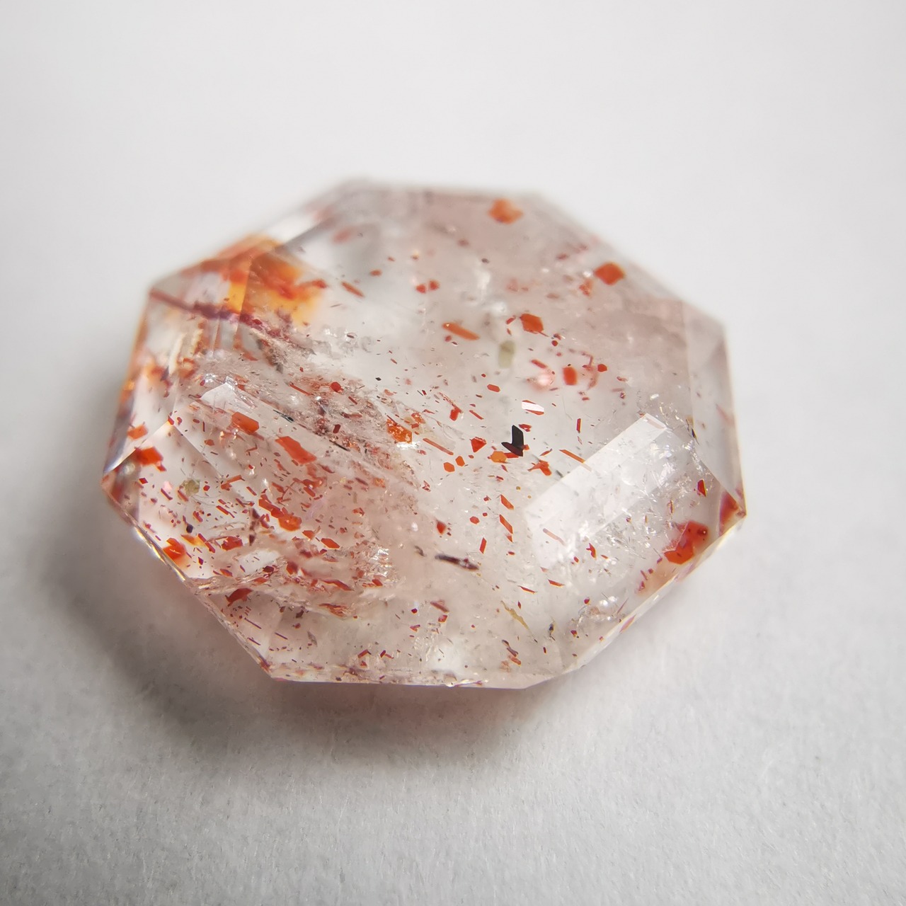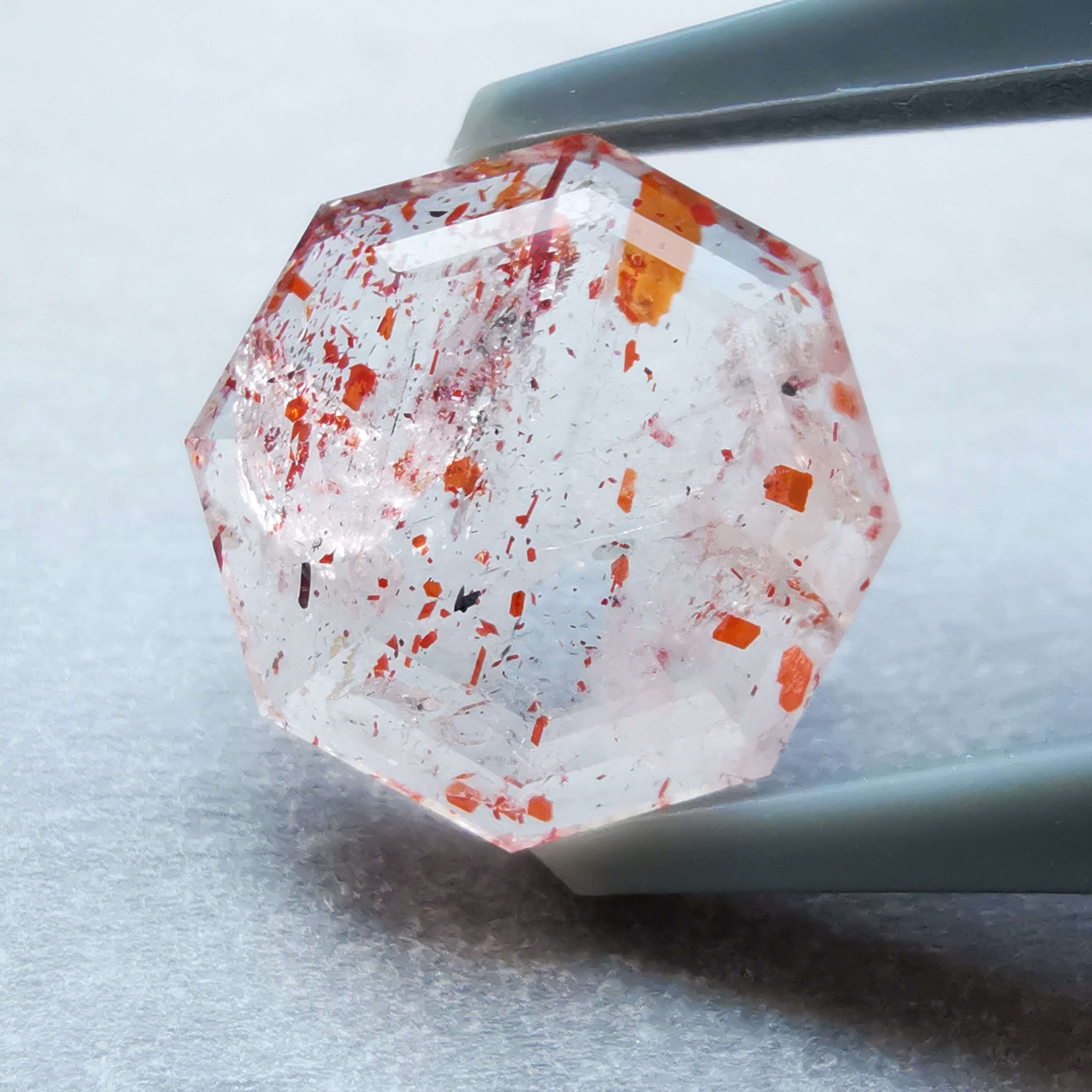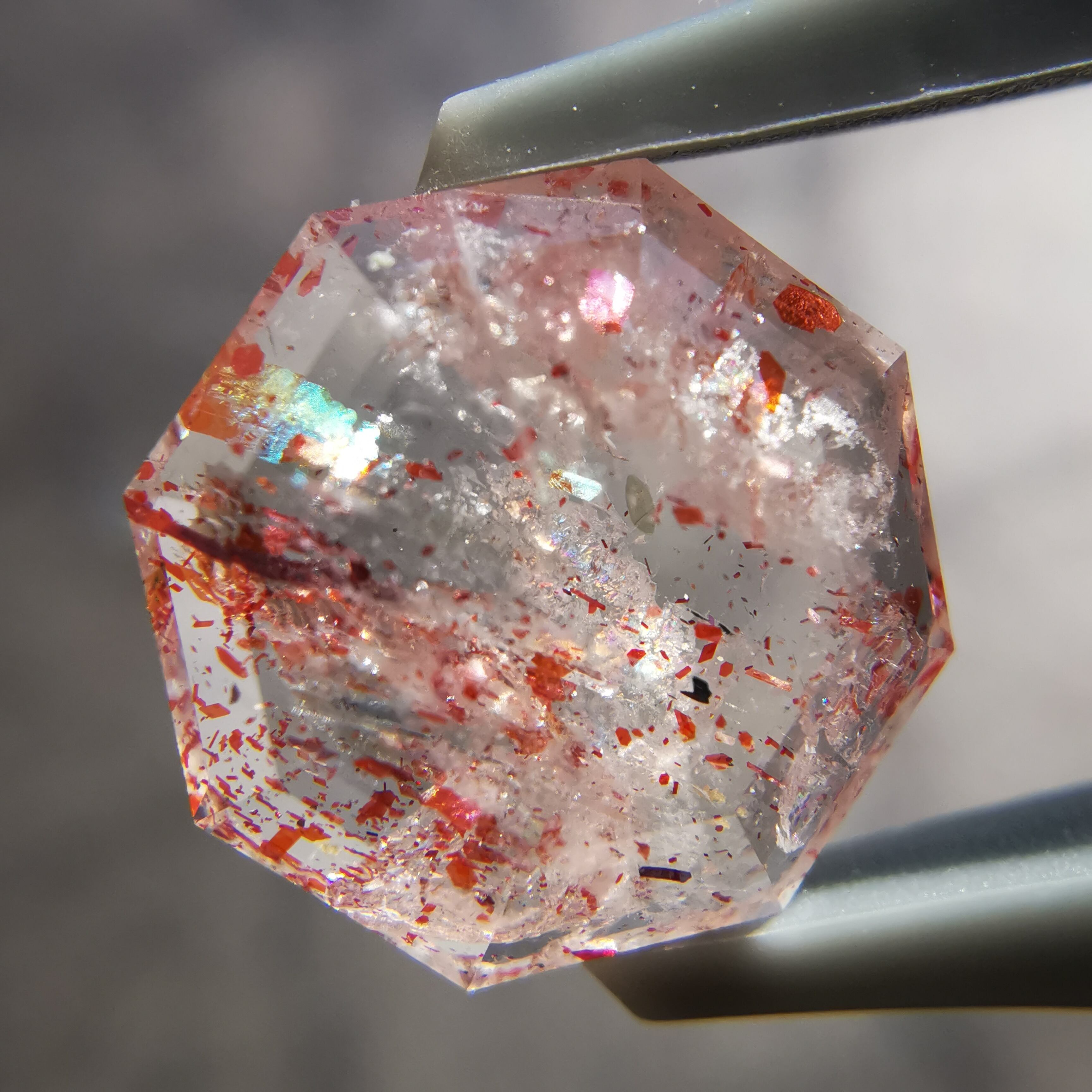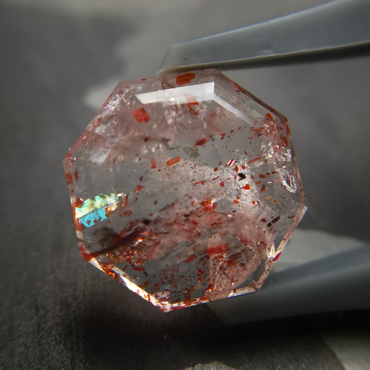 長石の一種、オリゴクレースに入った朱色のヘマタイトに光が当たると、青緑やピンクのラメのようにキラキラと輝きます。