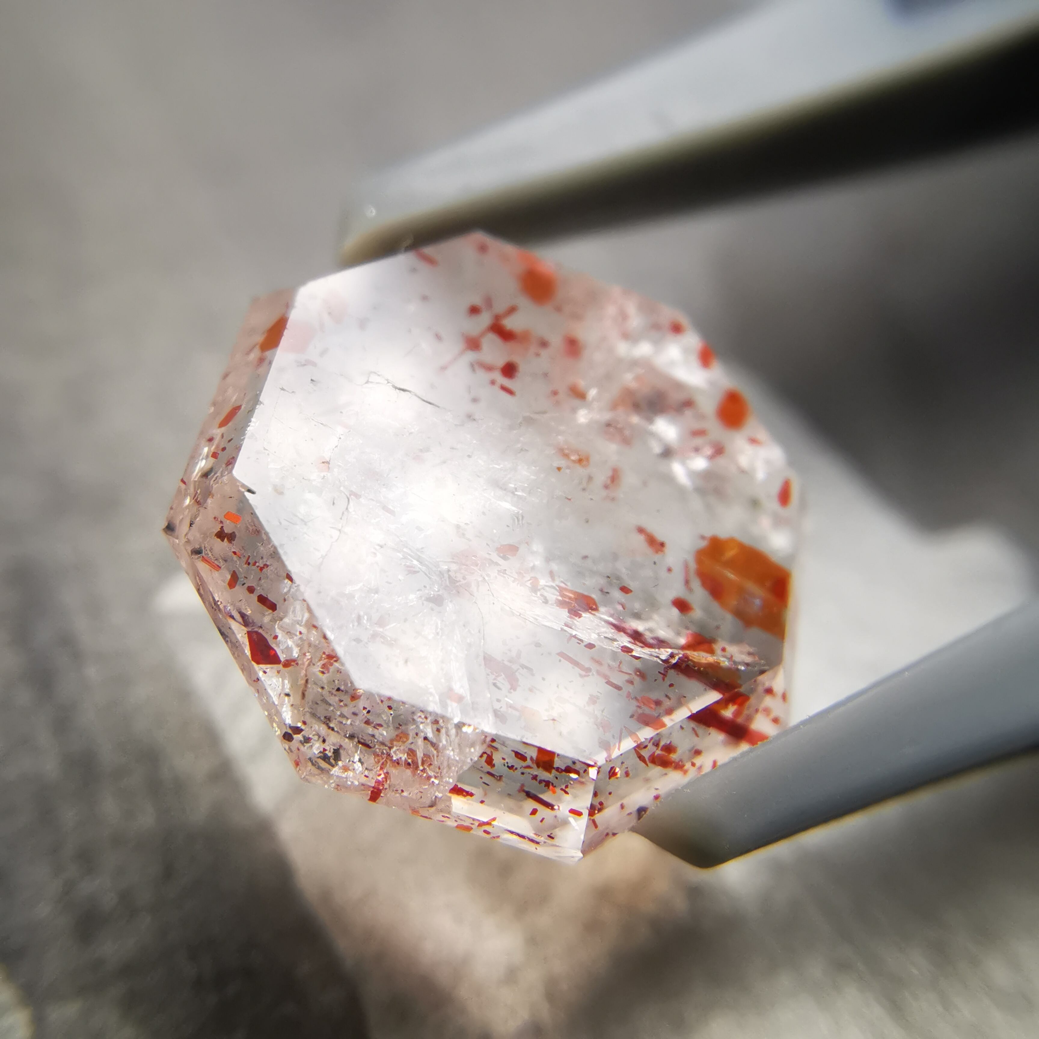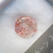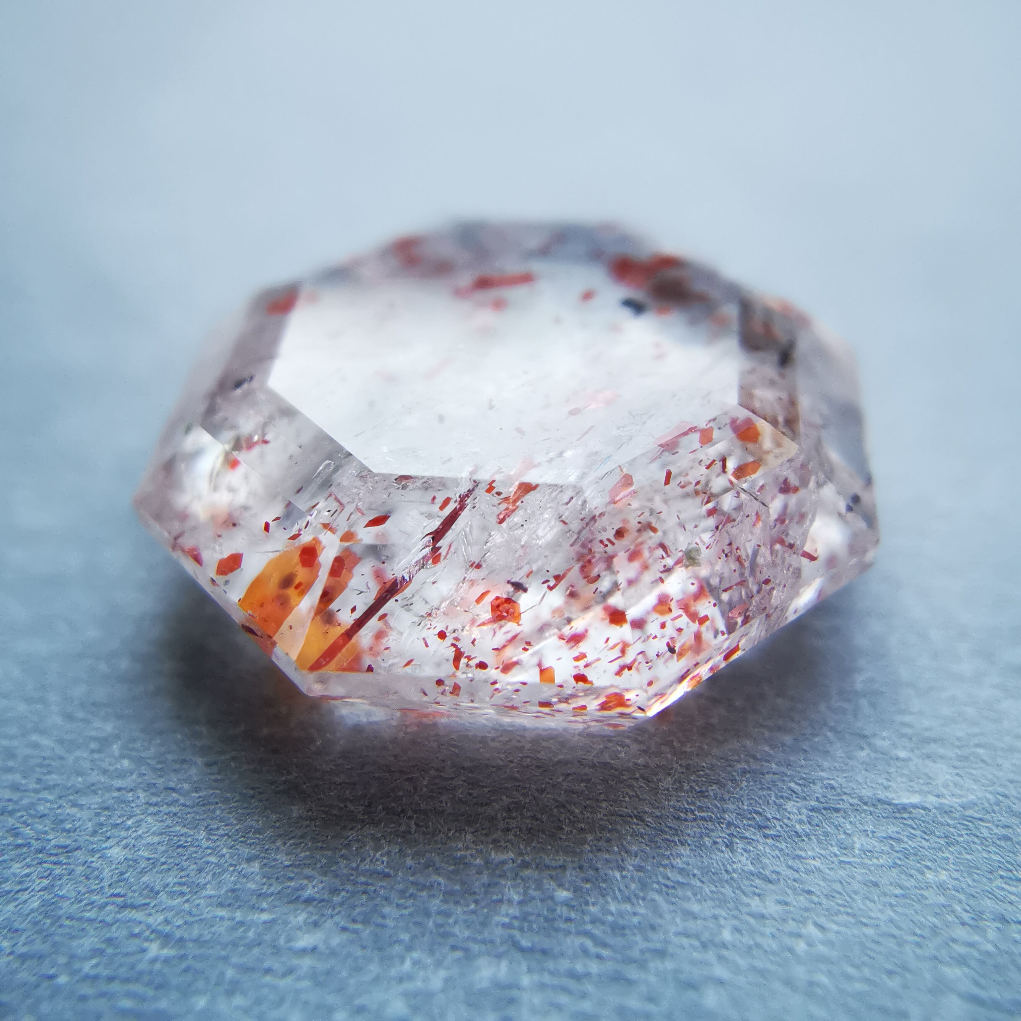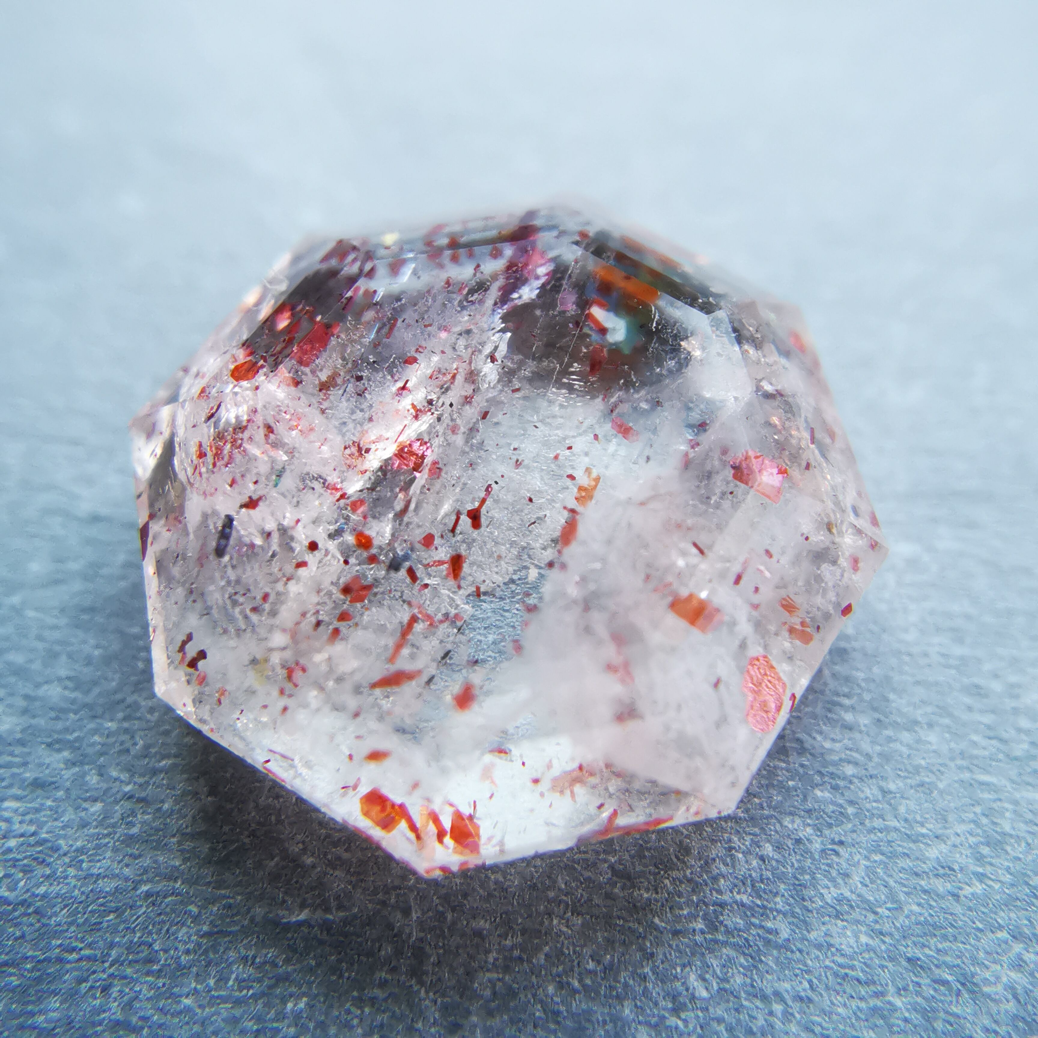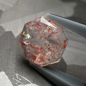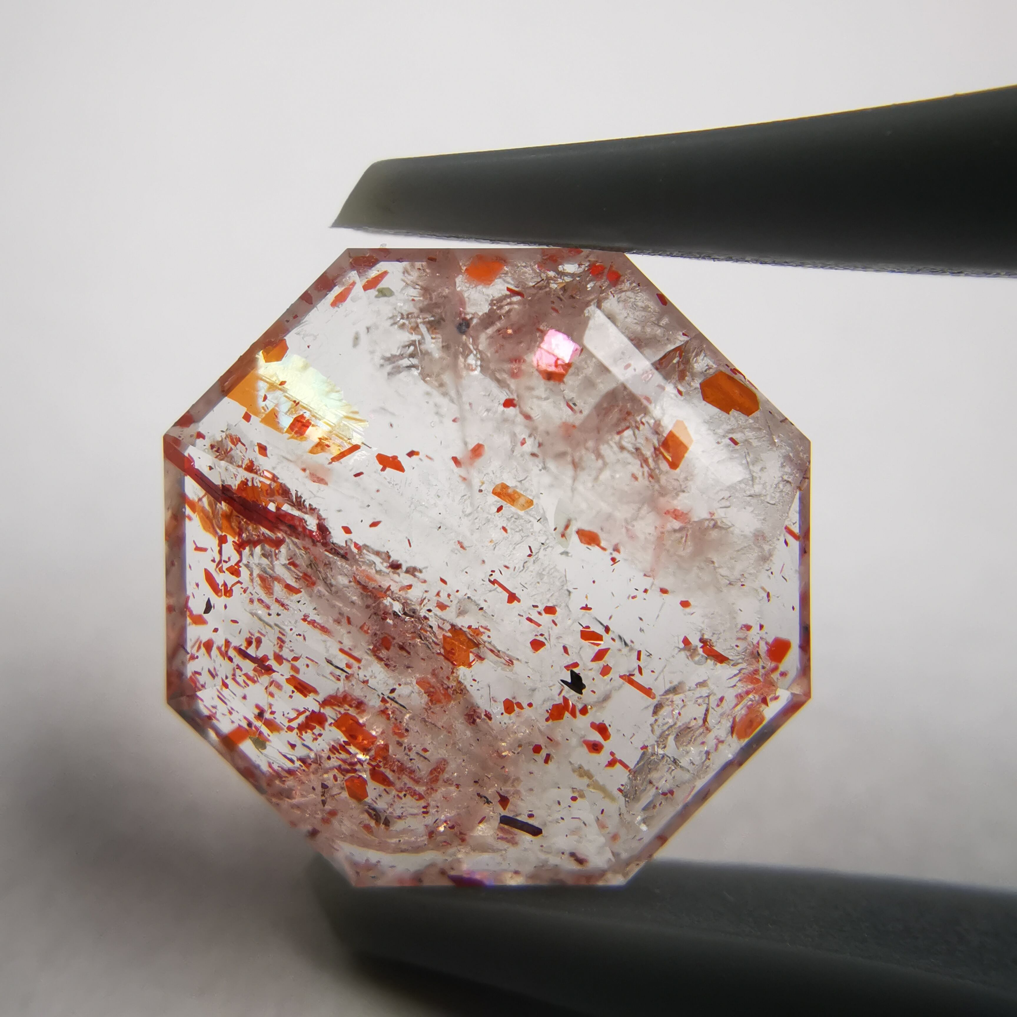 長石の一種、オリゴクレースに入った朱色のヘマタイトに光が当たると、青緑やピンクのラメのようにキラキラと輝きます。