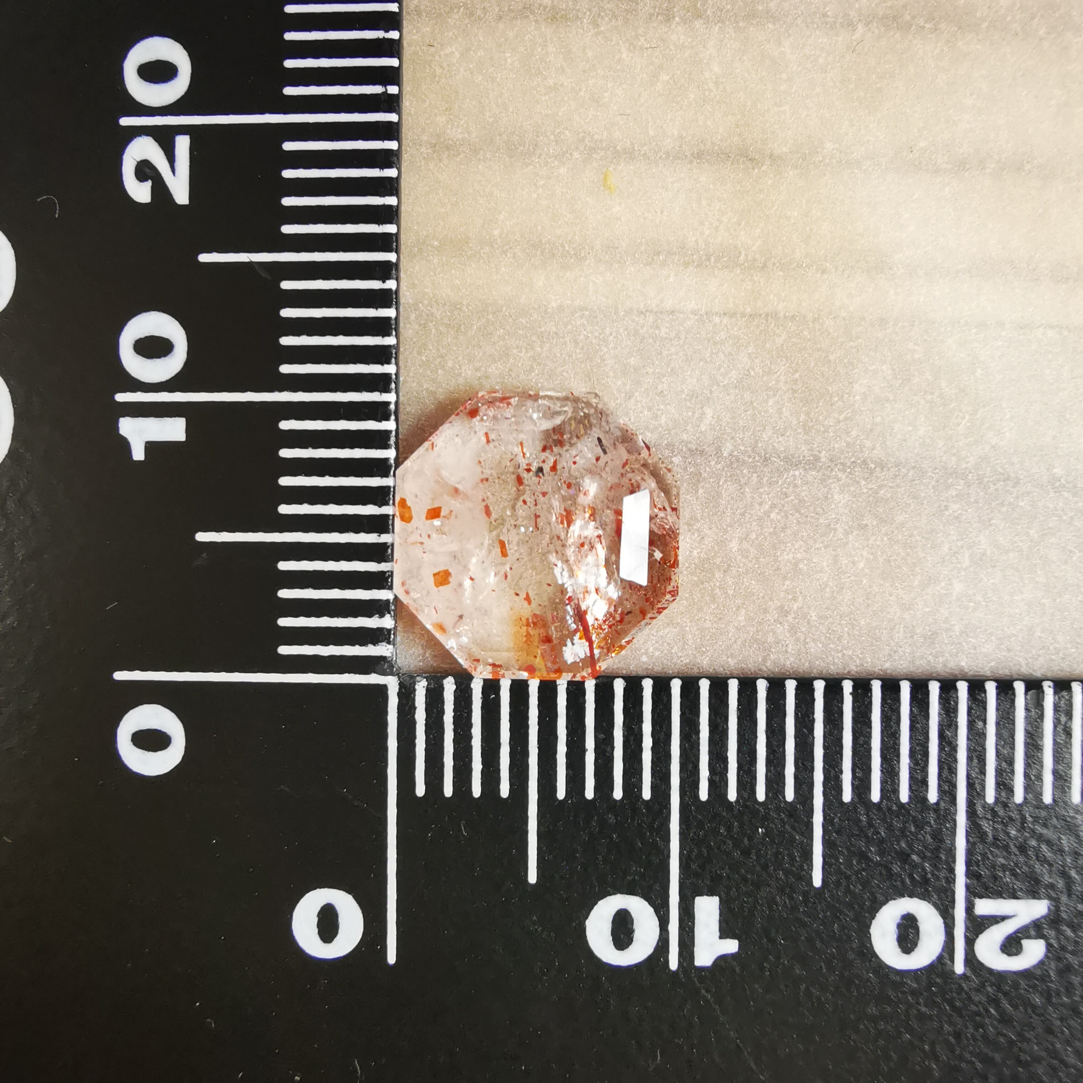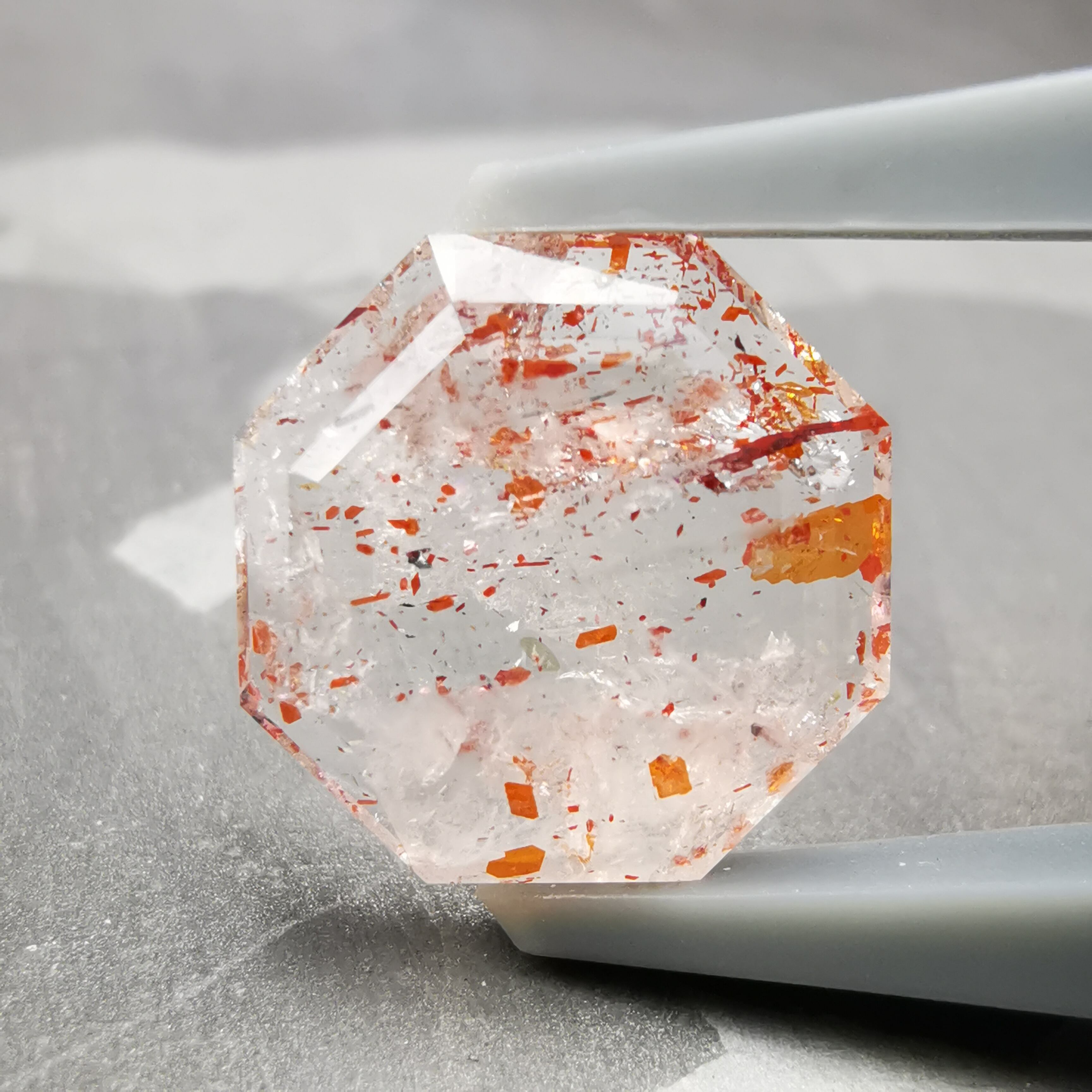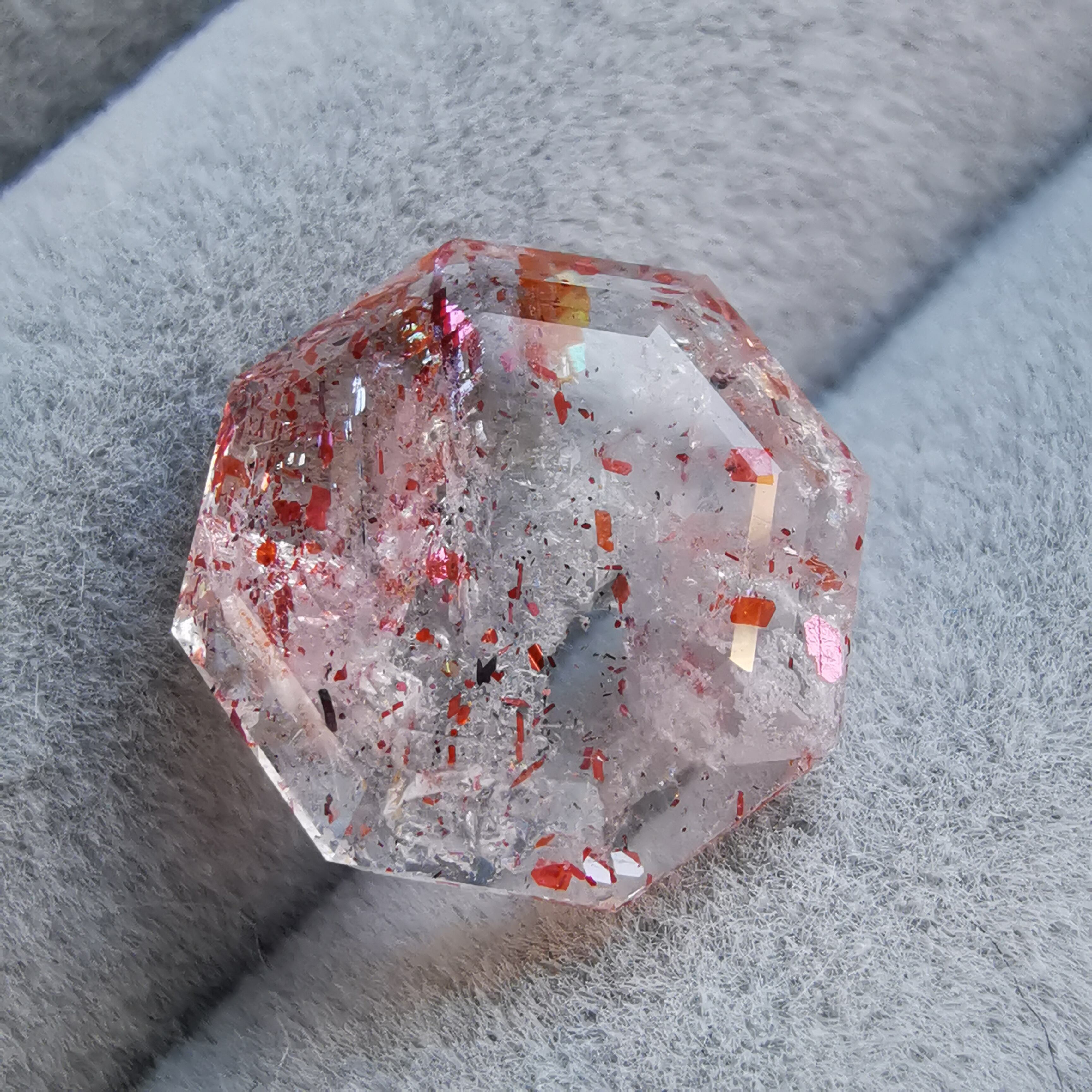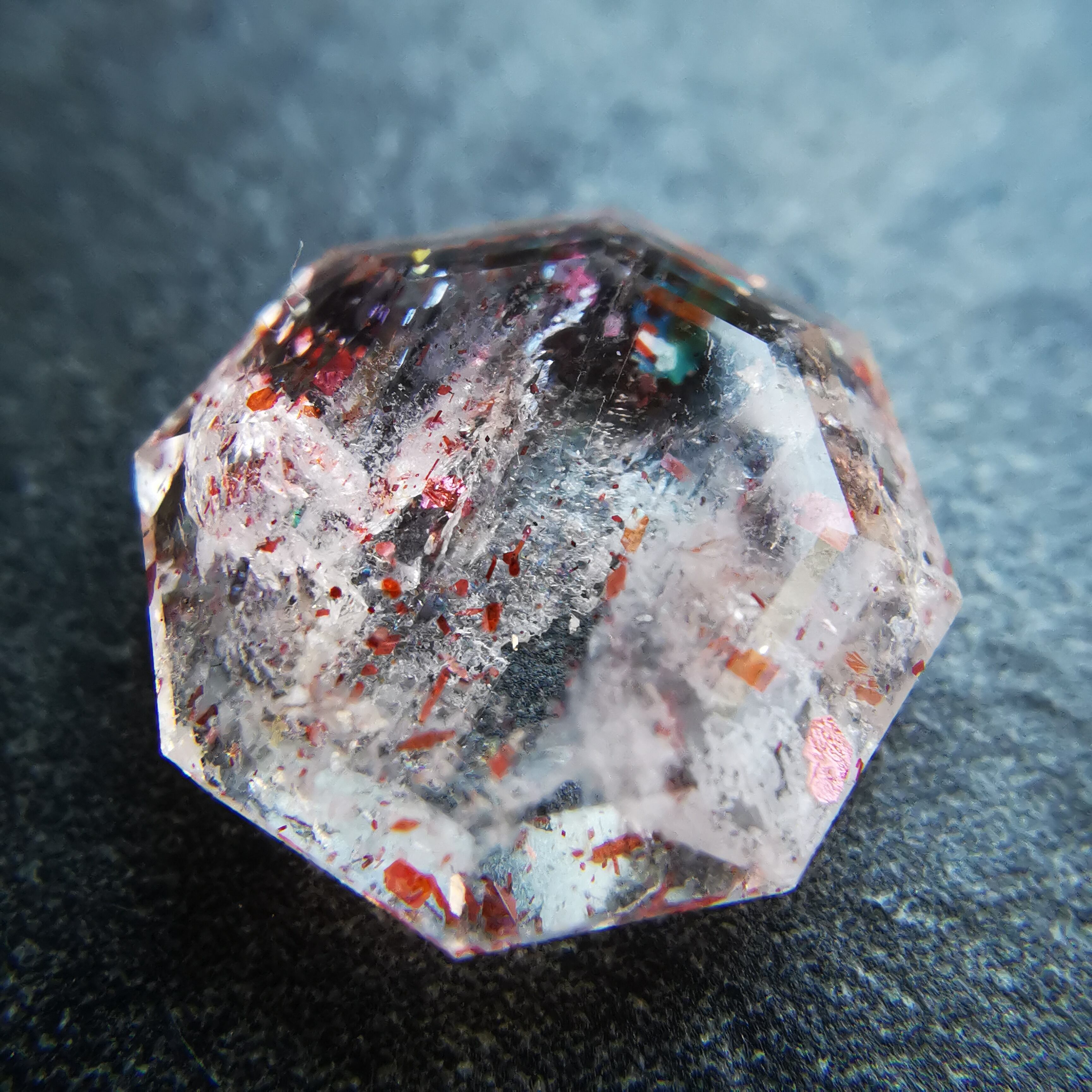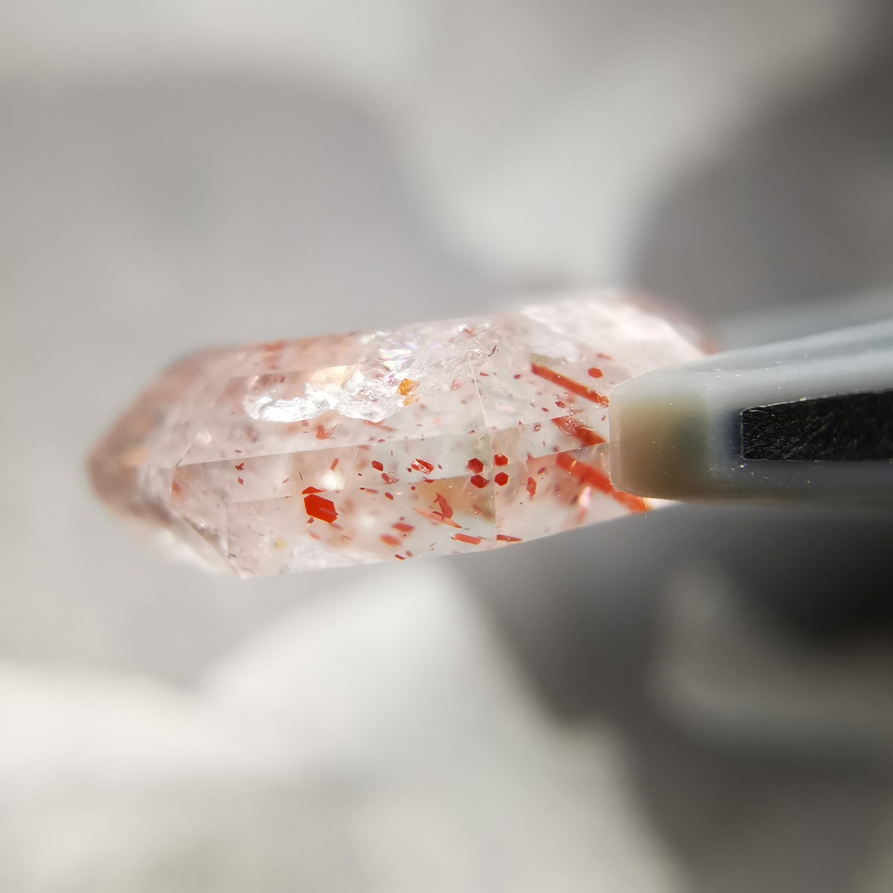 長石の一種、オリゴクレースに入った朱色のヘマタイトに光が当たると、青緑やピンクのラメのようにキラキラと輝きます。