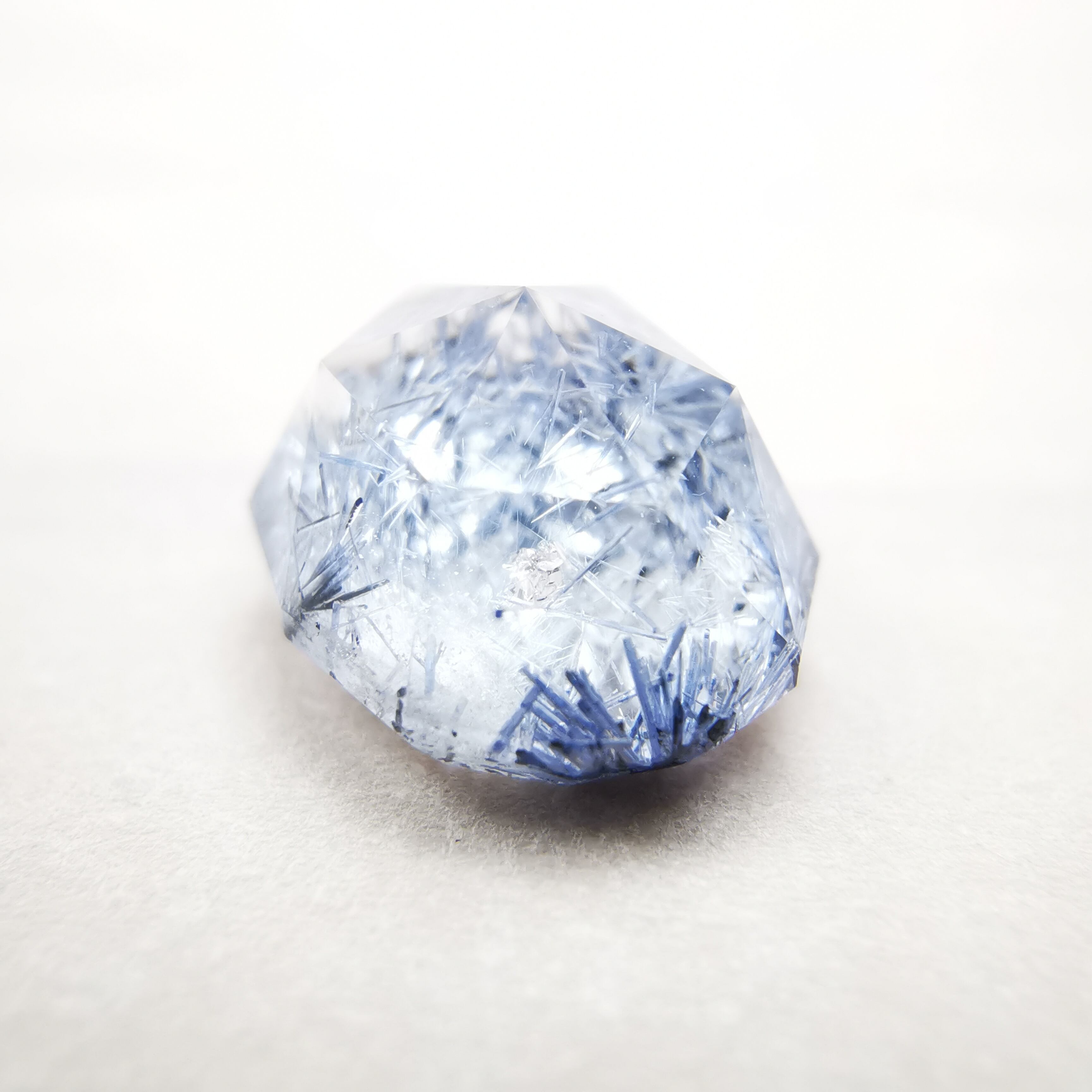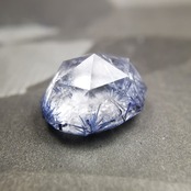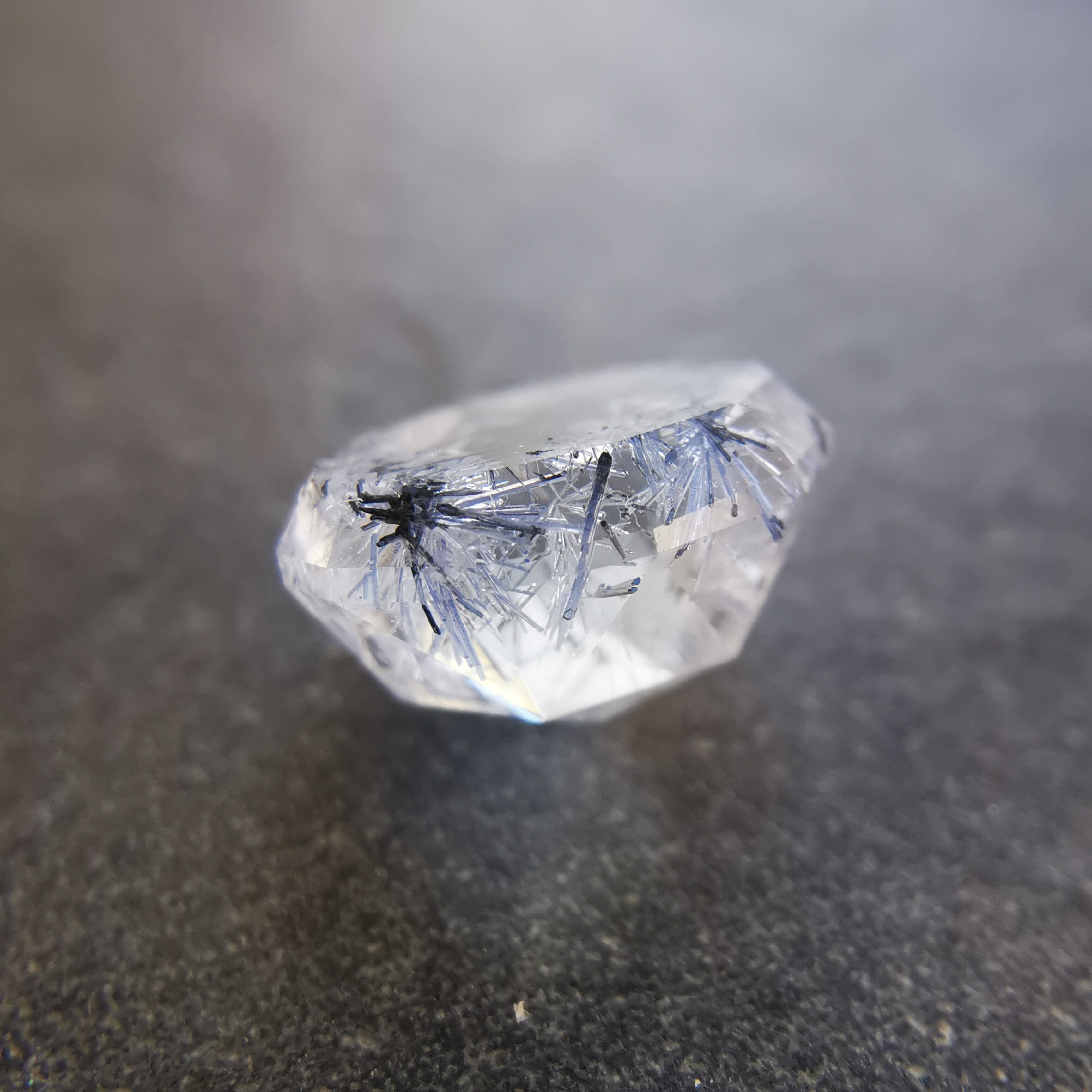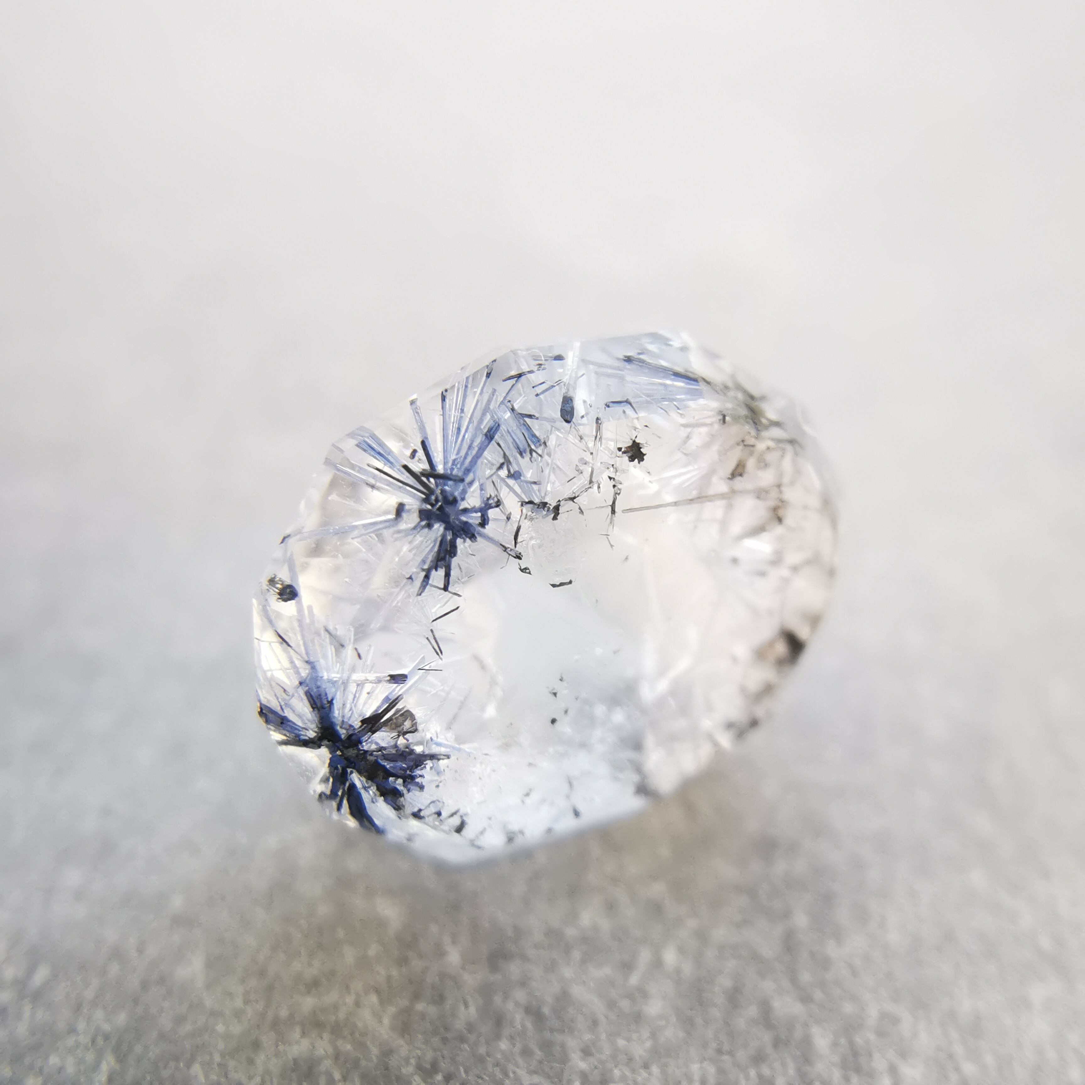 クリアなクォーツの中に、ブルーと一部が黒っぽいデュモルチェライトの結晶が、外周に添ってに点在している一石です。