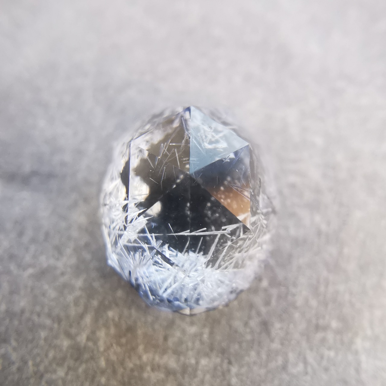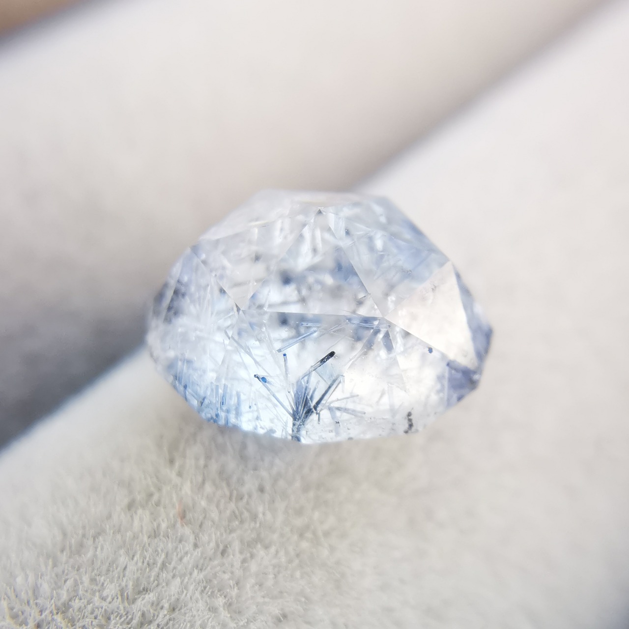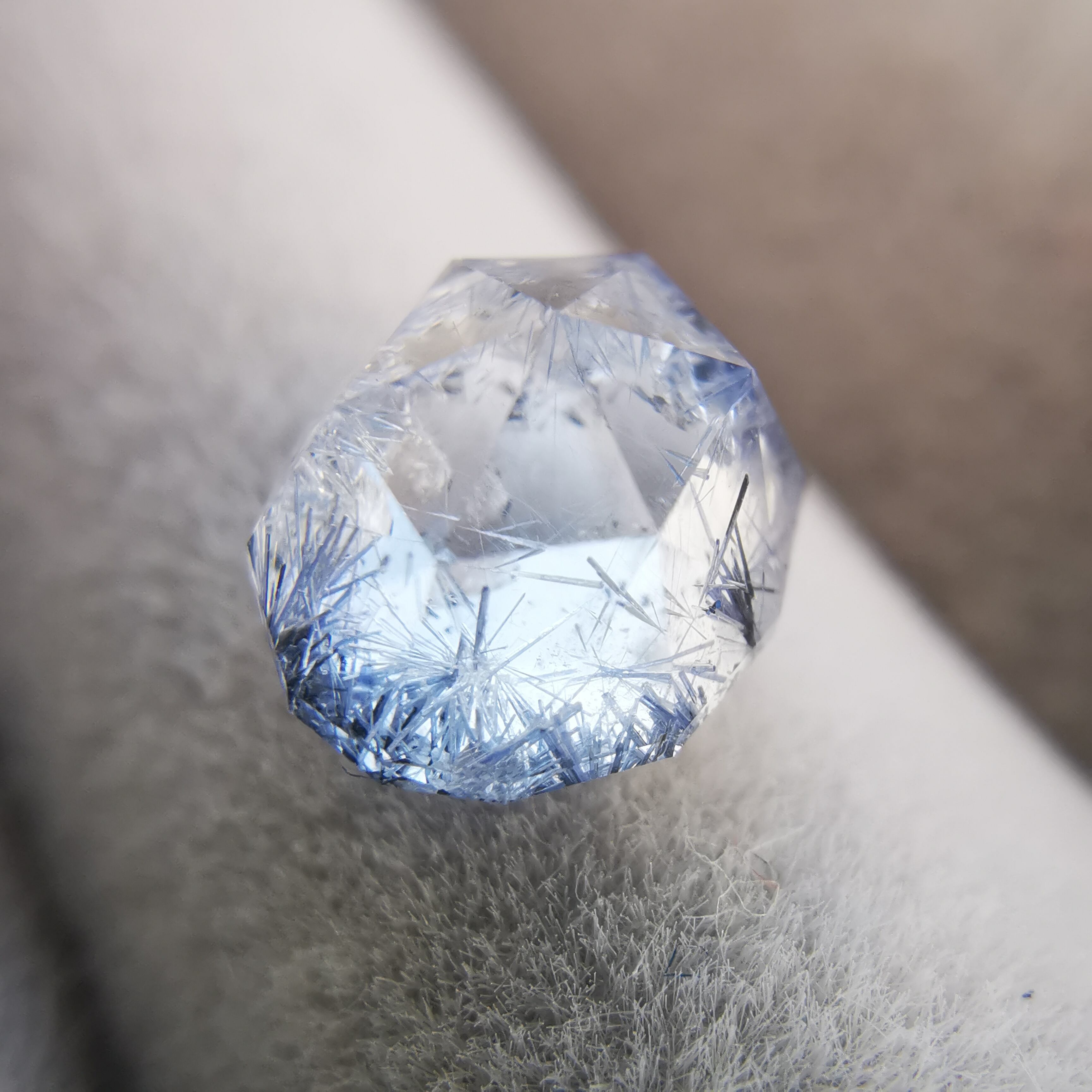 クリアなクォーツの中に、ブルーと一部が黒っぽいデュモルチェライトの結晶が、外周に添ってに点在している一石です。