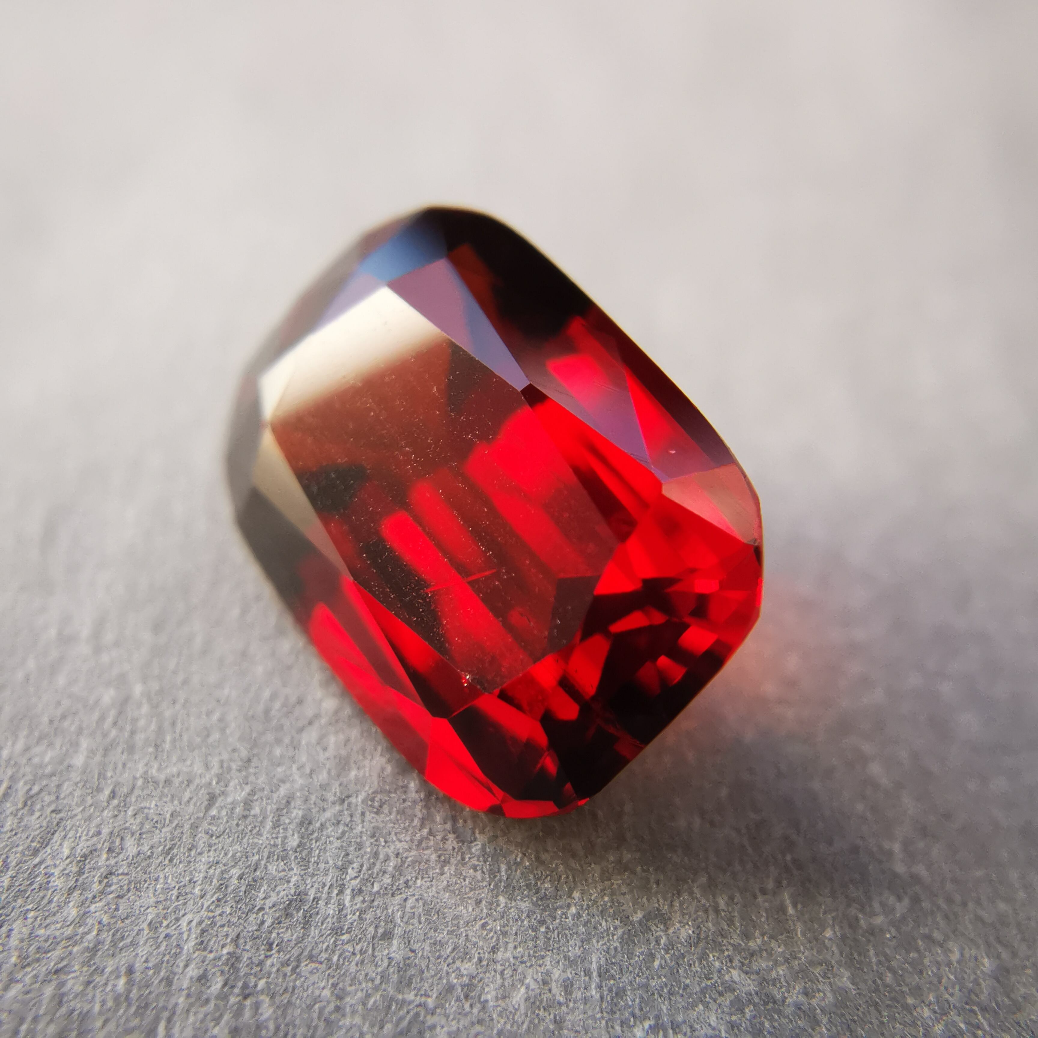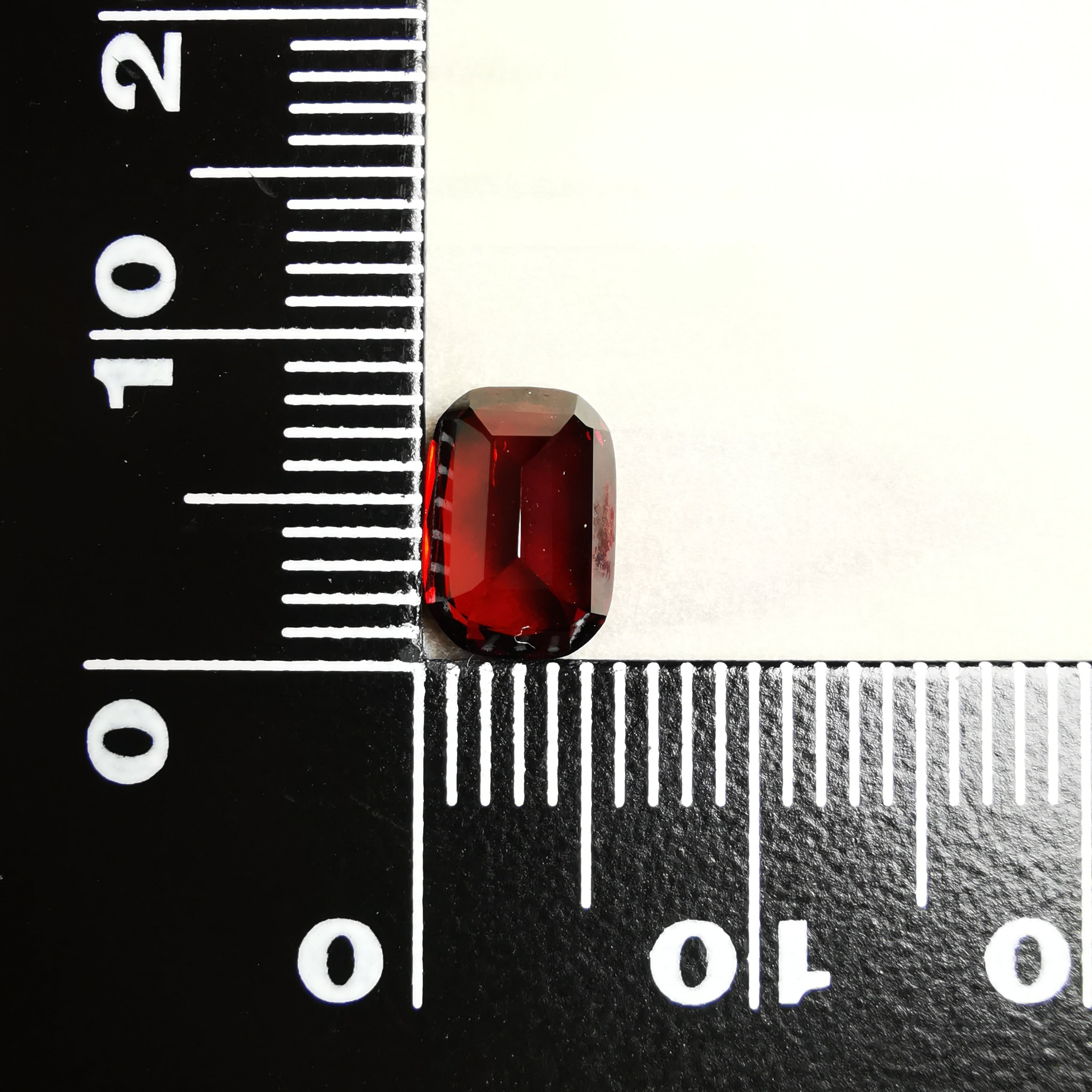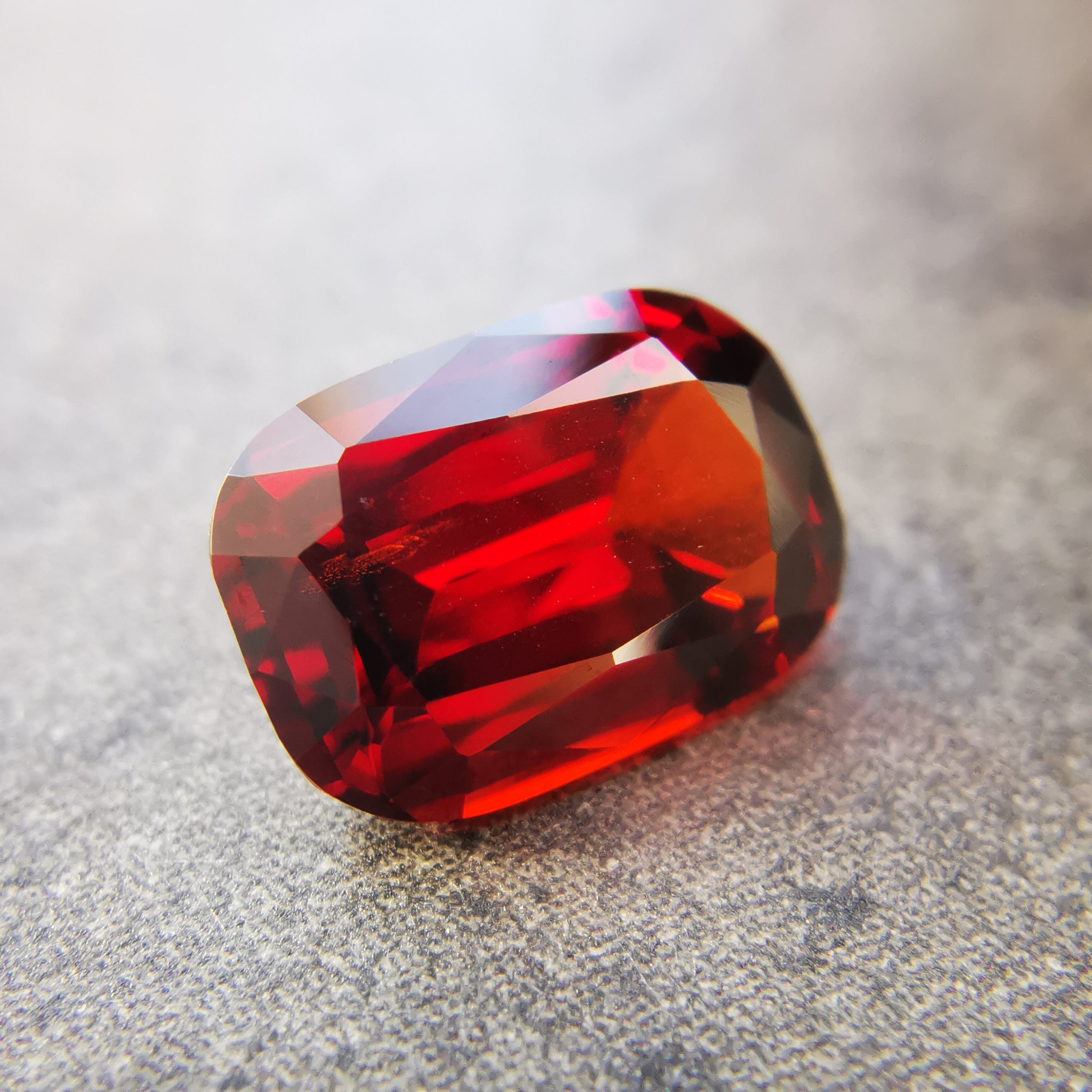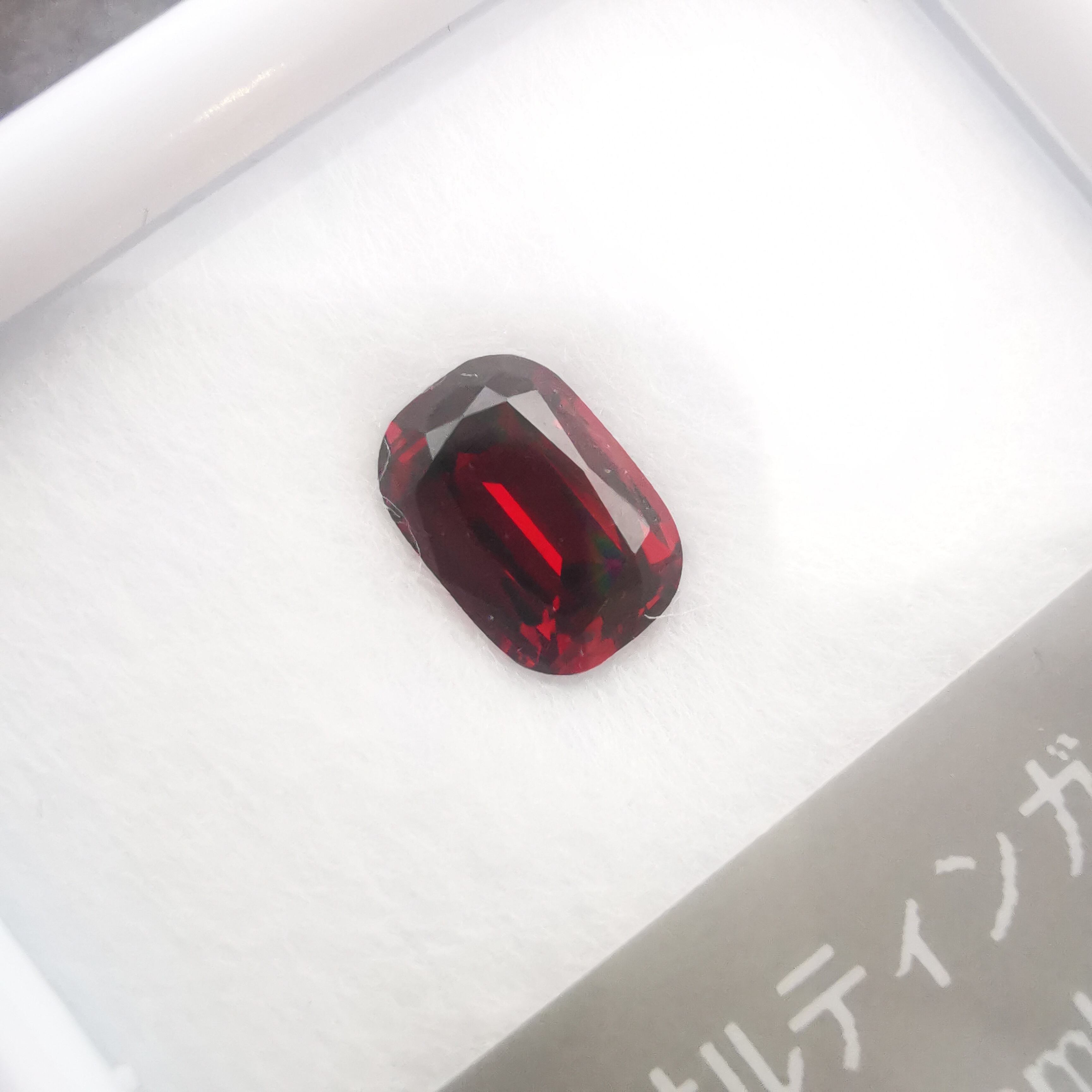 おおらかな印象のクッションカットが包み込む、熱々の赤が印象的な一石です。