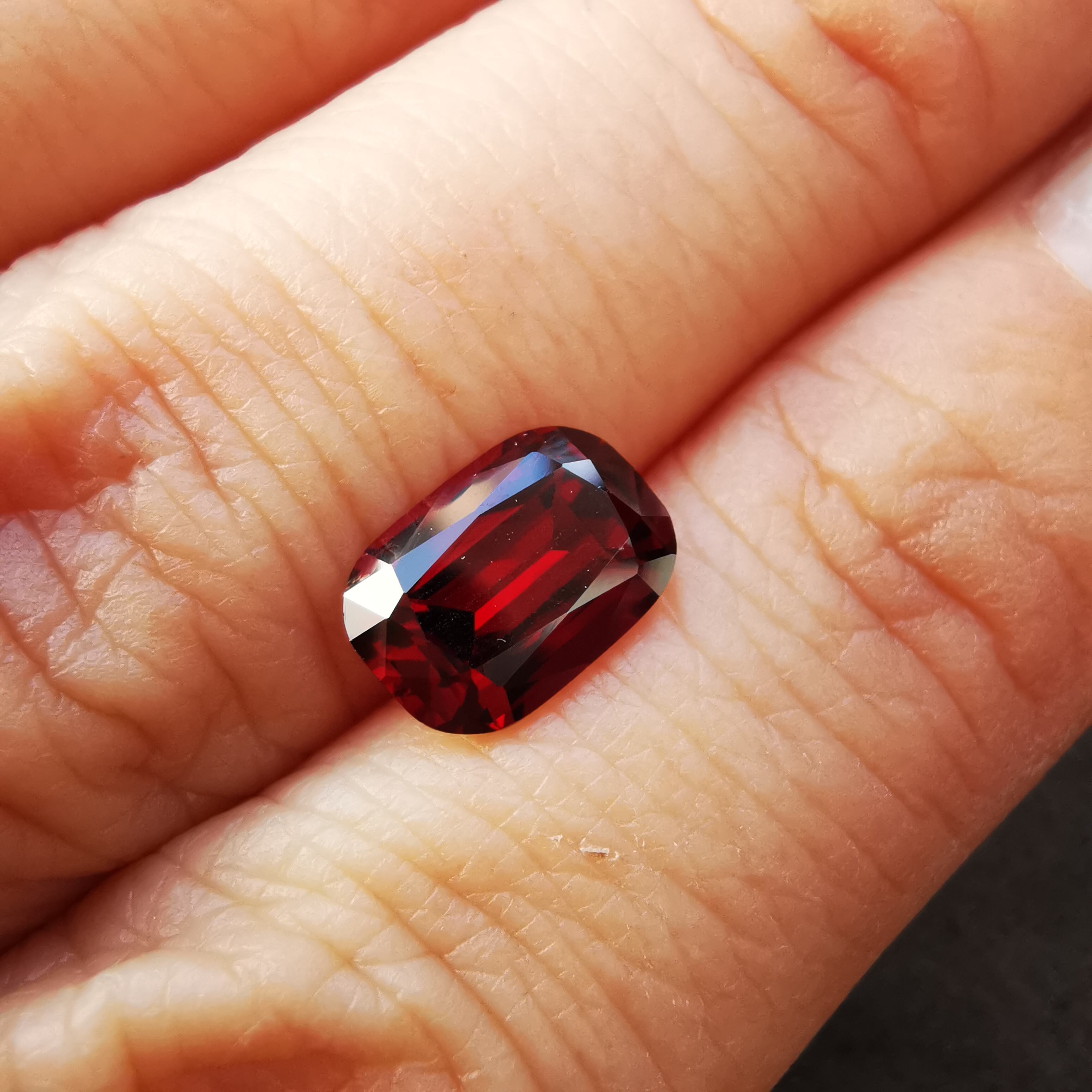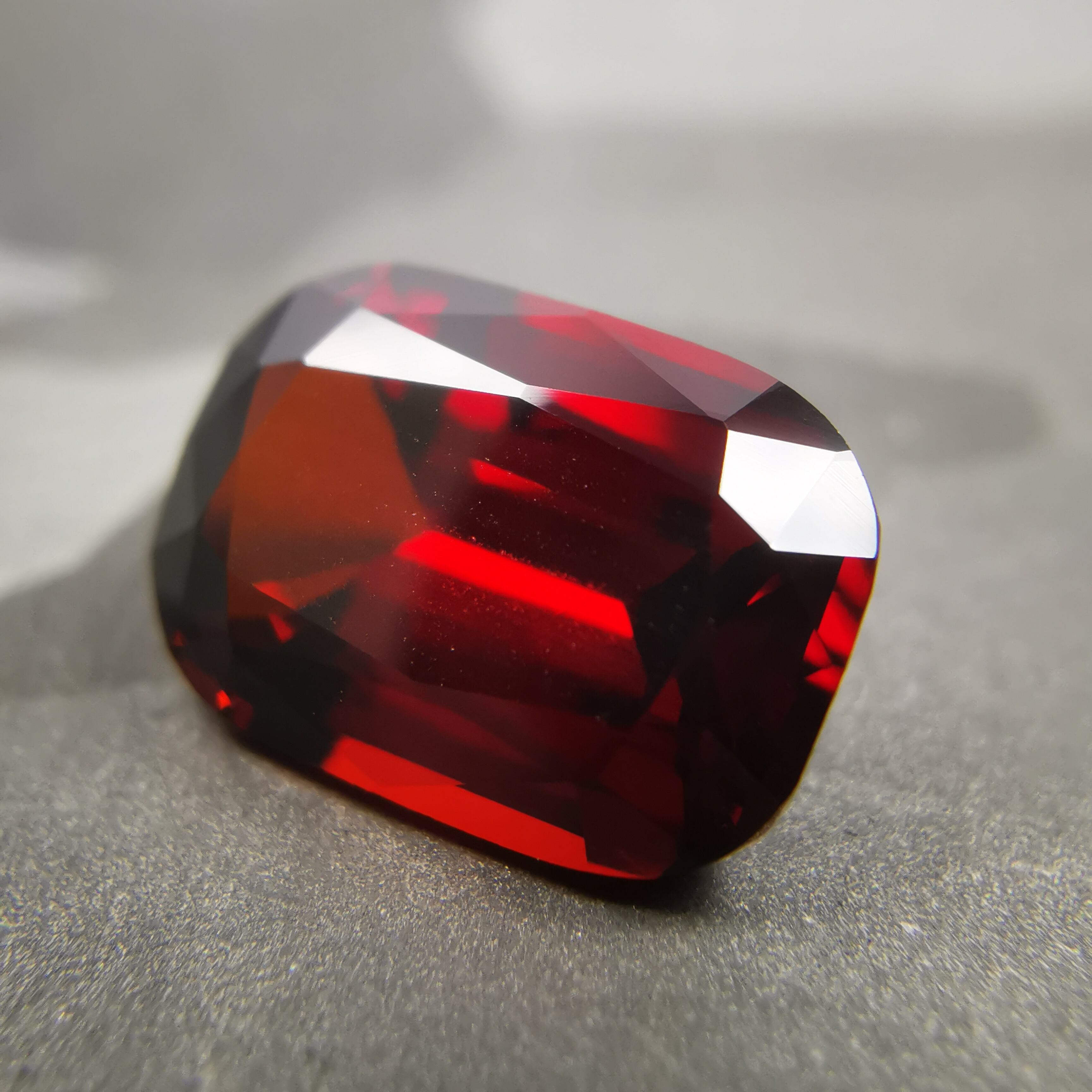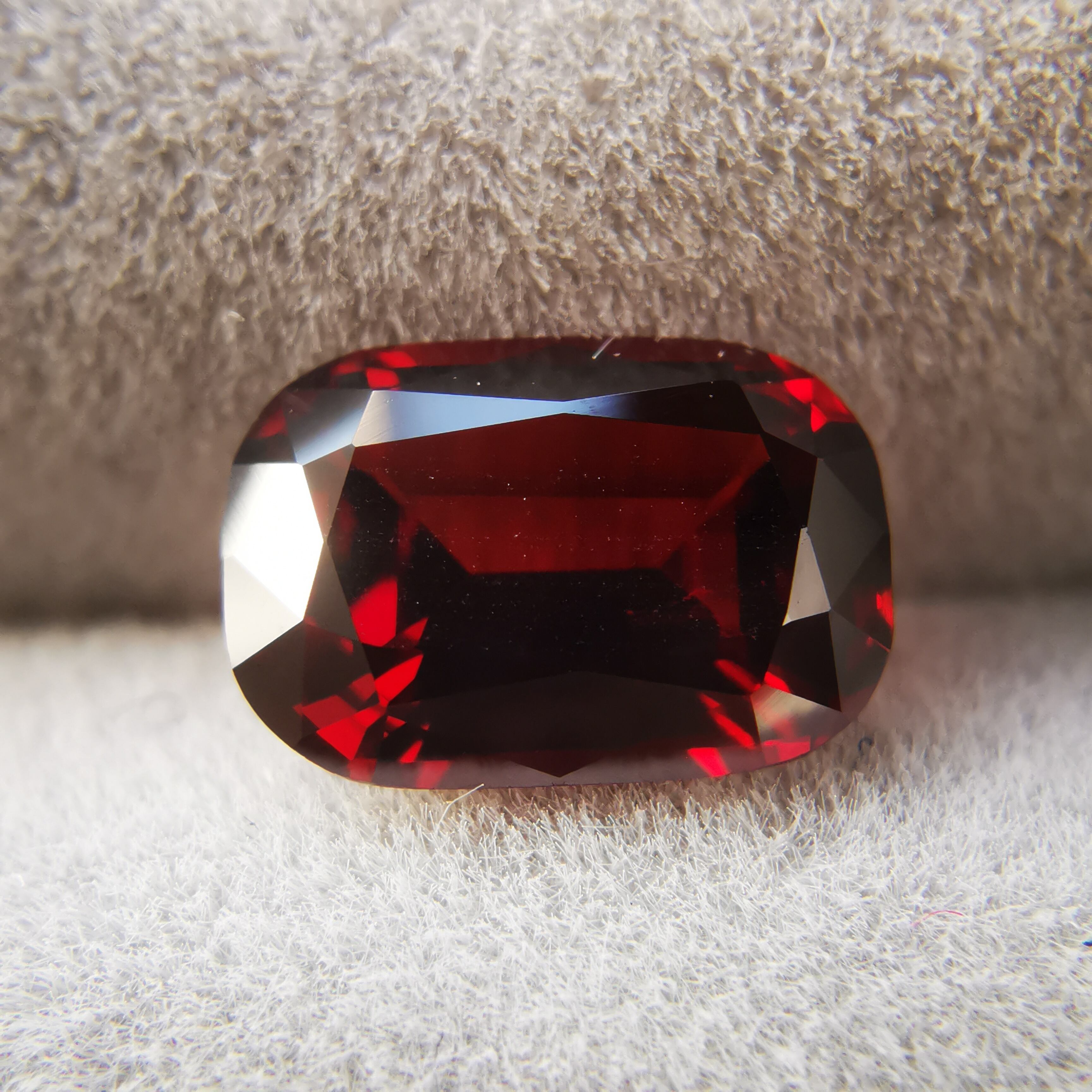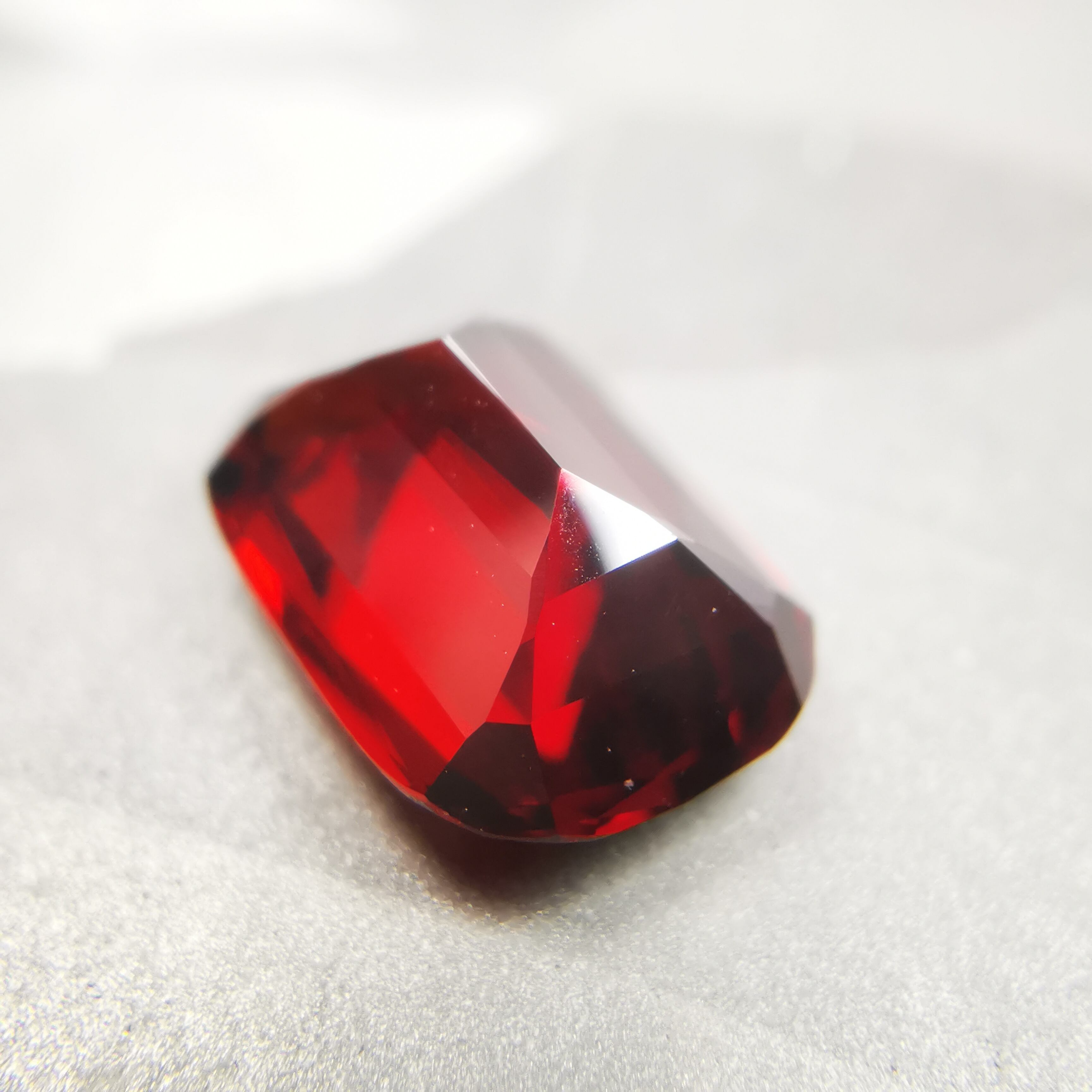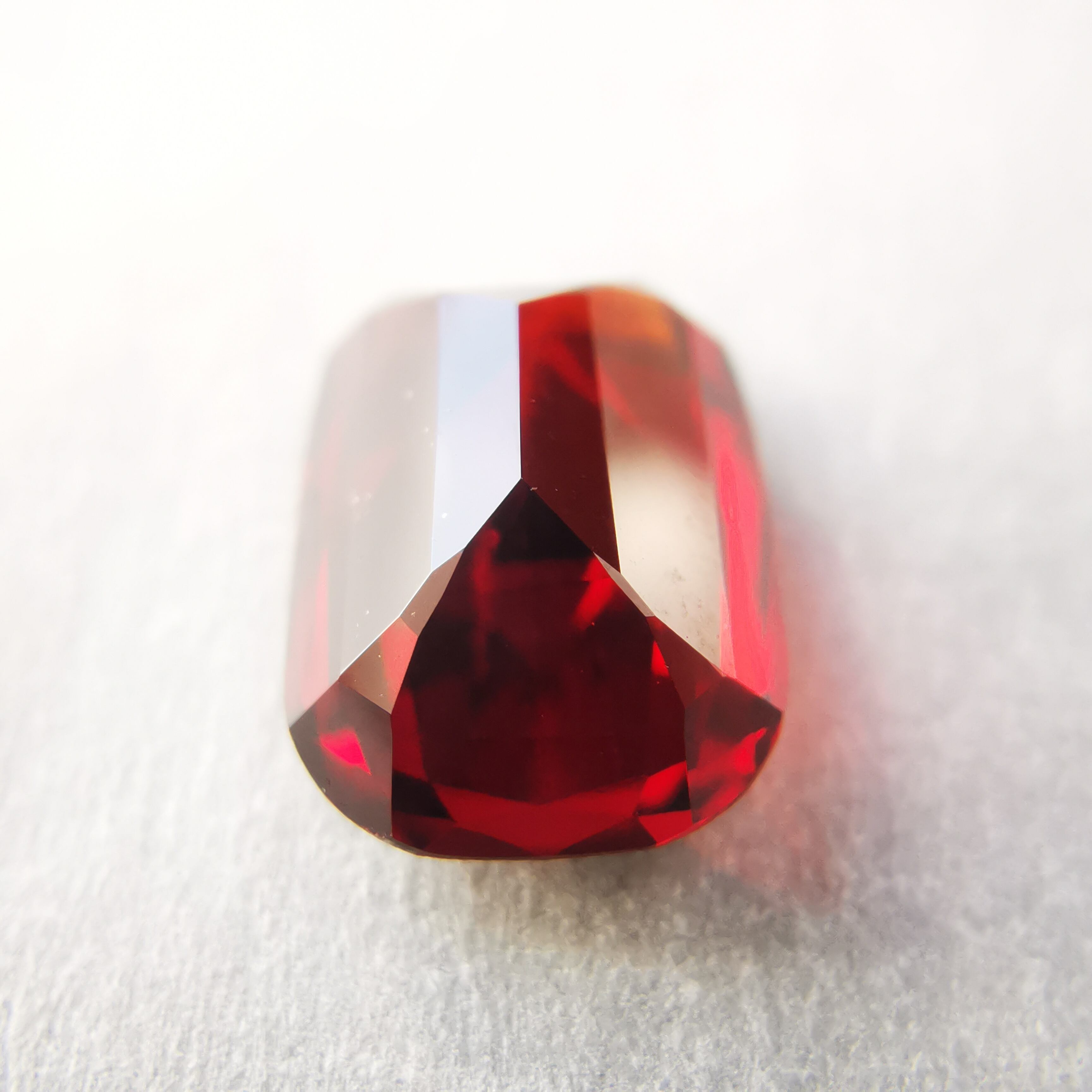 おおらかな印象のクッションカットが包み込む、熱々の赤が印象的な一石です。
