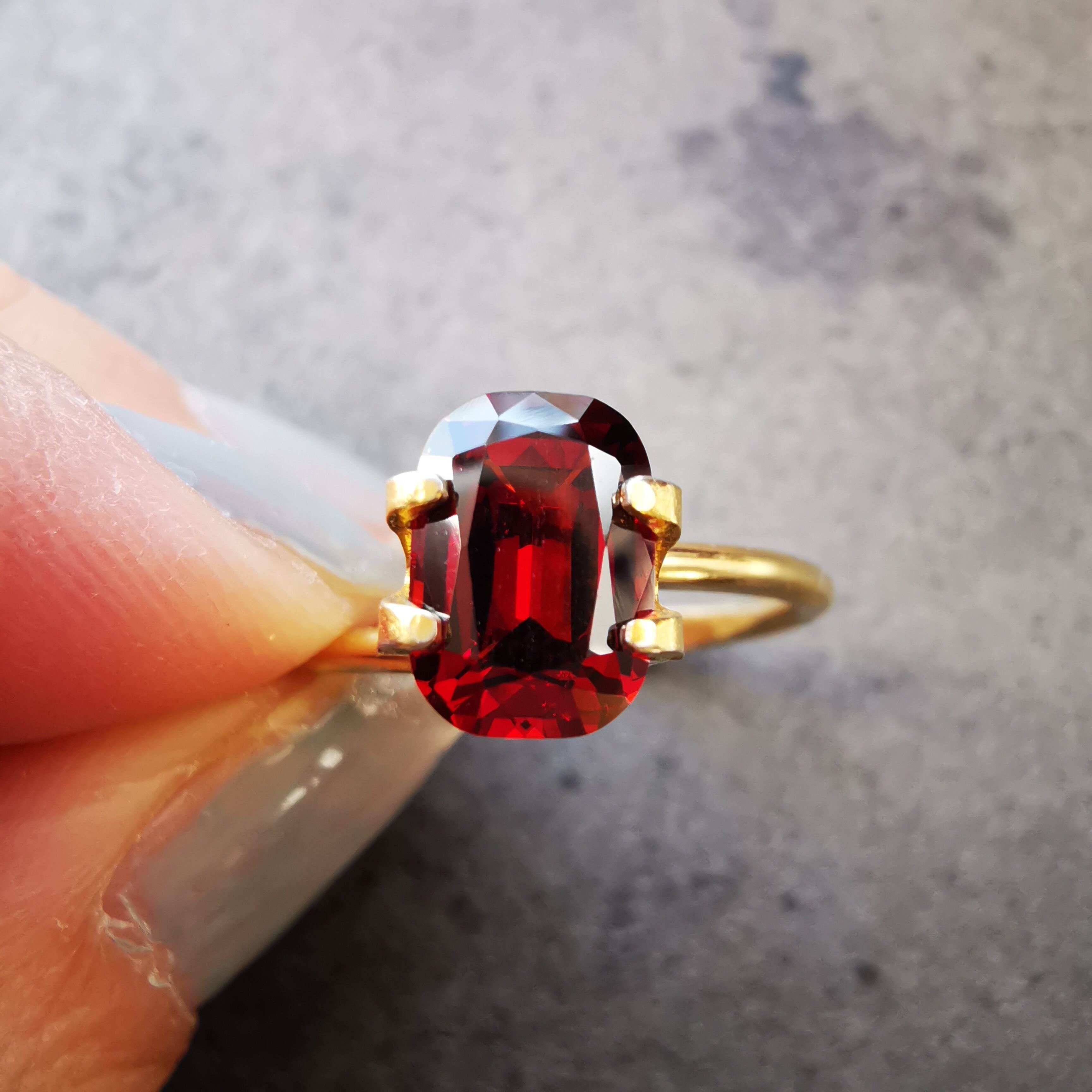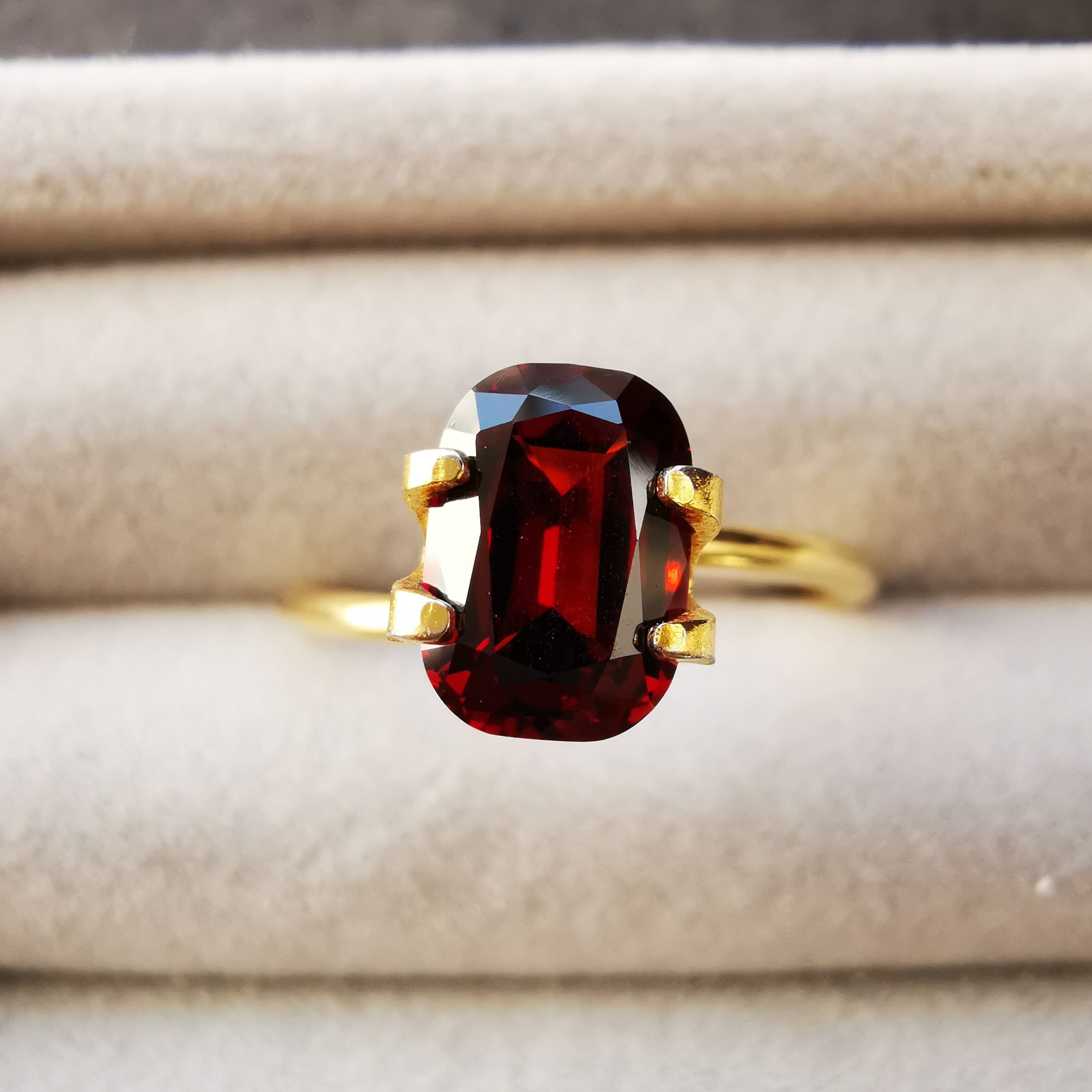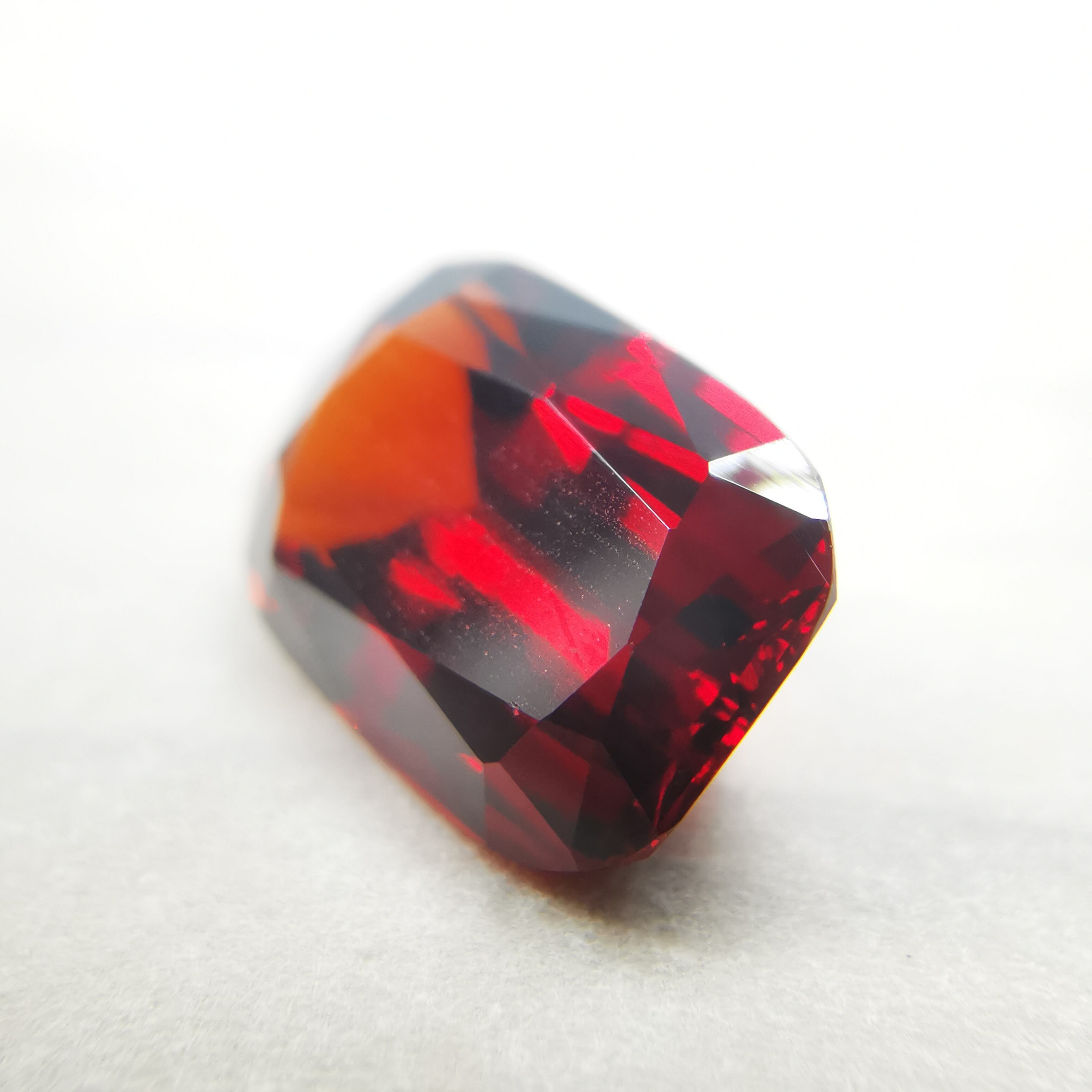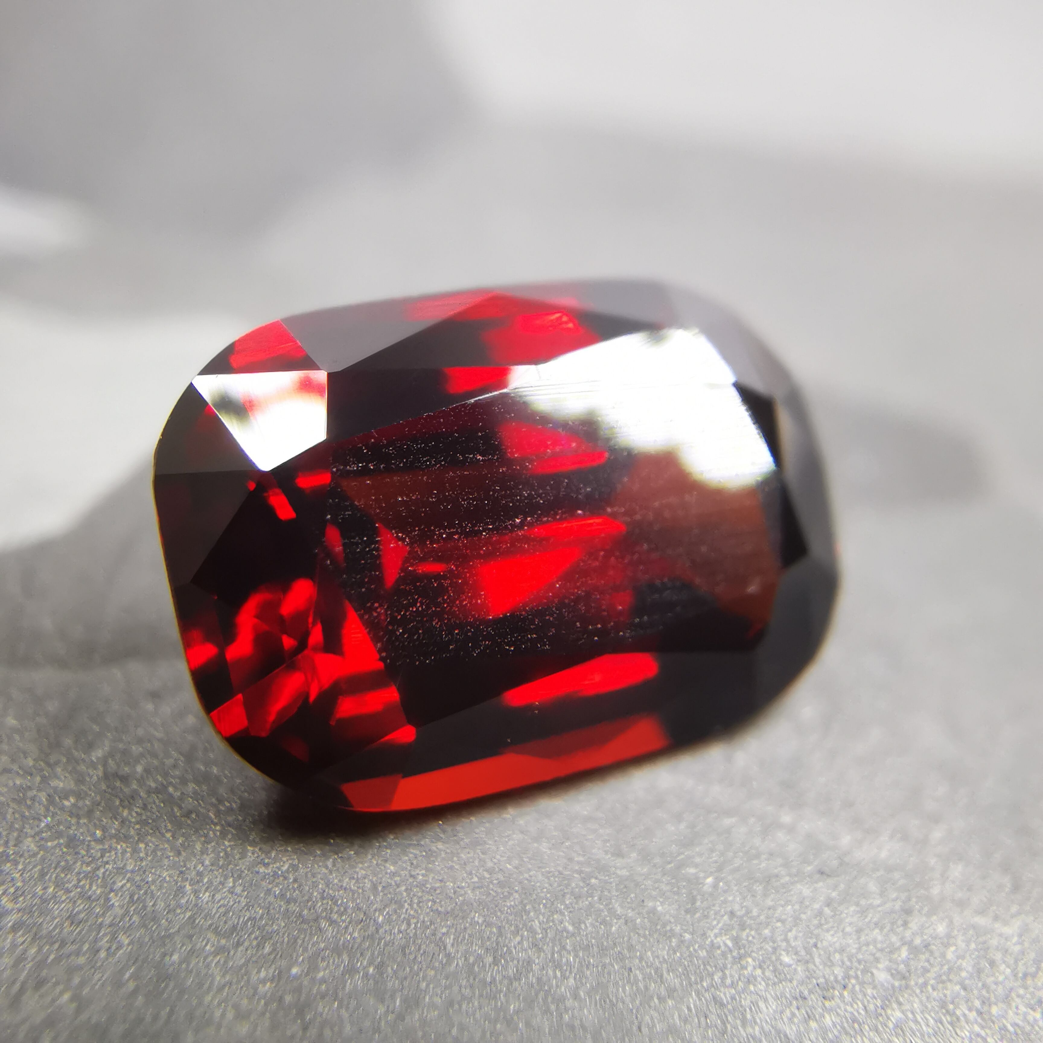 おおらかな印象のクッションカットが包み込む、熱々の赤が印象的な一石です。