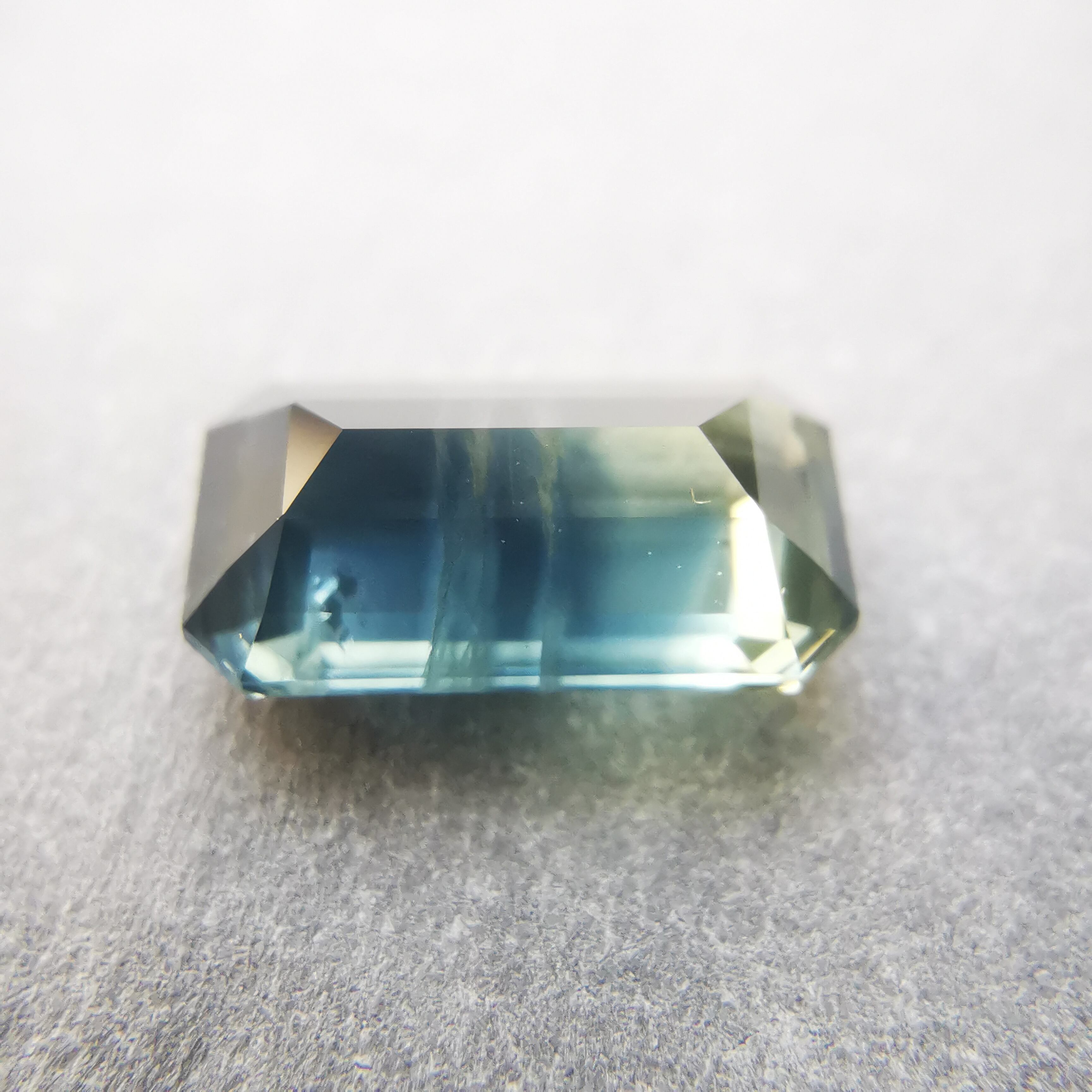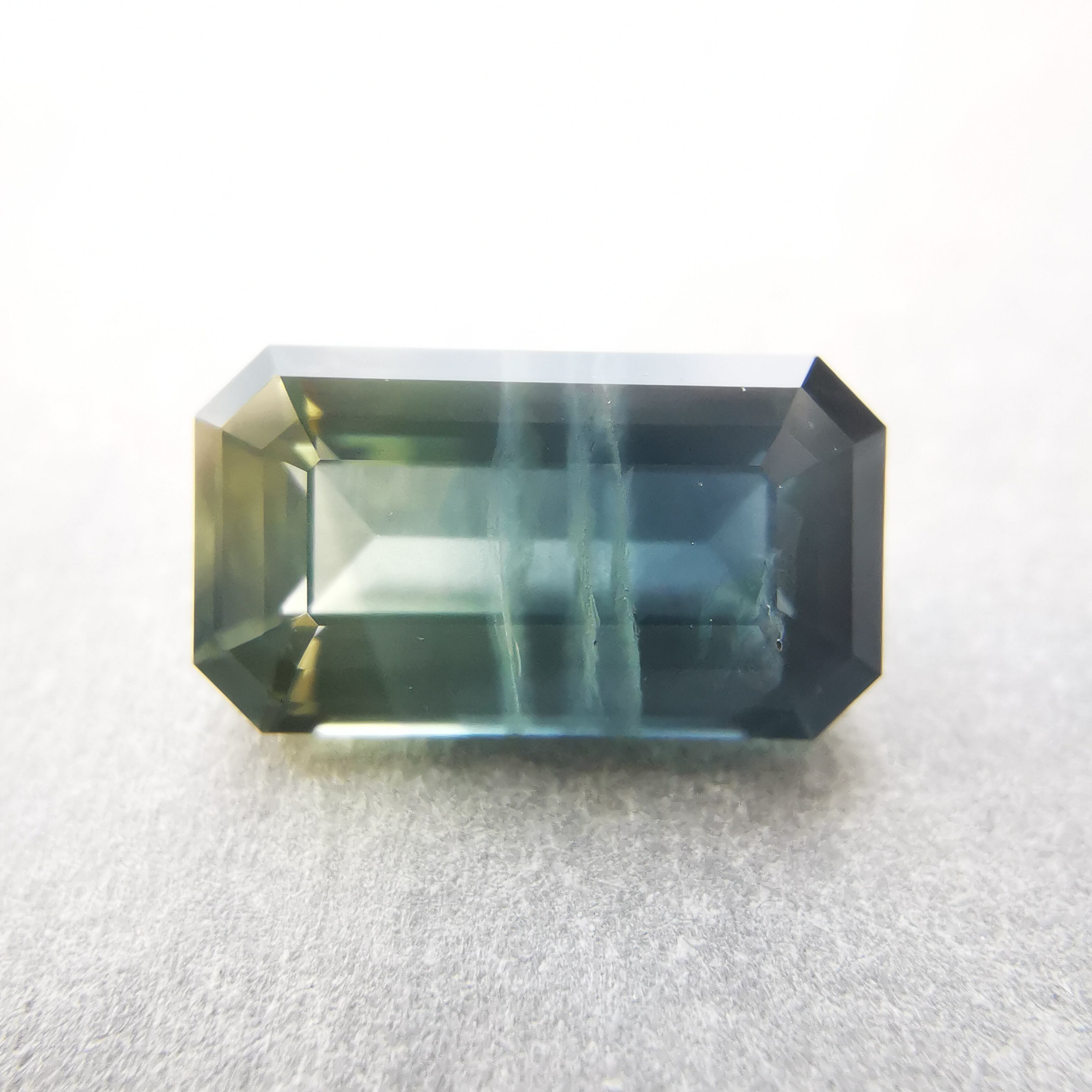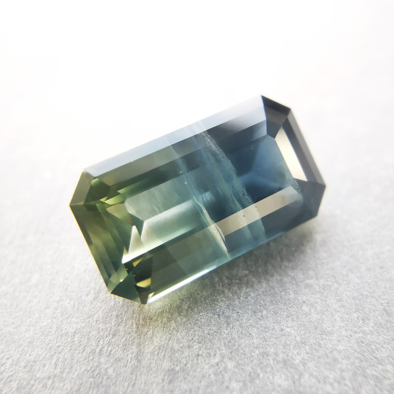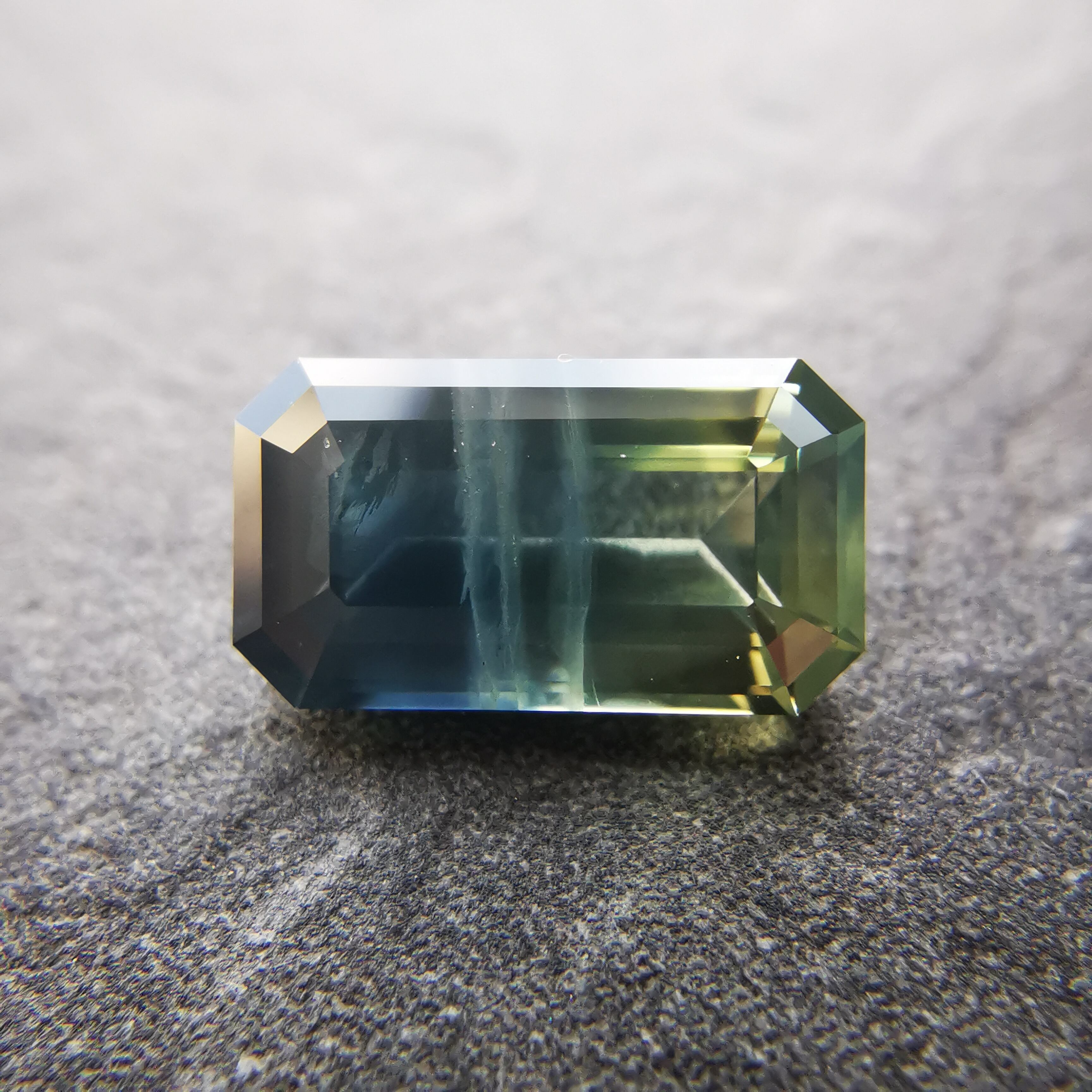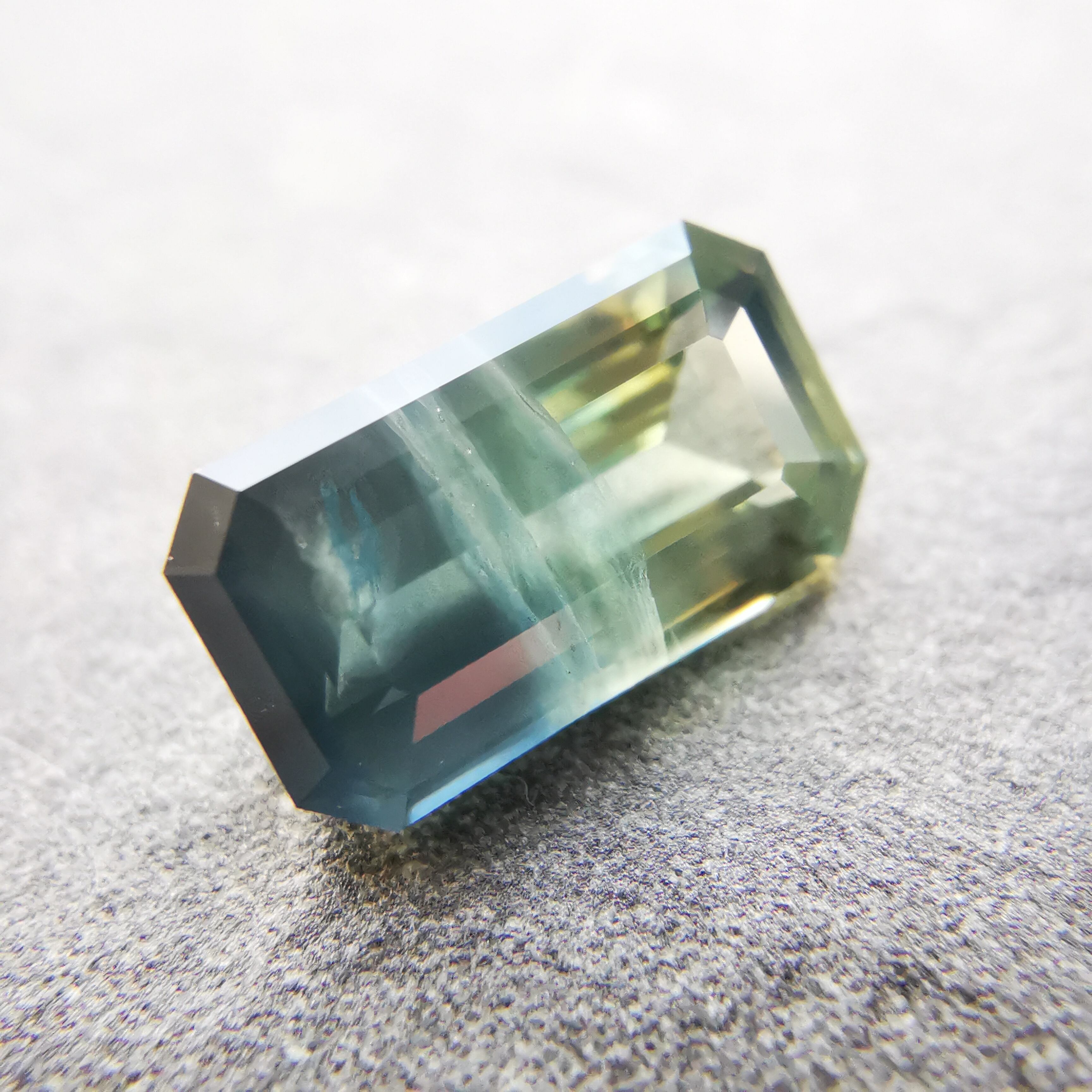 イエローと灰みブルーのバイカラーサファイアの、中心を横切るように白い筋が3本走ります。