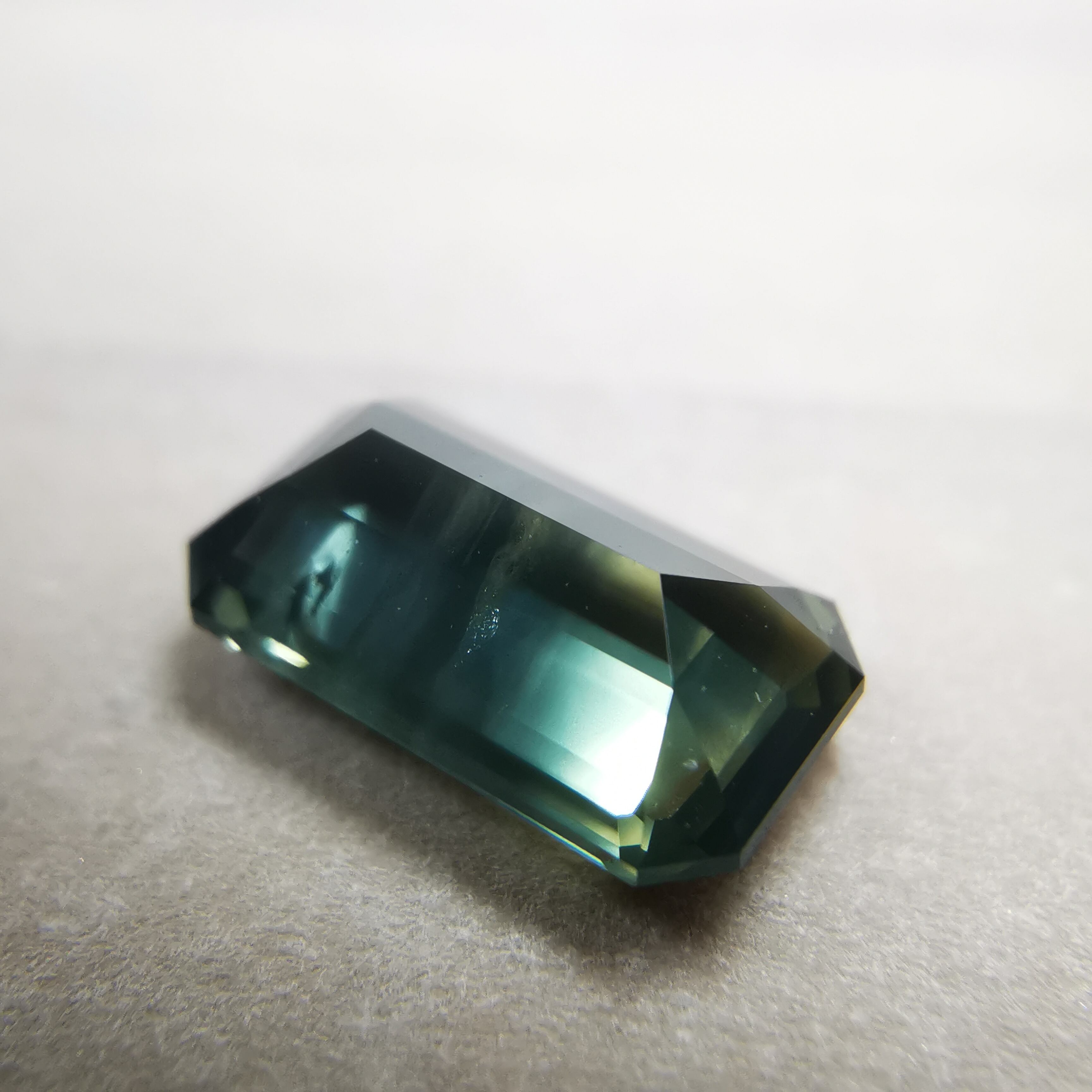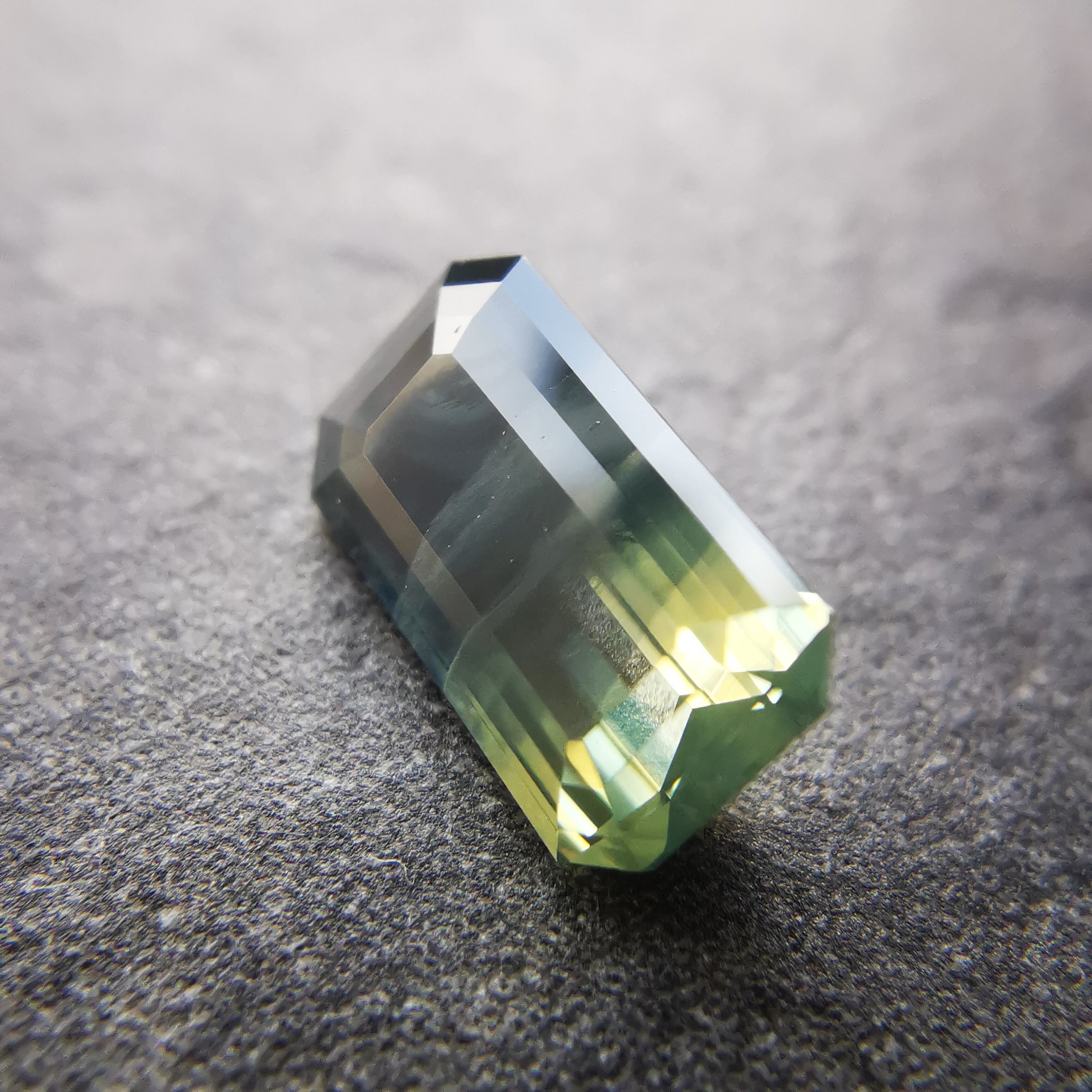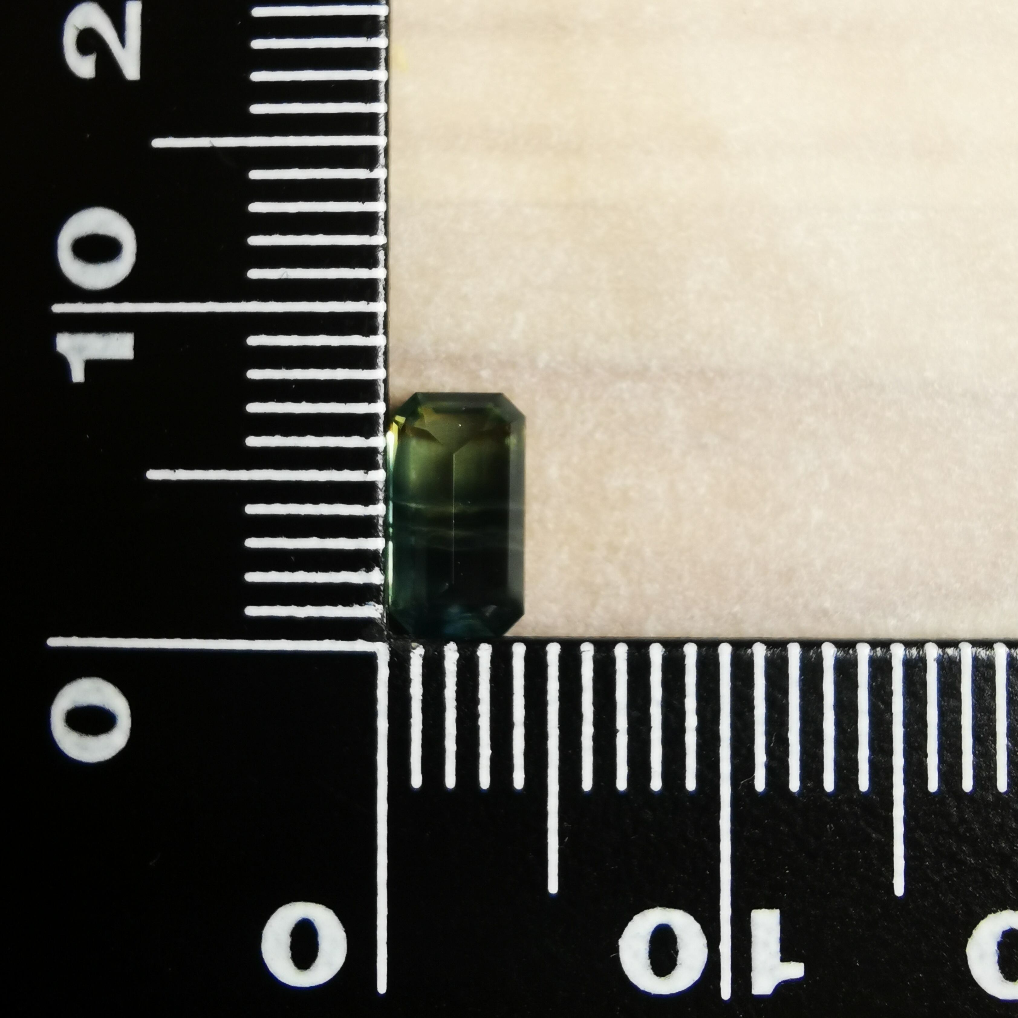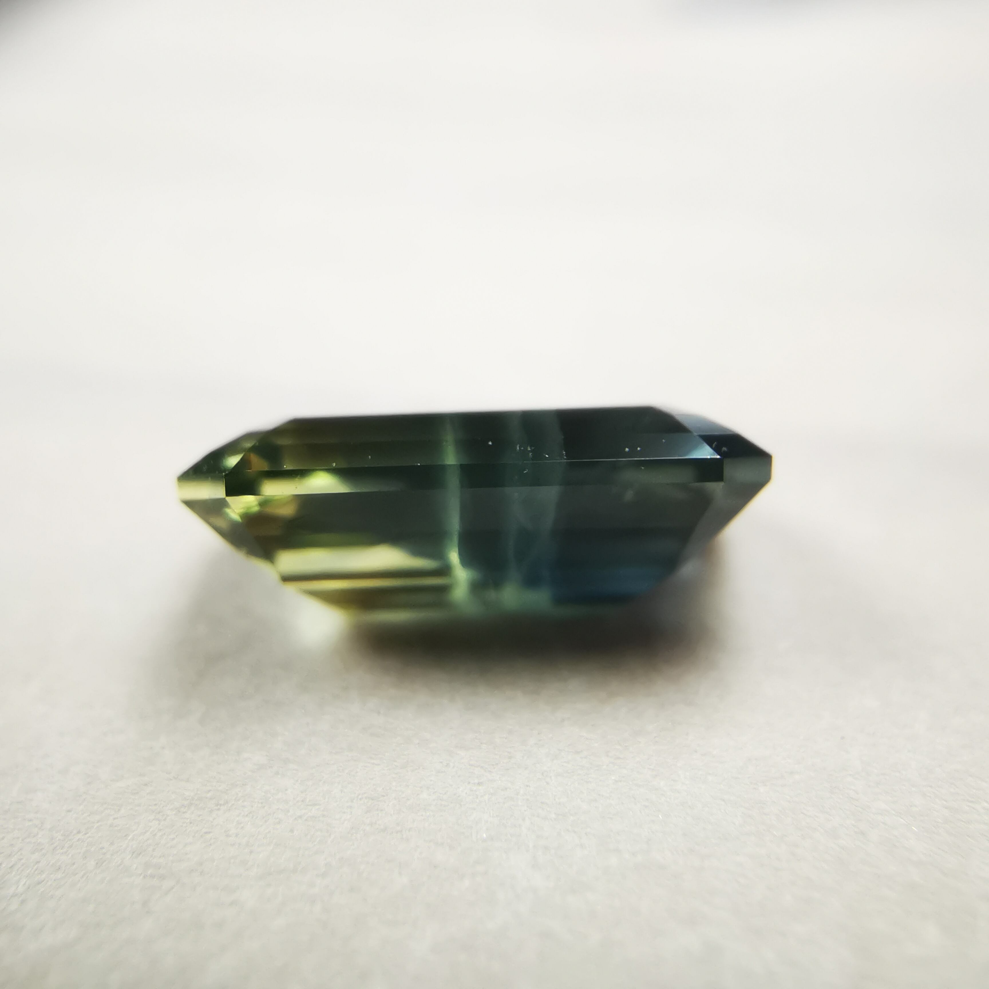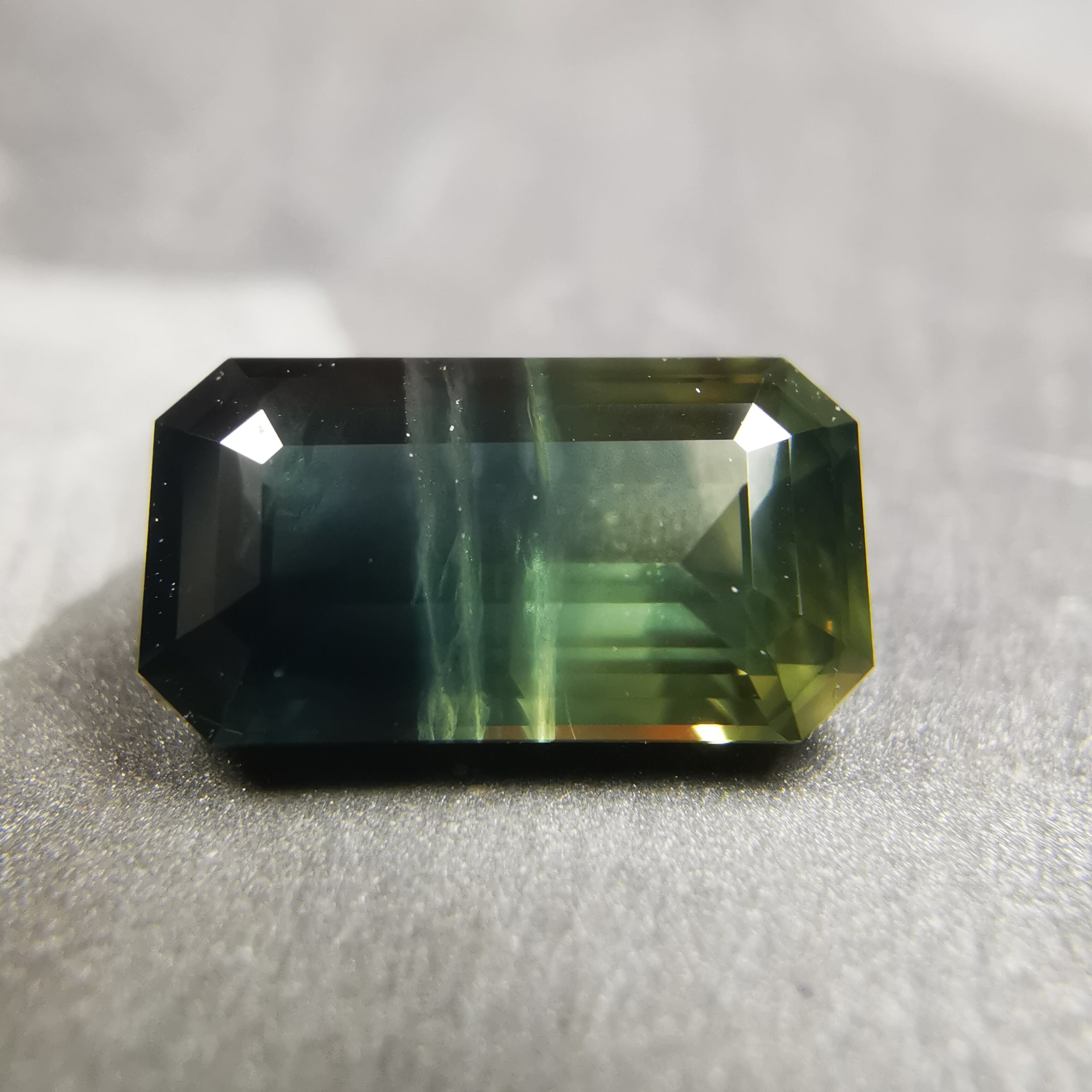 イエローと灰みブルーのバイカラーサファイアの、中心を横切るように白い筋が3本走ります。