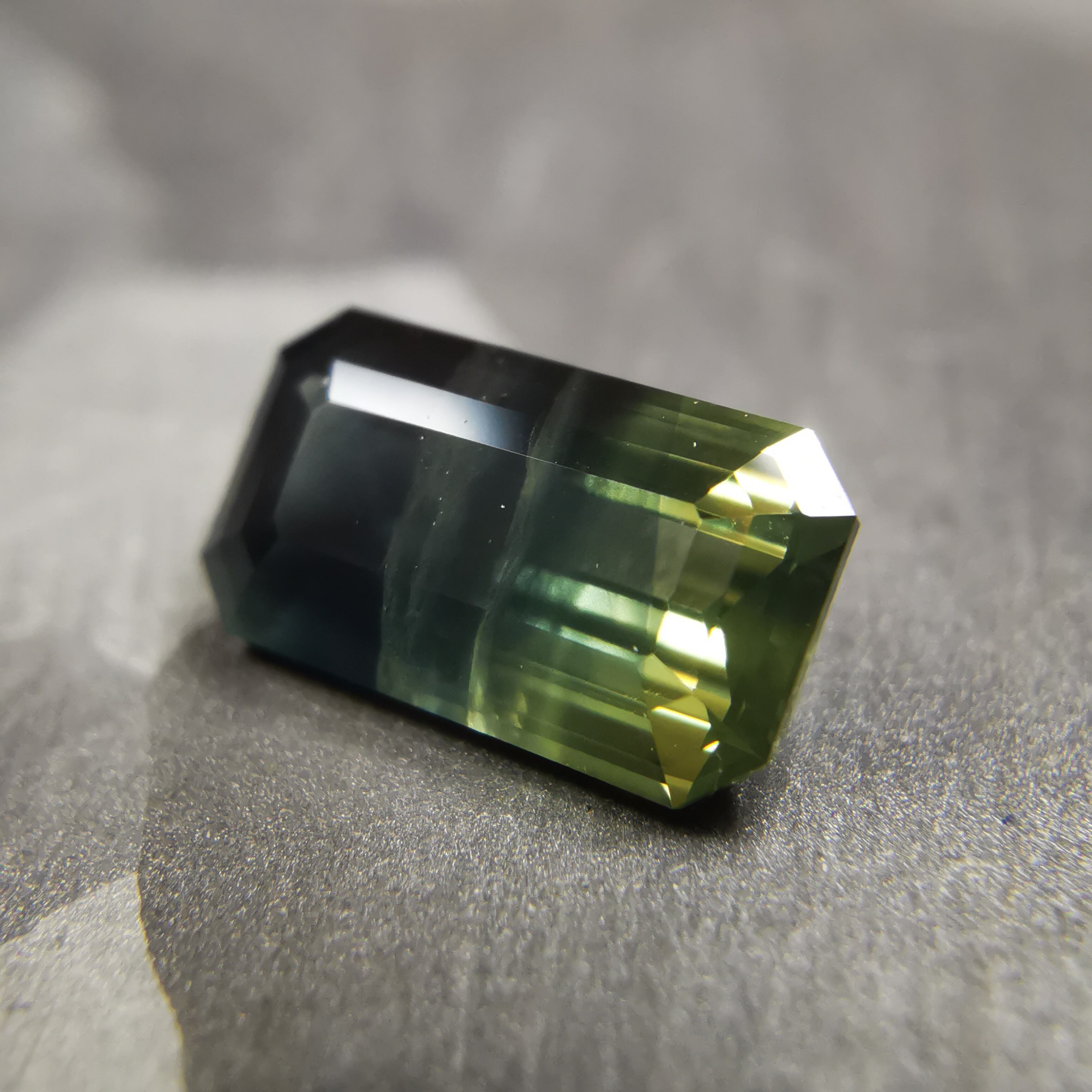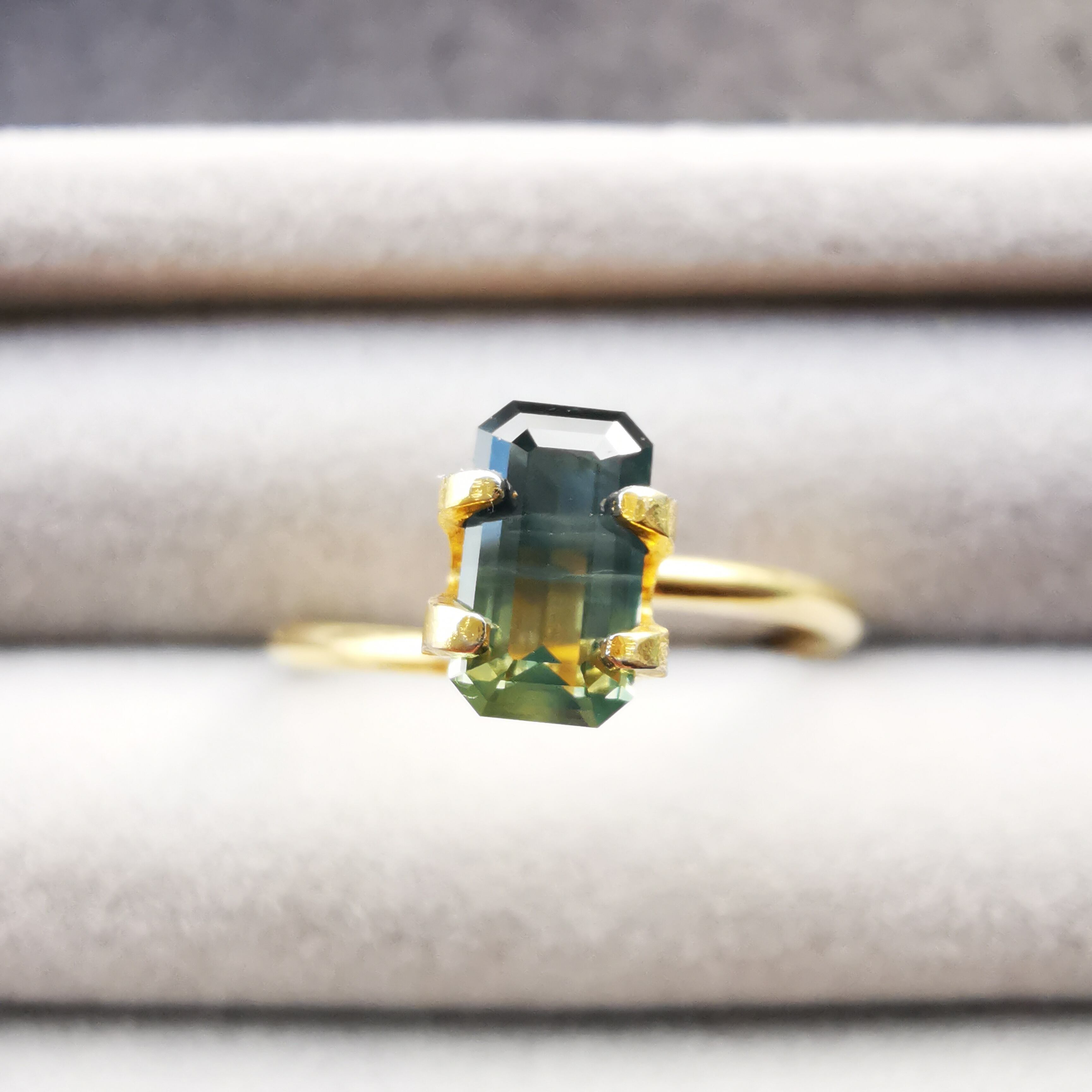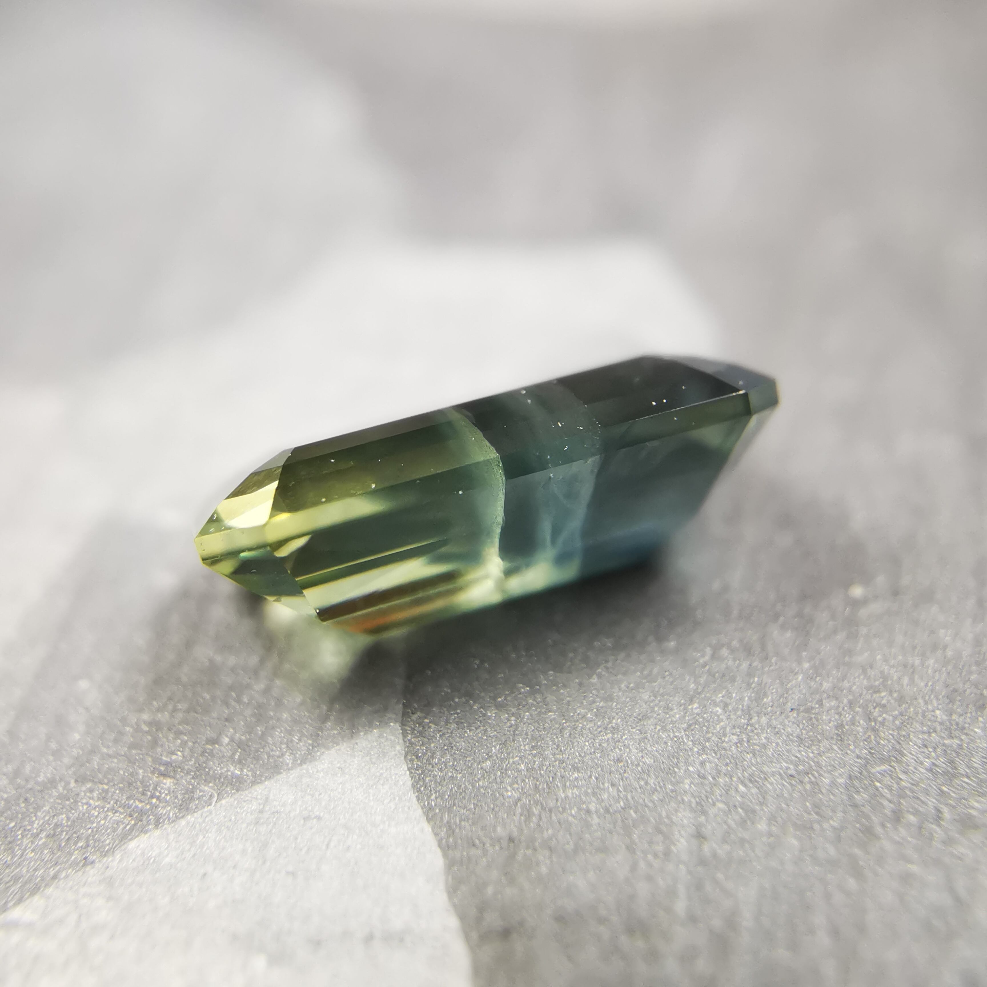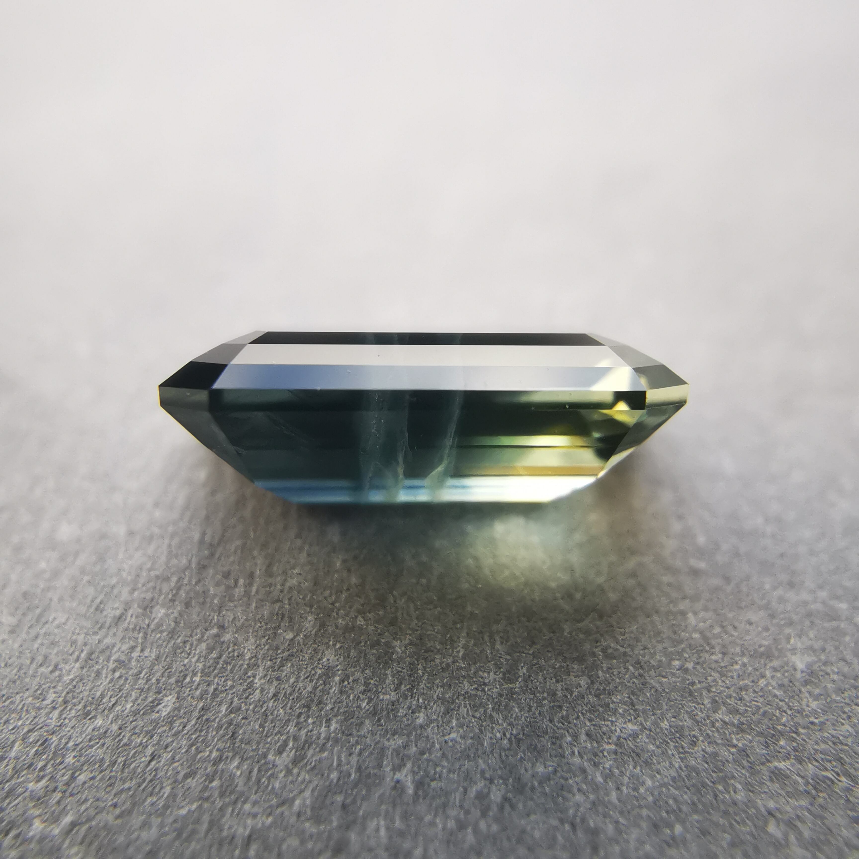 イエローと灰みブルーのバイカラーサファイアの、中心を横切るように白い筋が3本走ります。