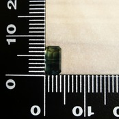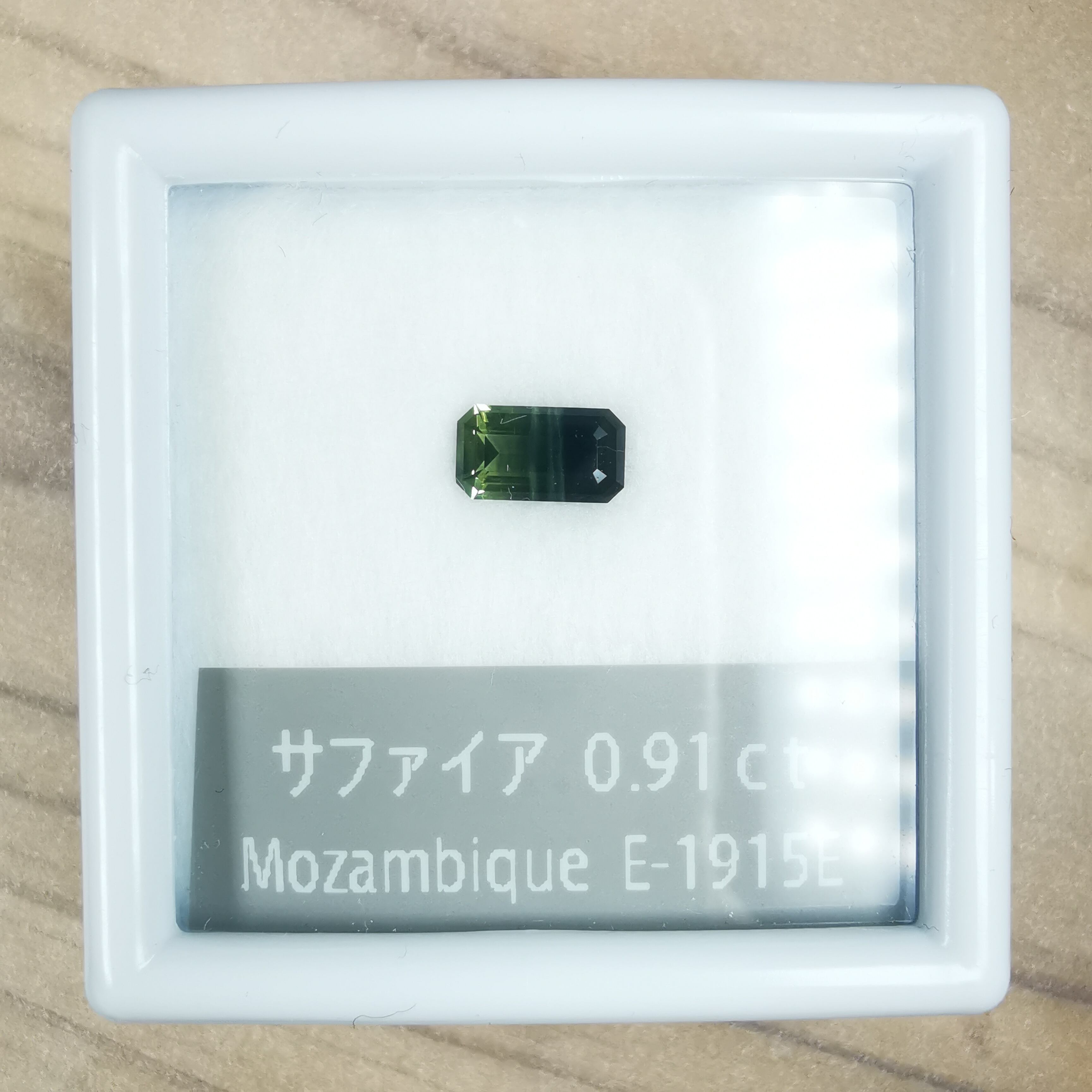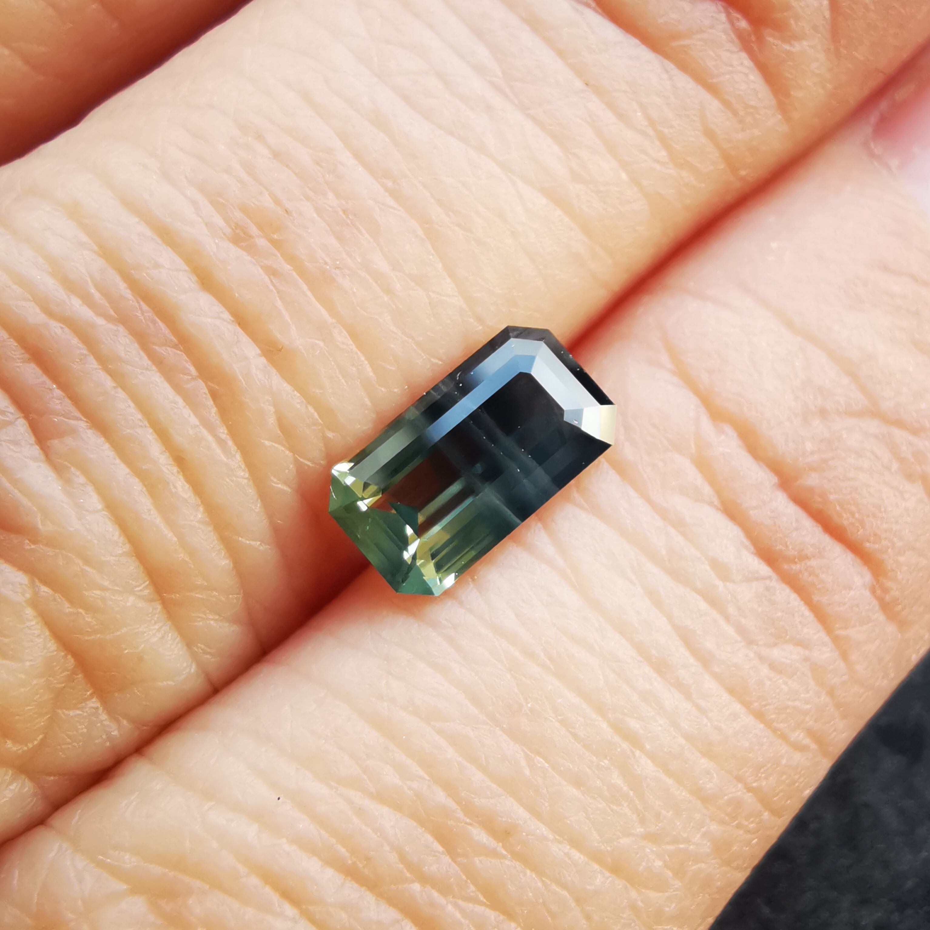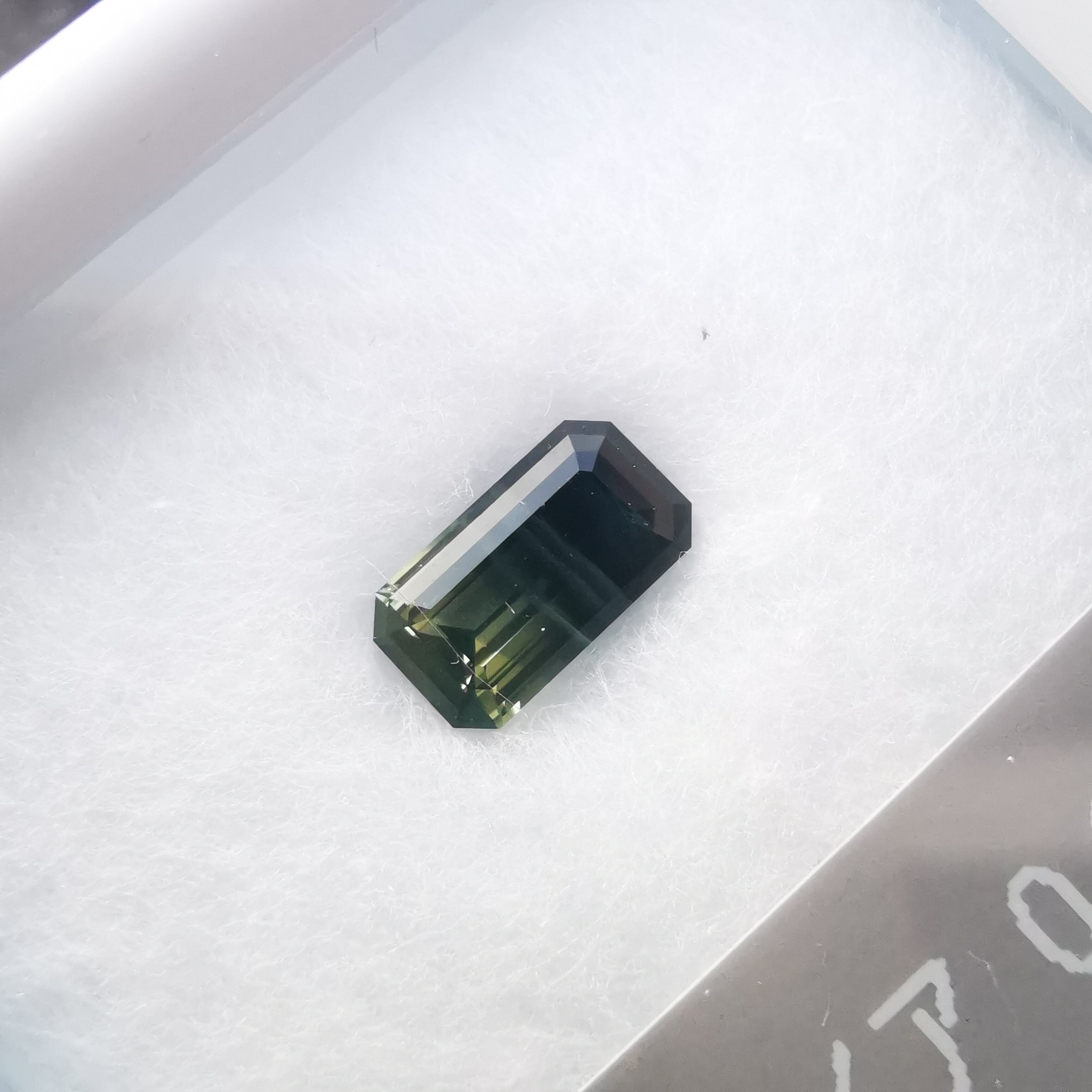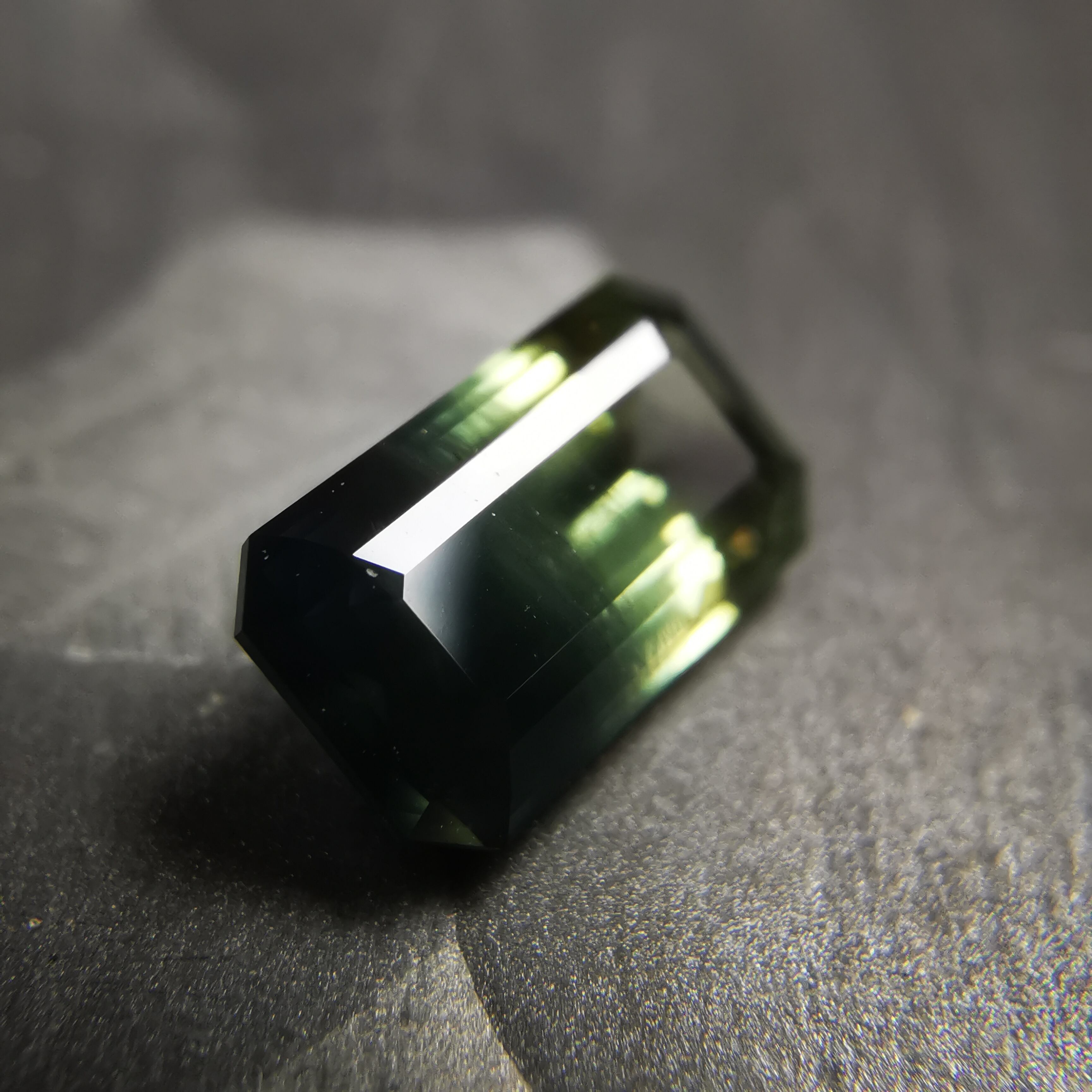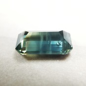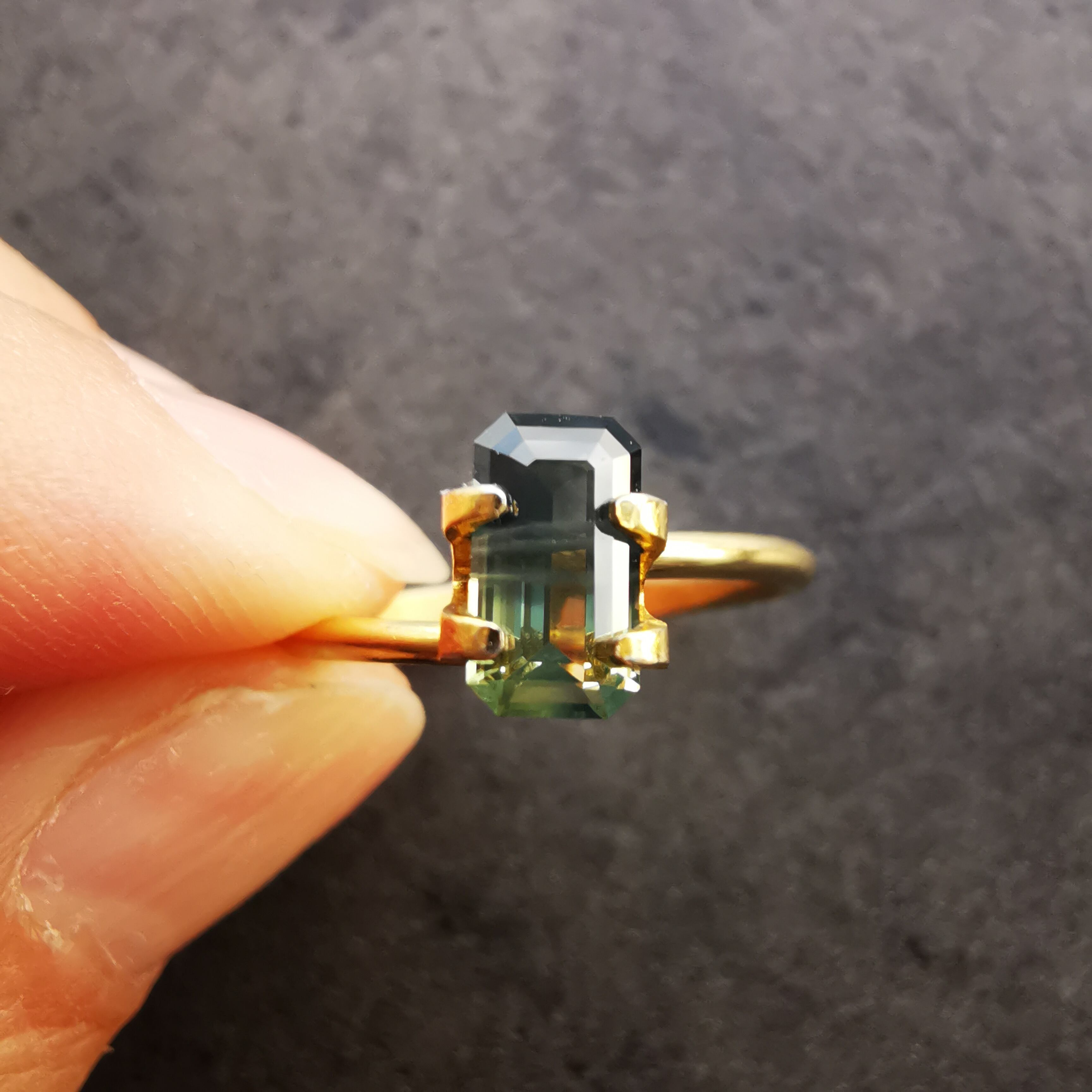 イエローと灰みブルーのバイカラーサファイアの、中心を横切るように白い筋が3本走ります。
