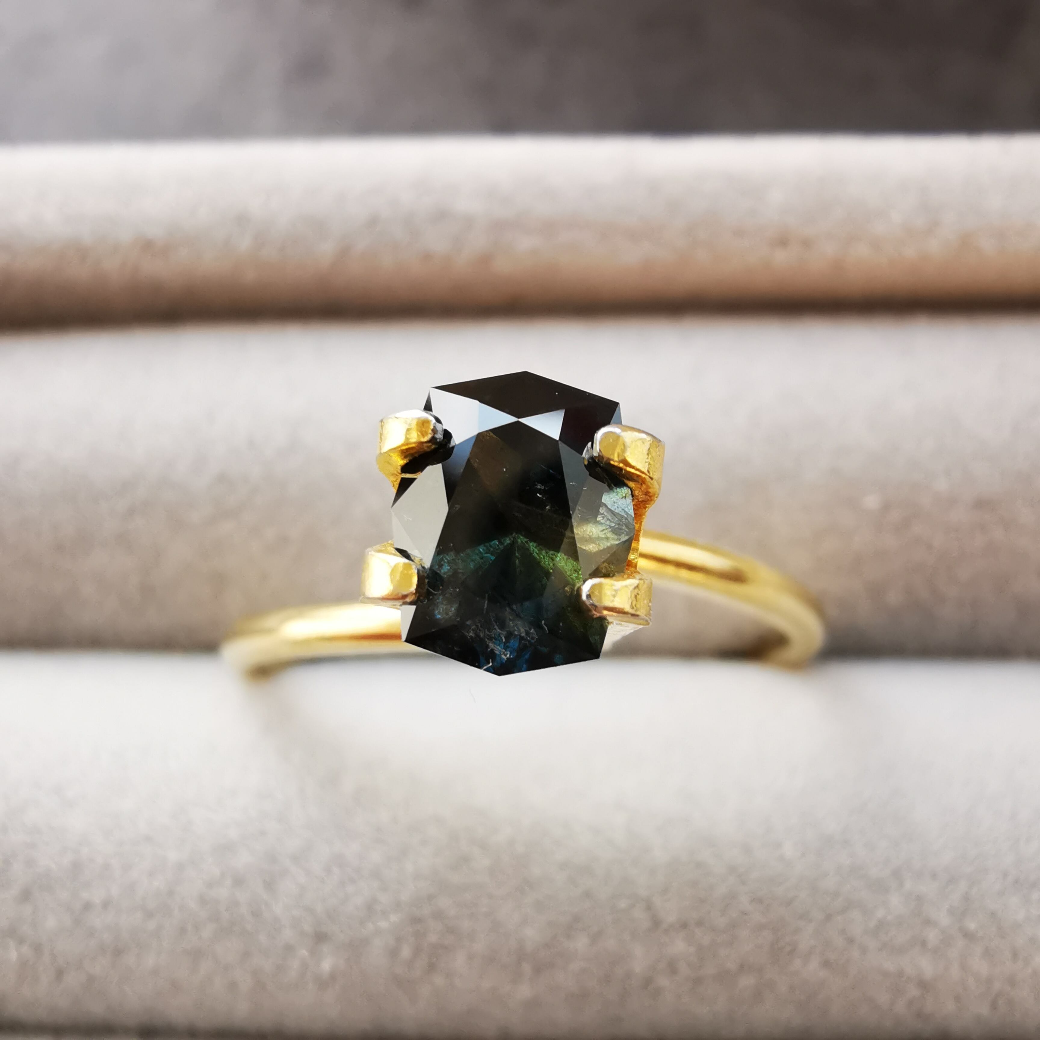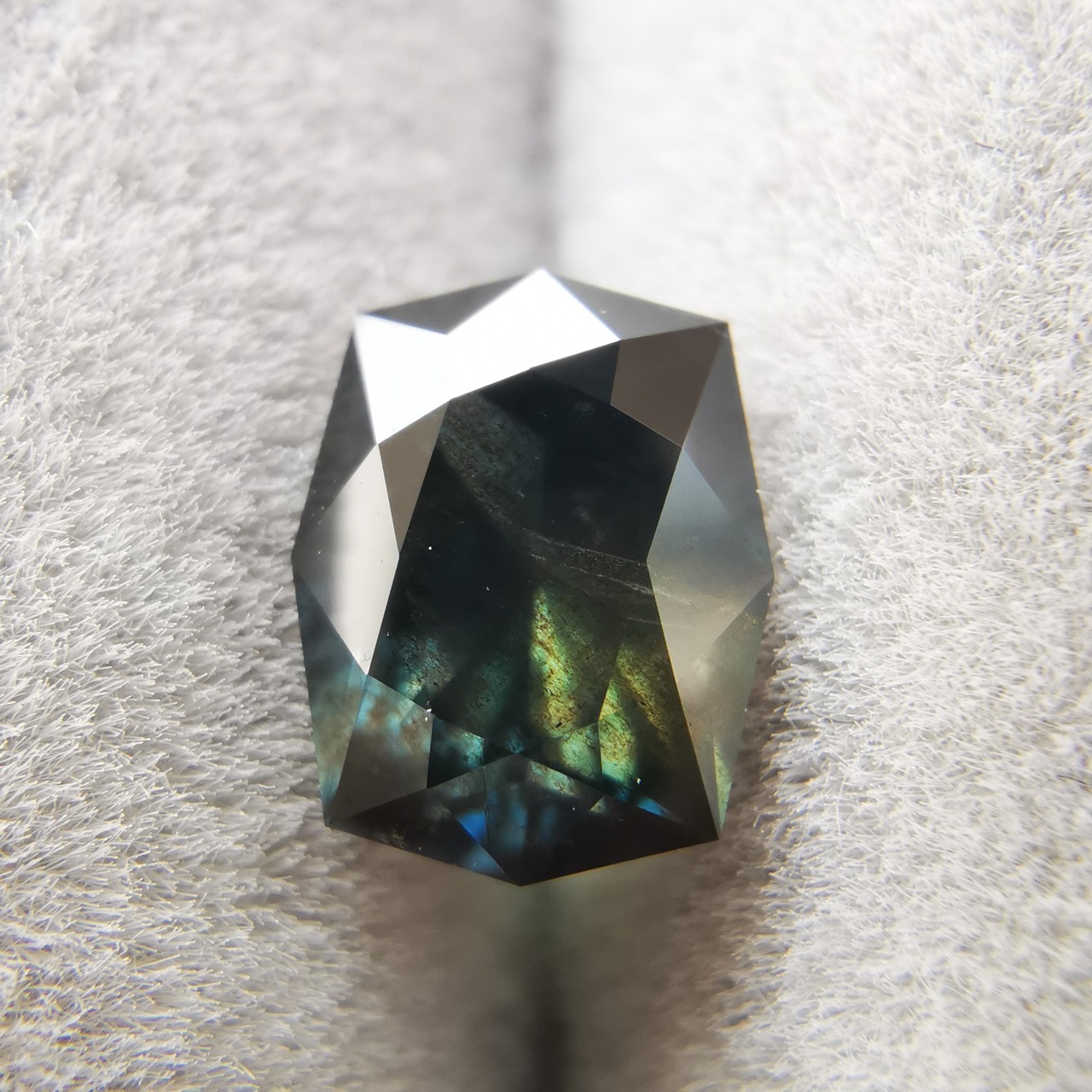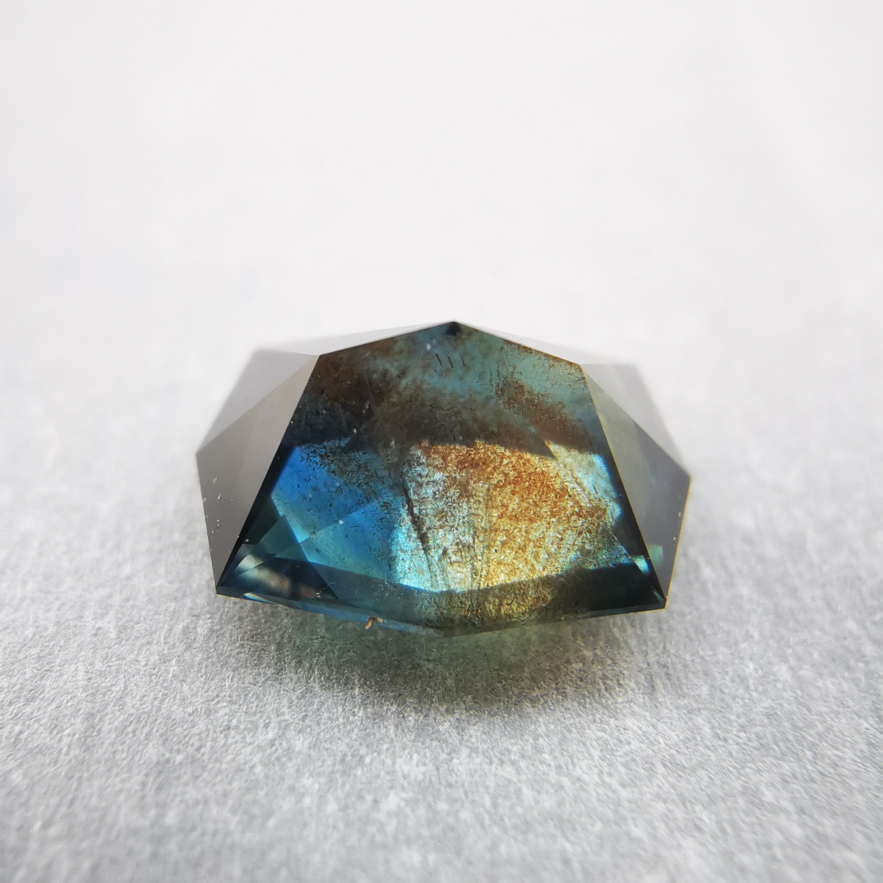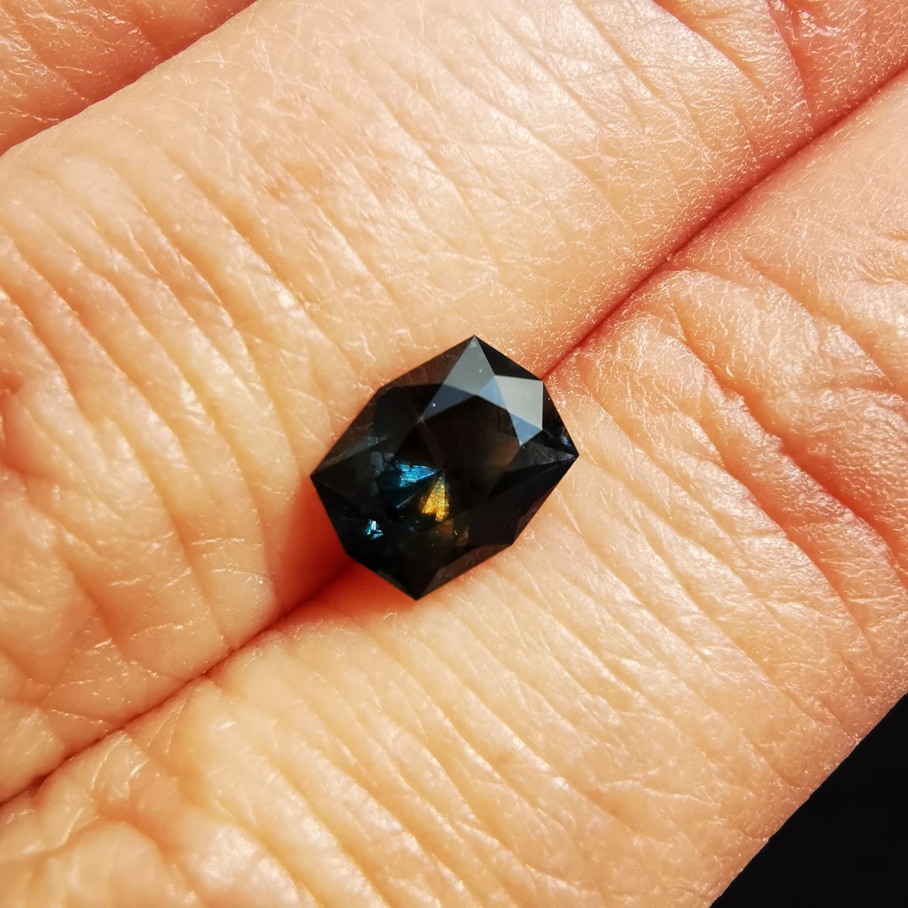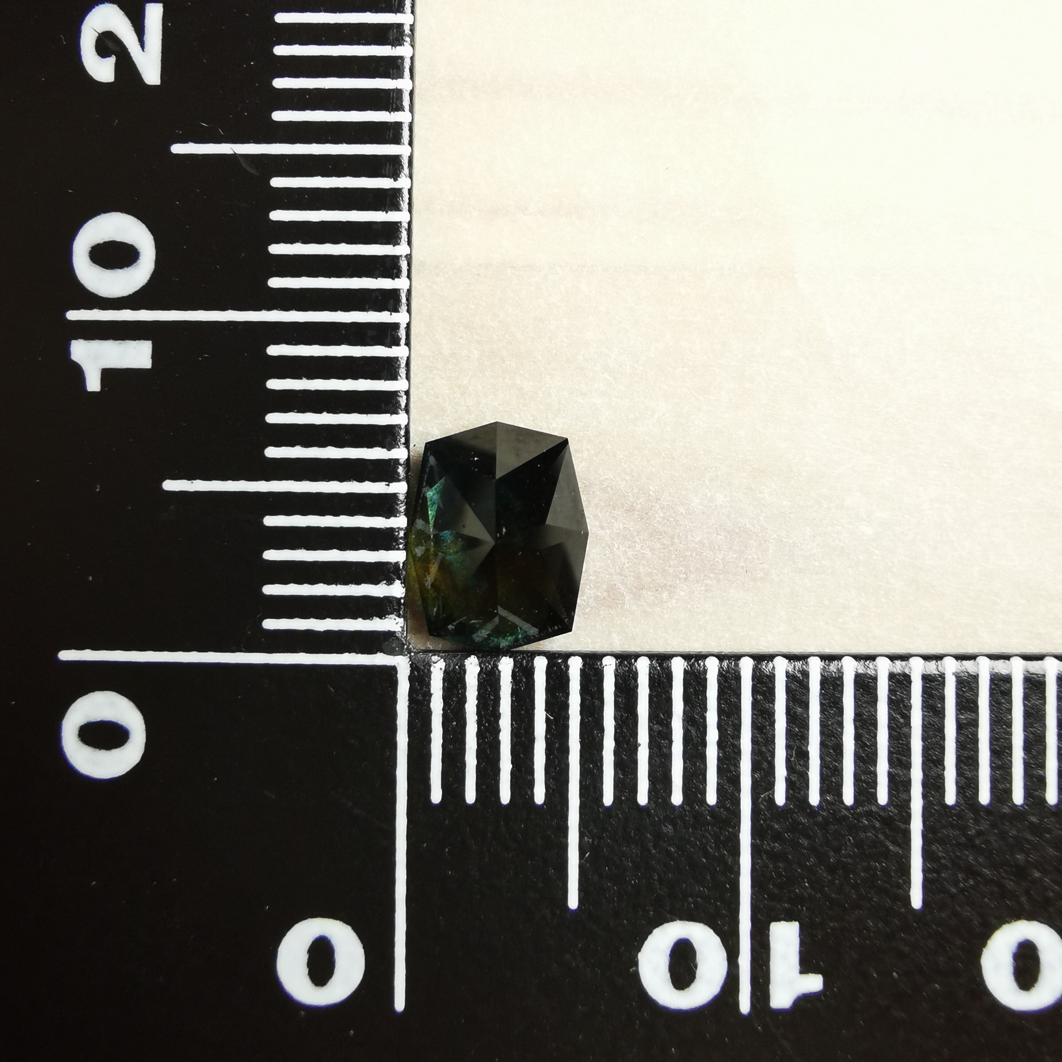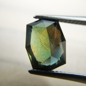 限りなく黒に近い暗い石の中から、ブルーグリーンとゴールドが混ざりチラチラときらめきます。