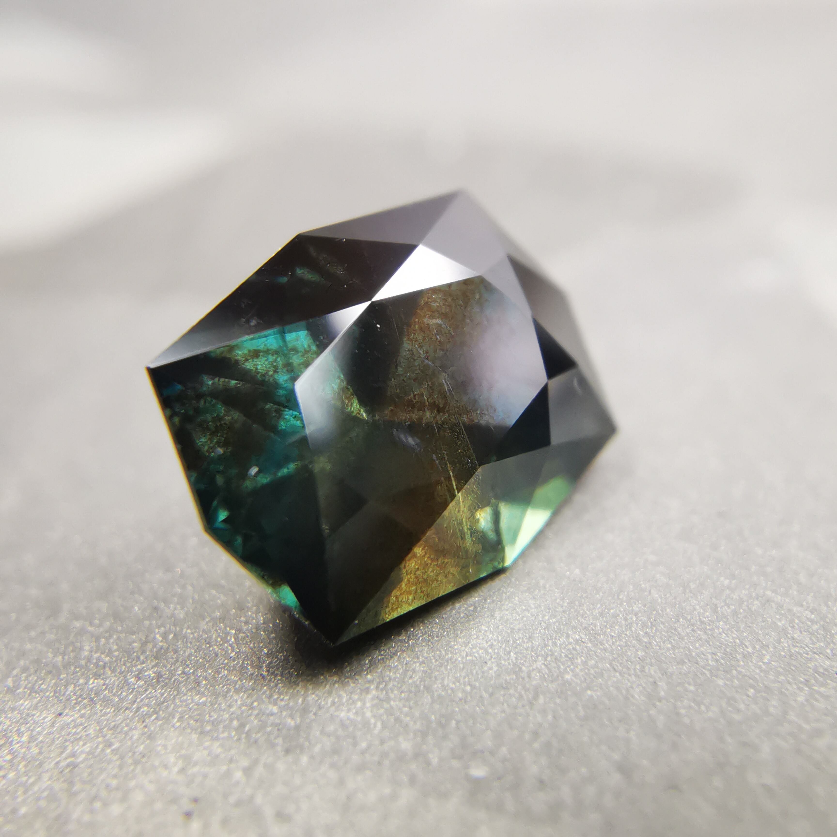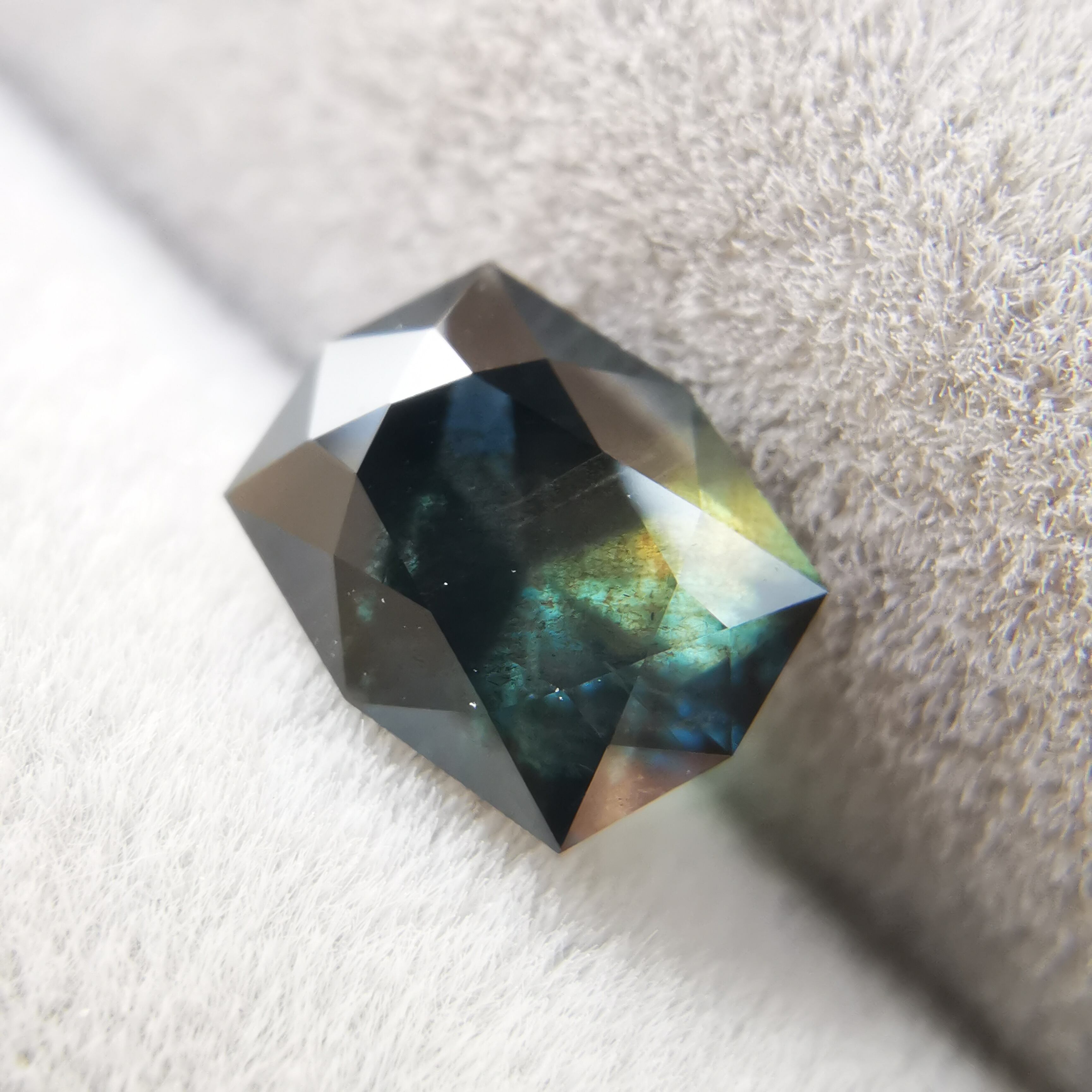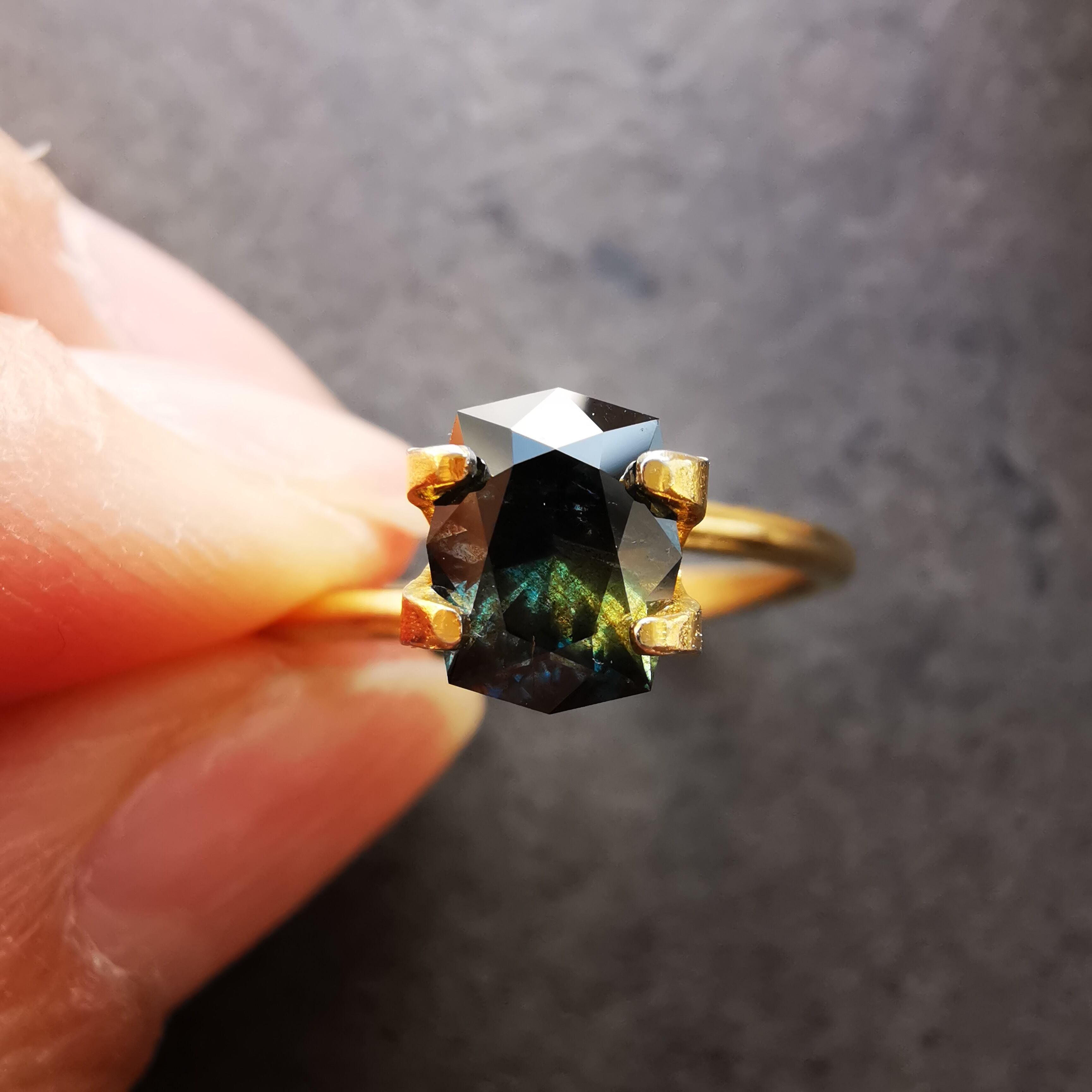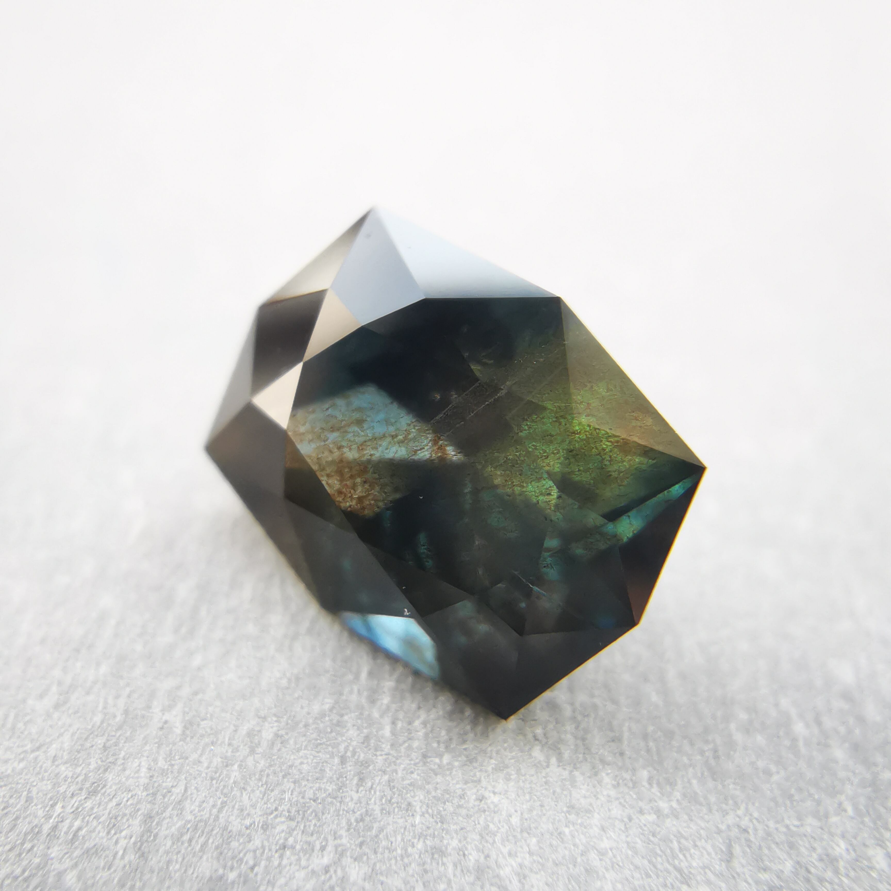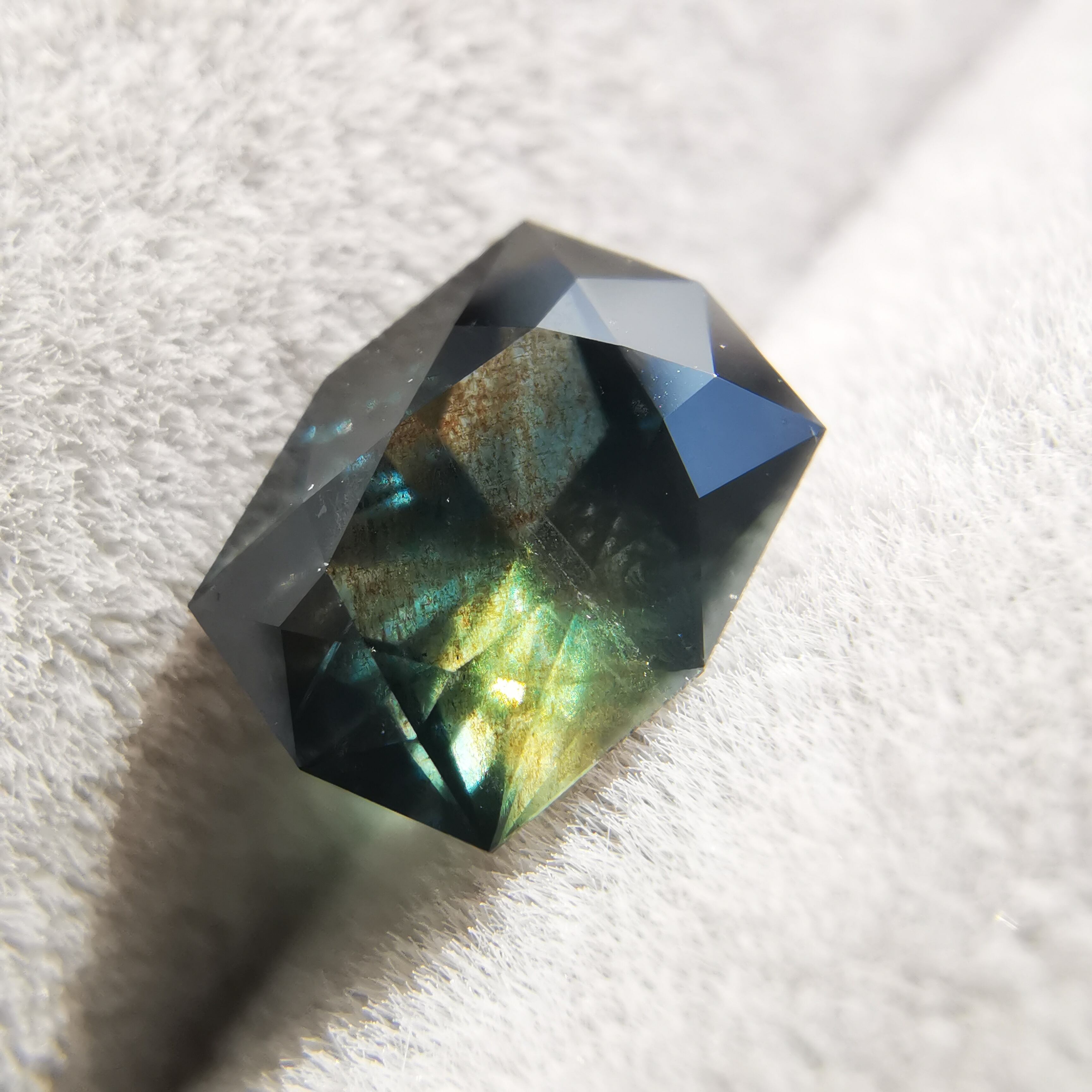 限りなく黒に近い暗い石の中から、ブルーグリーンとゴールドが混ざりチラチラときらめきます。