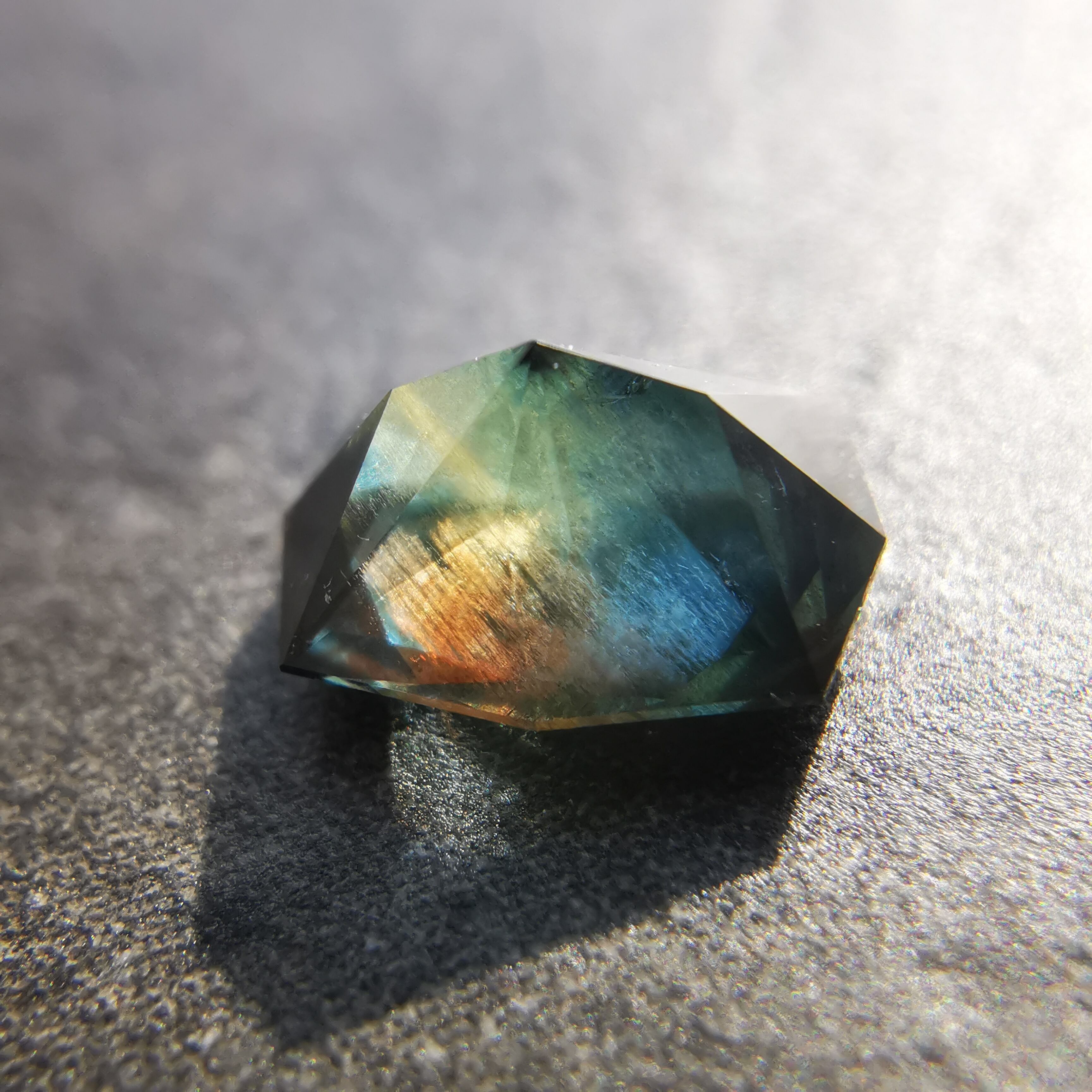 石の奥の方にある錆色のインクルージョンは、強い光が当たった時だけ、金色にきらめきます。