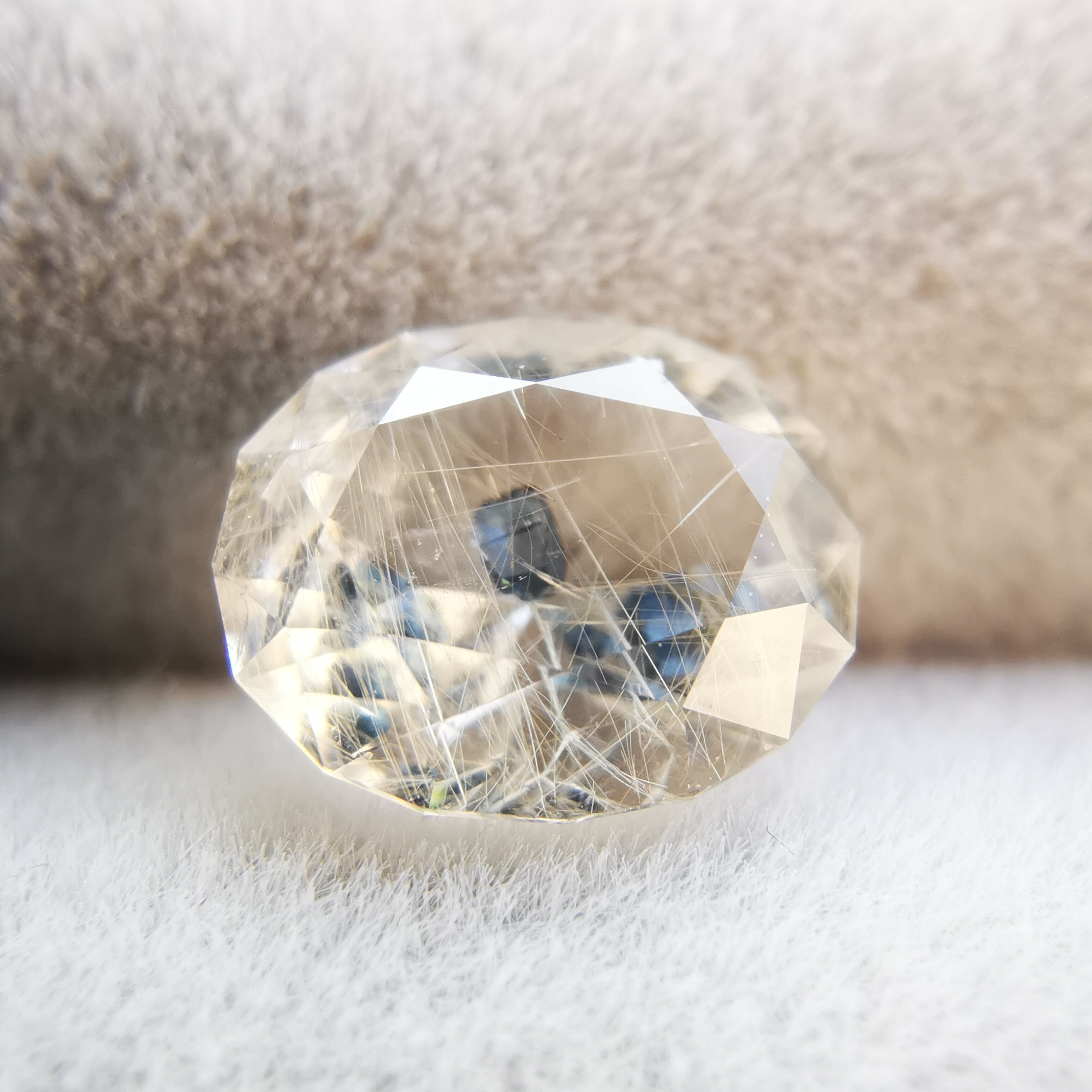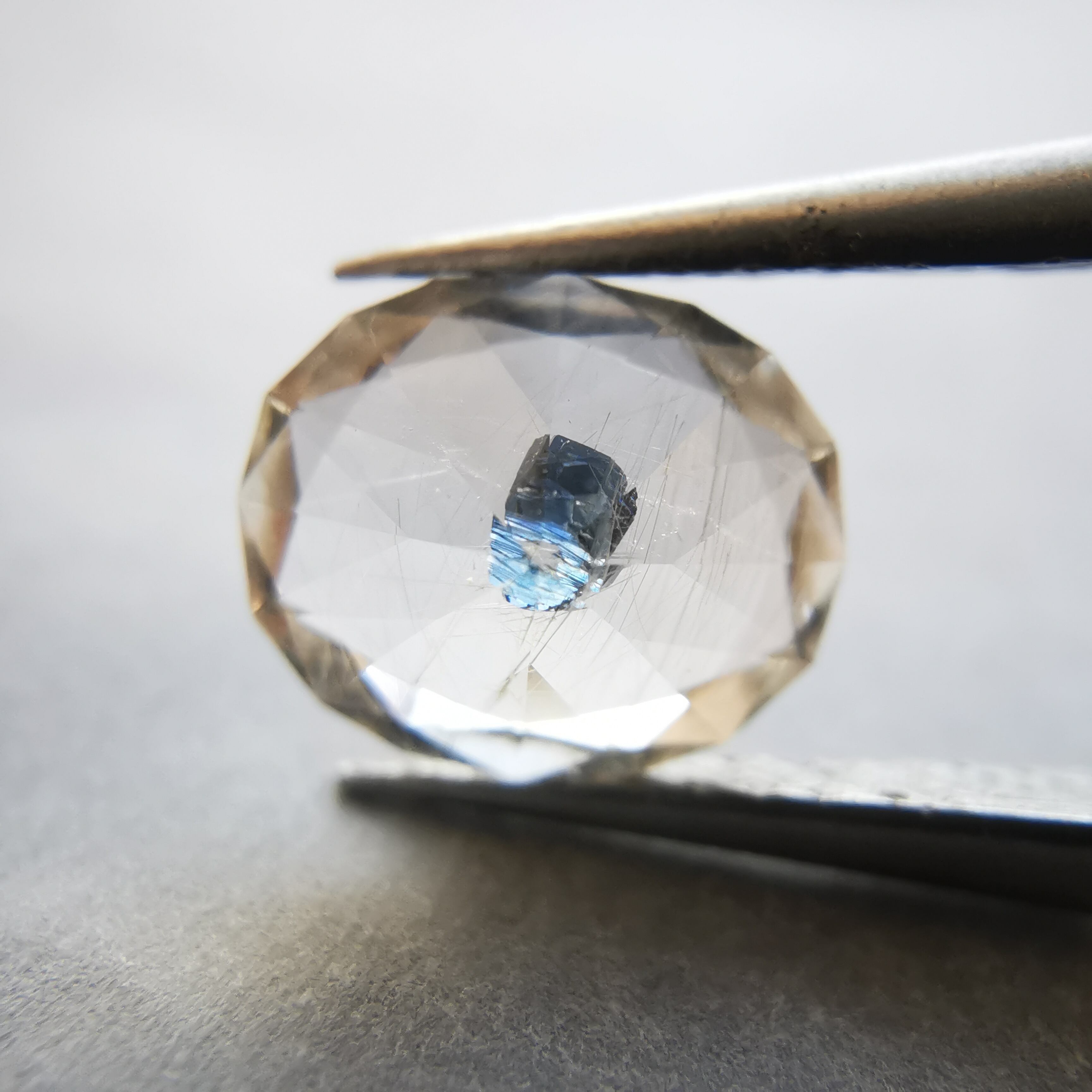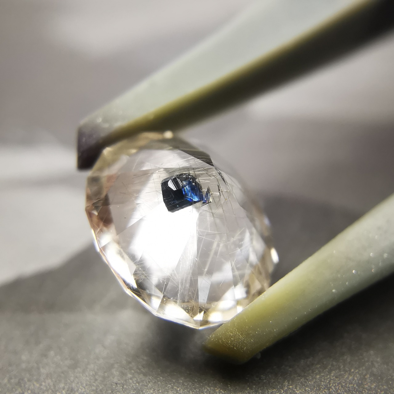 クリアなクォーツに入ったアナテースは黒に近いですが、光が当たると表面がブルーにきらめきます。