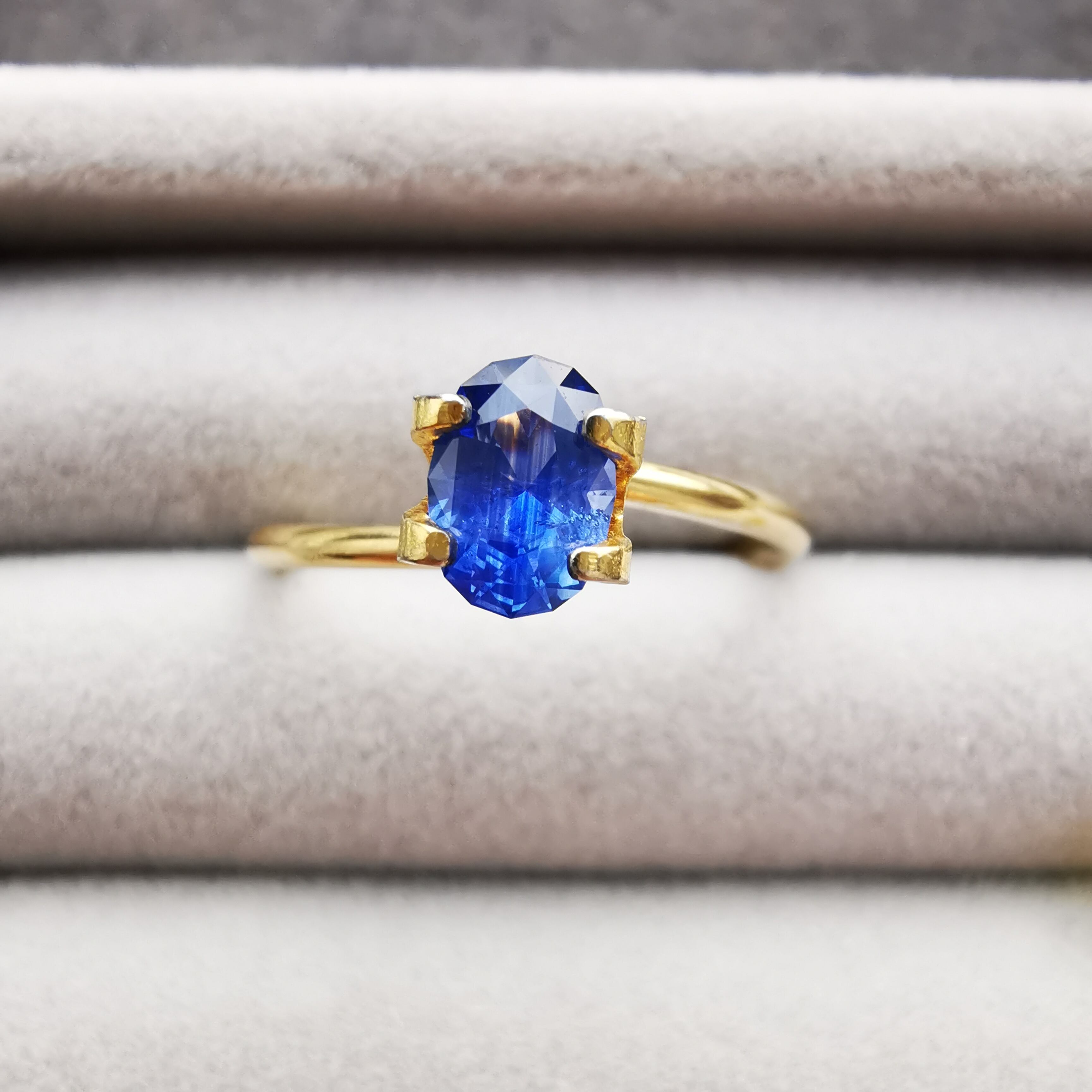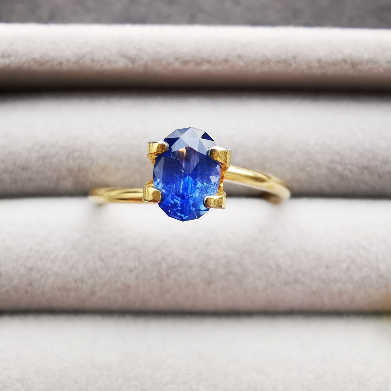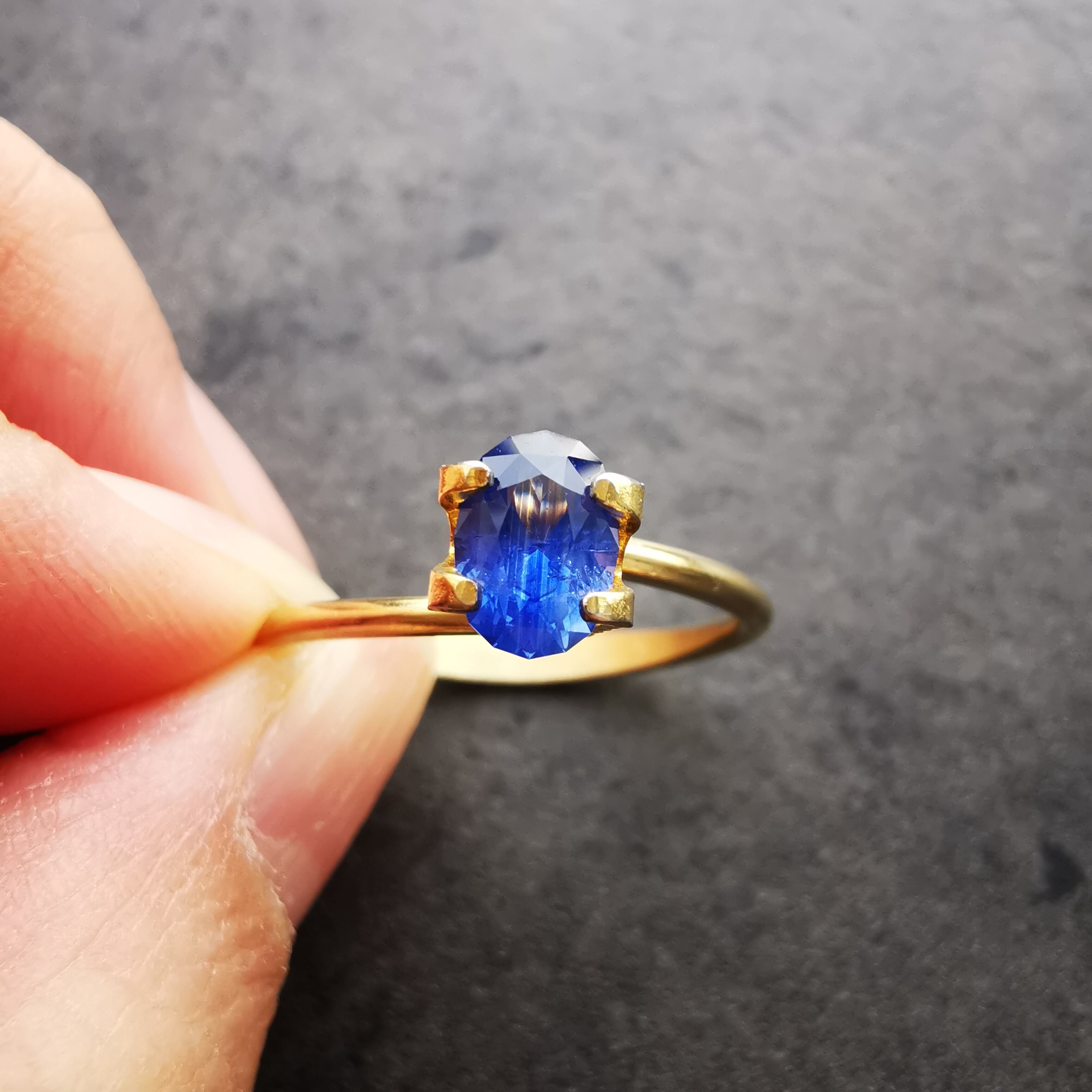 カラーバンドのあるサファイアは決して珍しいものではありませんが、あえて石の中心に配置、縦に真っ直ぐ走るようにカットしたカッターさんの遊び心が光ります。