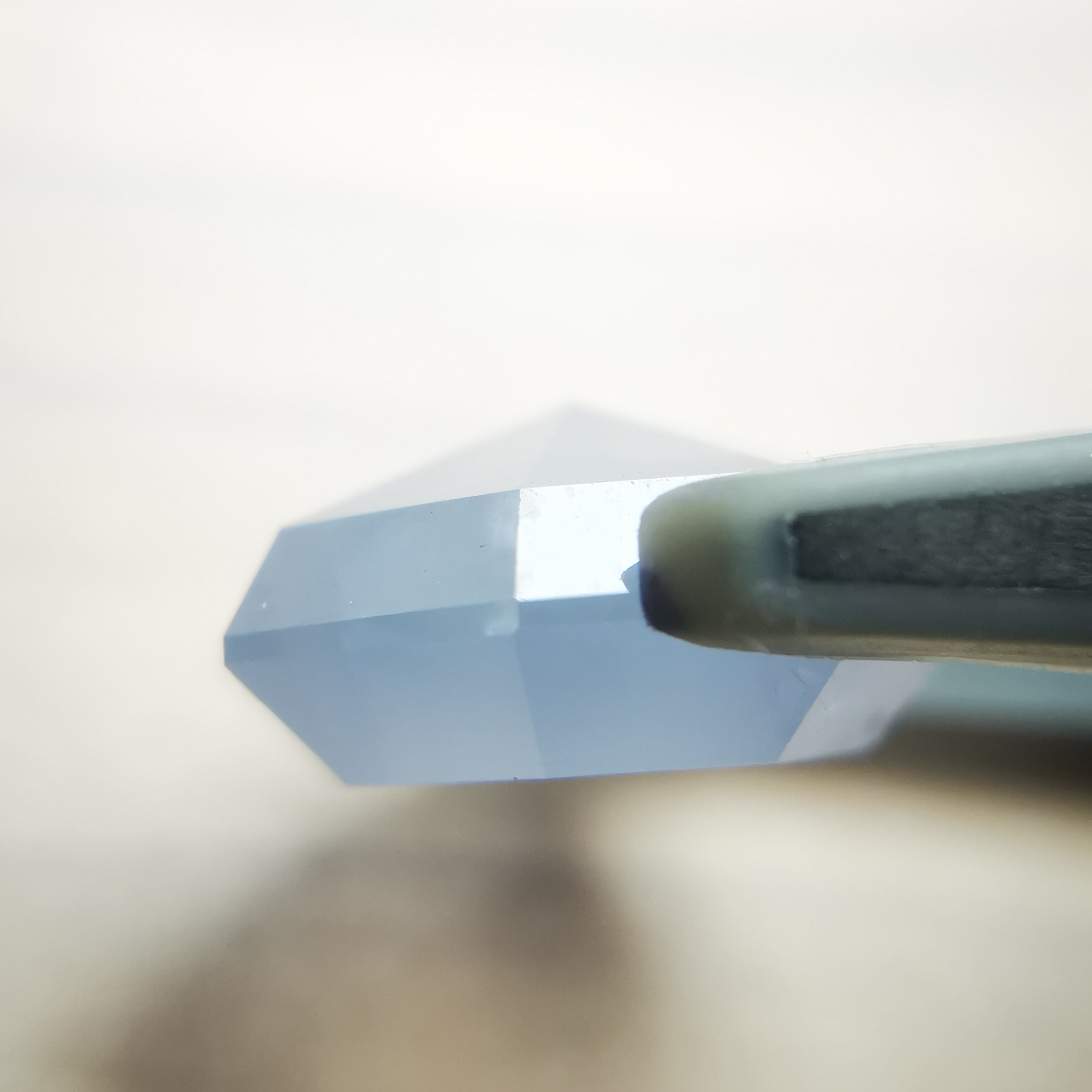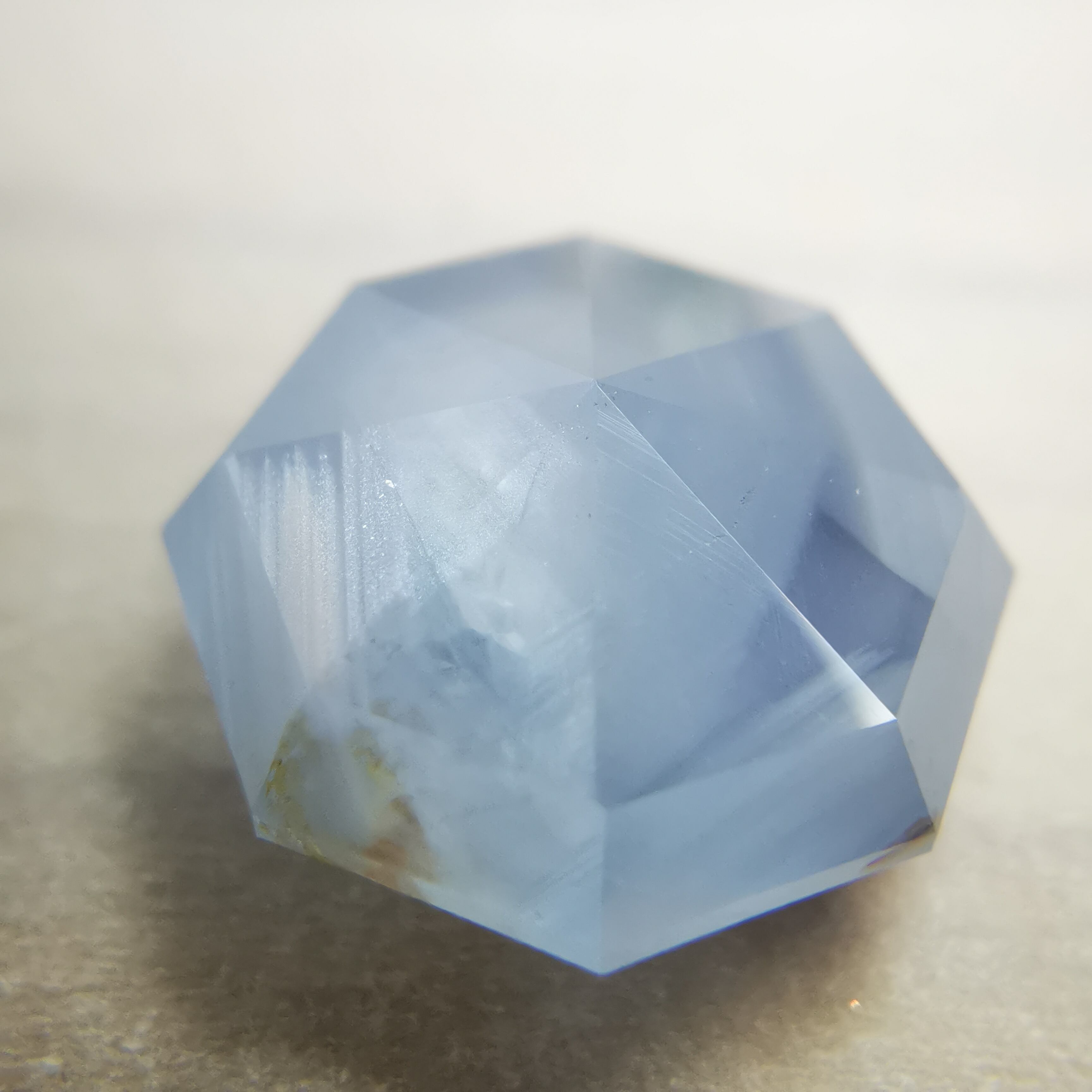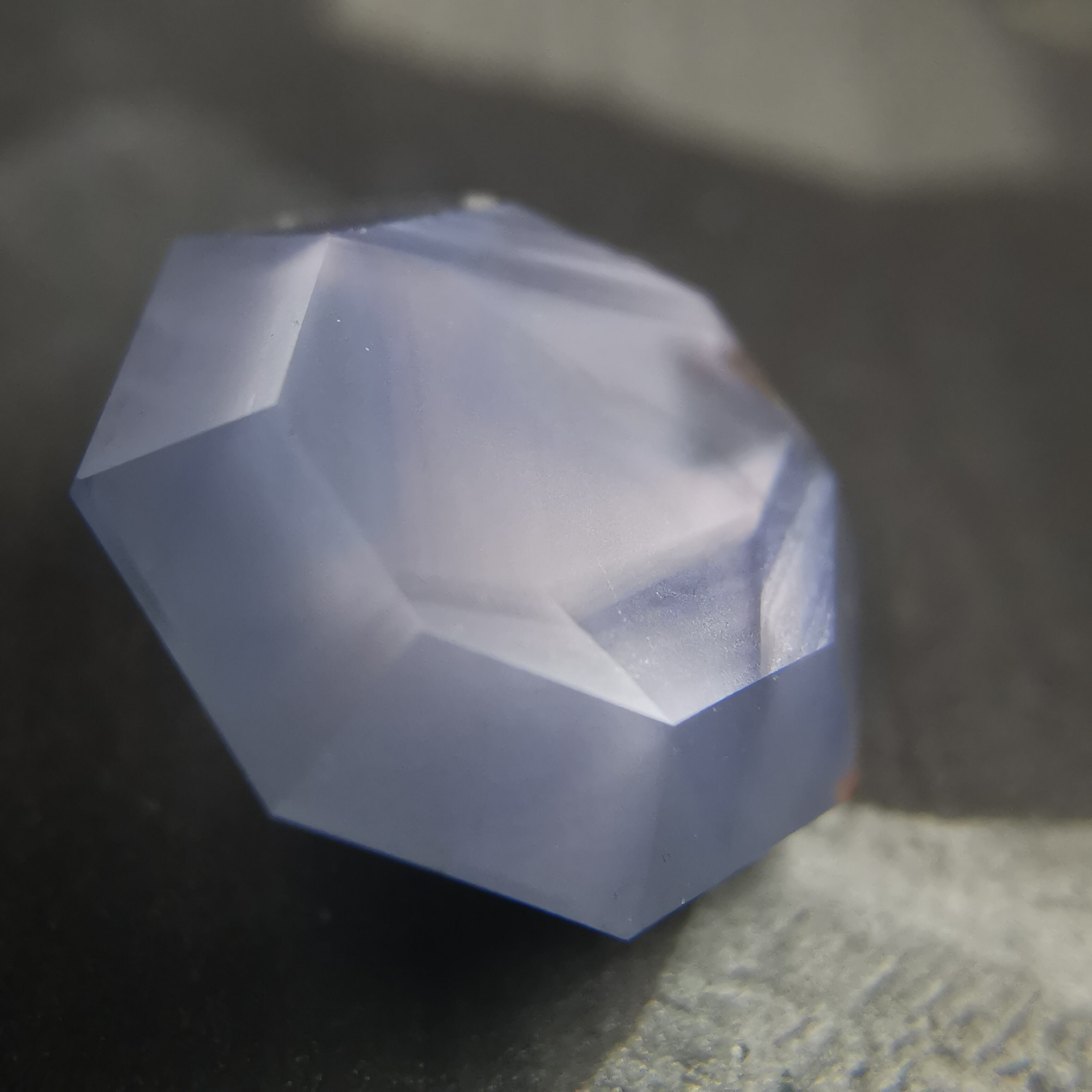 三角形の1面ごとに、透明度にグラデーションがあり、シルキーなカラーバンドが見えたり、青みが強くなったり、シルクインクルージョンがきらめいたり、様々な異なる景色を見せます。