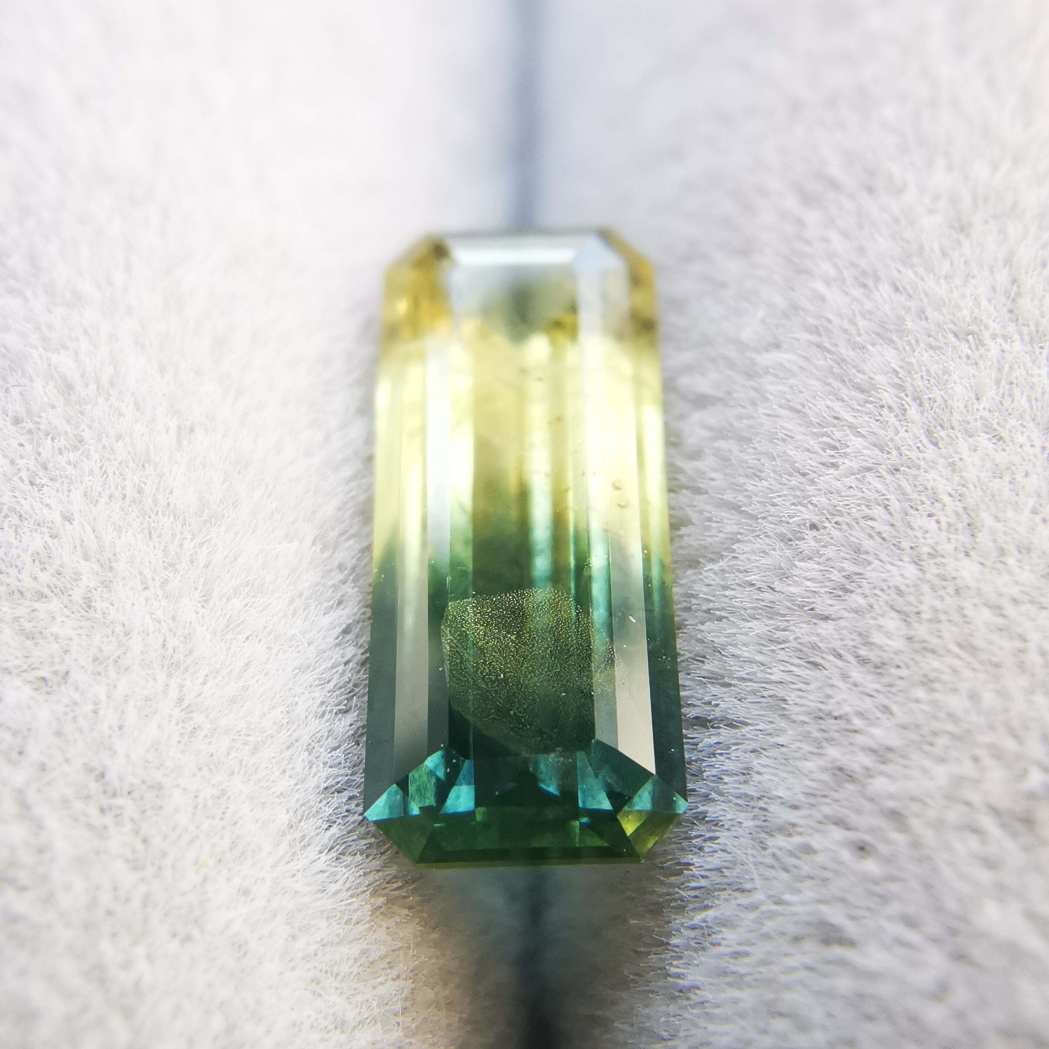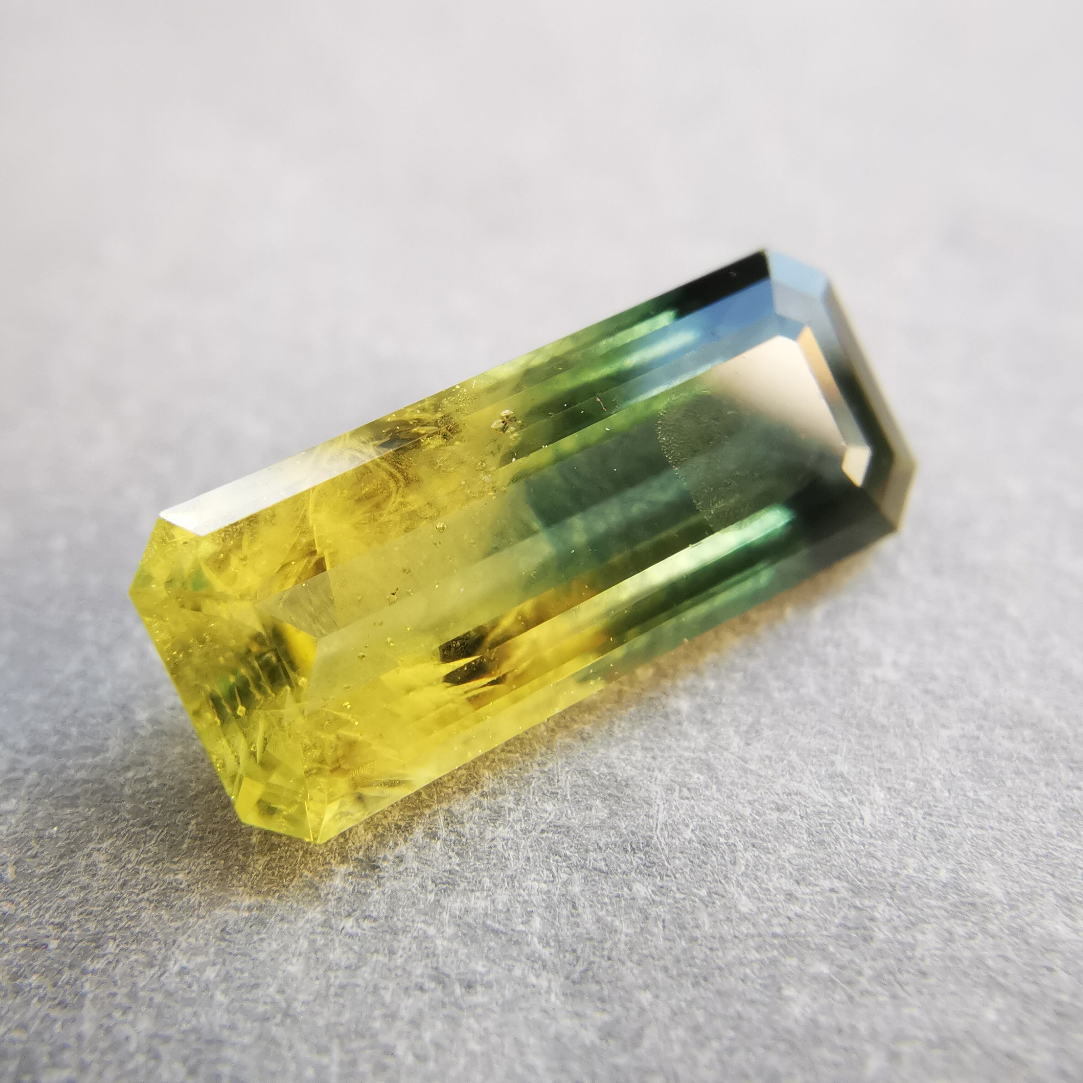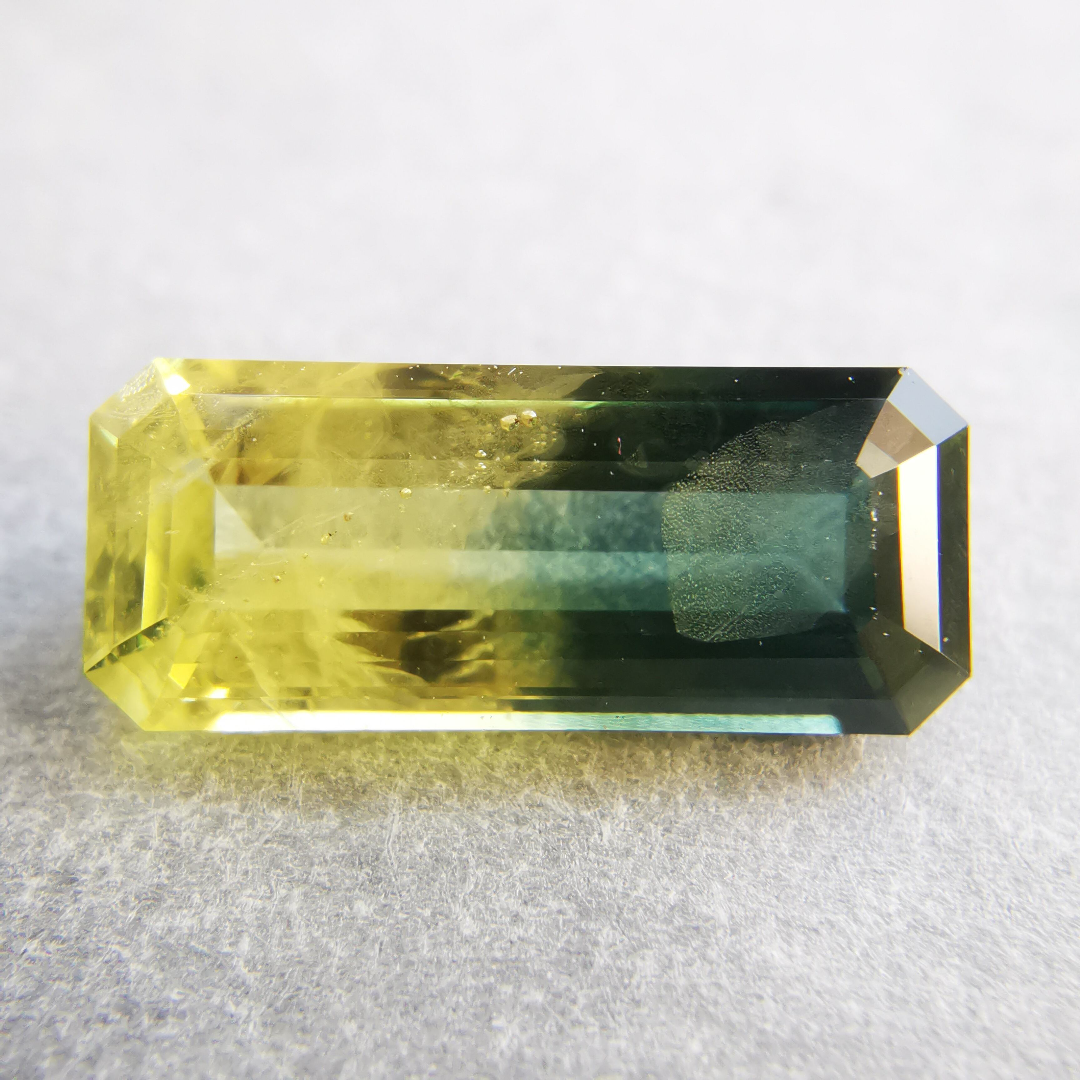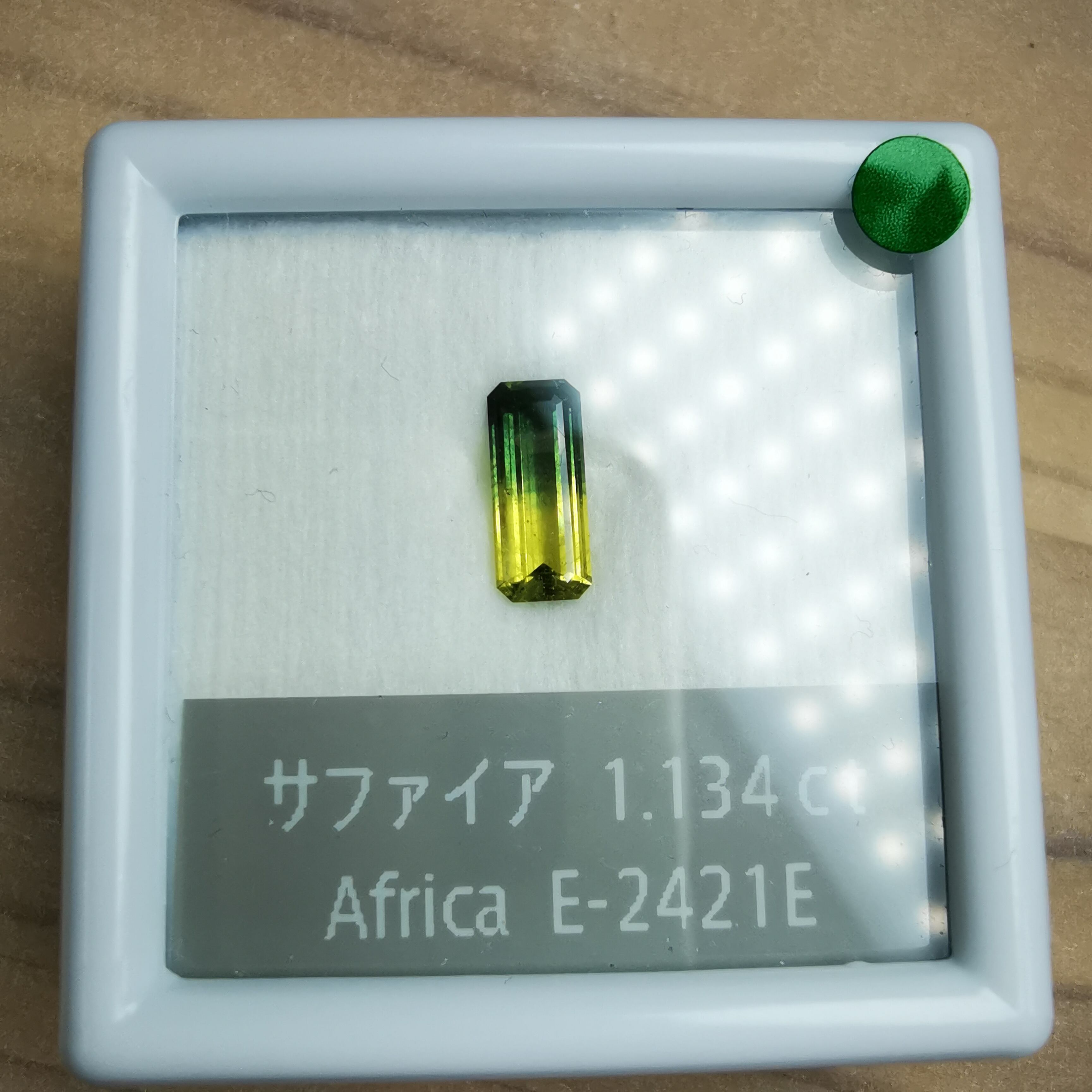 わずかに緑みの鮮やかな黄色/黄蘗色と、深い緑色/萌葱色のバイカラーサファイアです。