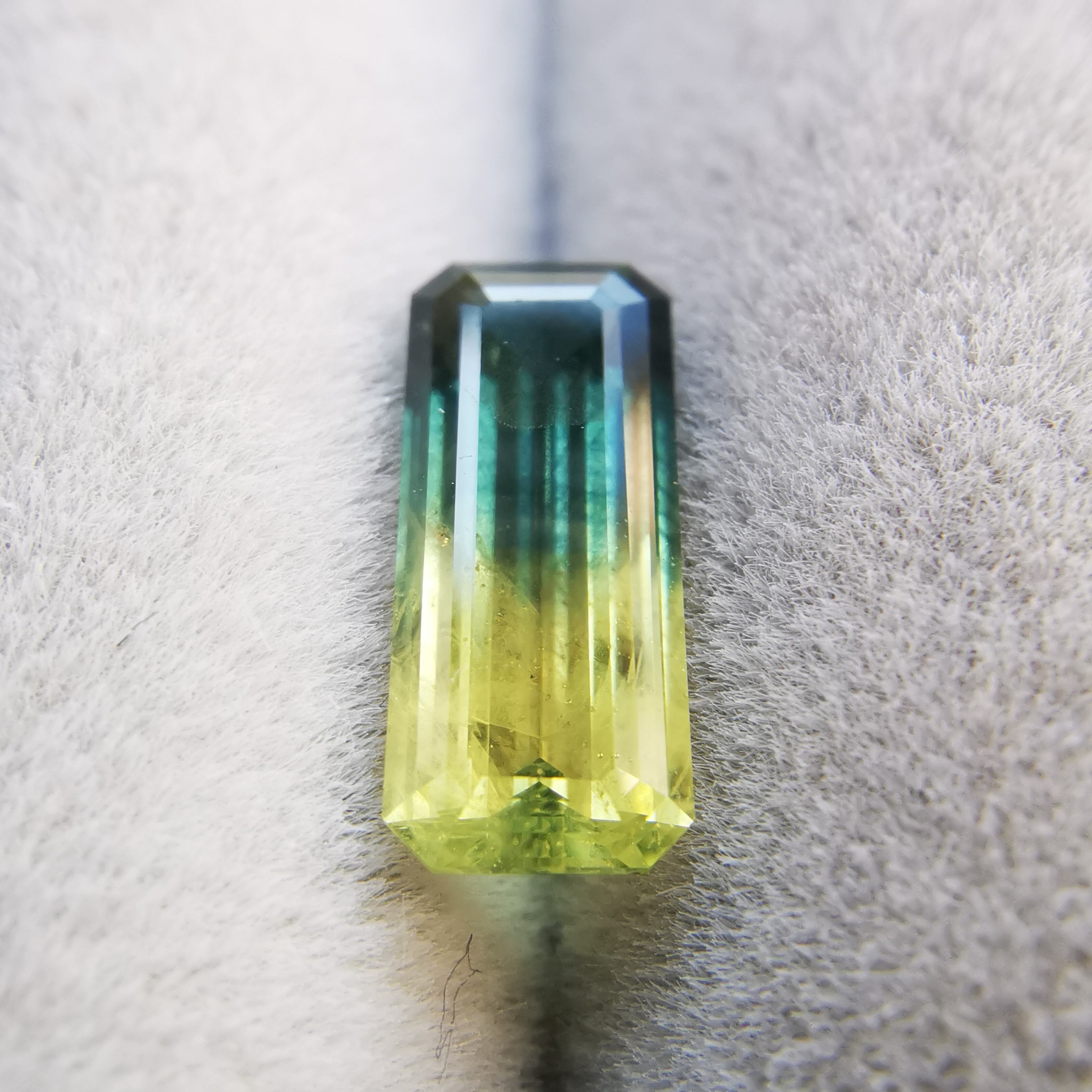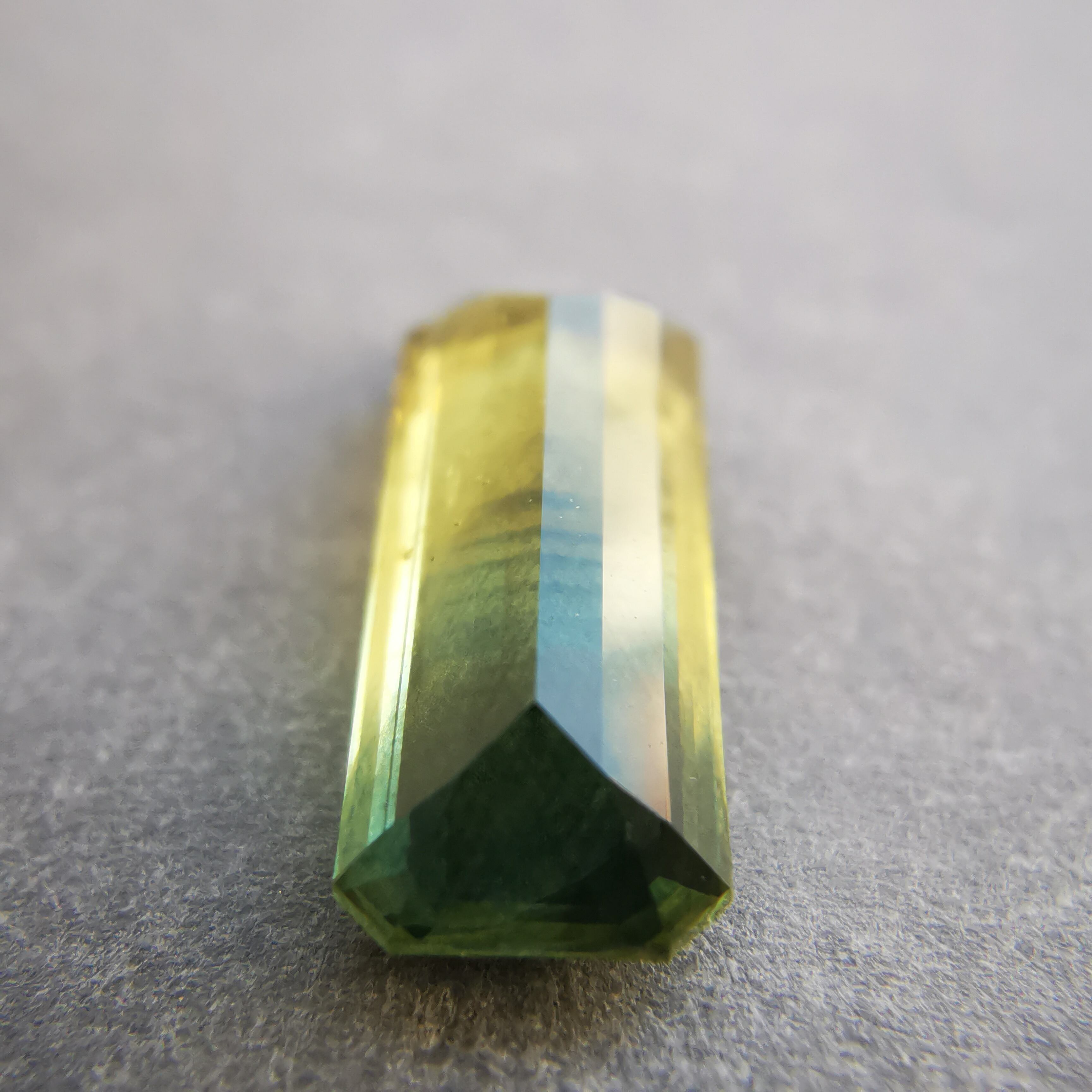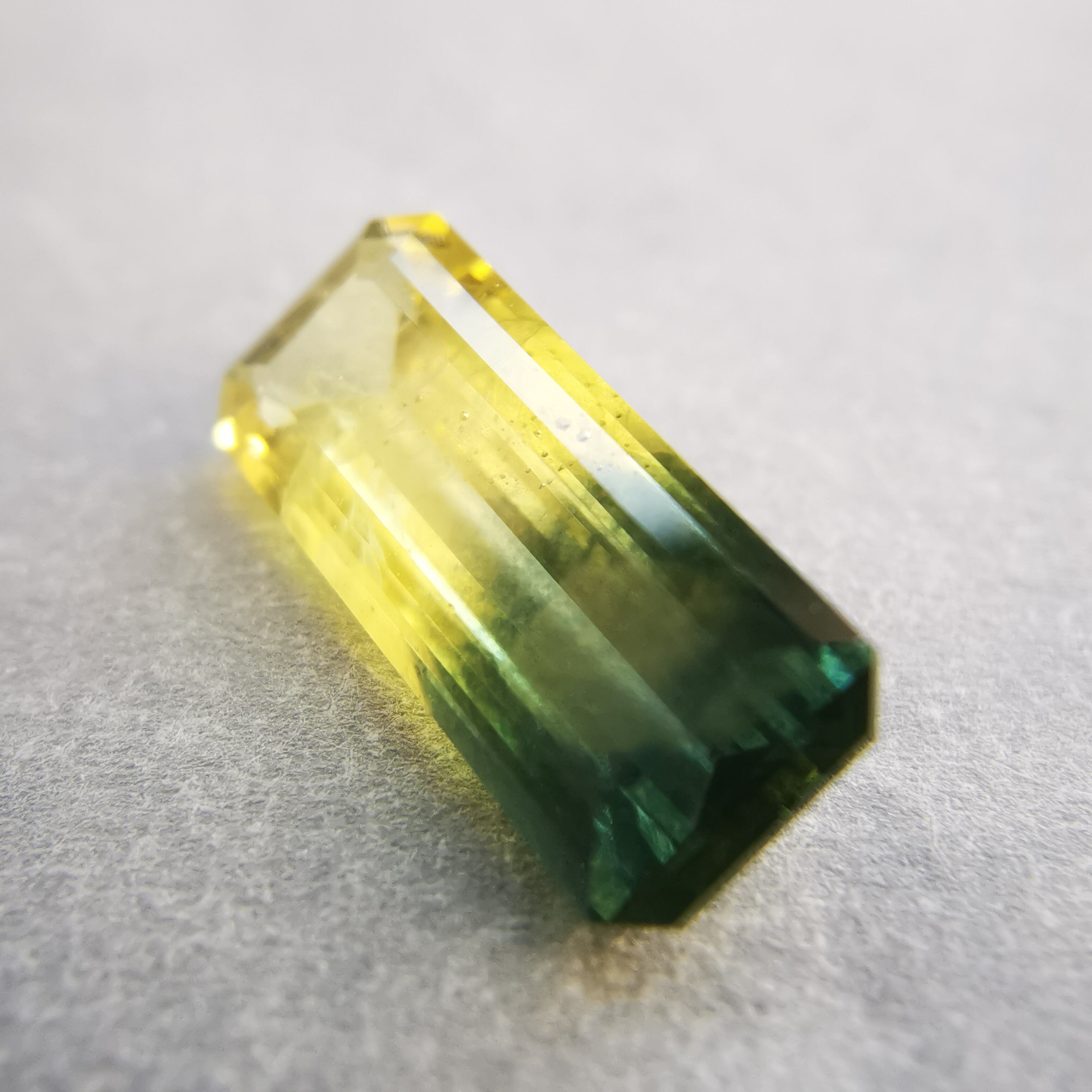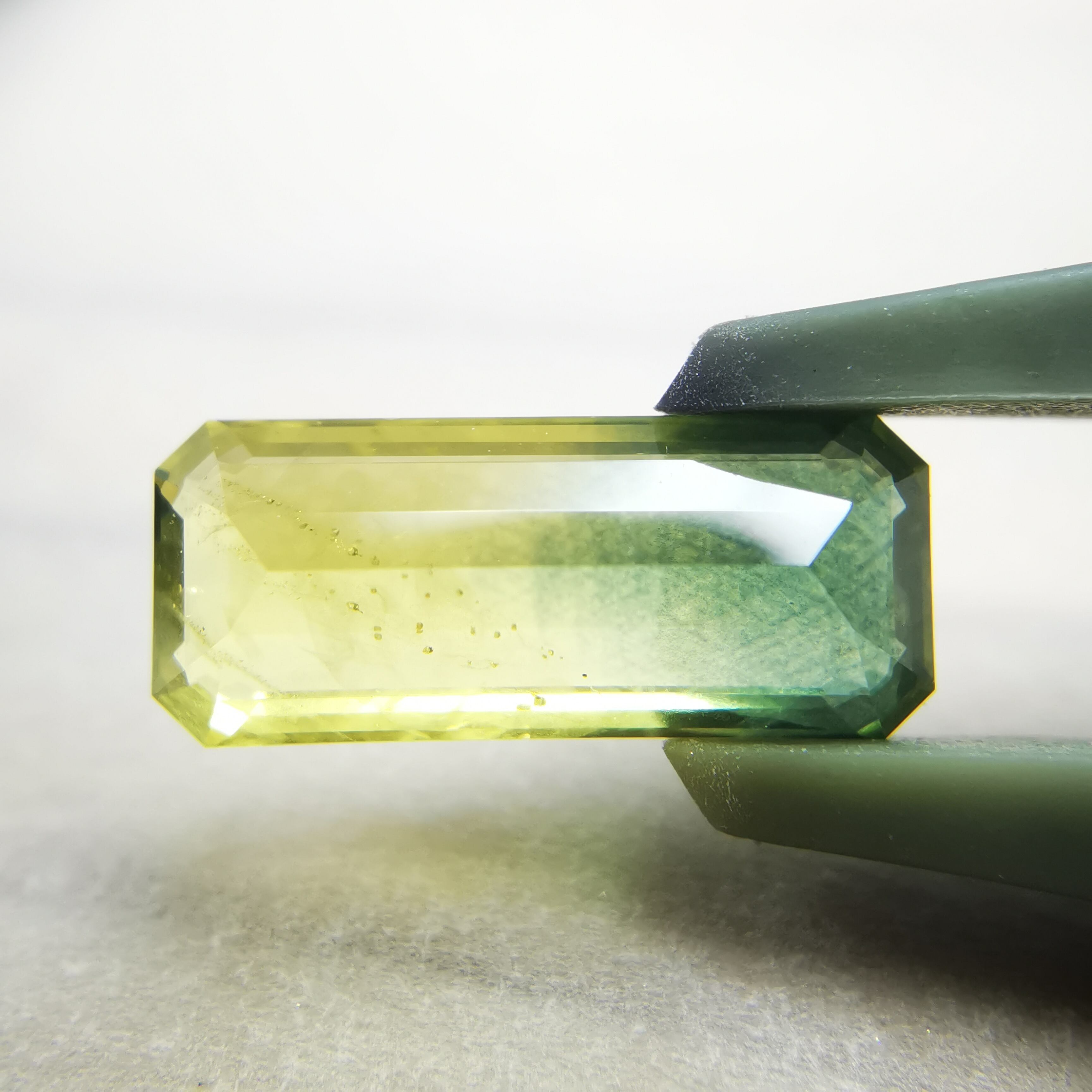 わずかに緑みの鮮やかな黄色/黄蘗色と、深い緑色/萌葱色のバイカラーサファイアです。