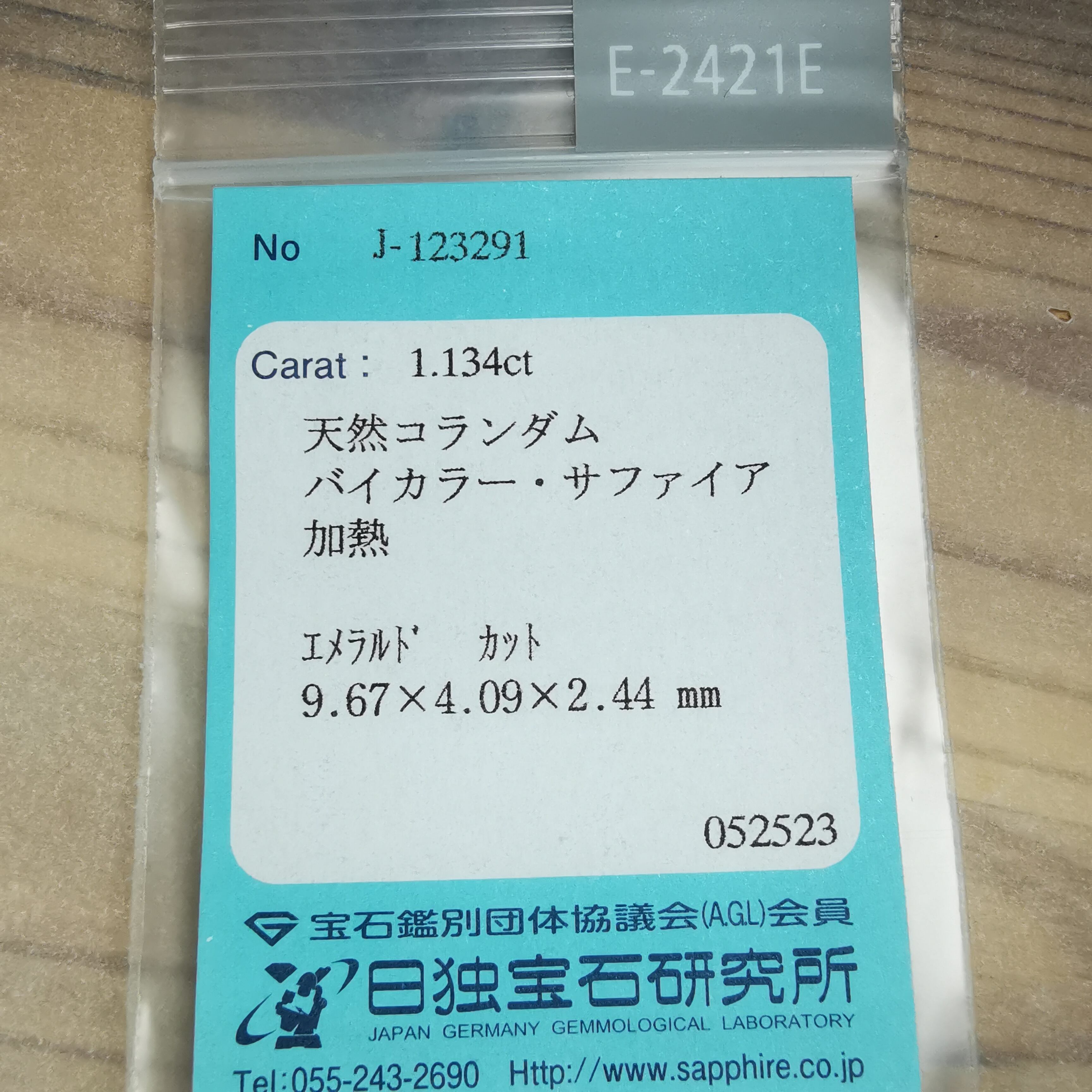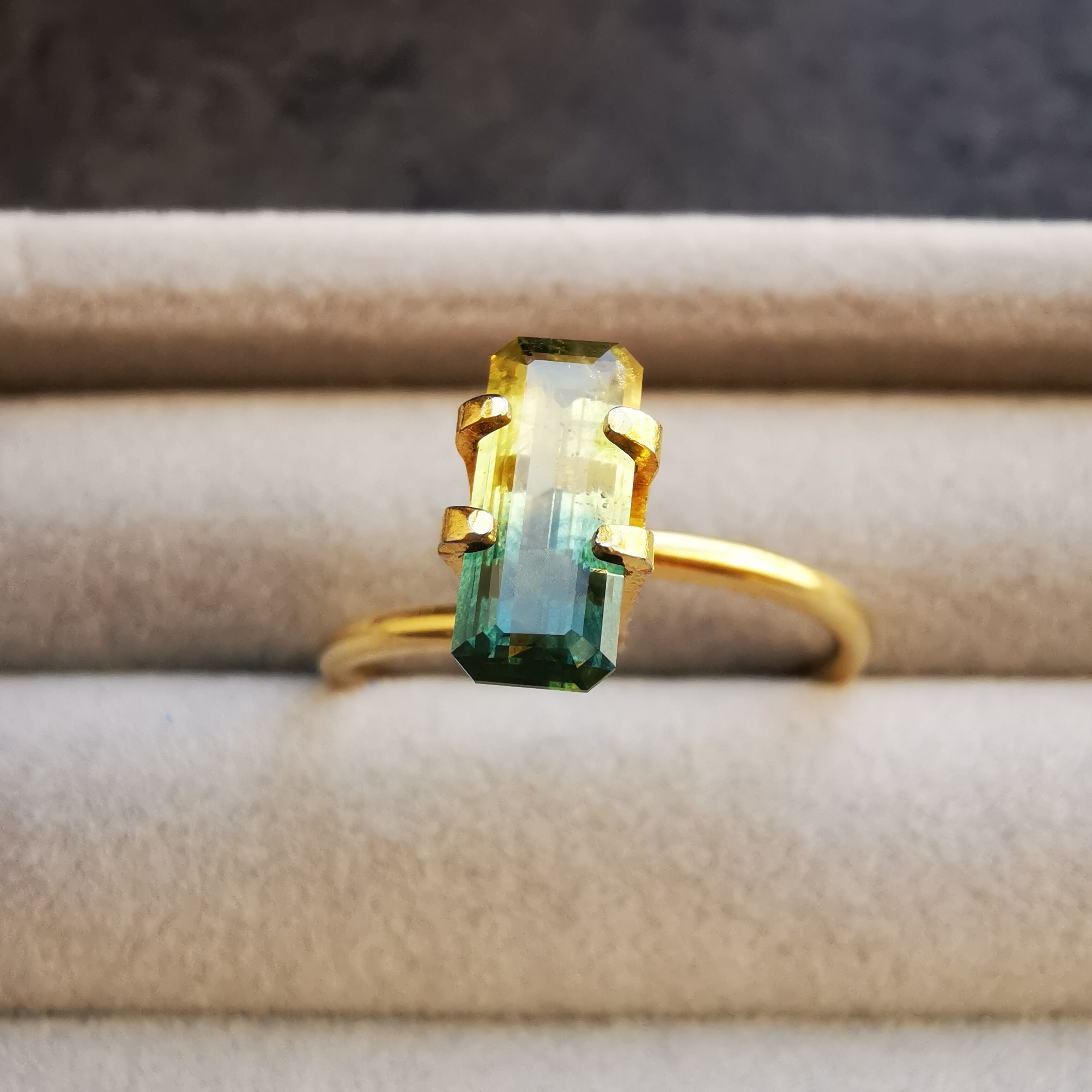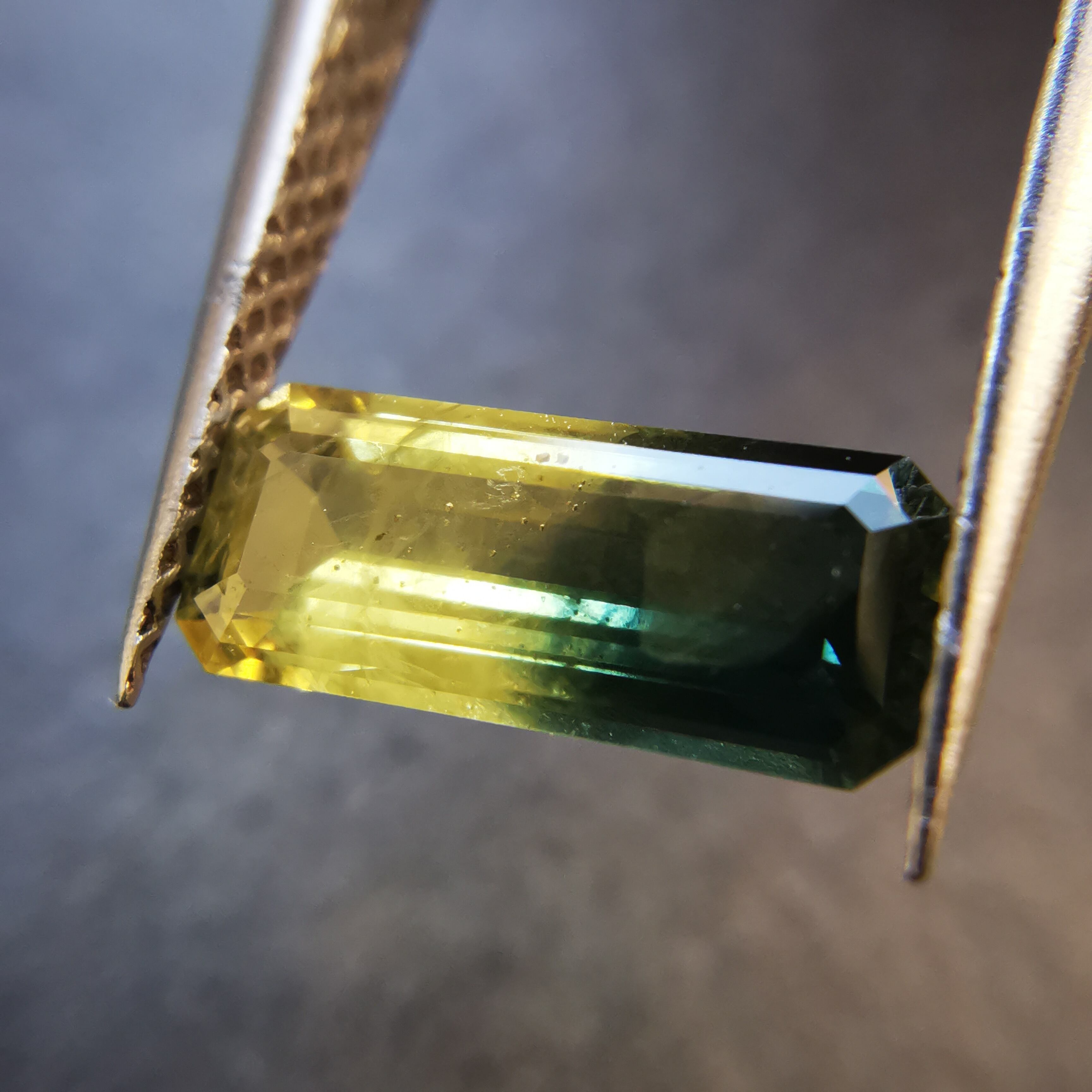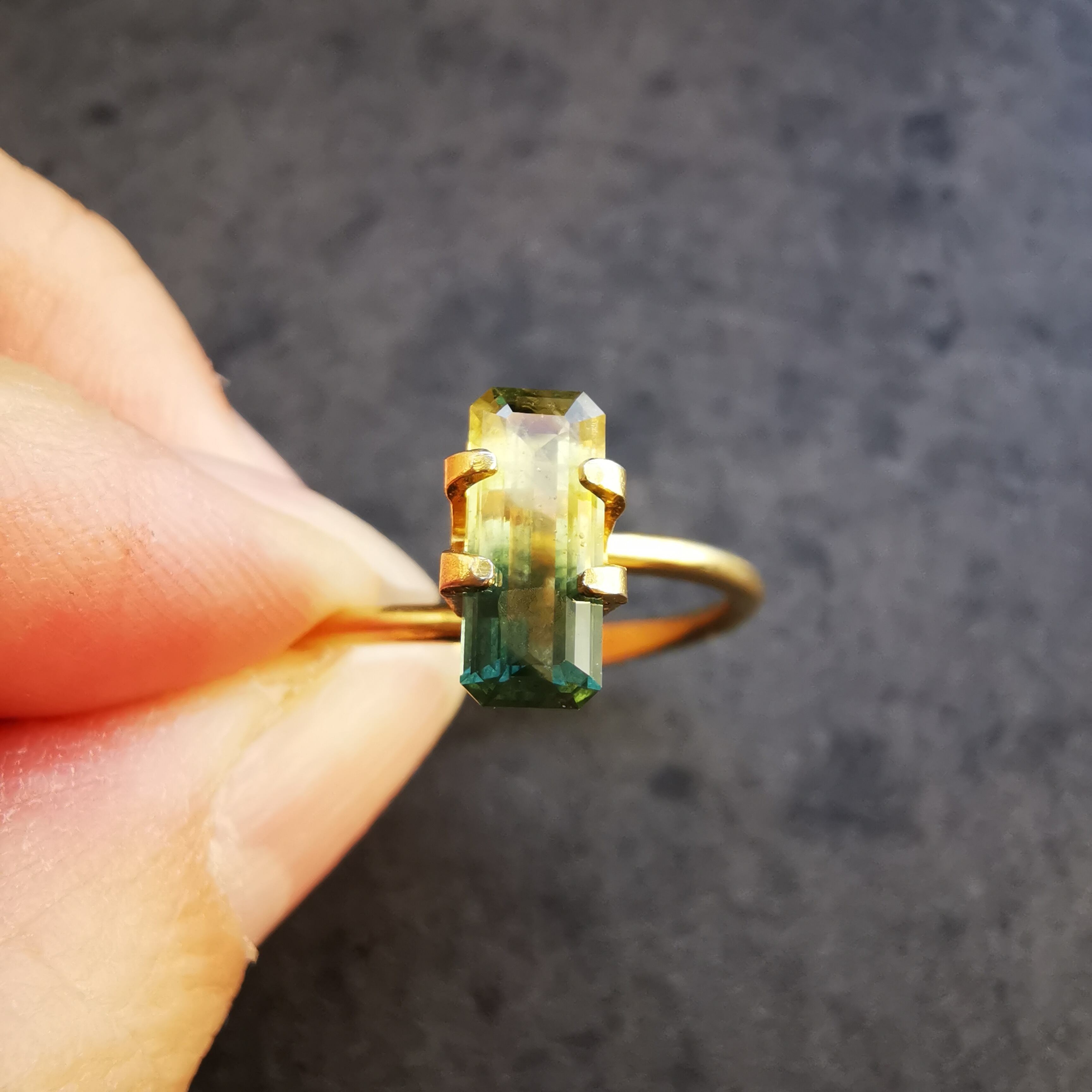 わずかに緑みの鮮やかな黄色/黄蘗色と、深い緑色/萌葱色のバイカラーサファイアです。