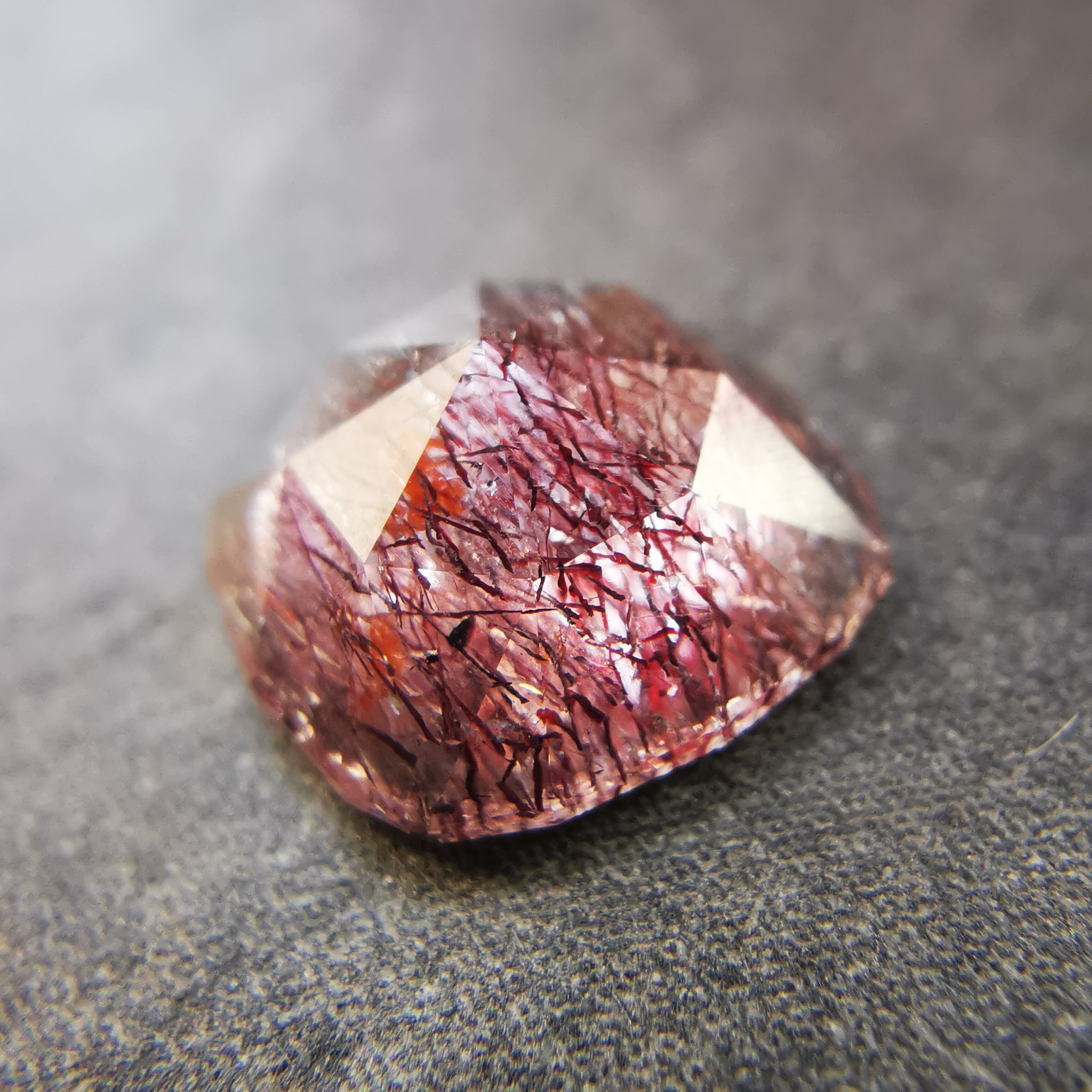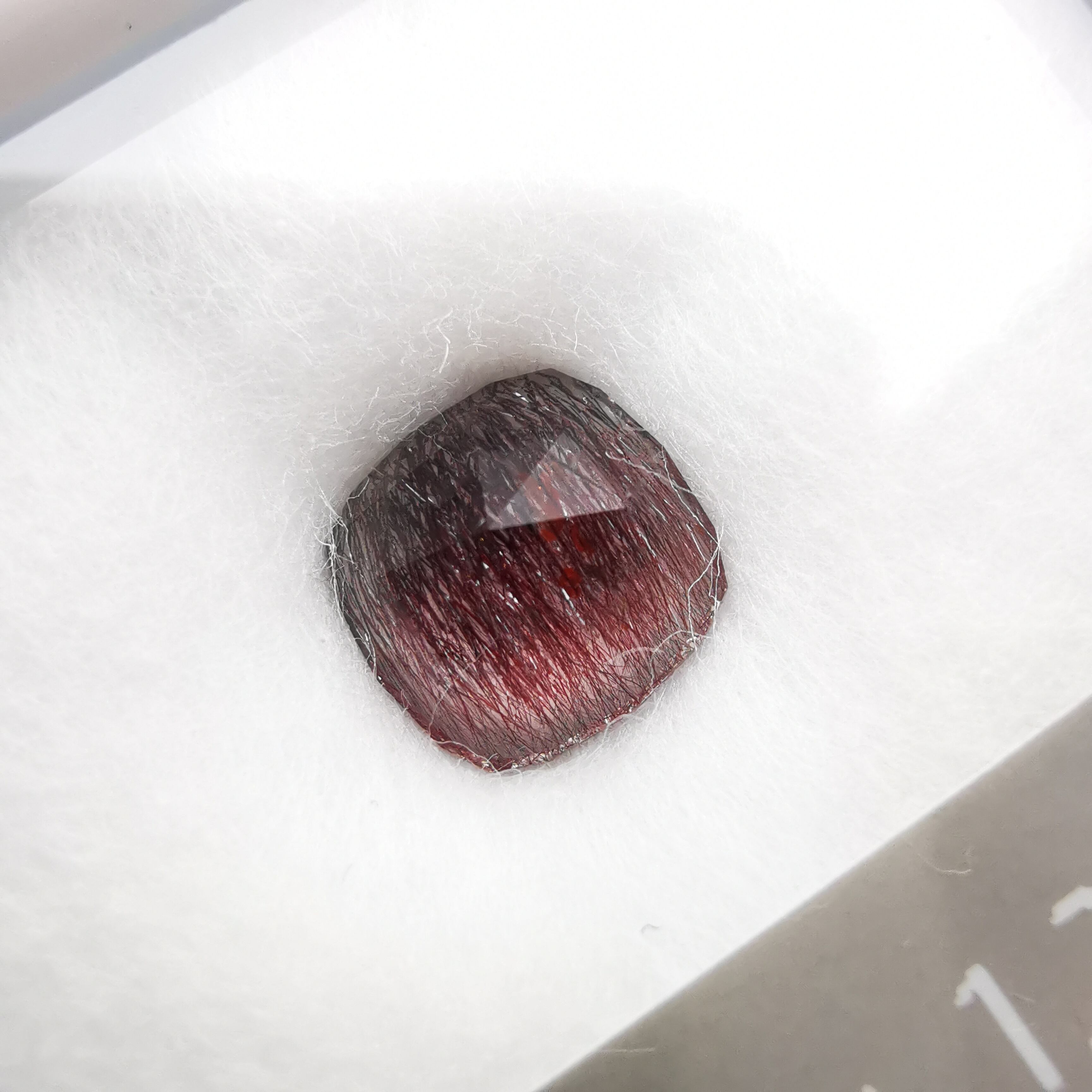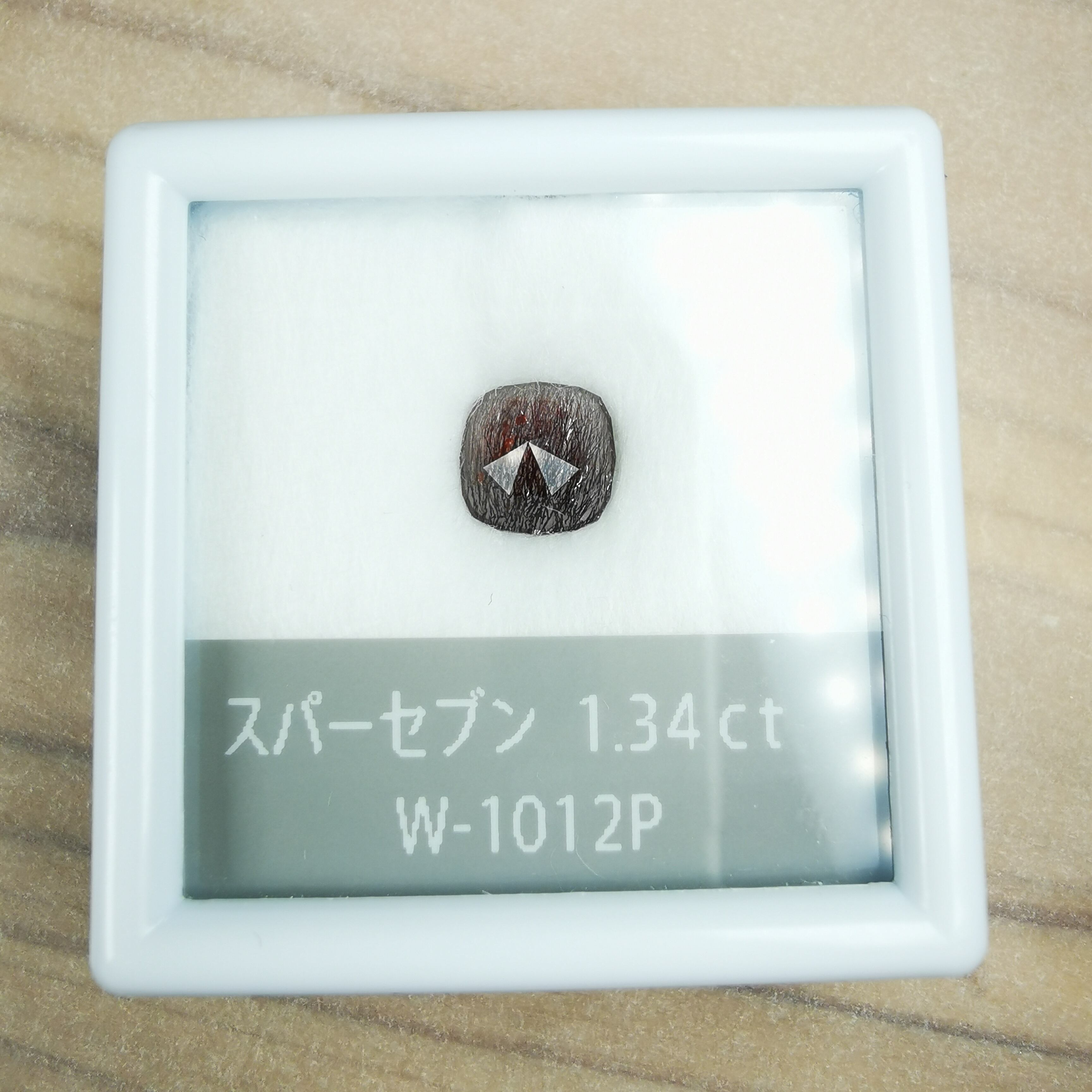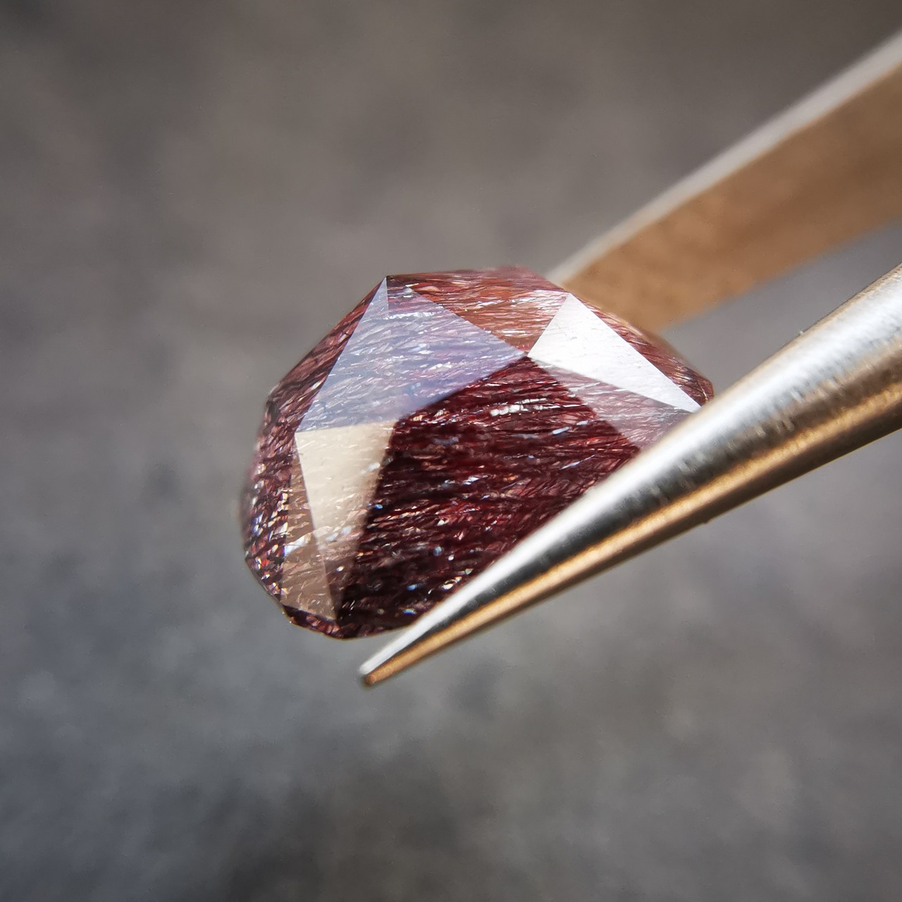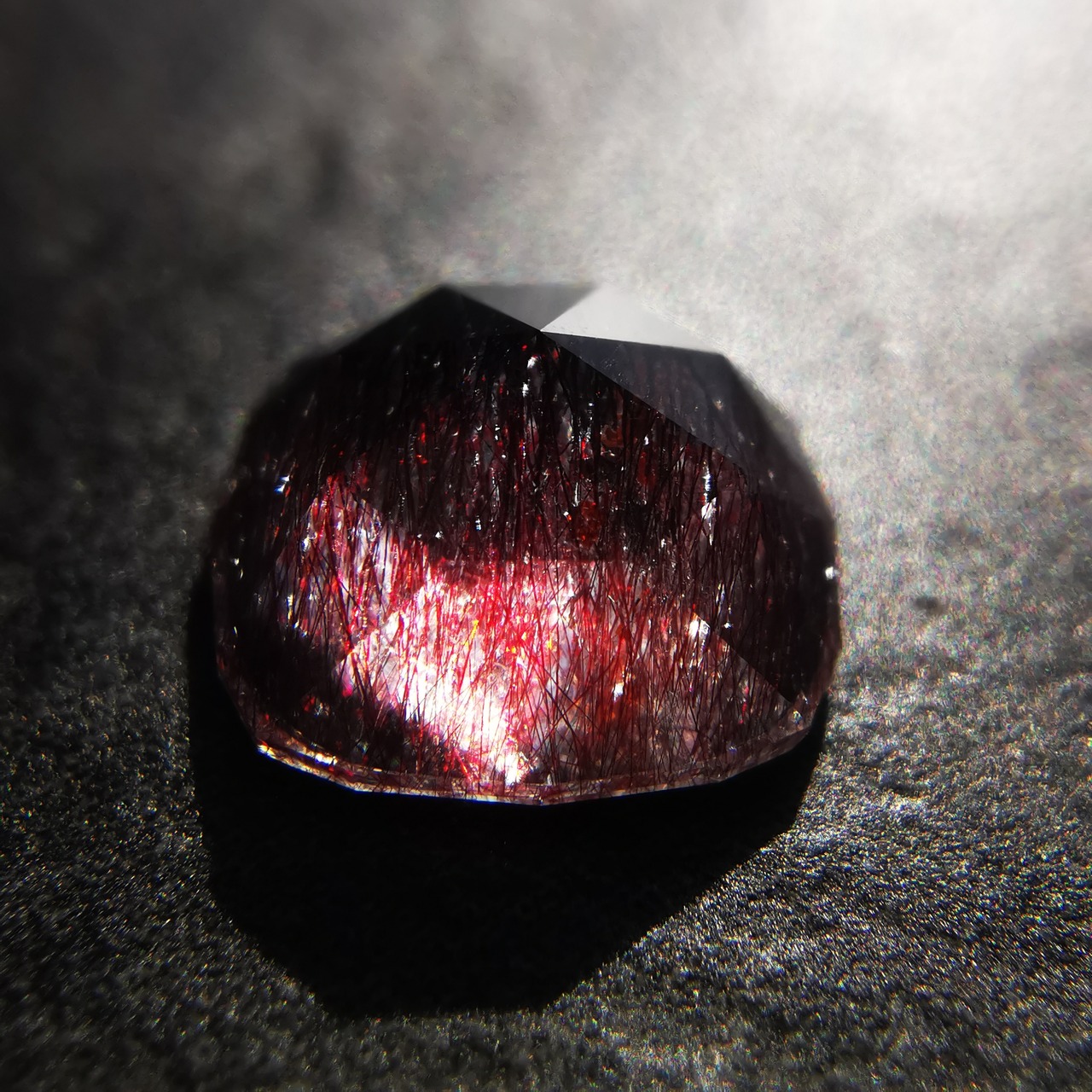 多くのインクルージョンにより、全体に黒っぽく見えますが、その中から赤やシルバーがチラチラと光る様子は、とてもクールです。
