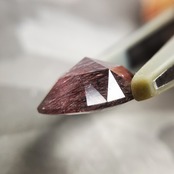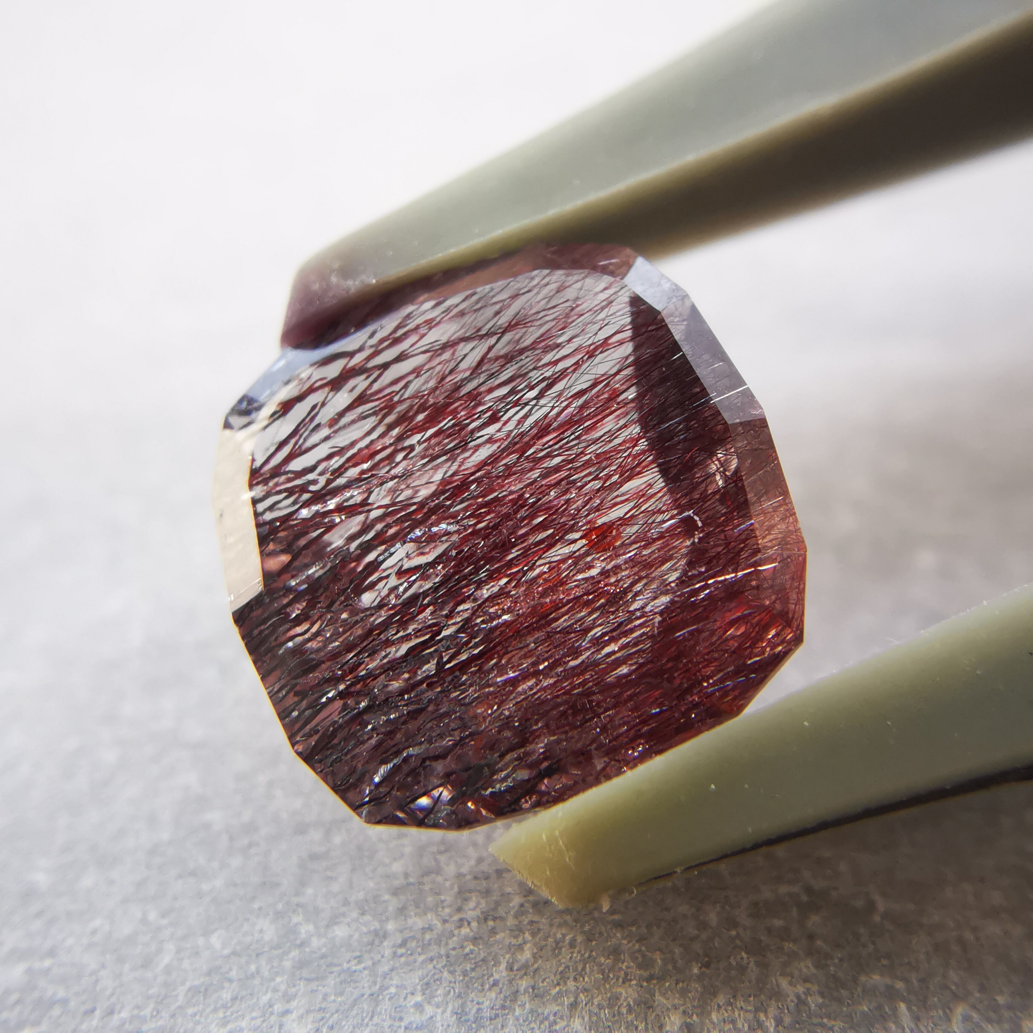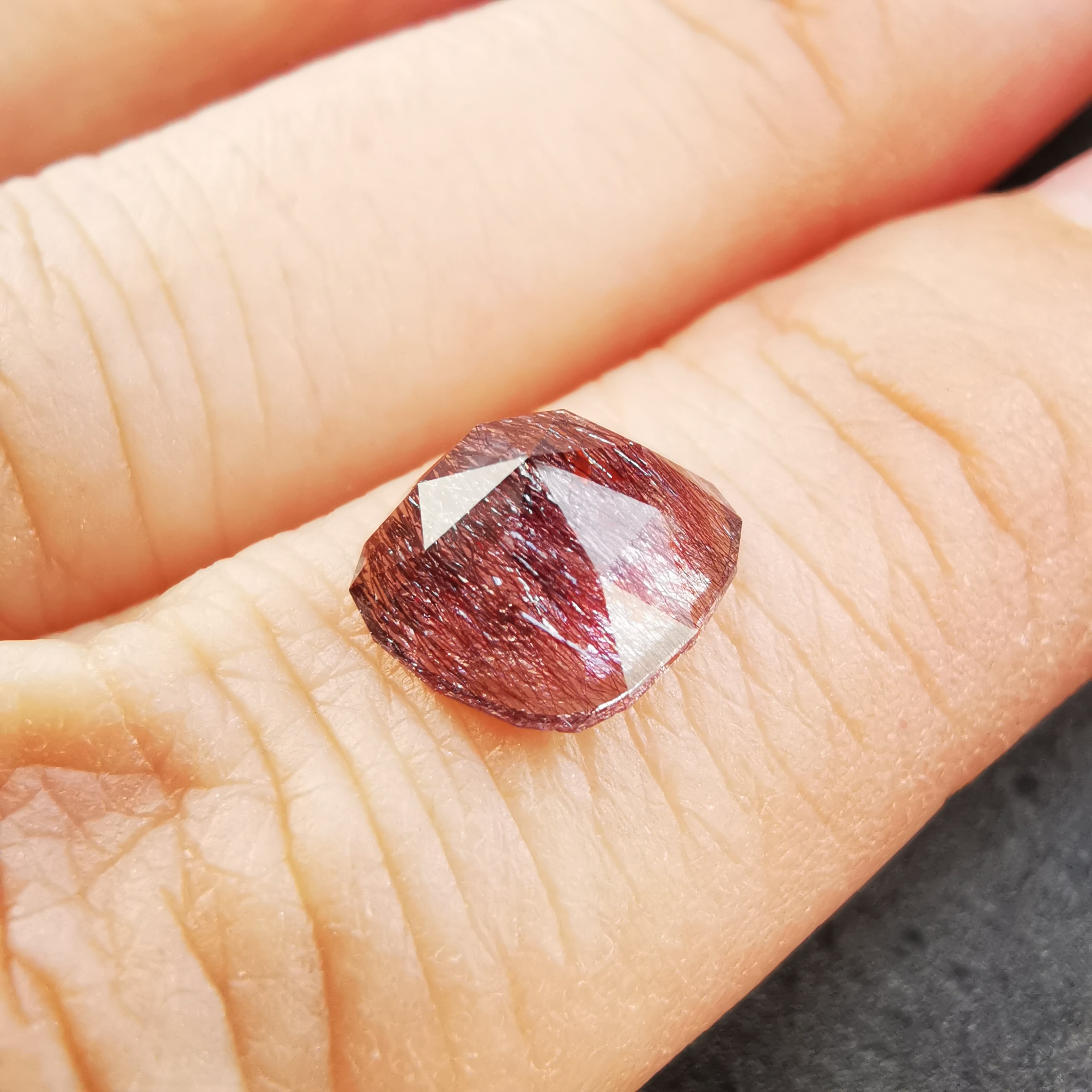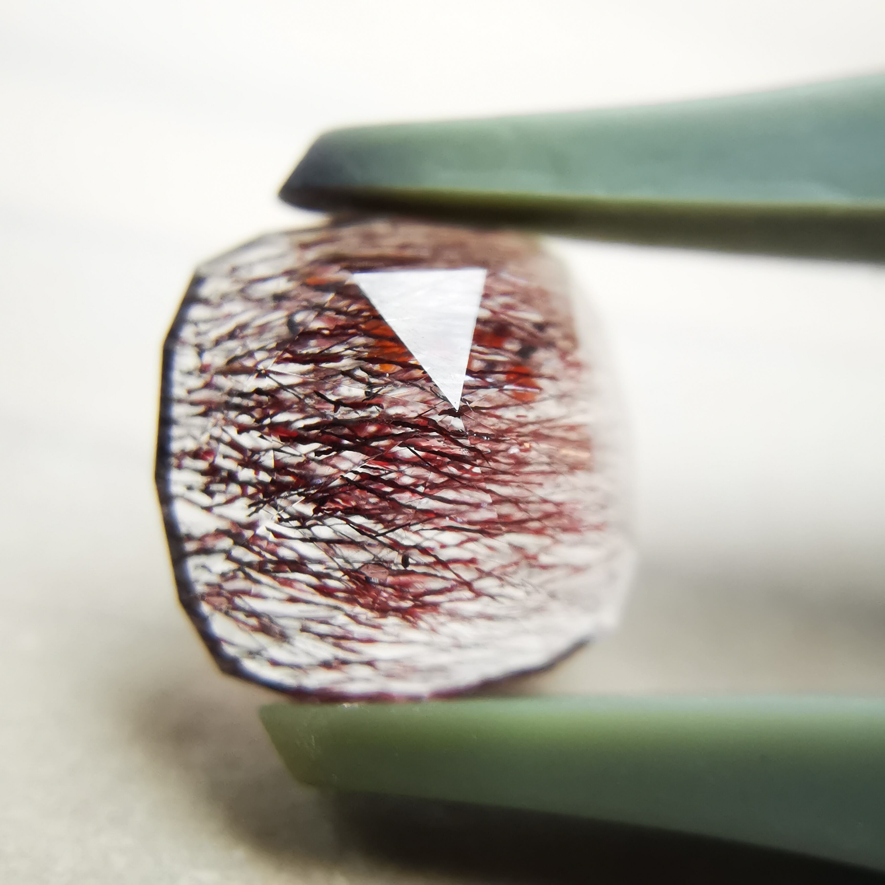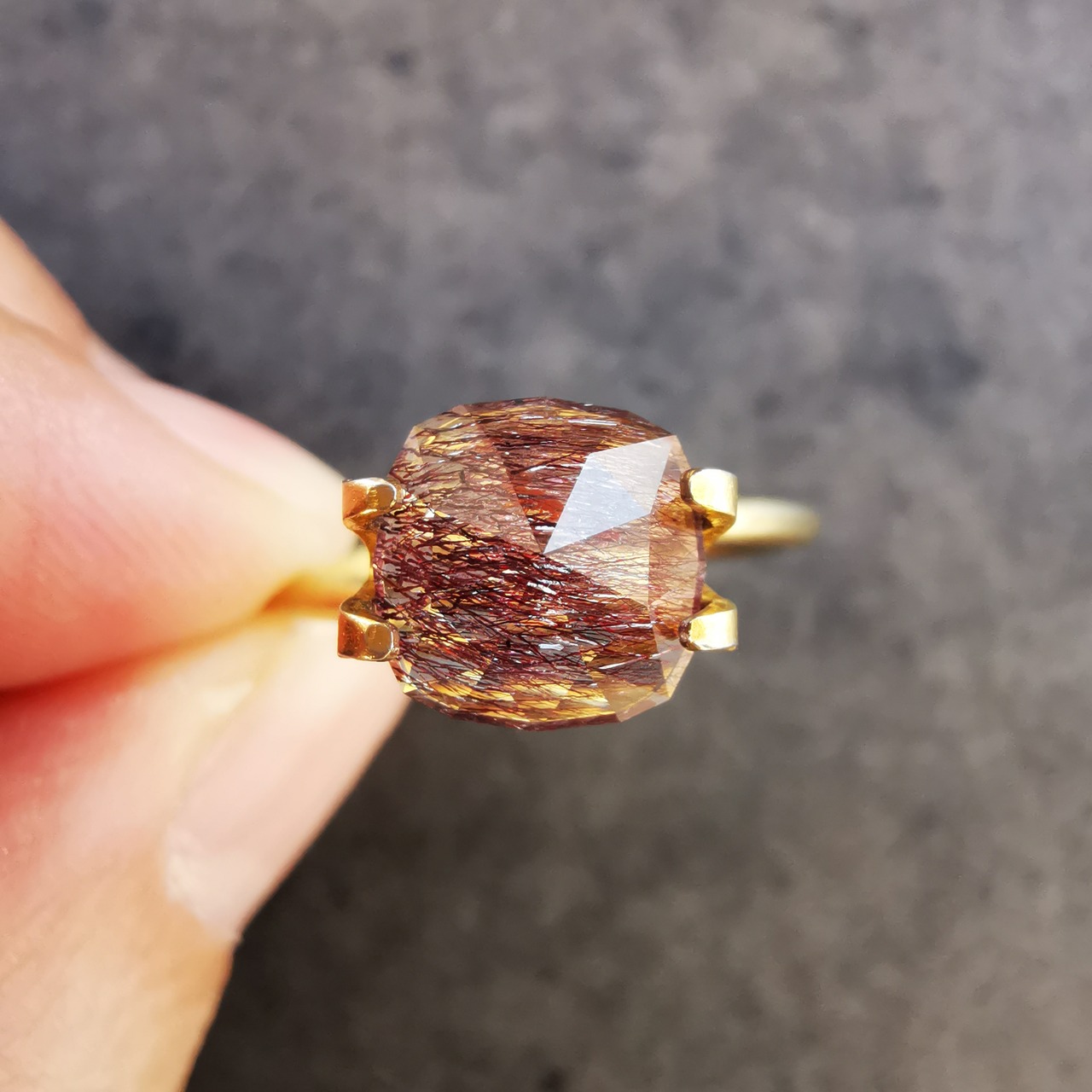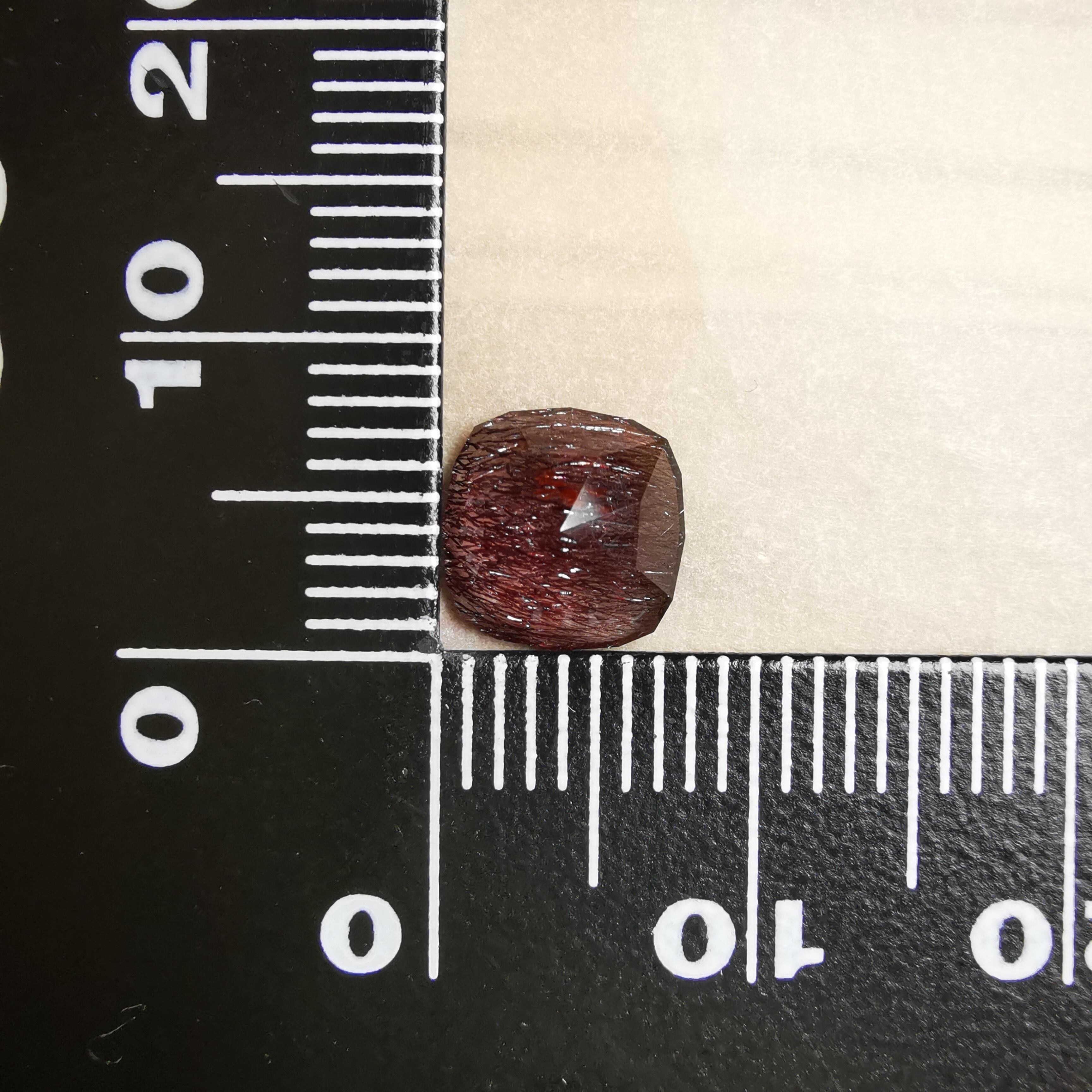 多くのインクルージョンにより、全体に黒っぽく見えますが、その中から赤やシルバーがチラチラと光る様子は、とてもクールです。