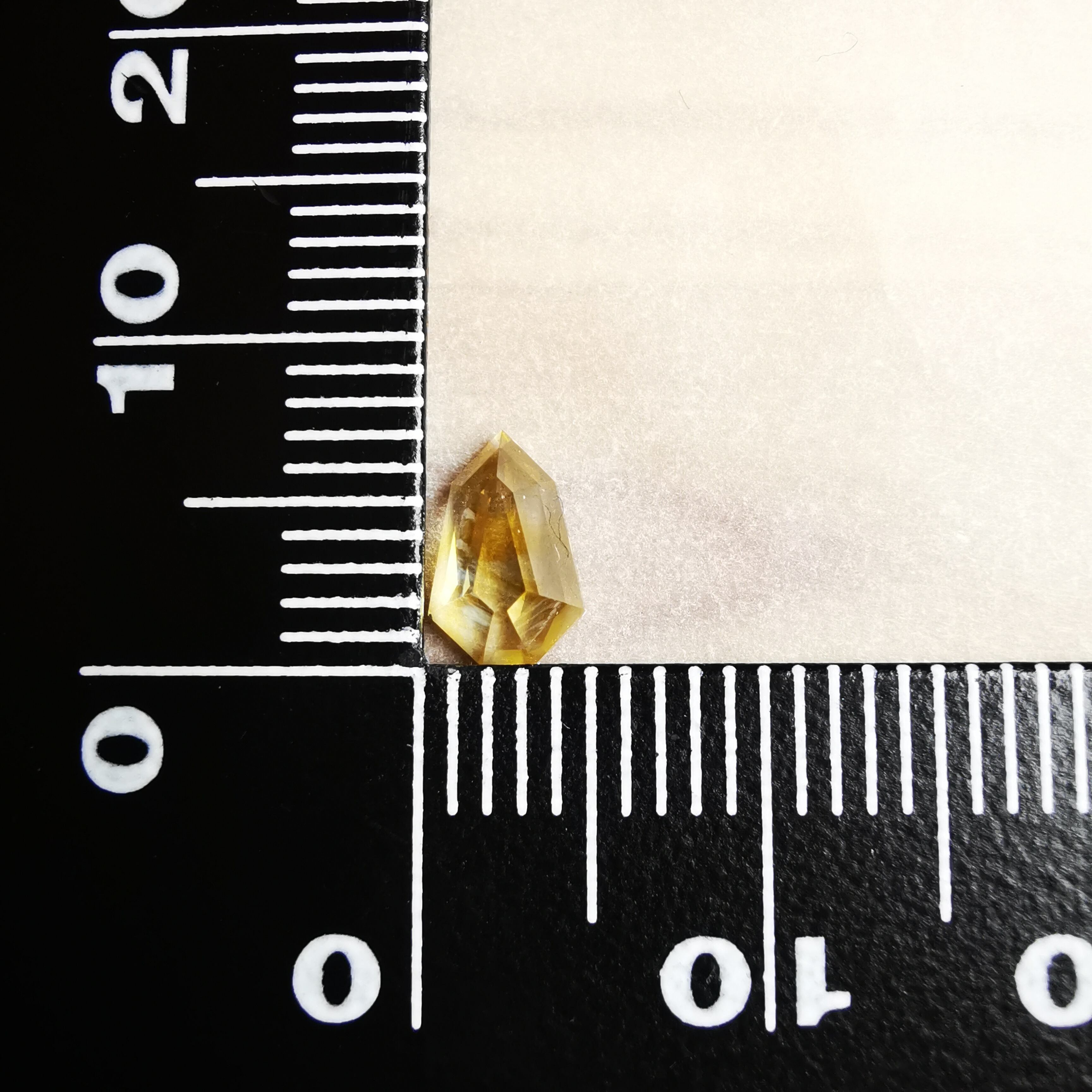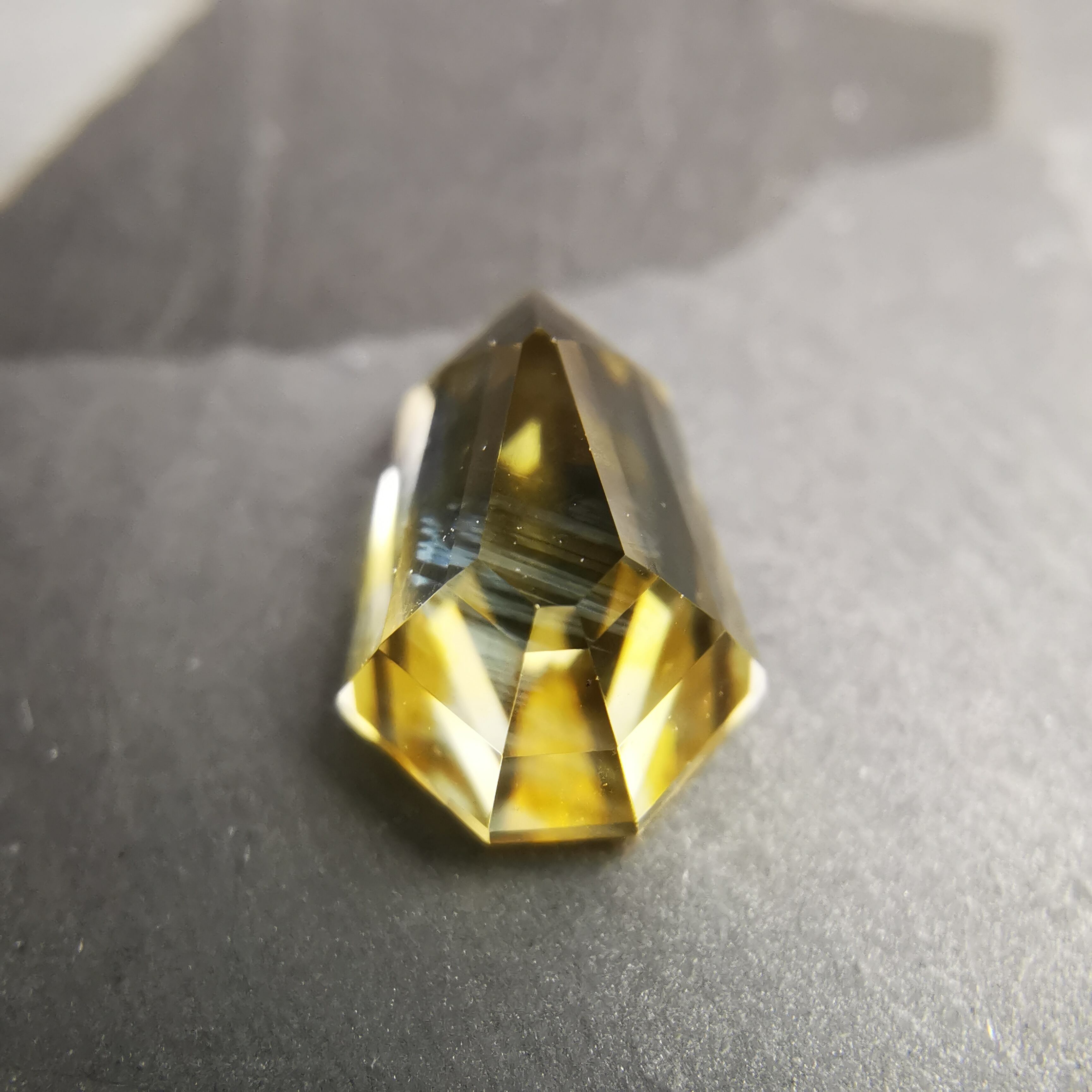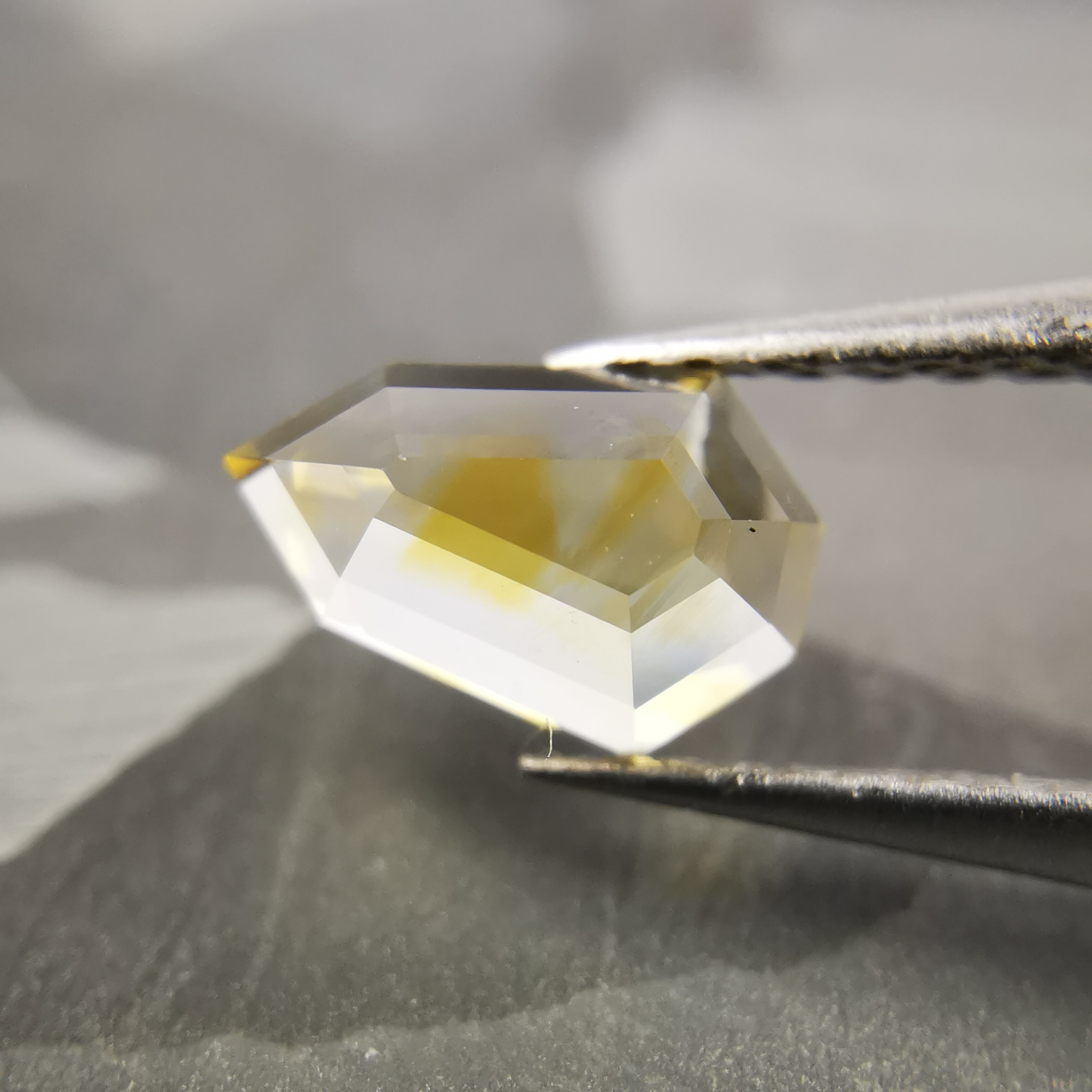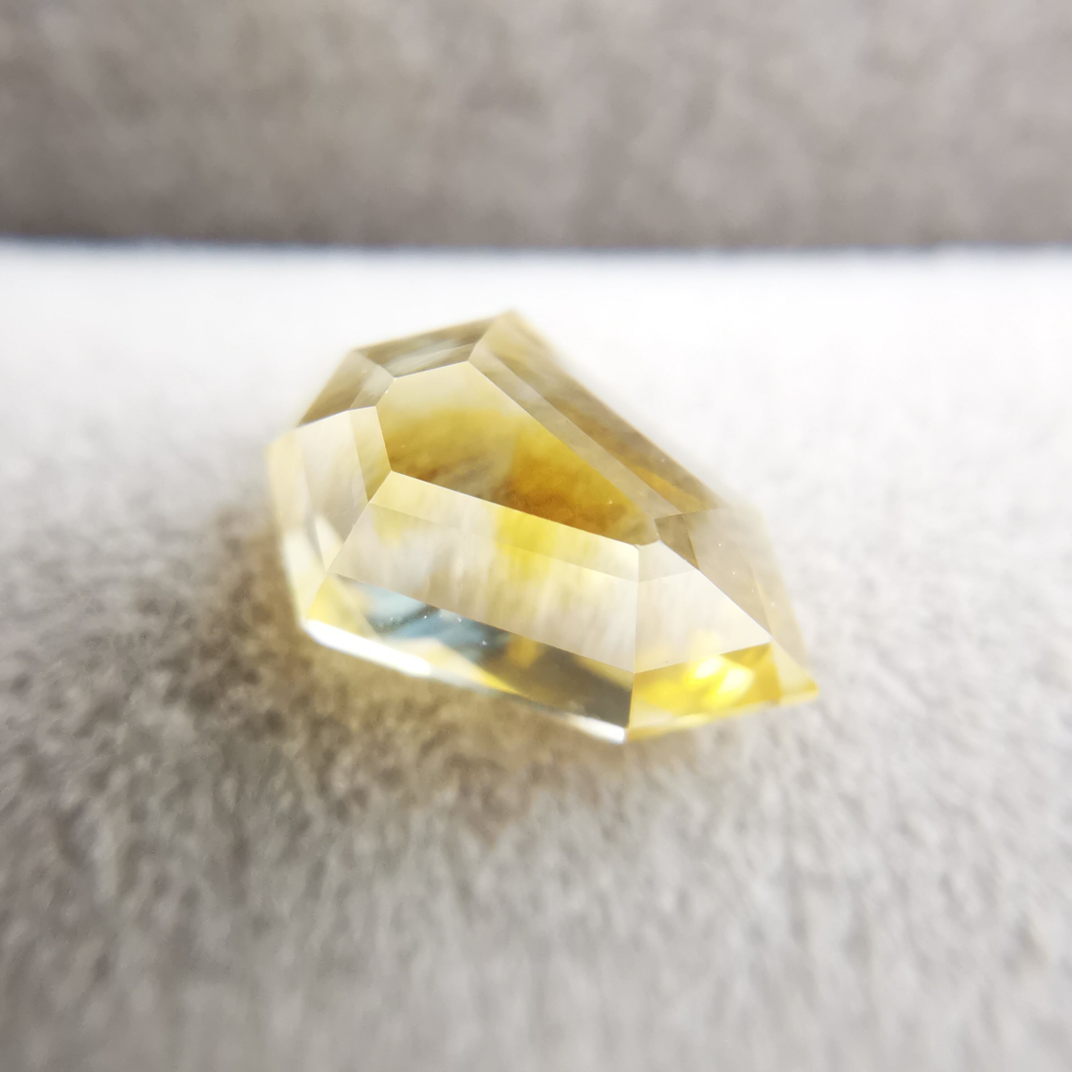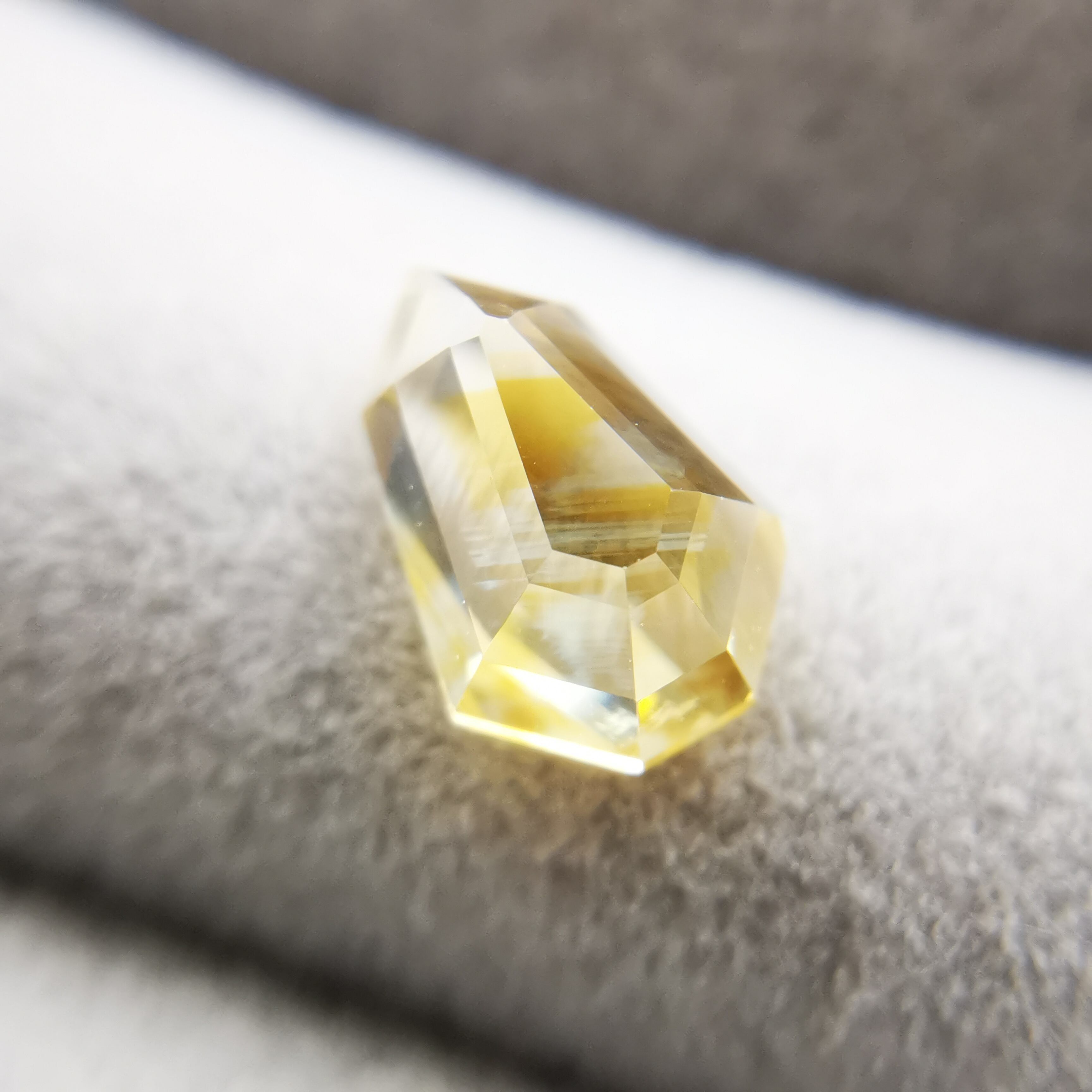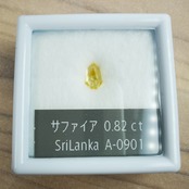 クリアなサファイアに鮮やかなイエローの色むらと、わずかにシルキーなインクルージョンが斜めに入った一石です。