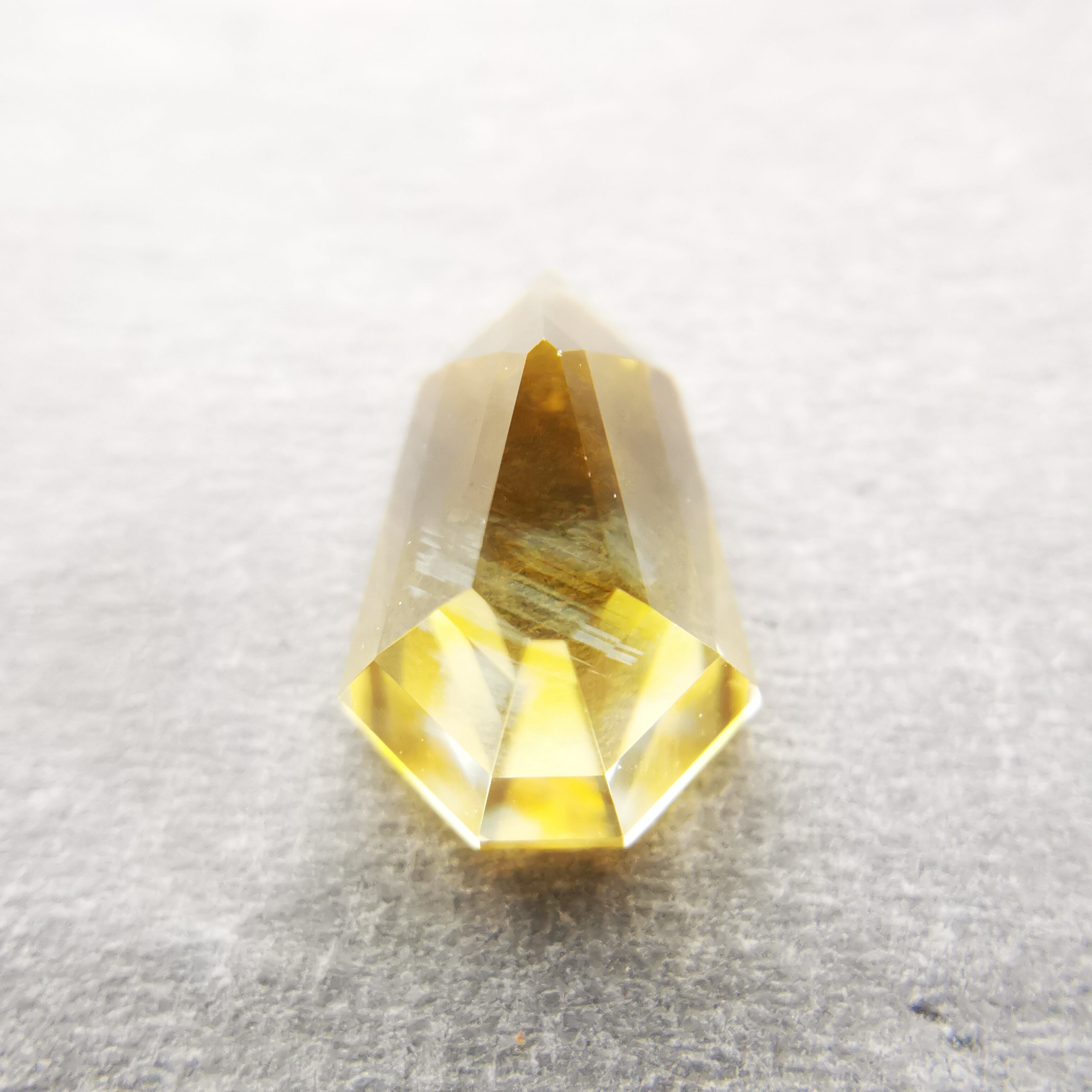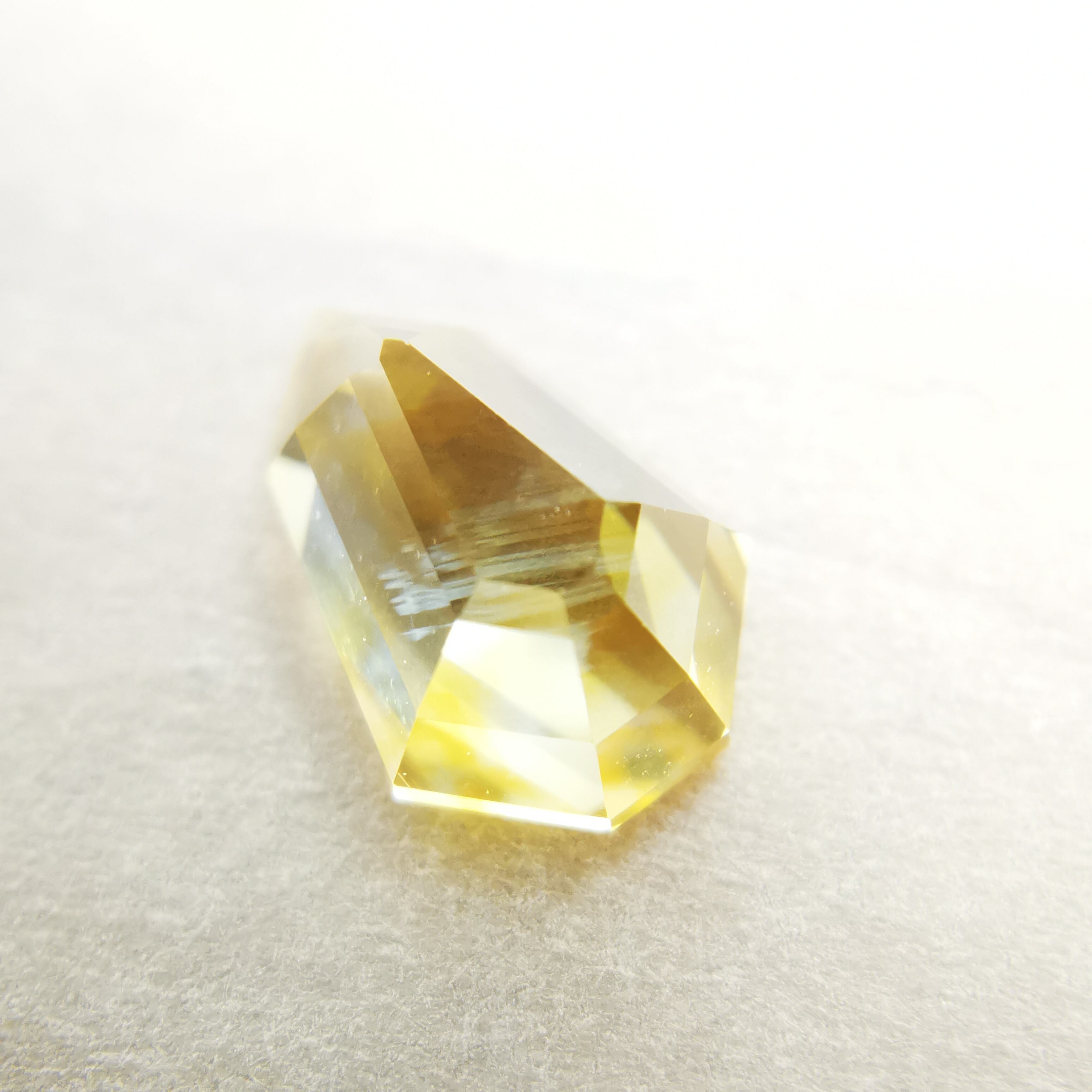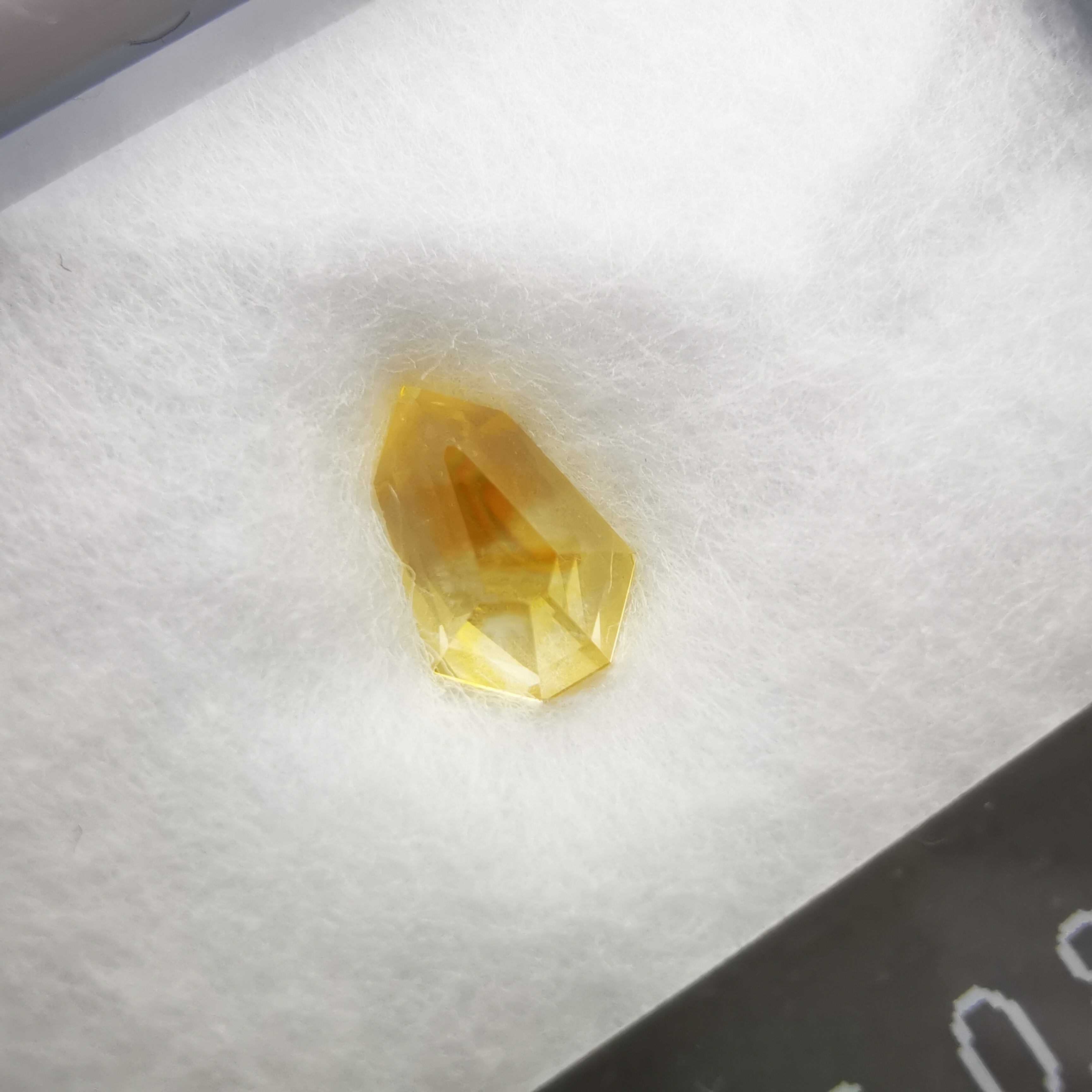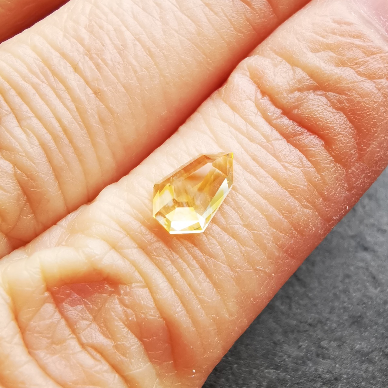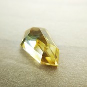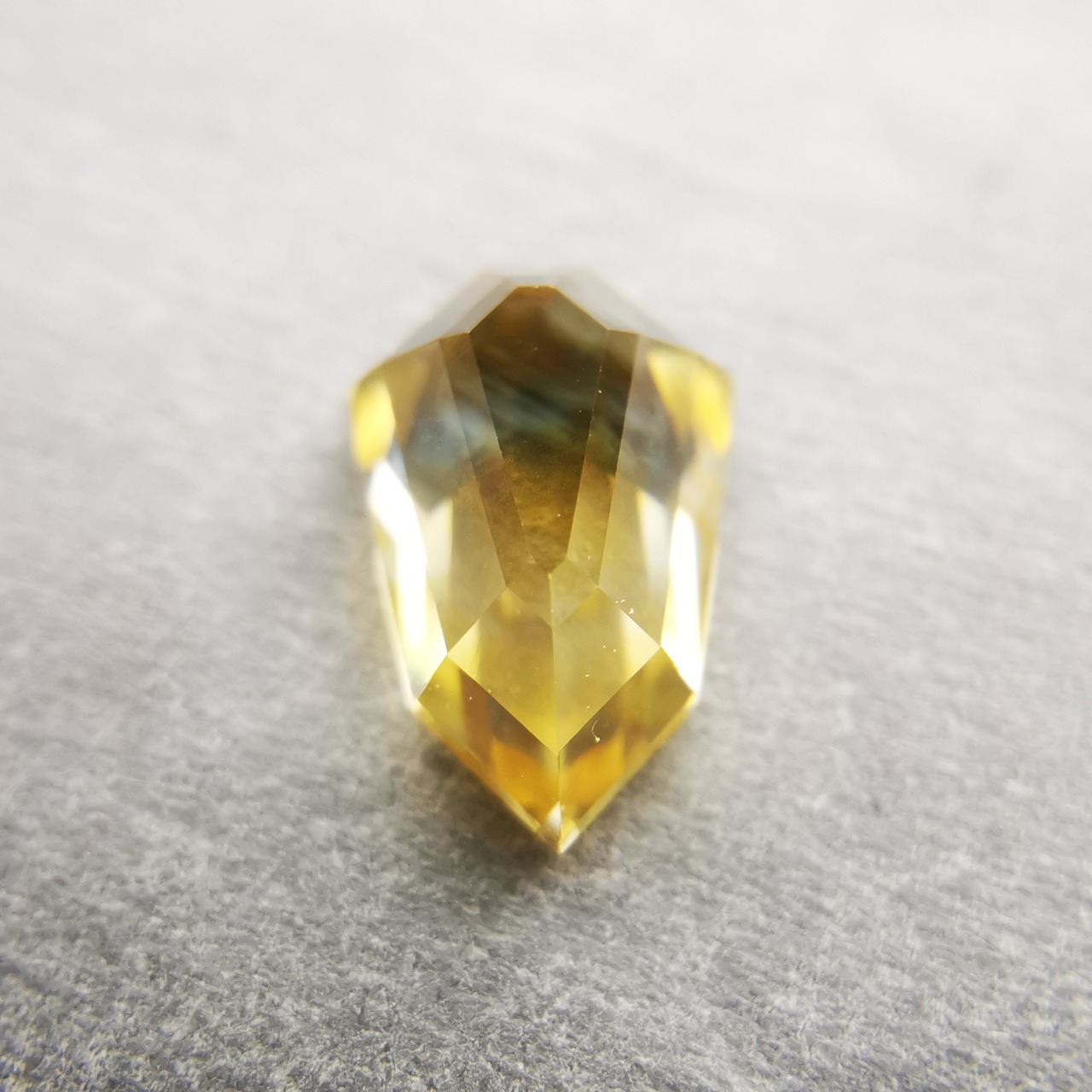 クリアなサファイアに鮮やかなイエローの色むらと、わずかにシルキーなインクルージョンが斜めに入った一石です。