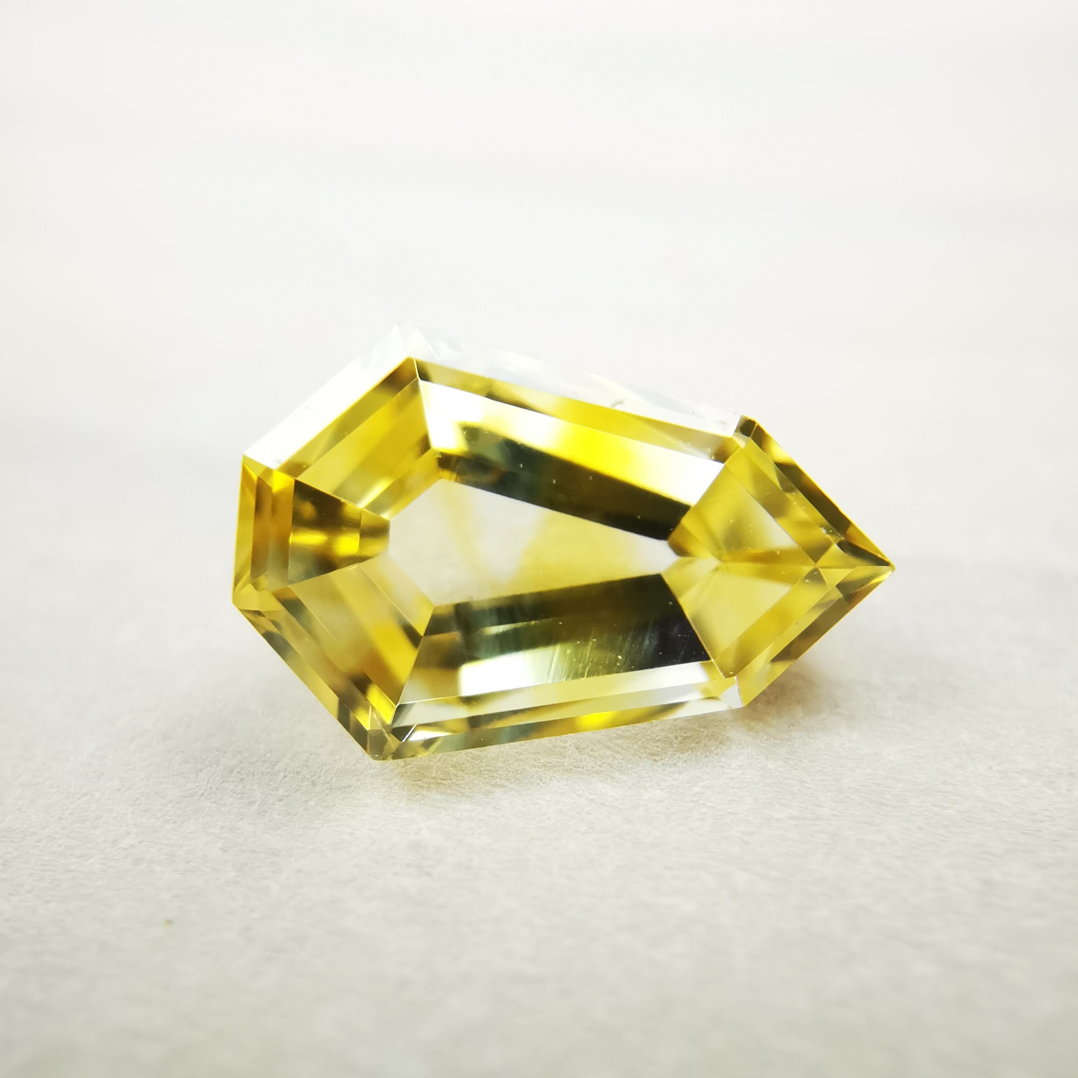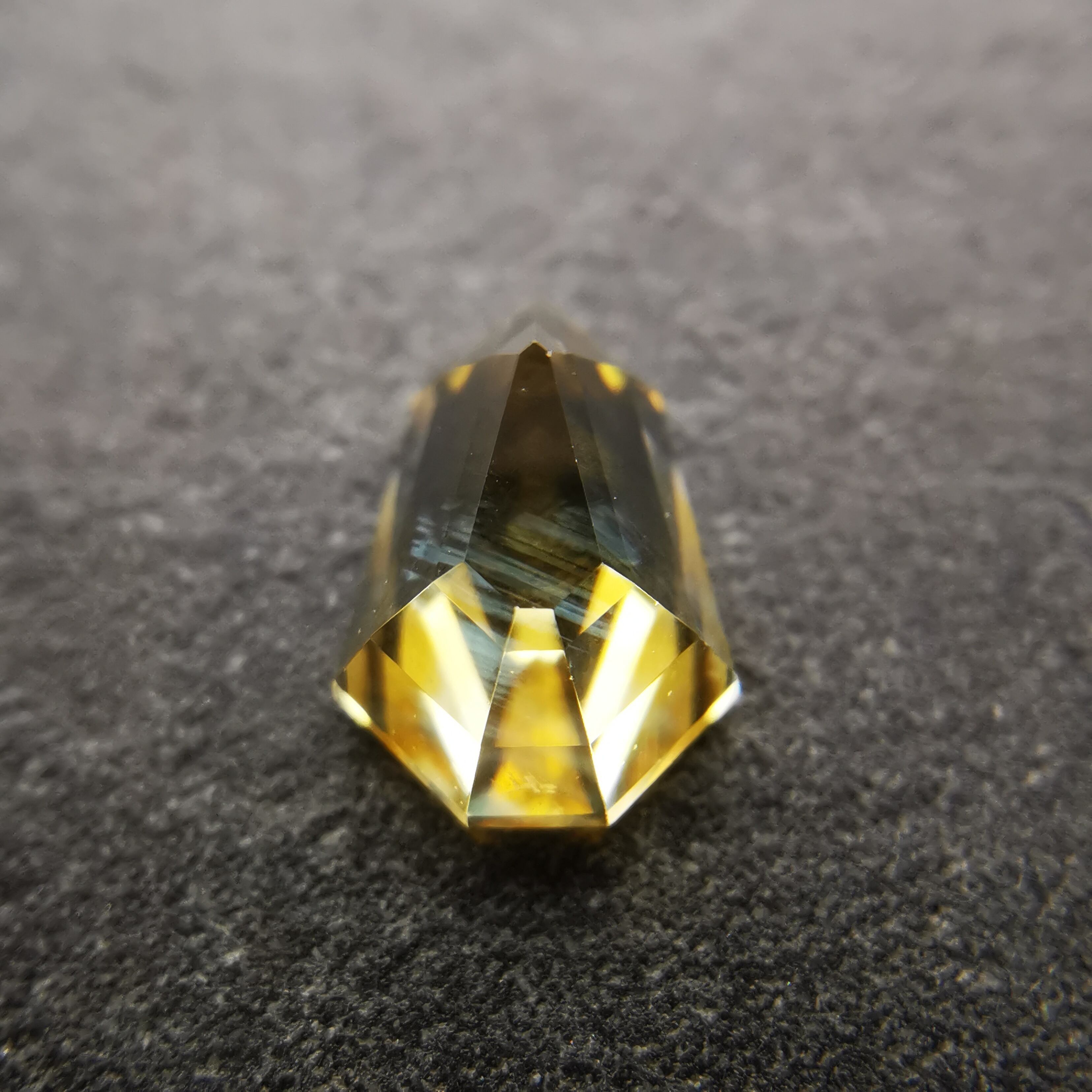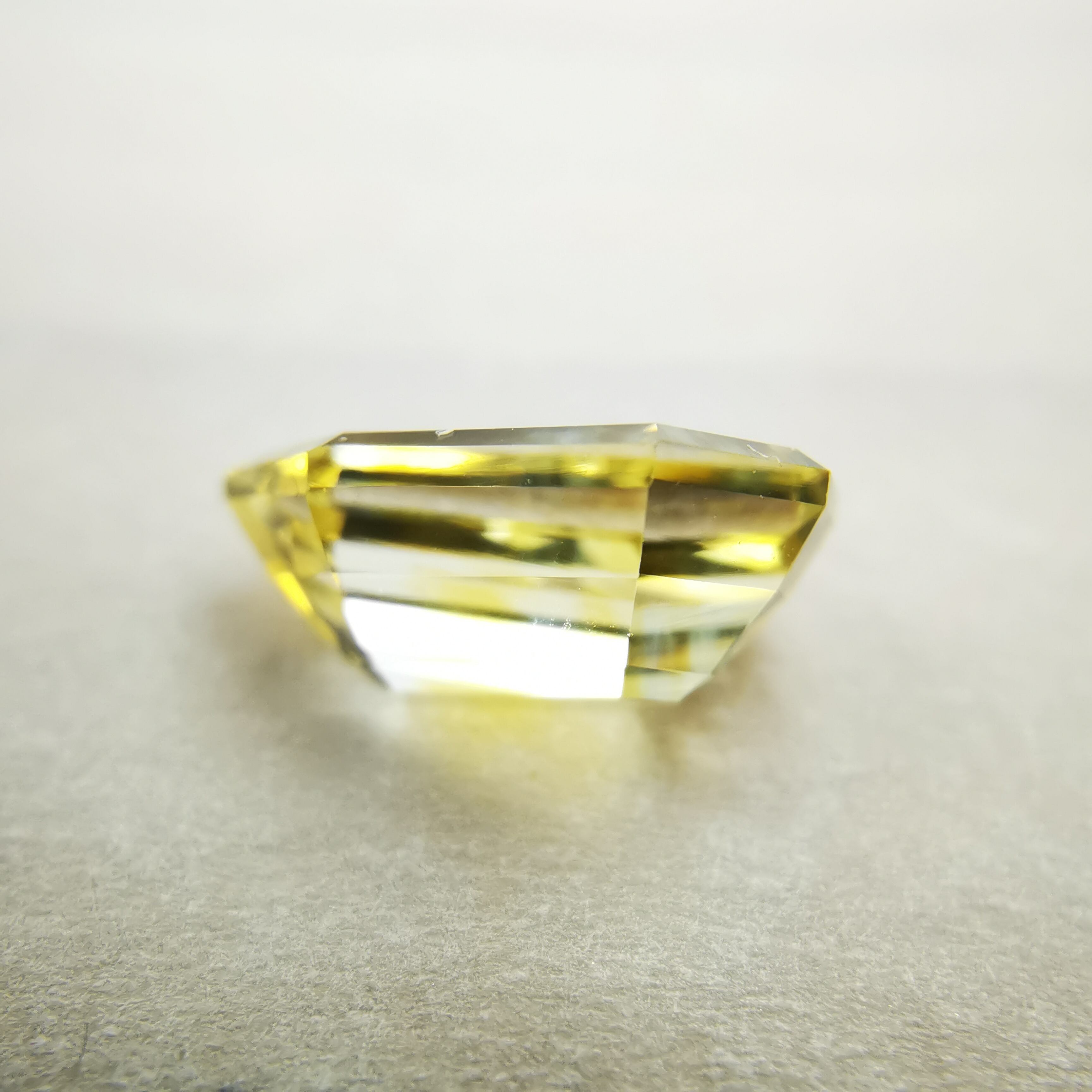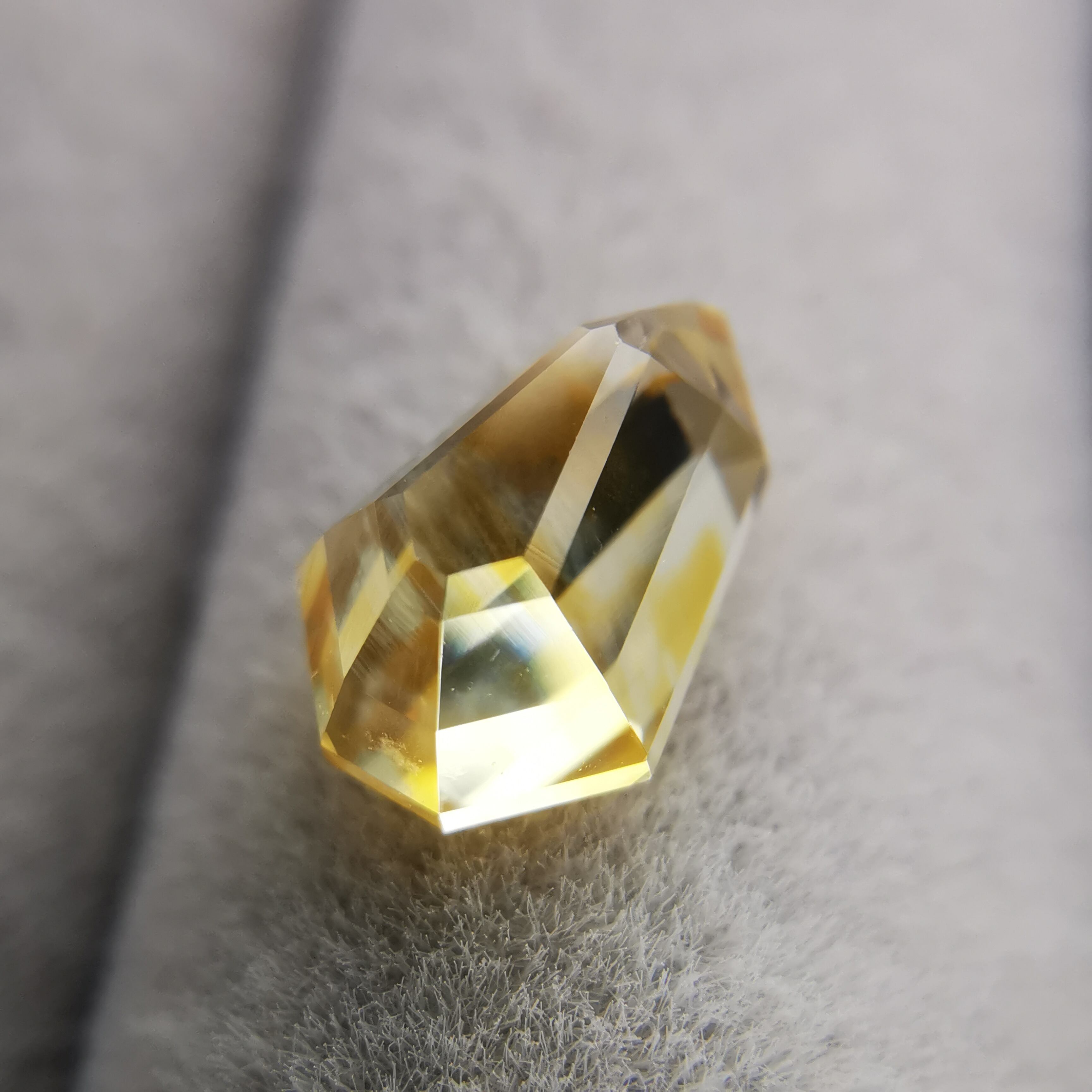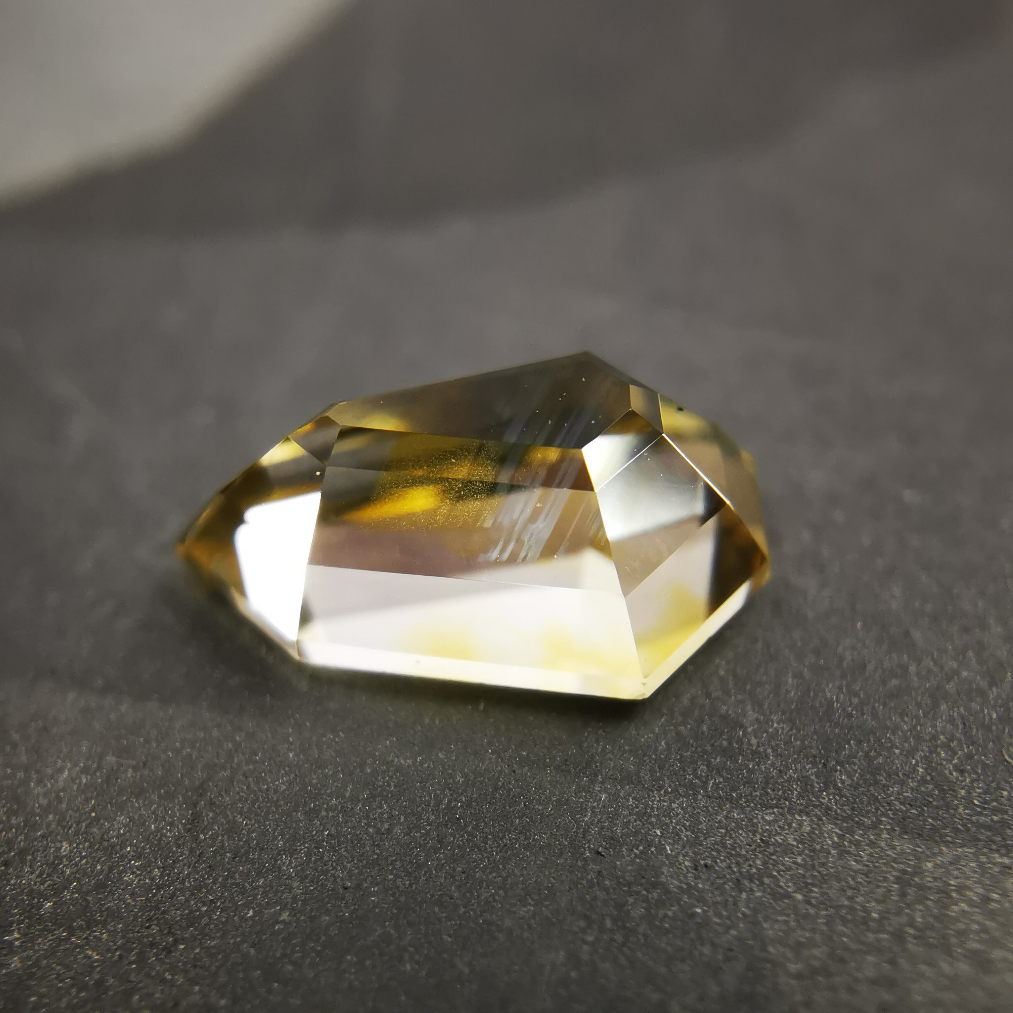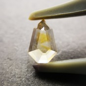 クリアなサファイアに鮮やかなイエローの色むらと、わずかにシルキーなインクルージョンが斜めに入った一石です。