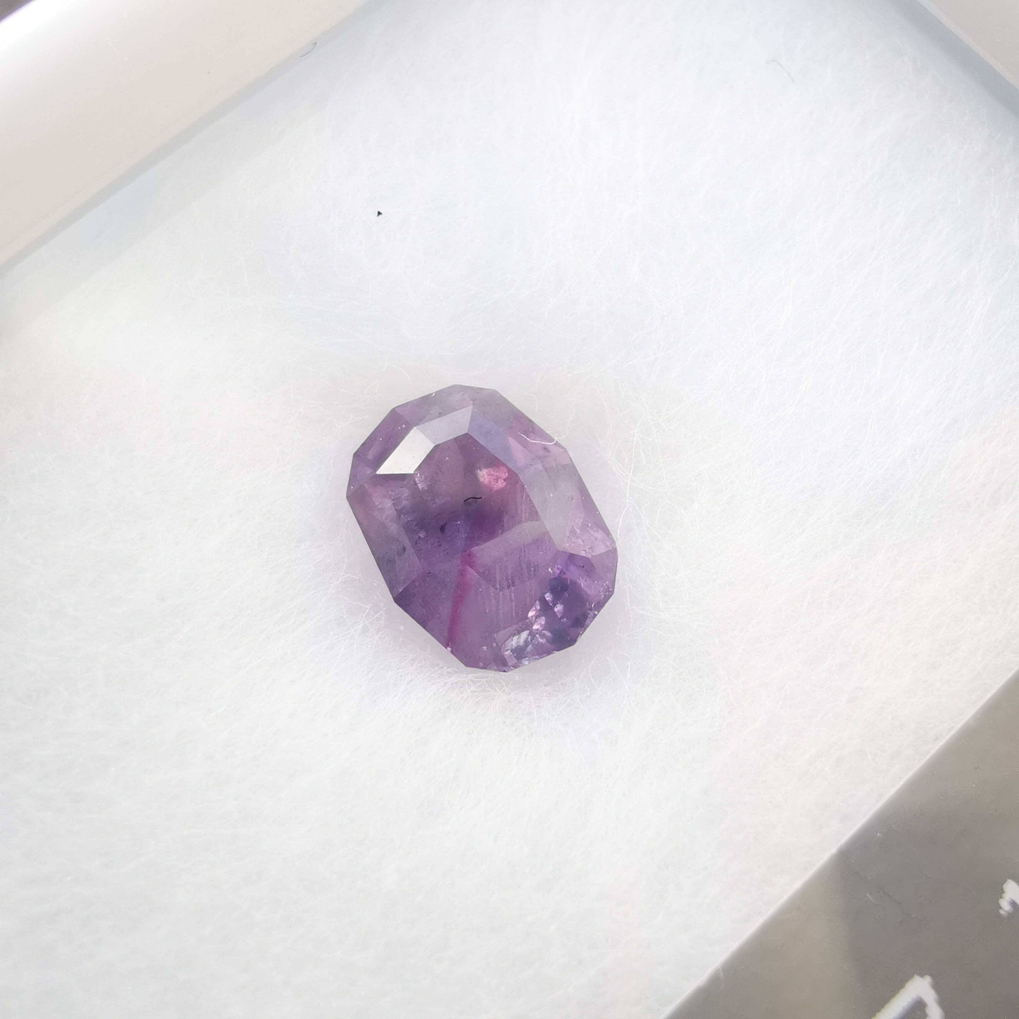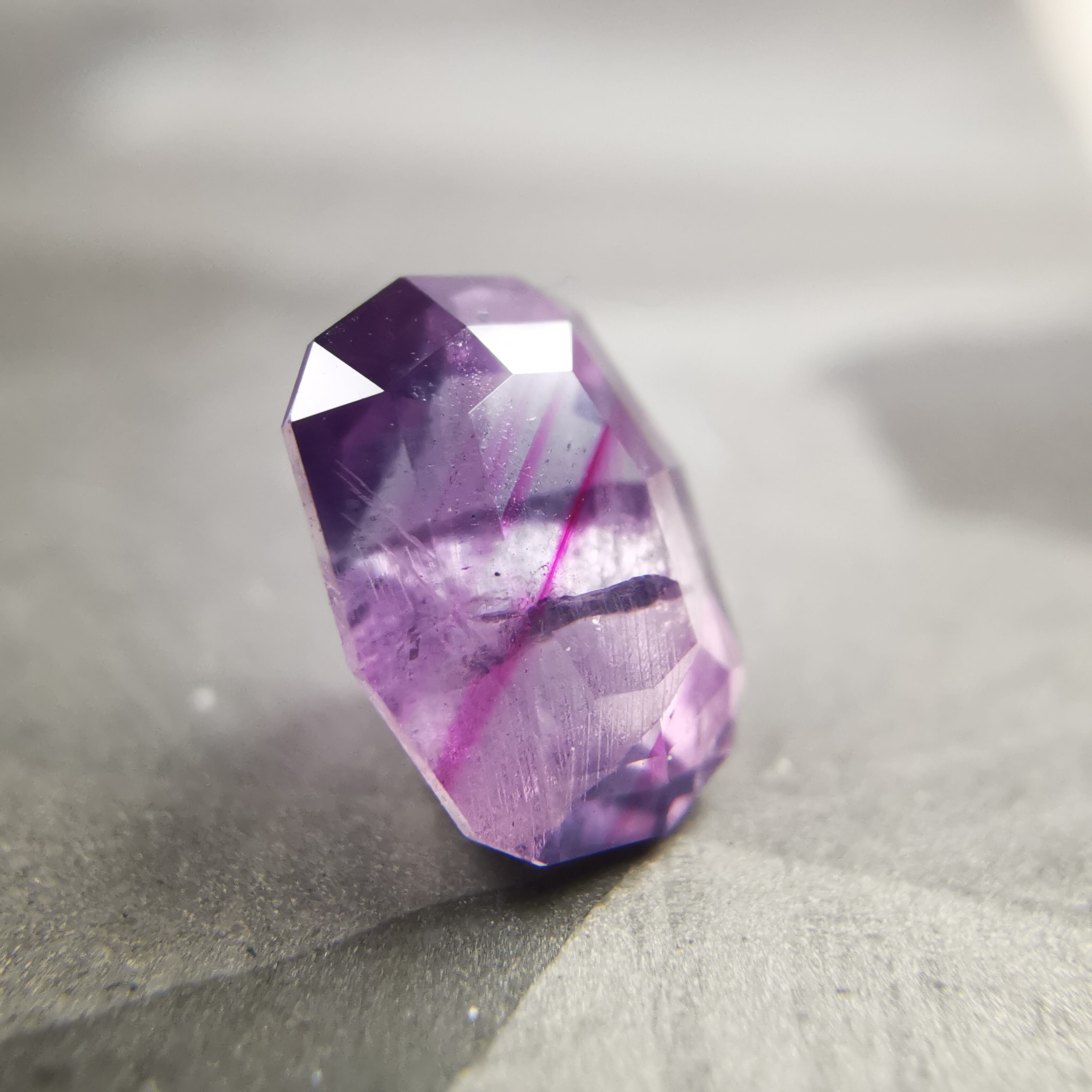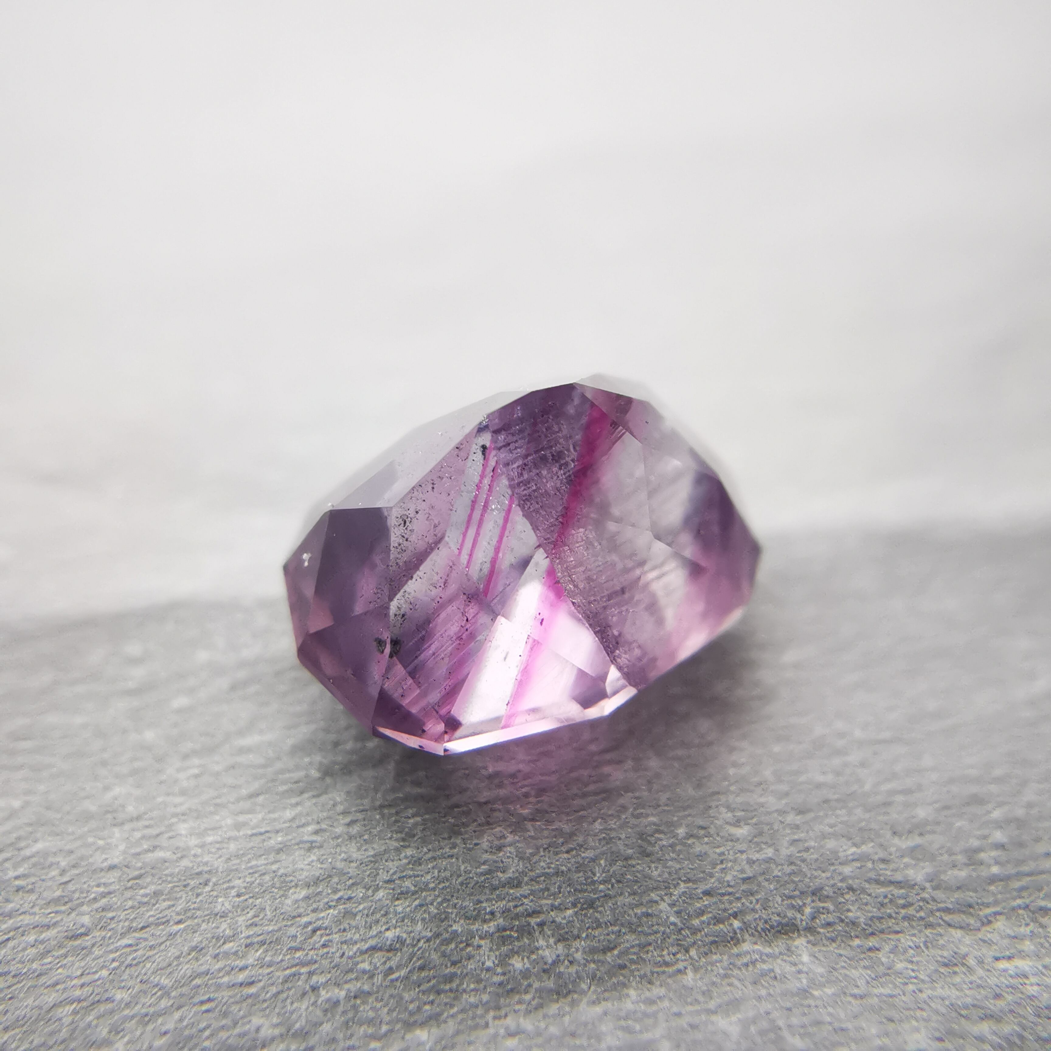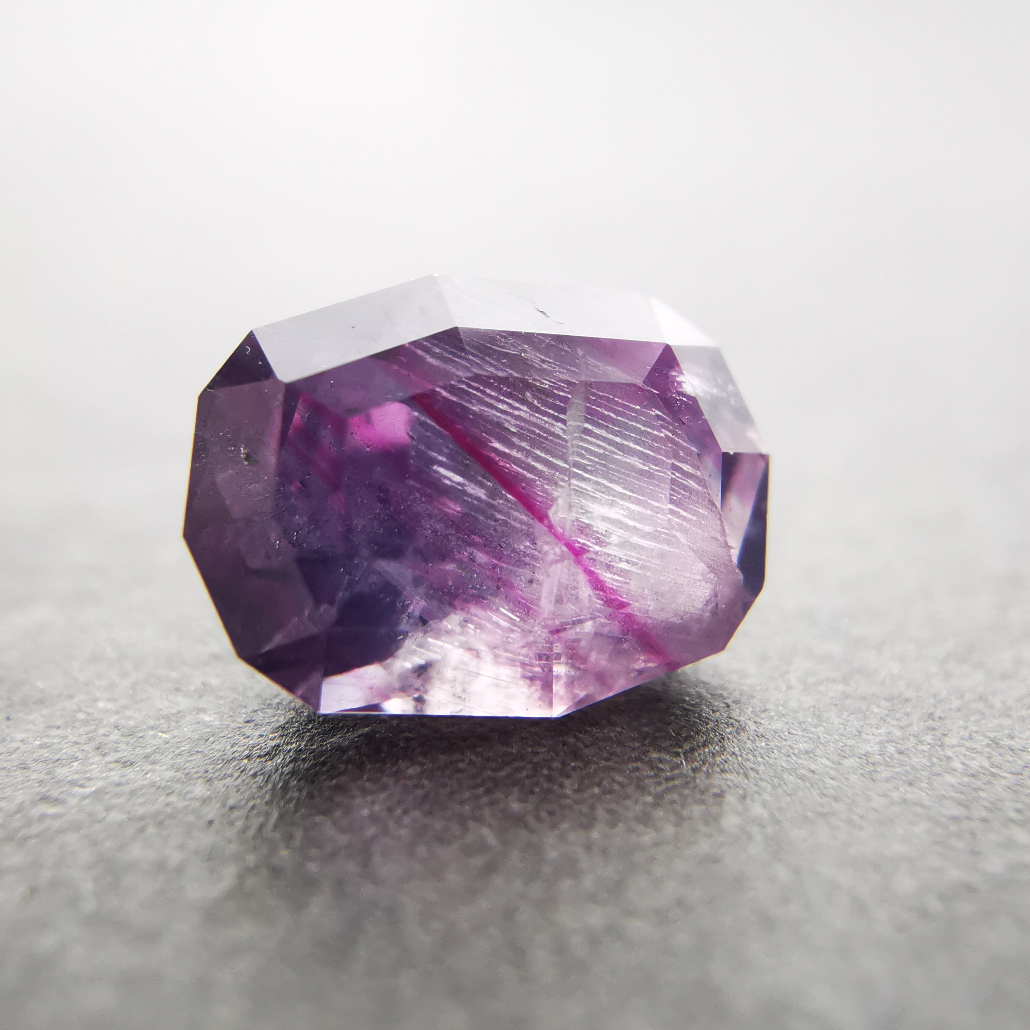 鈍いモーブ色のサファイアに、フクシアパープル/鮮やかな赤紫のカラーバンドが数本入りました。