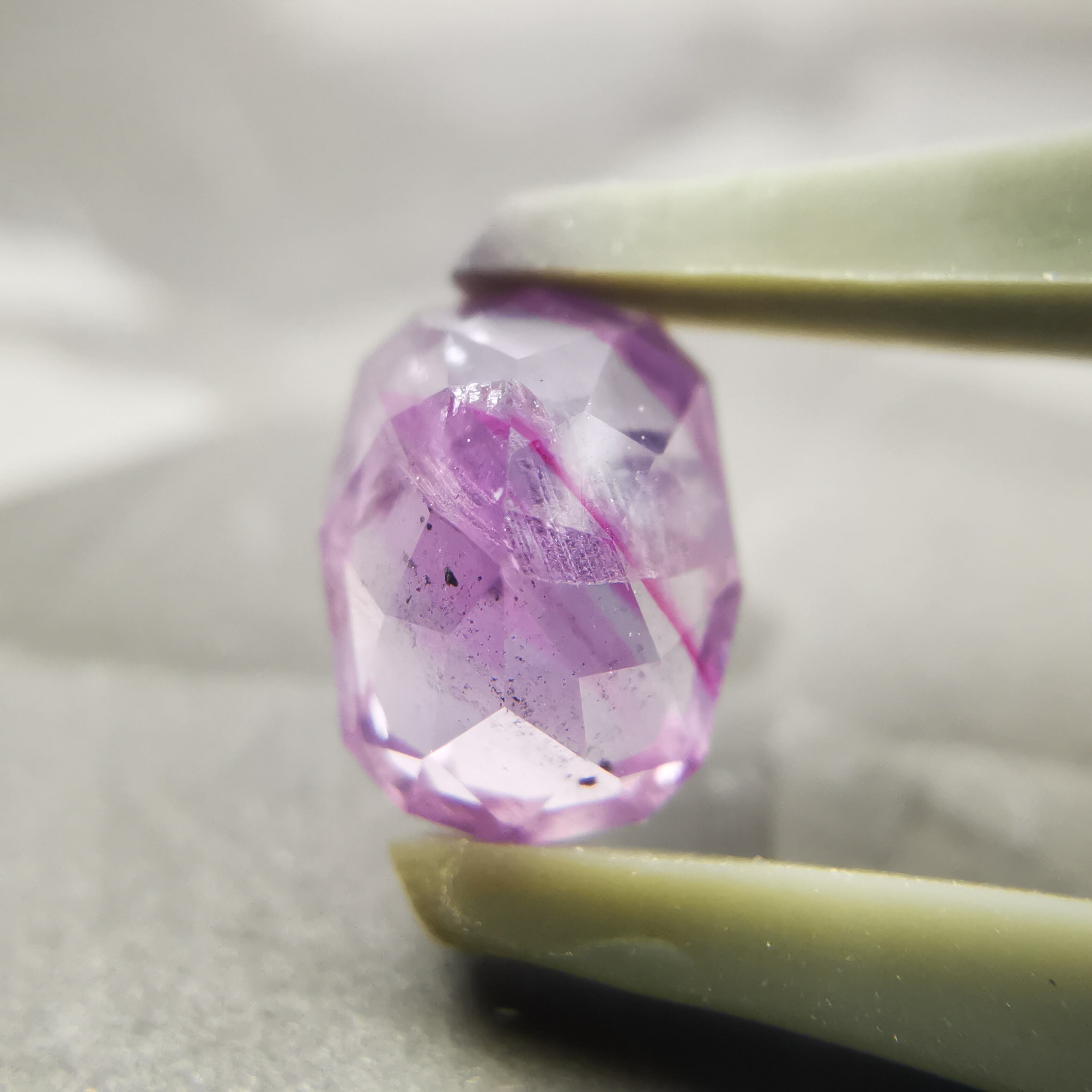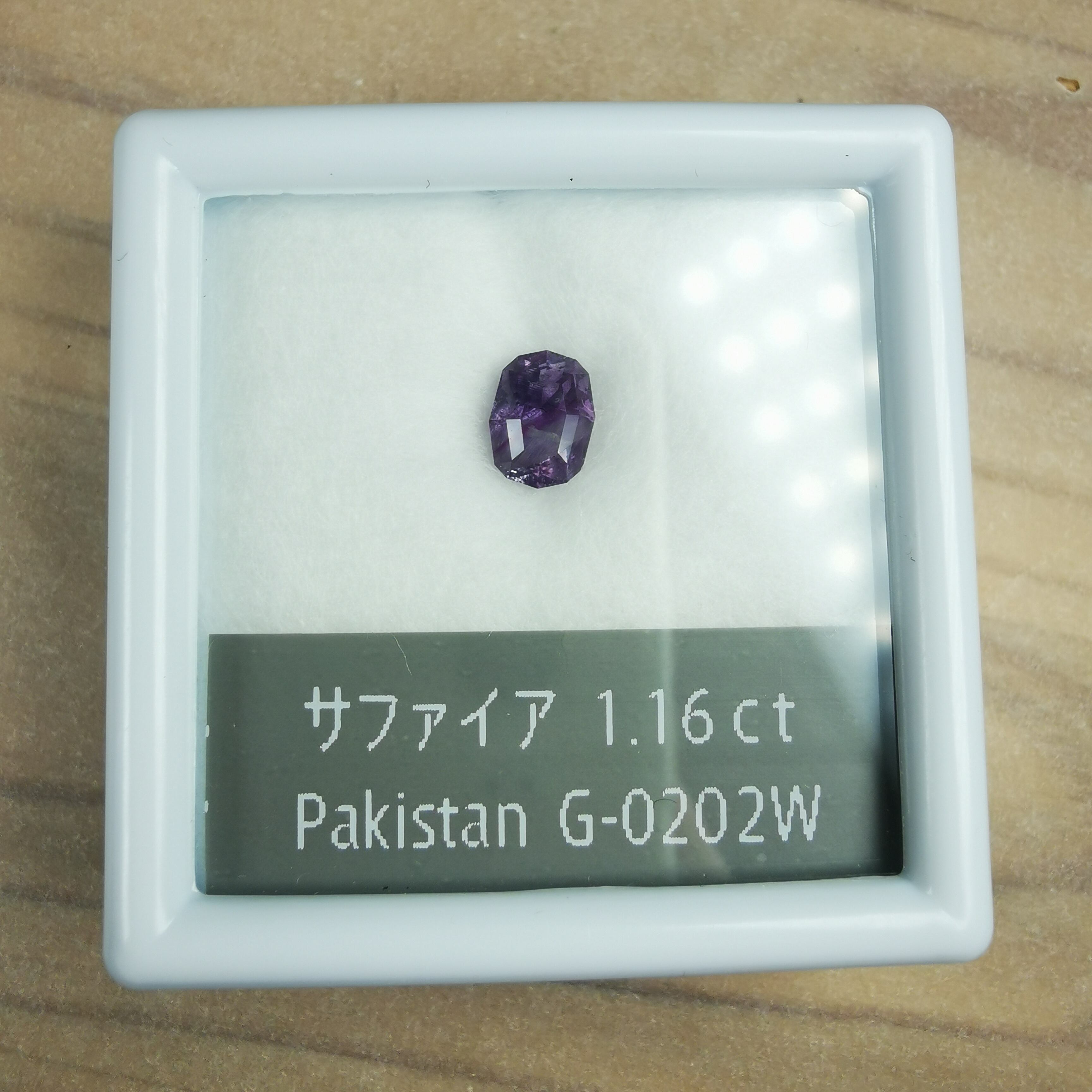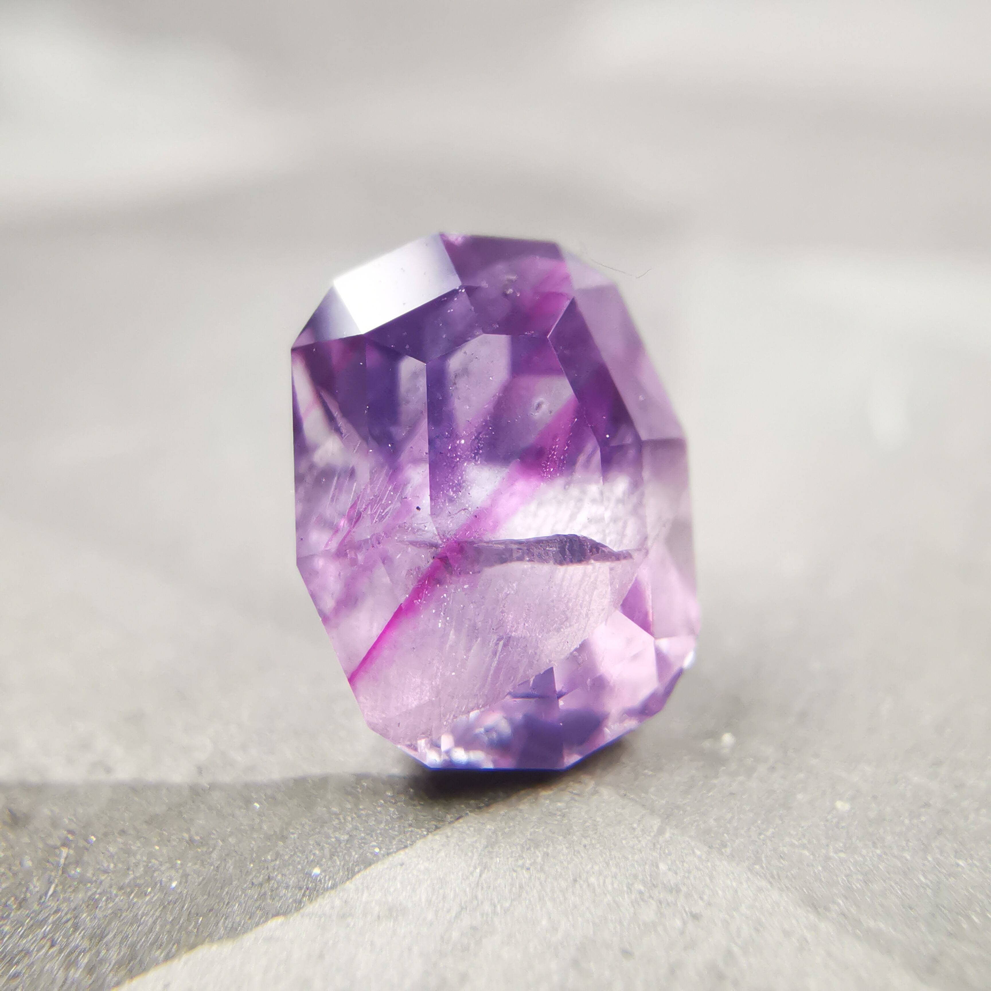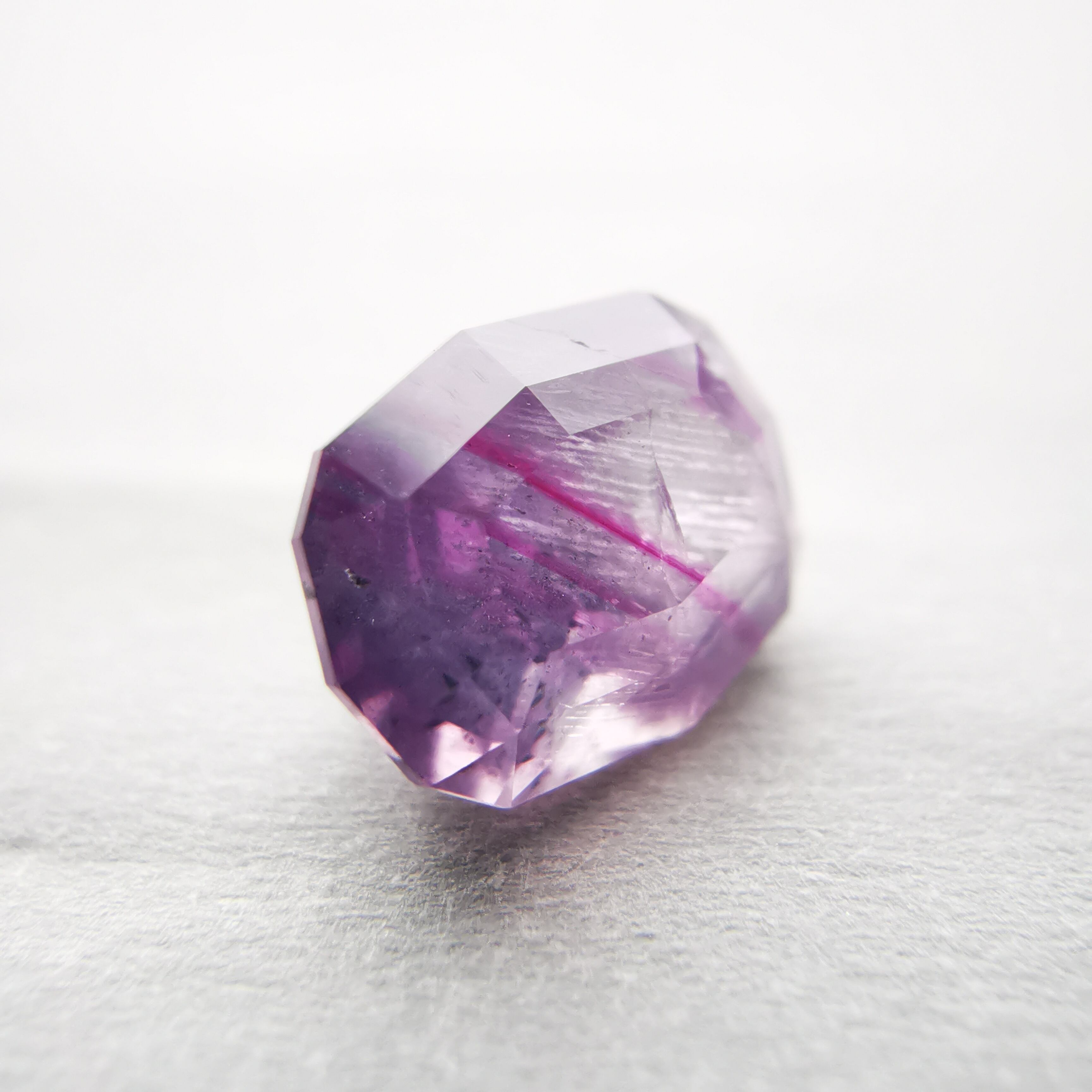 鈍いモーブ色のサファイアに、フクシアパープル/鮮やかな赤紫のカラーバンドが数本入りました。