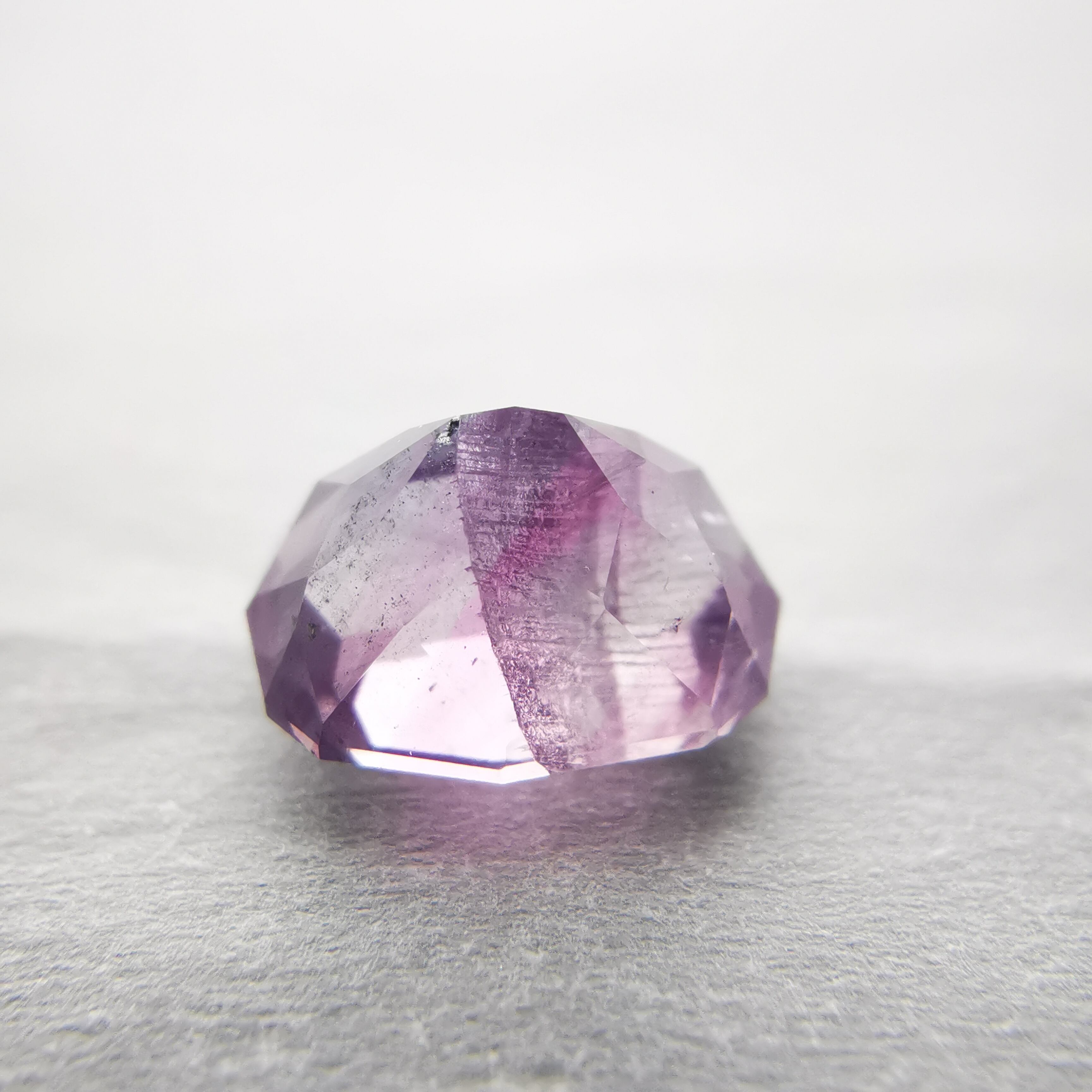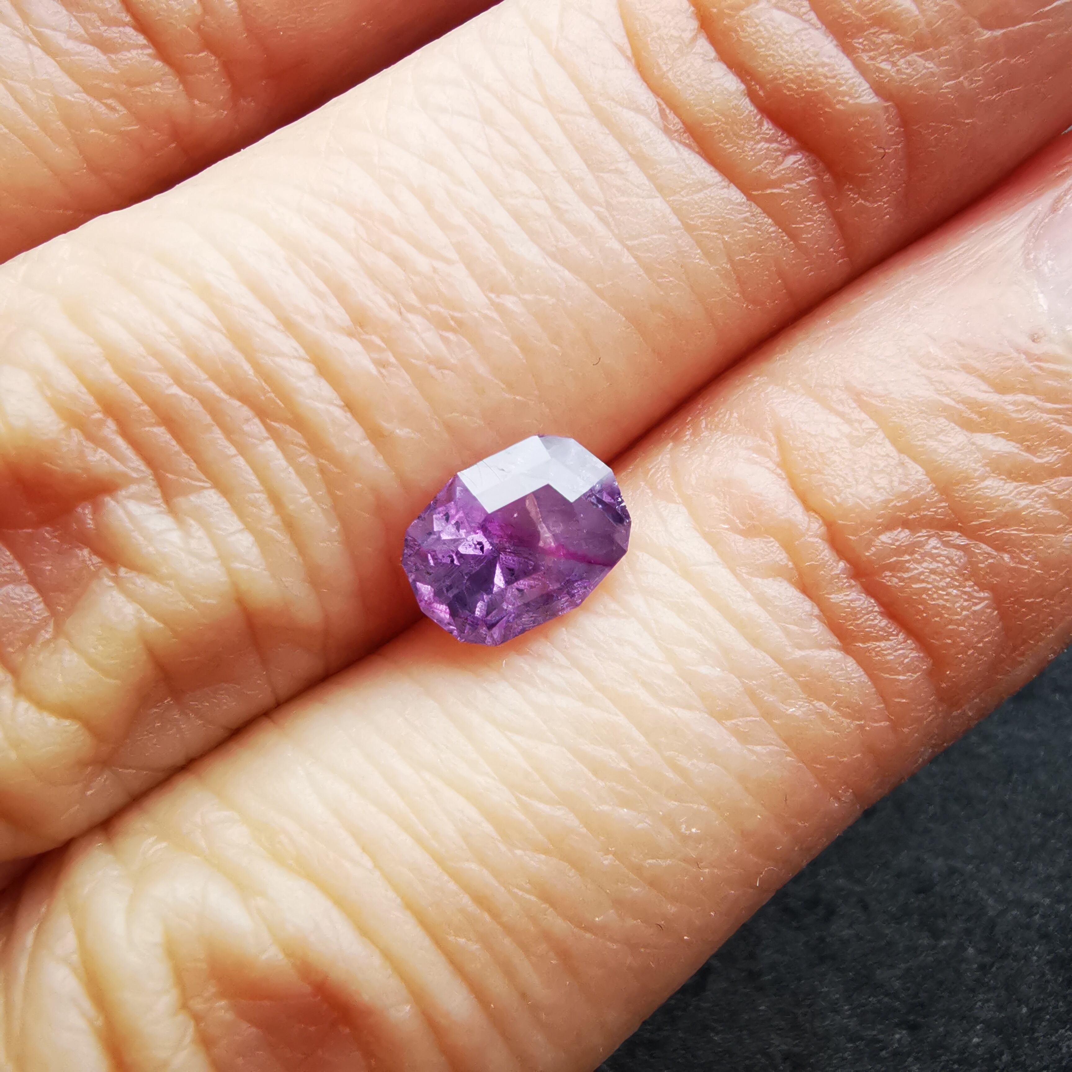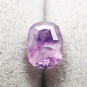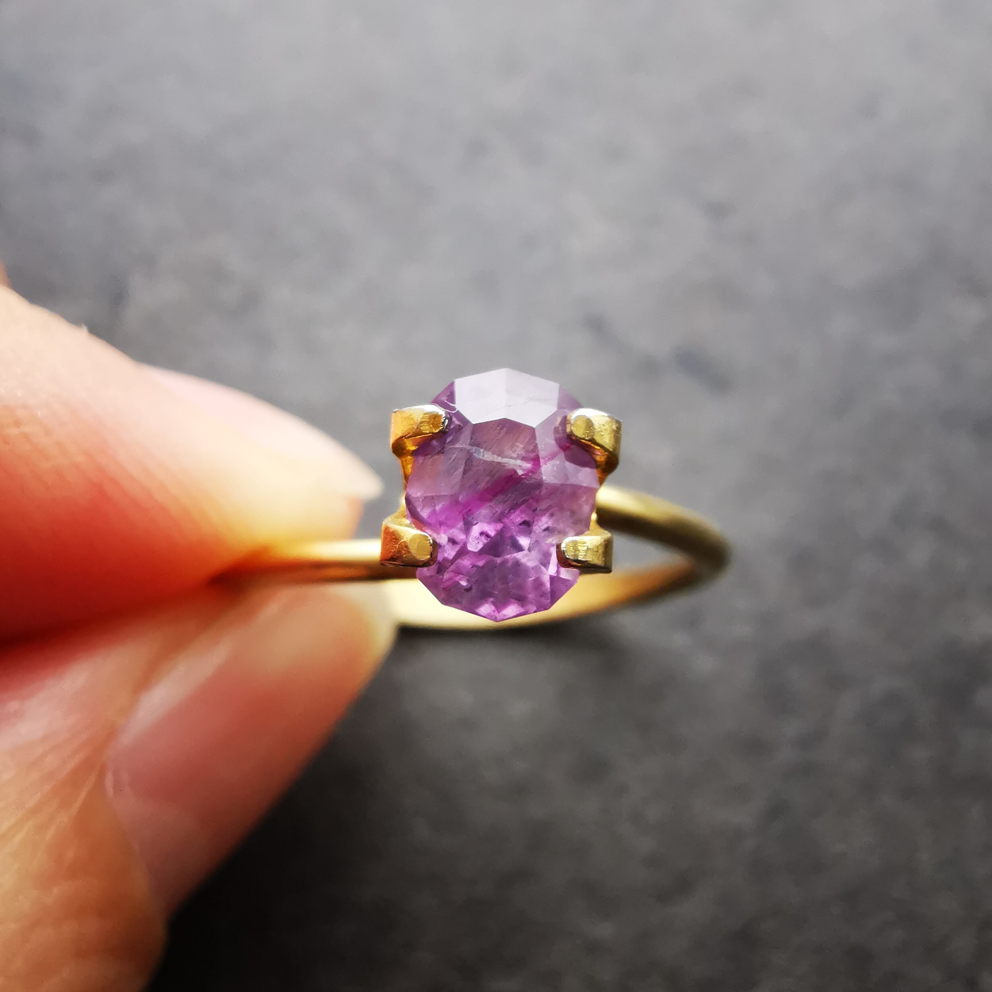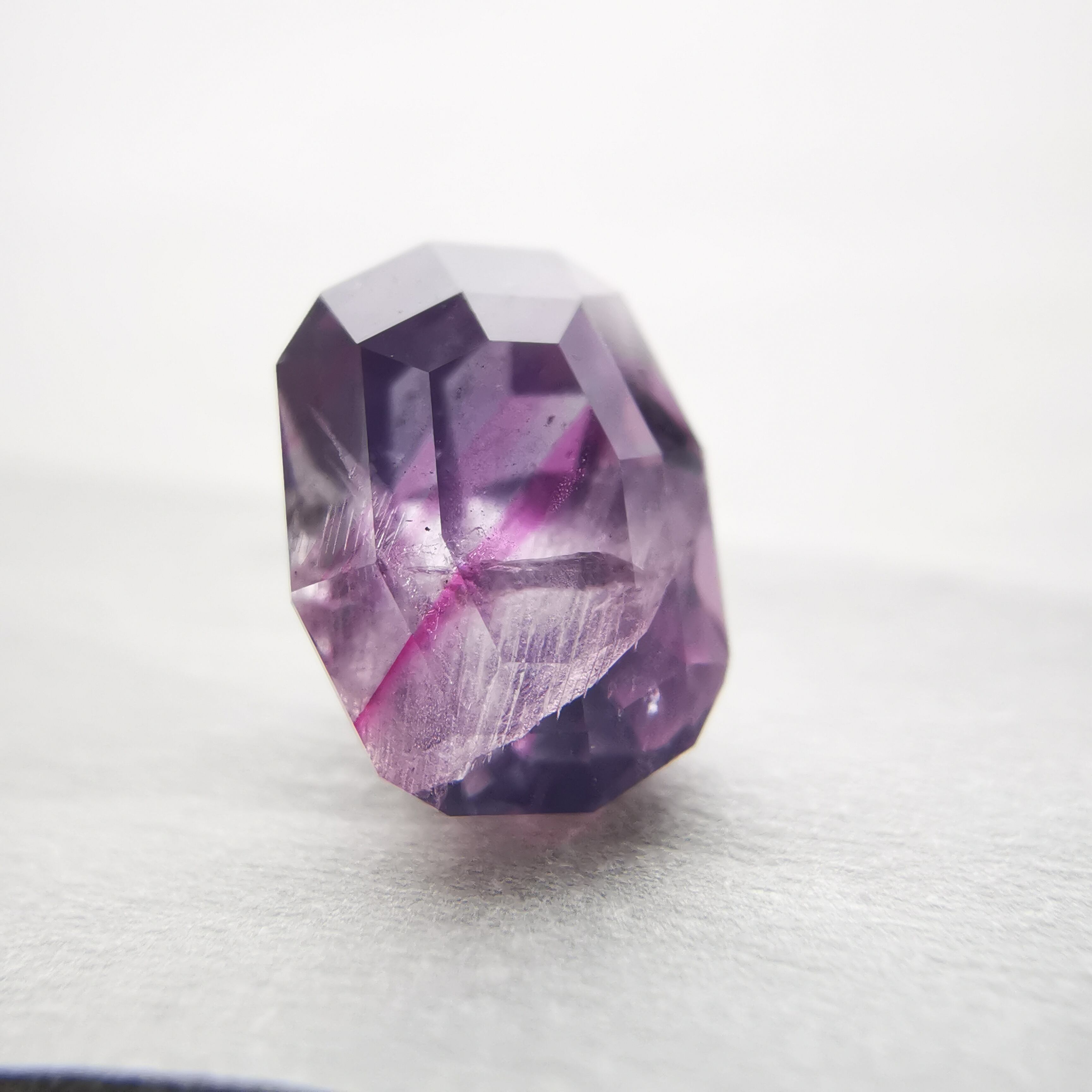 鈍いモーブ色のサファイアに、フクシアパープル/鮮やかな赤紫のカラーバンドが数本入りました。