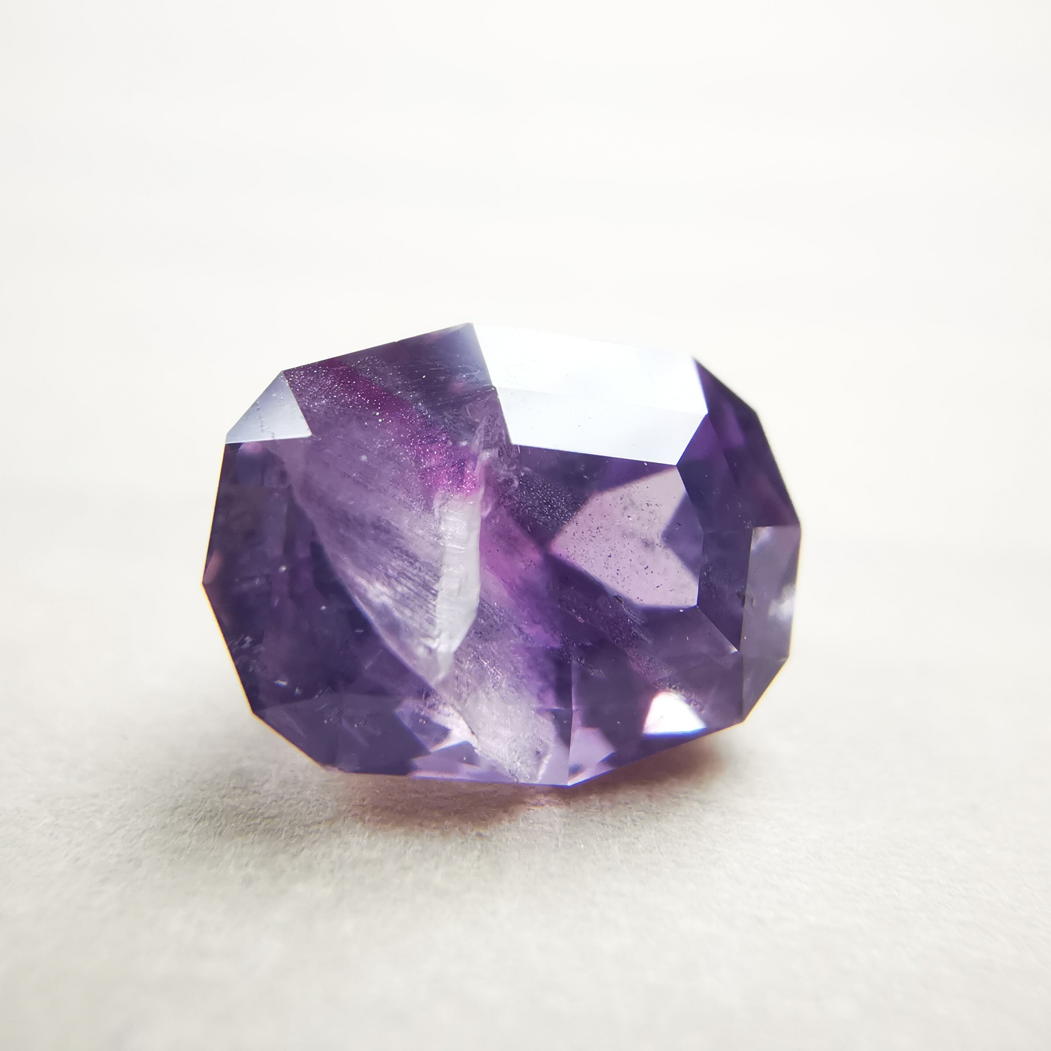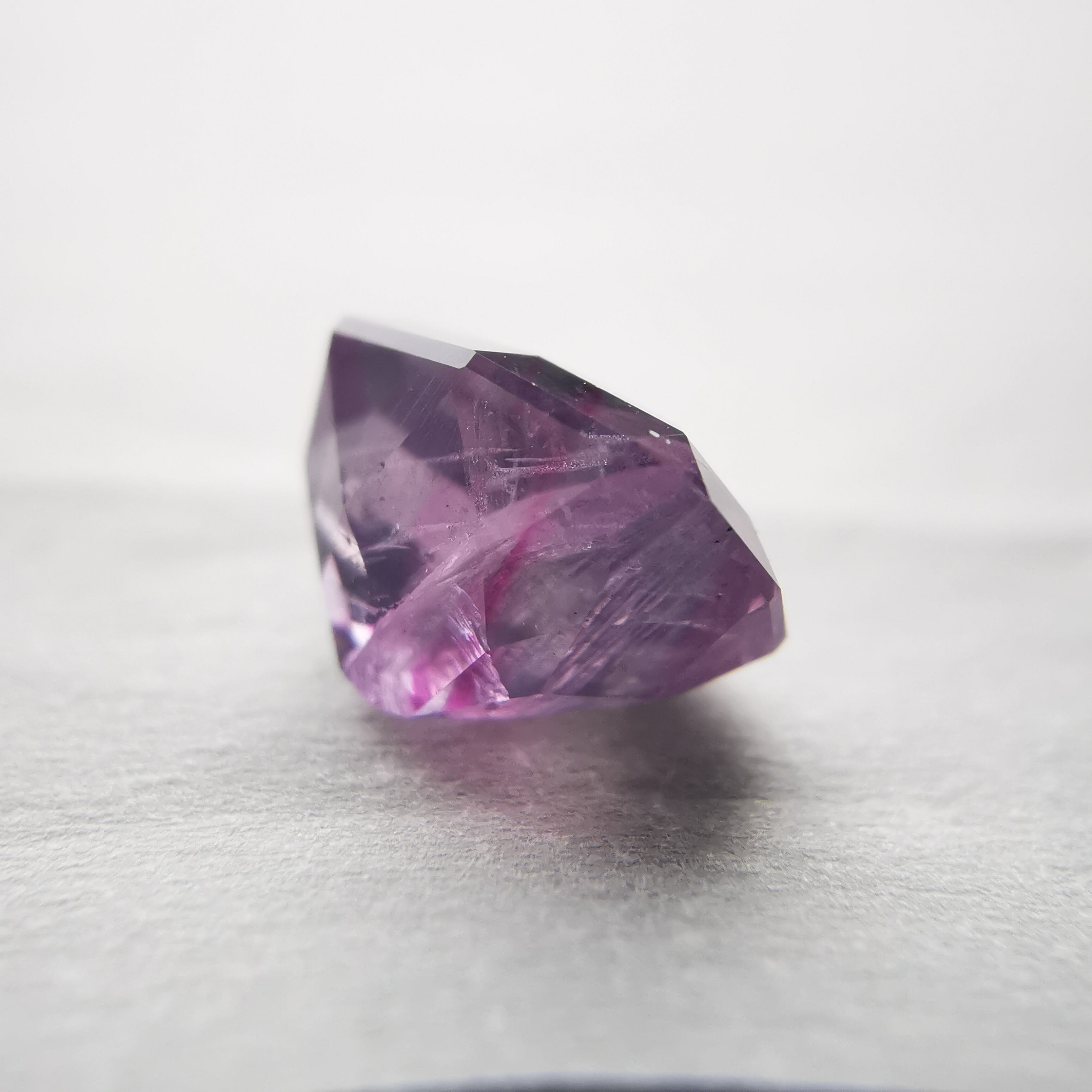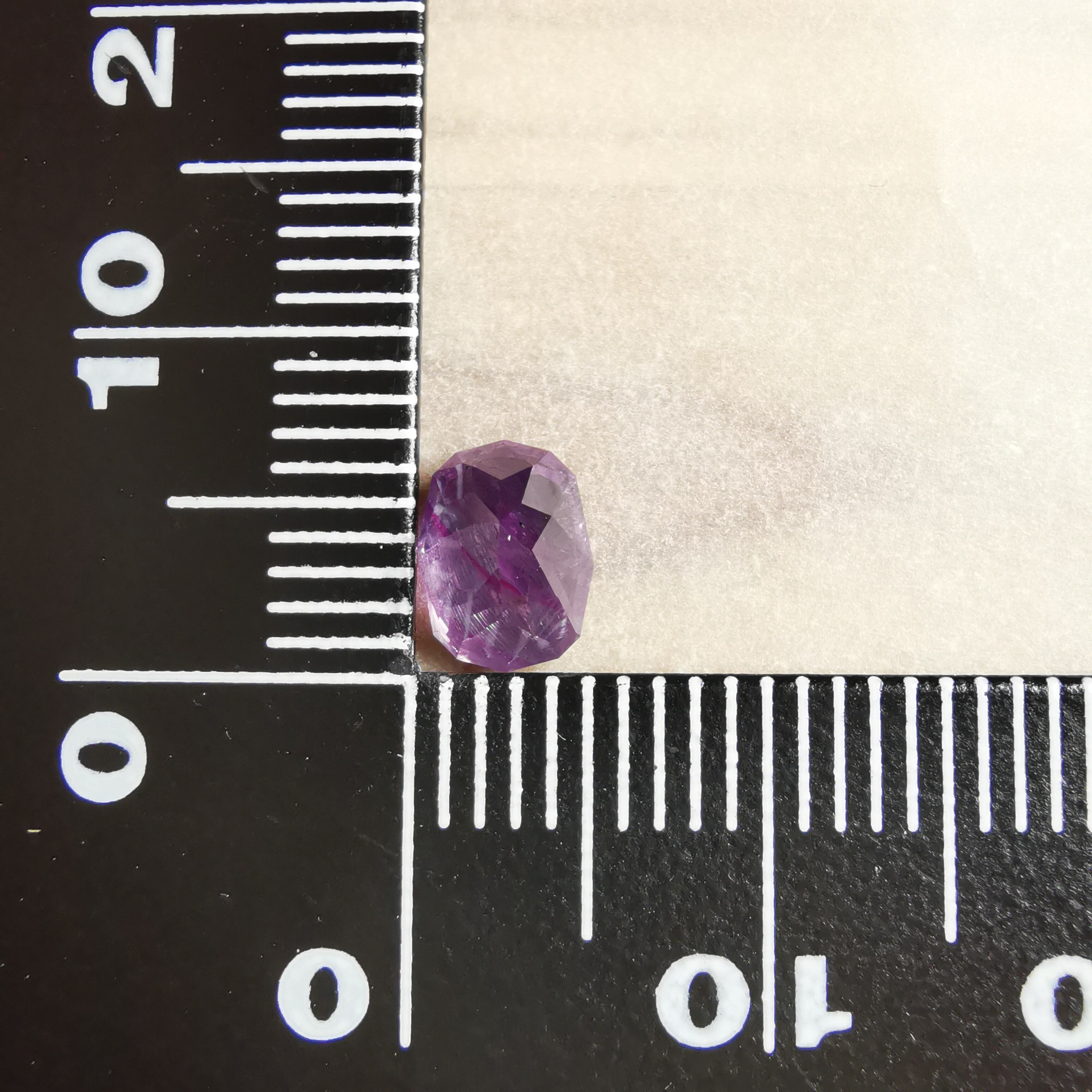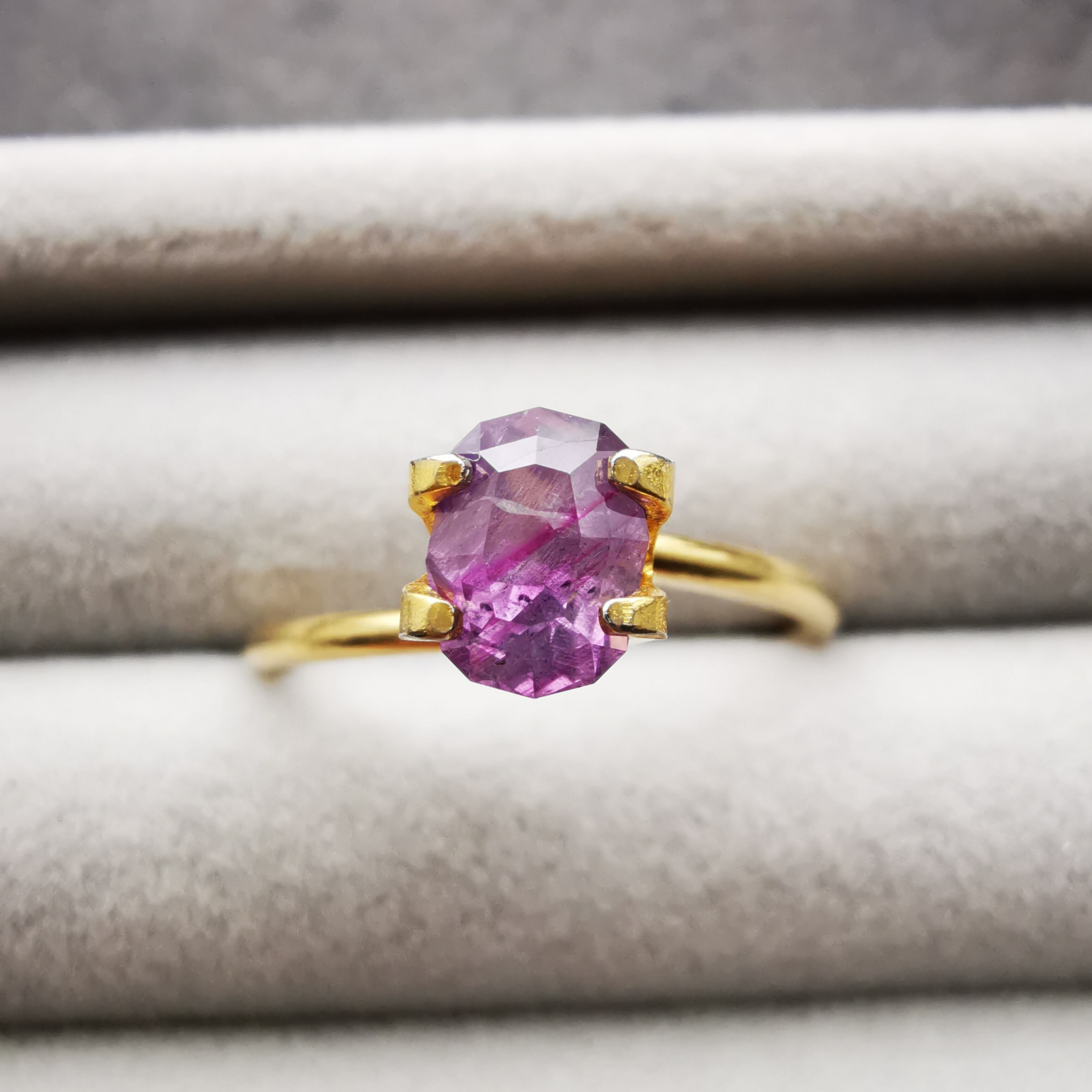 鈍いモーブ色のサファイアに、フクシアパープル/鮮やかな赤紫のカラーバンドが数本入りました。