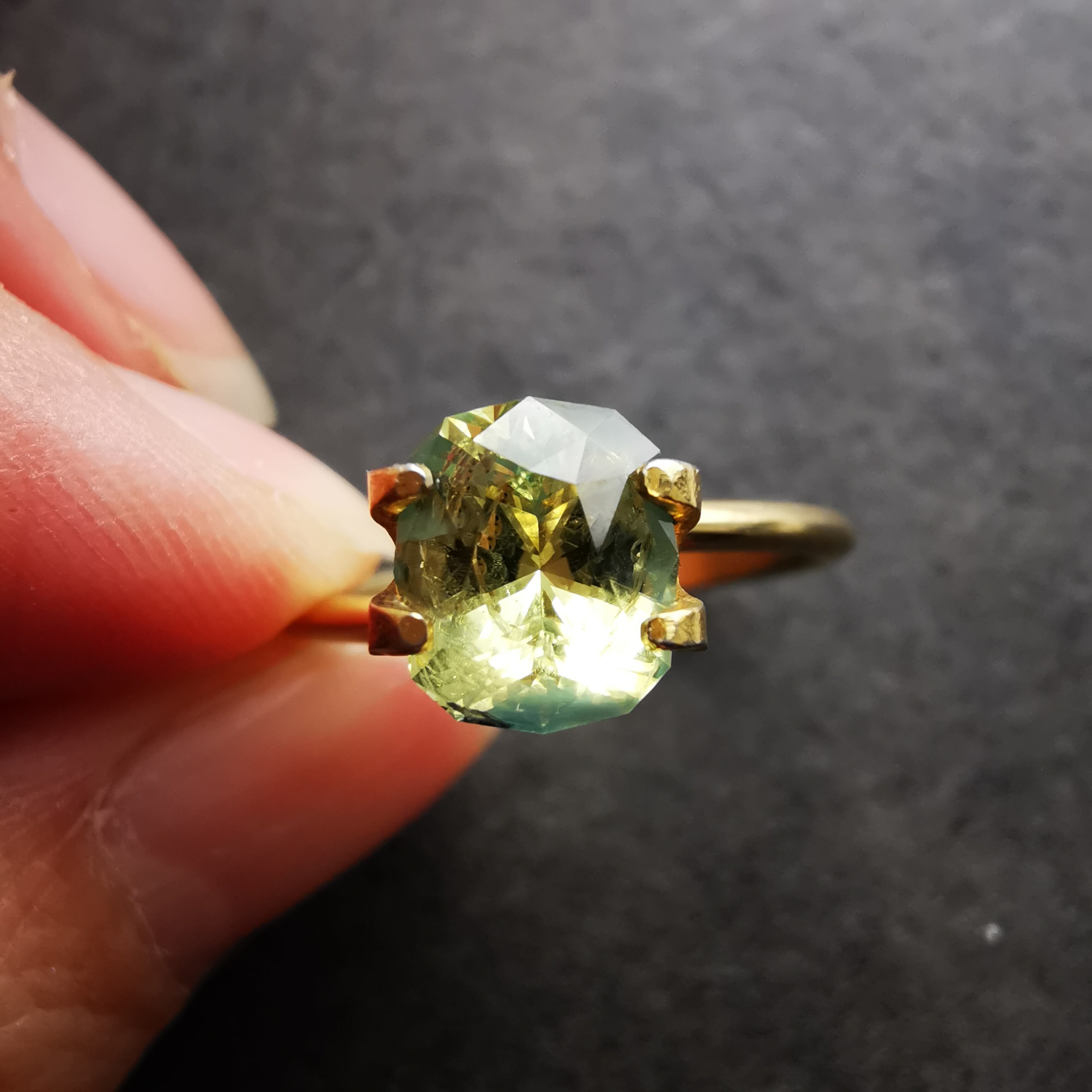 石の縁の青磁色をどうしても、できる限り残してと、無理なリクエストをしたせいか、見たことのない非常に凝ったカットになっています。
