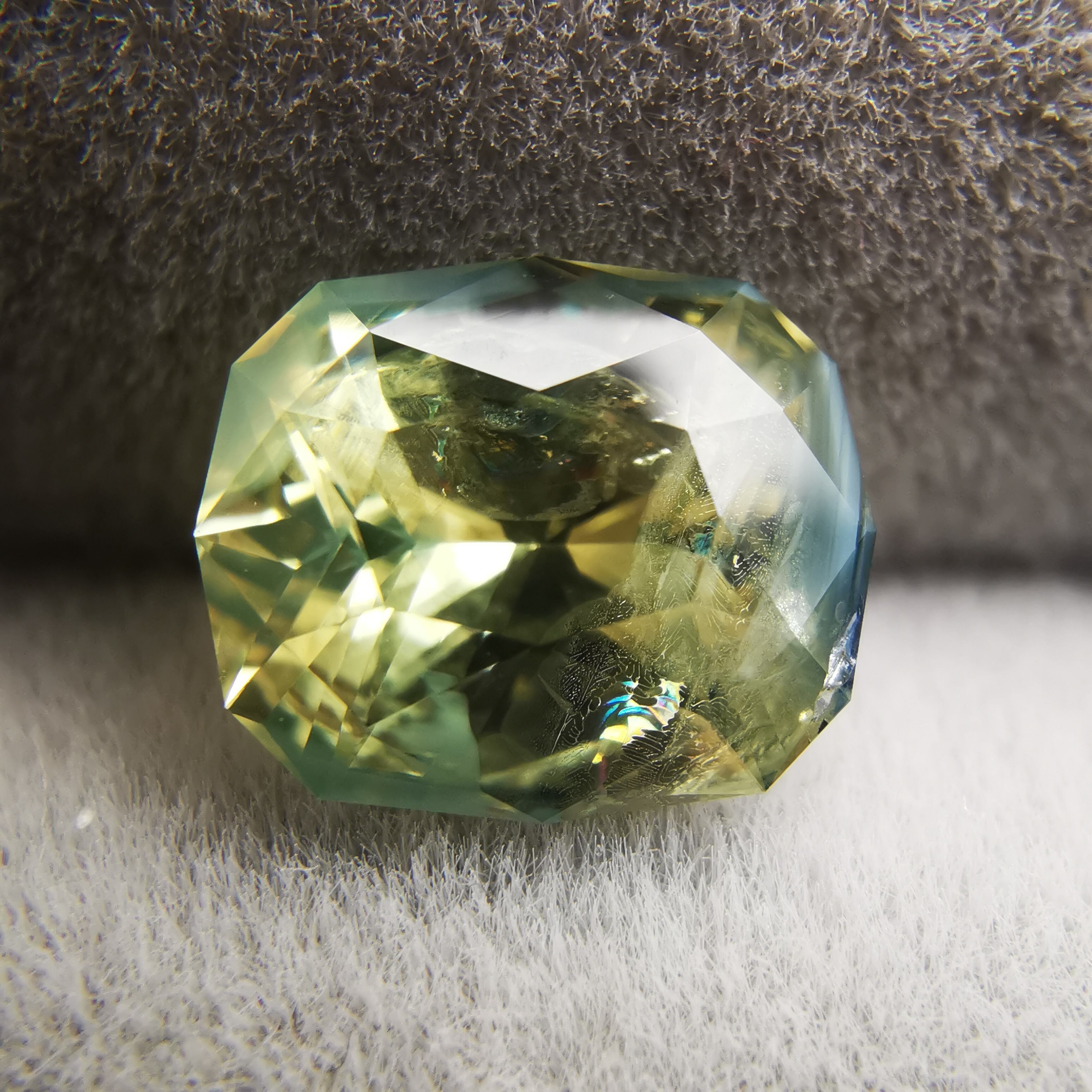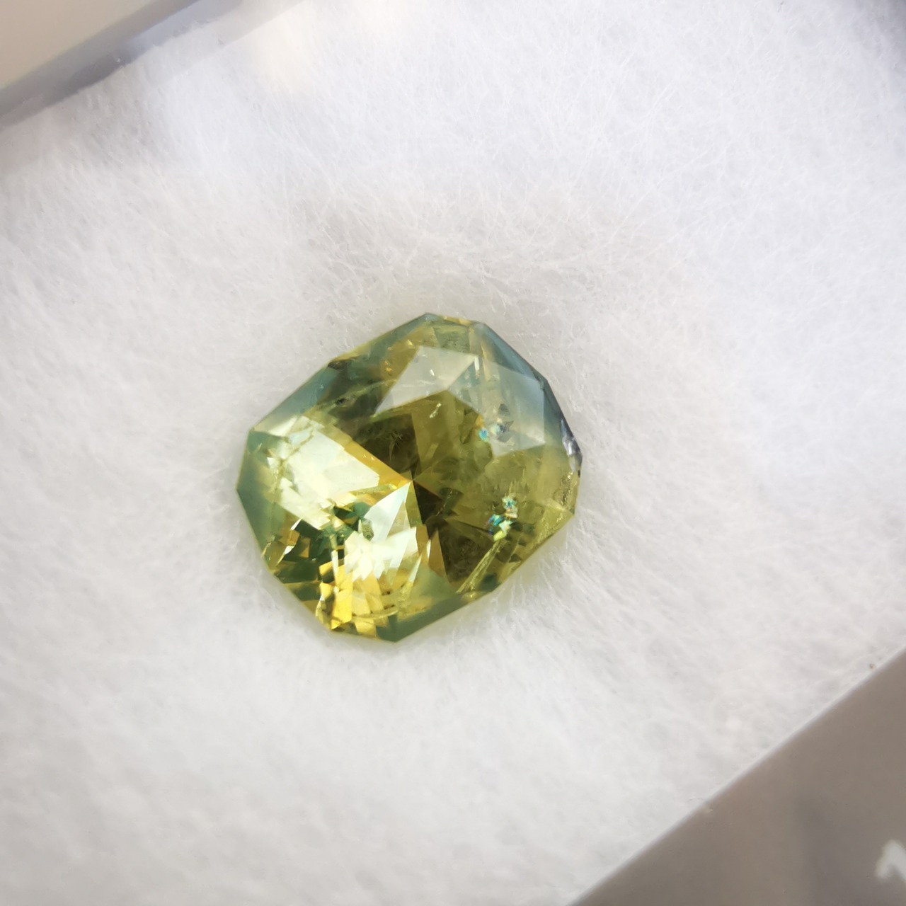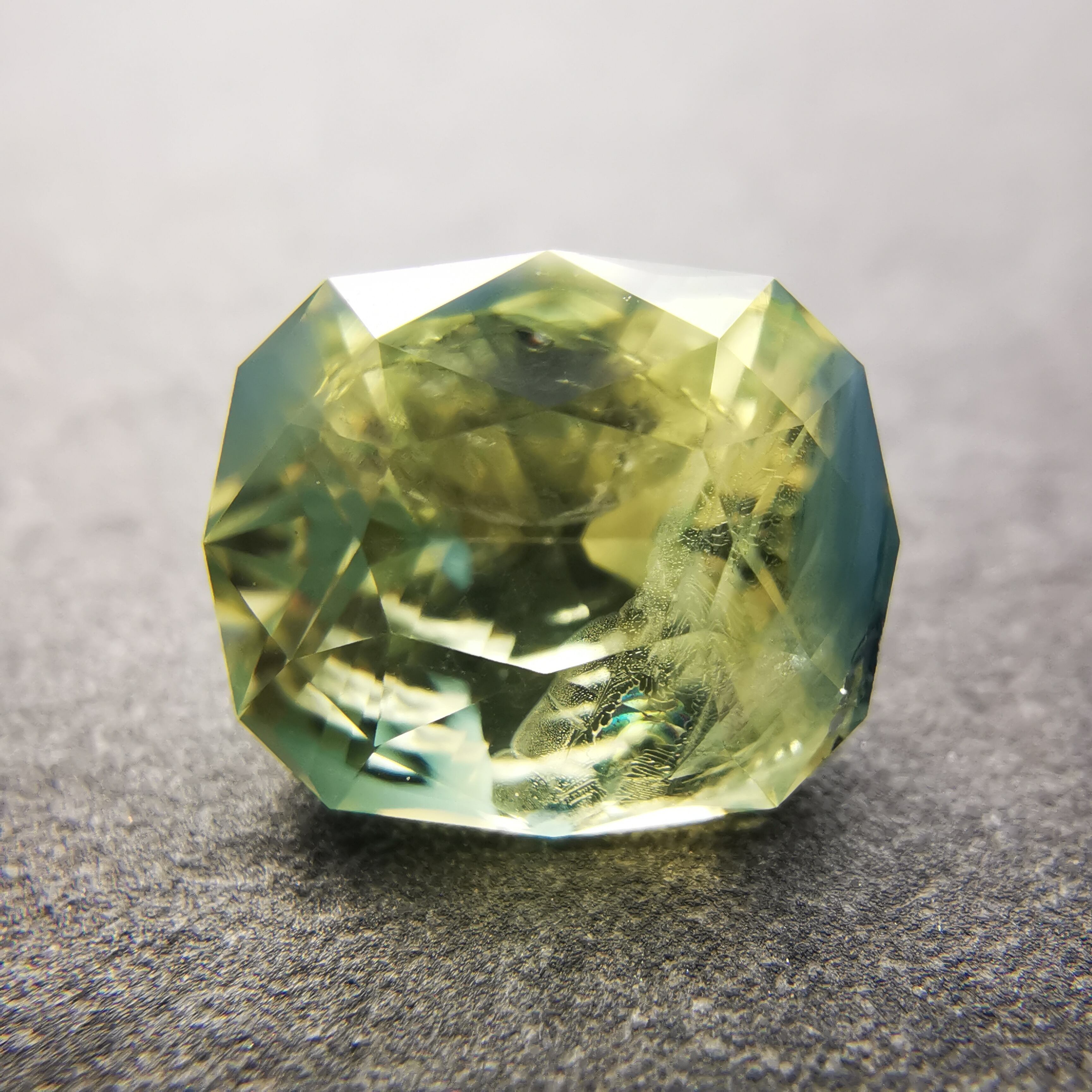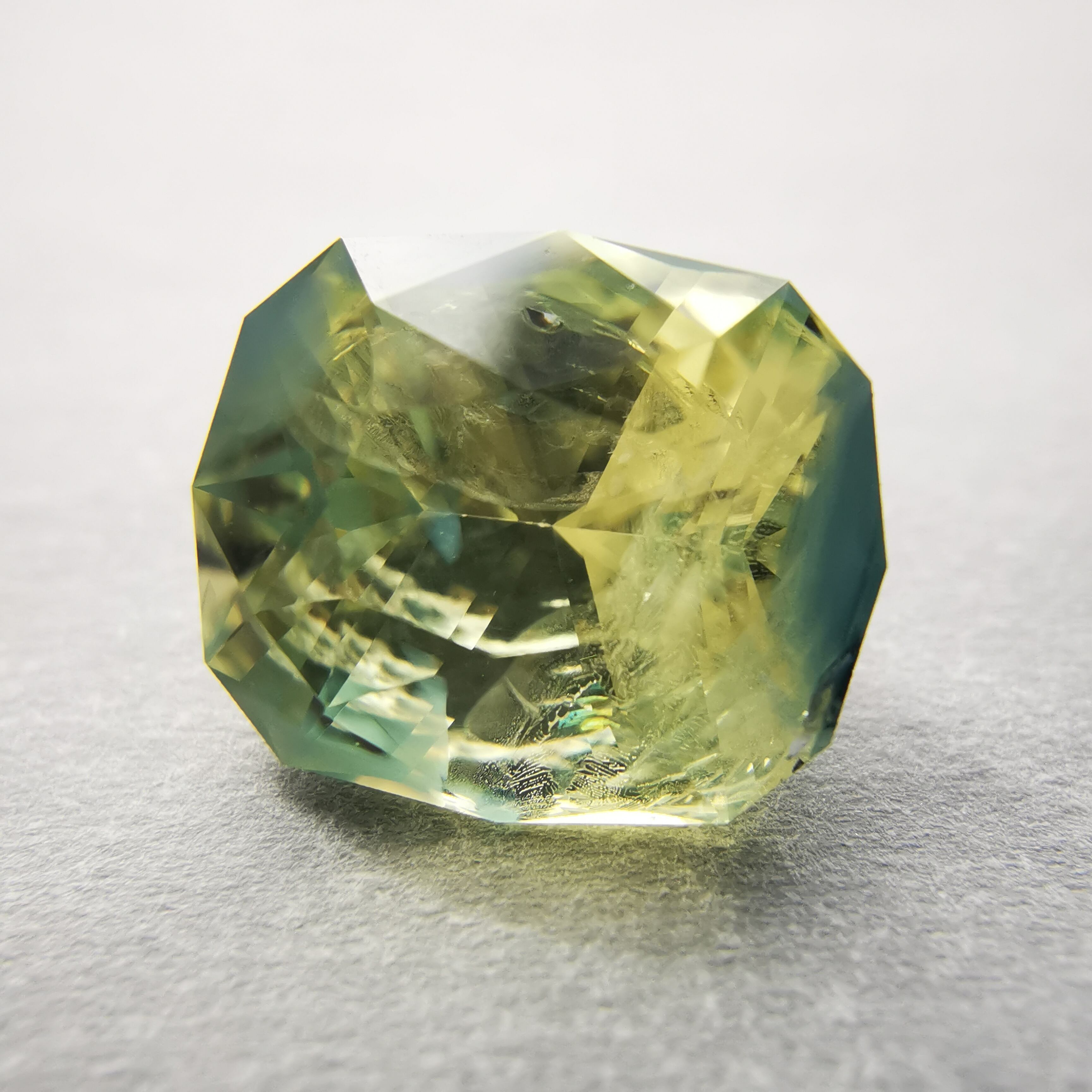 クリソベリルのような黄色、ミルキーな青磁色もクリソベリルに見られる色ですが、その二つが同居して一石で楽しむことが出来るのは、サファイアならではの魅力です。
