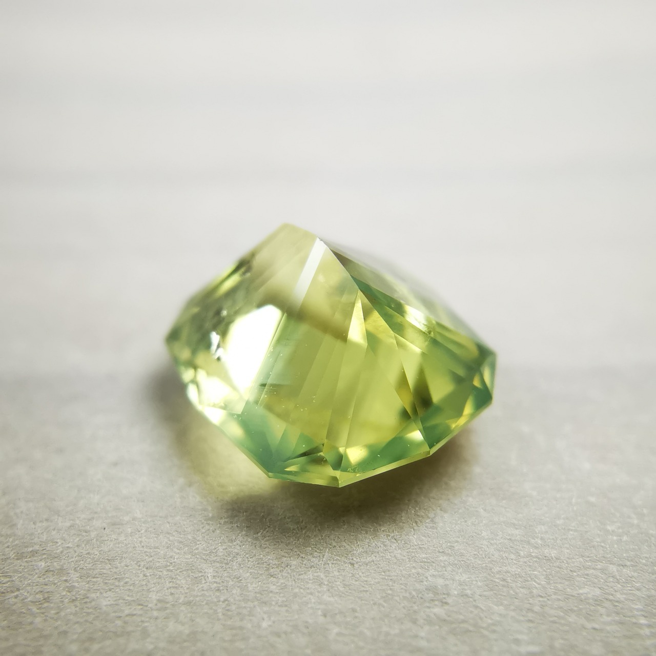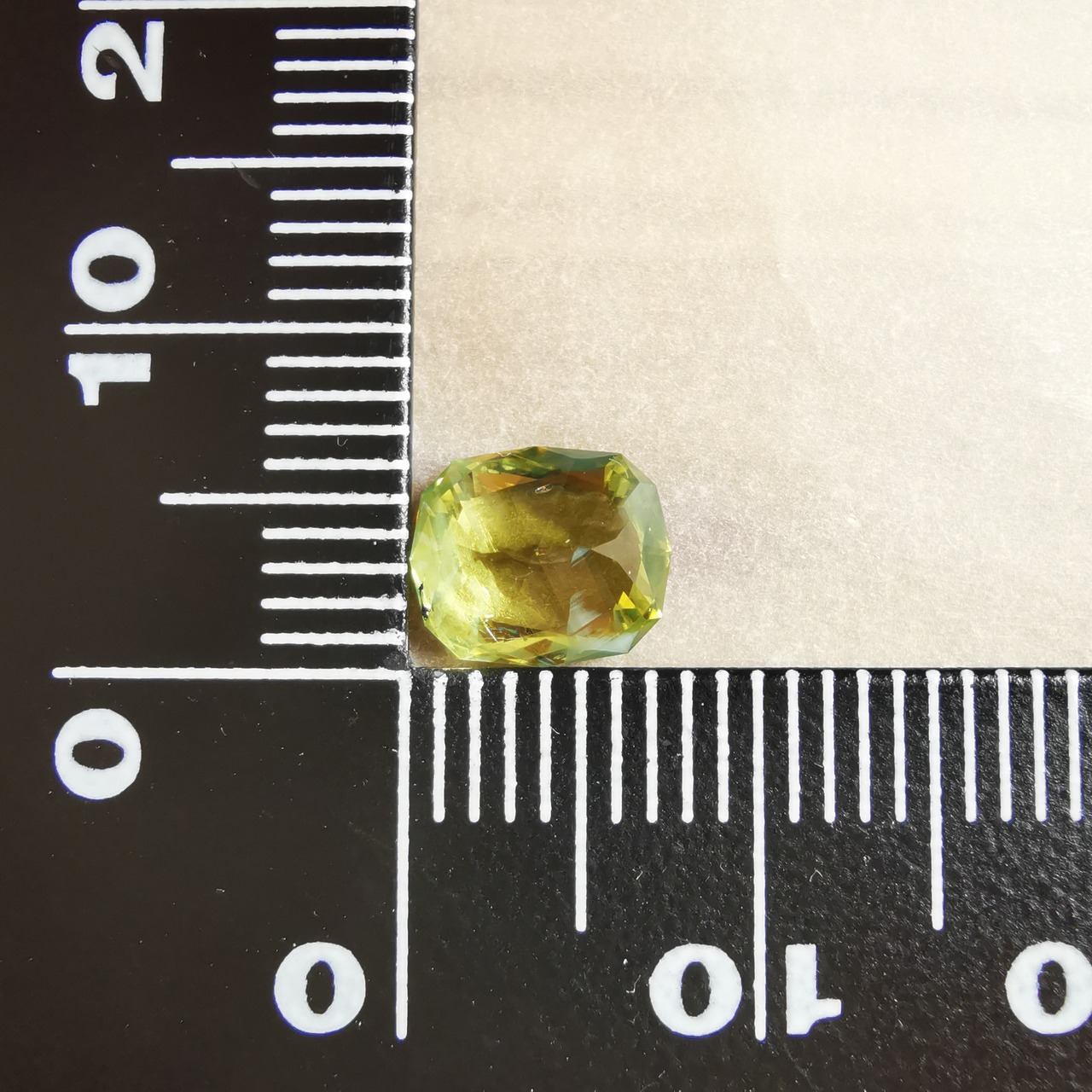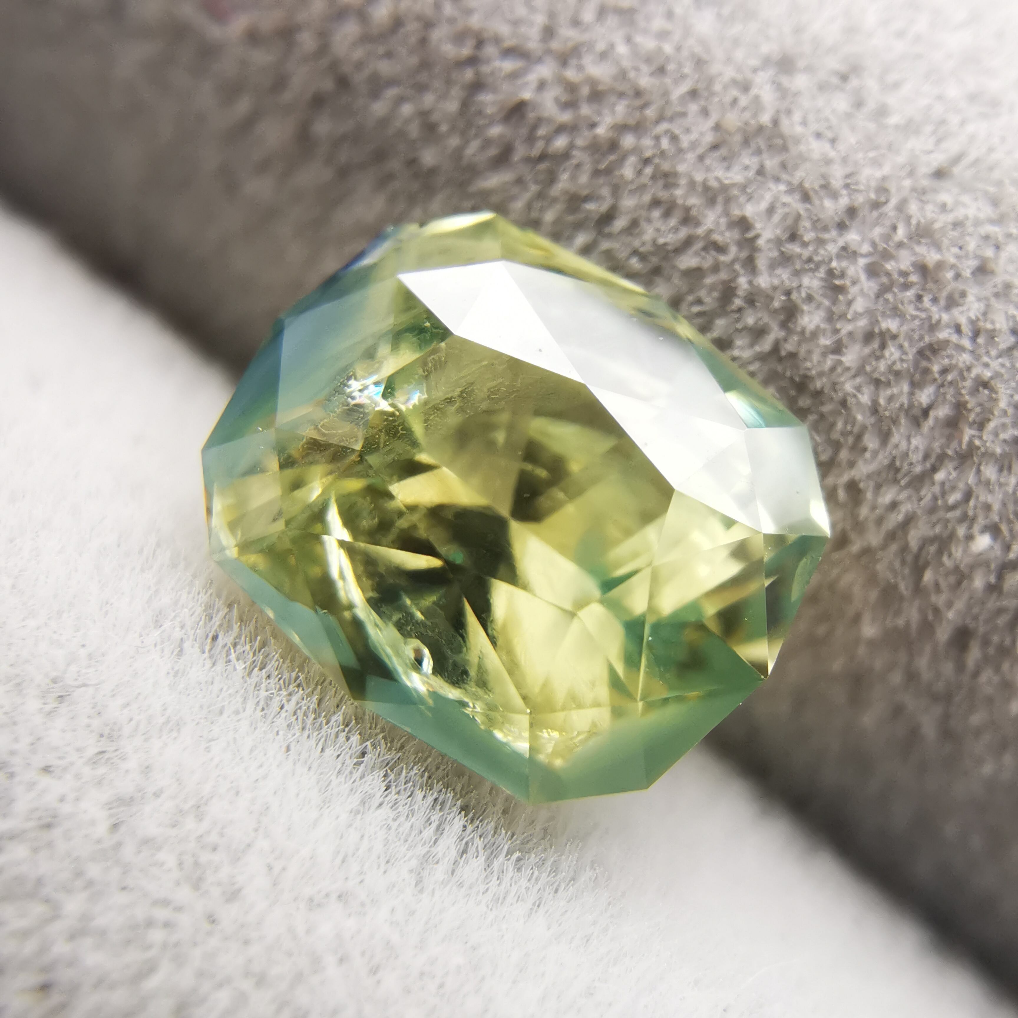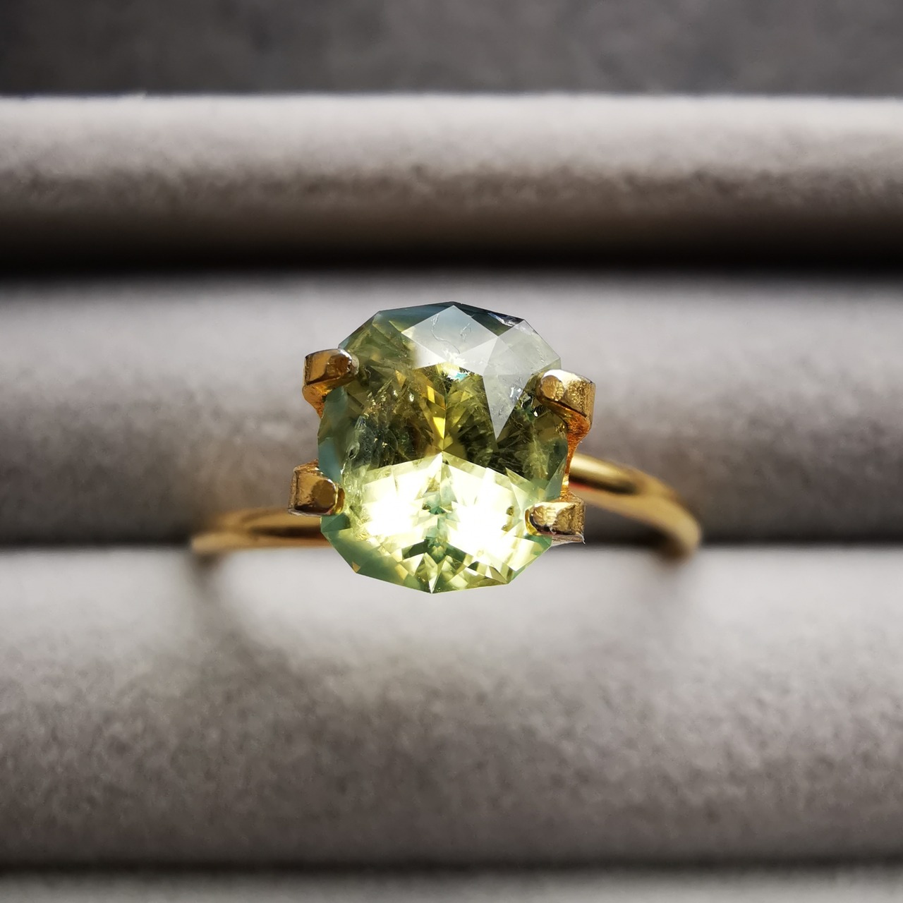 クリアでよくきらめく緑みの明るい黄色/黄檗色の石の周りを、しっとりとミルキーな青磁色がぐるりと縁取るサファイアです。