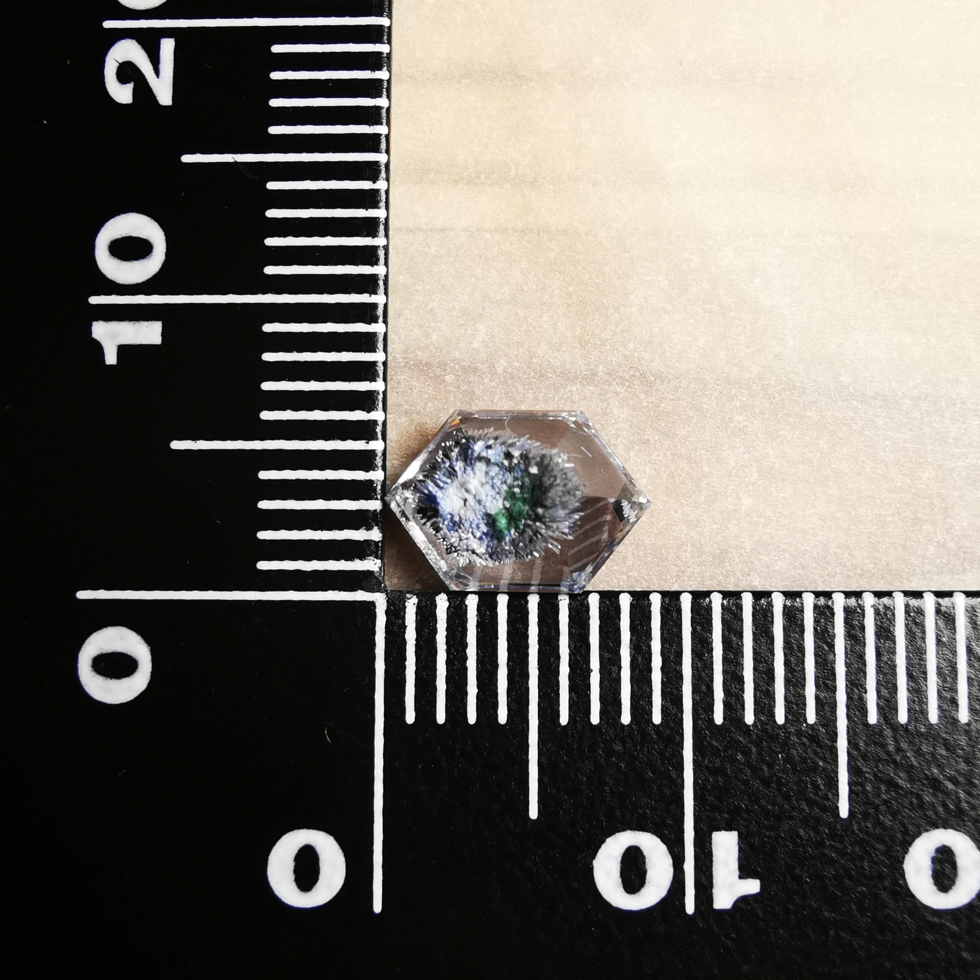 また、結晶の一部、緑色に見える部分は、恐らく研磨に使うドップワックスが残っていますが、無理に削り取ろうとすると結晶も取れてしまうため、この状態でのお渡しになります。
