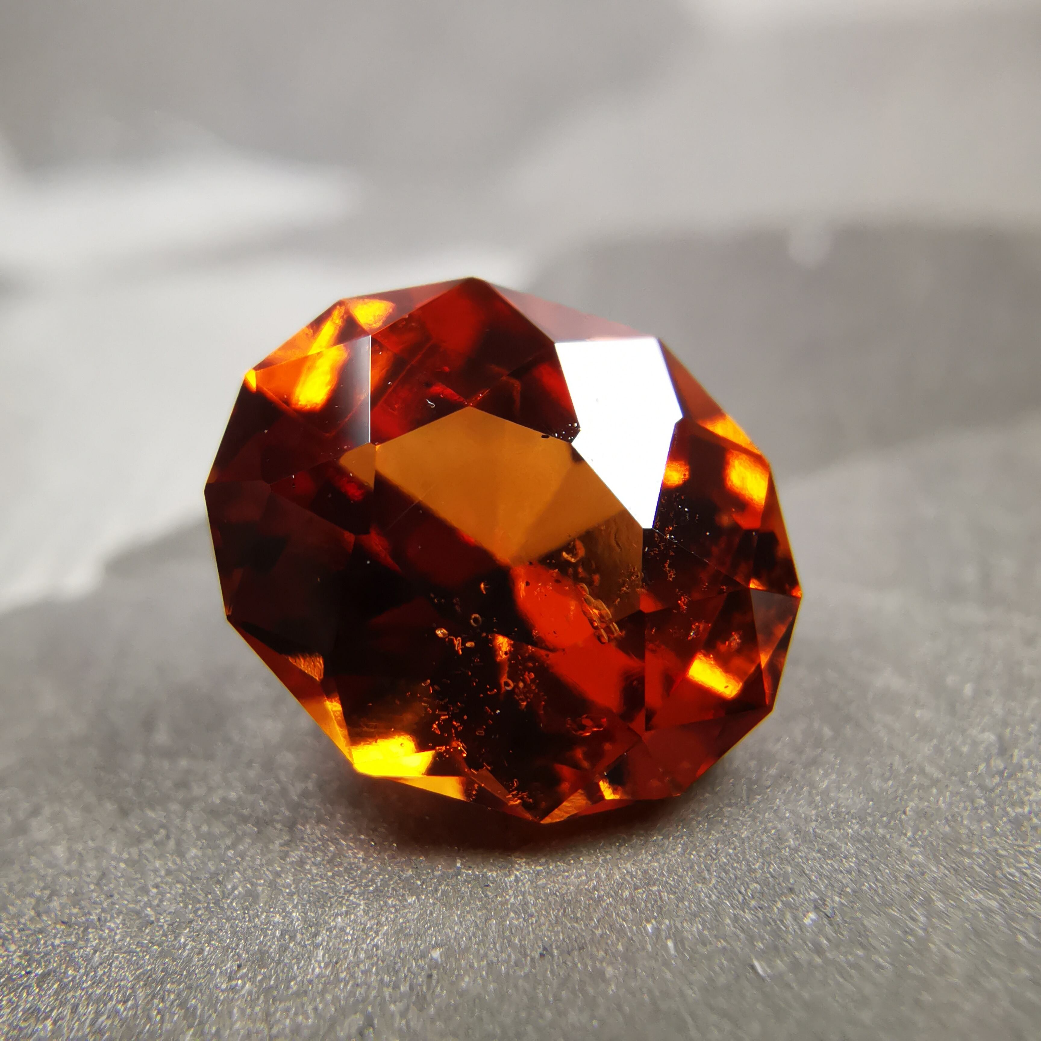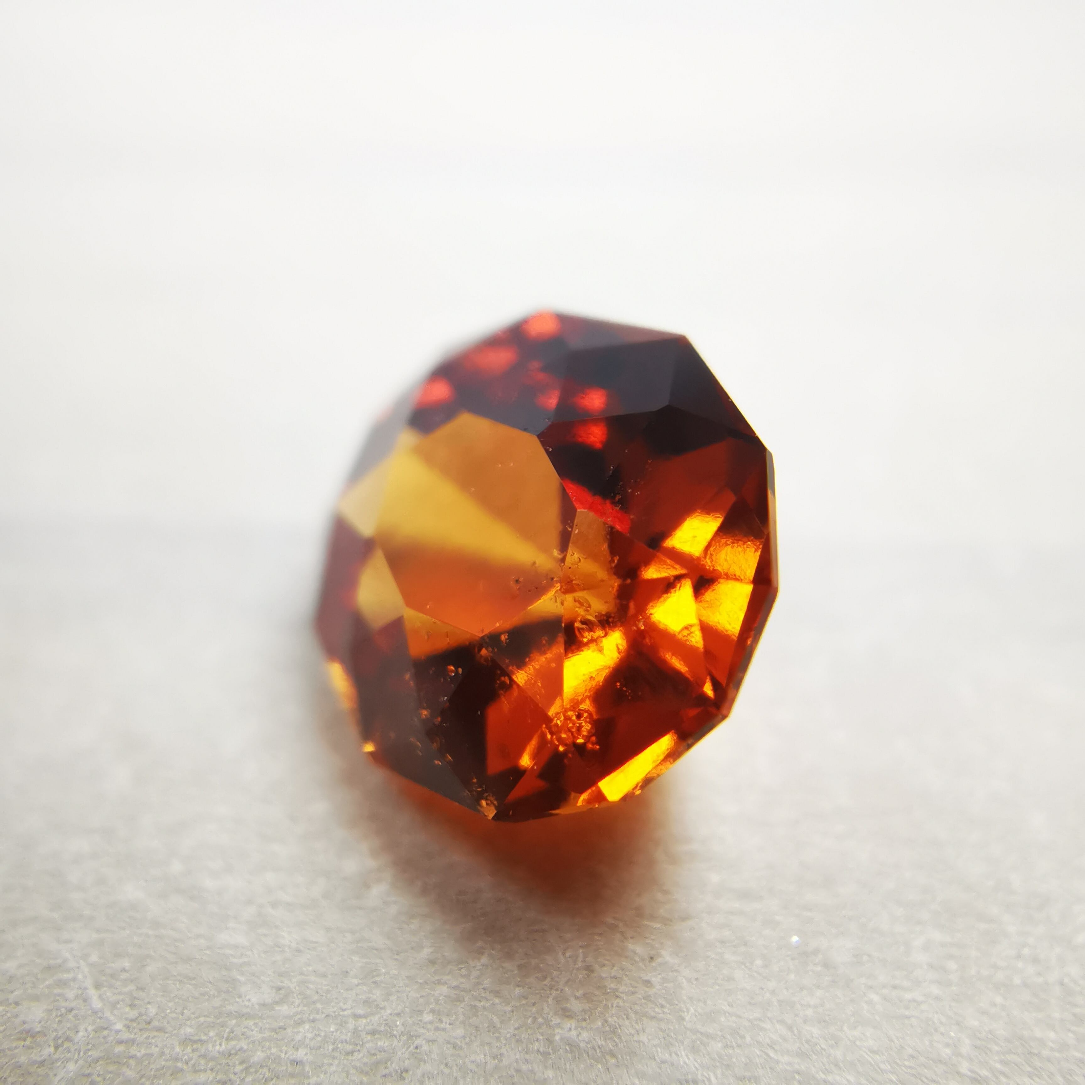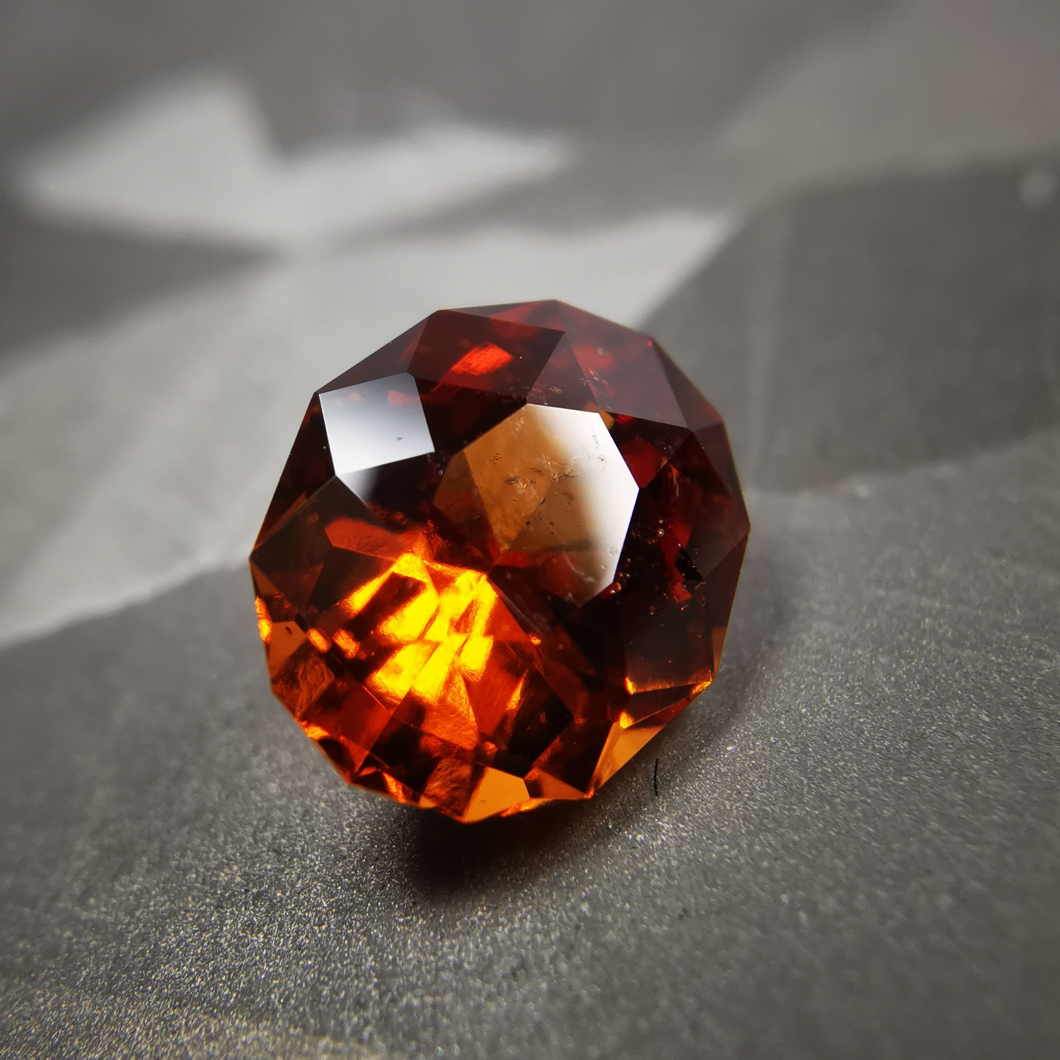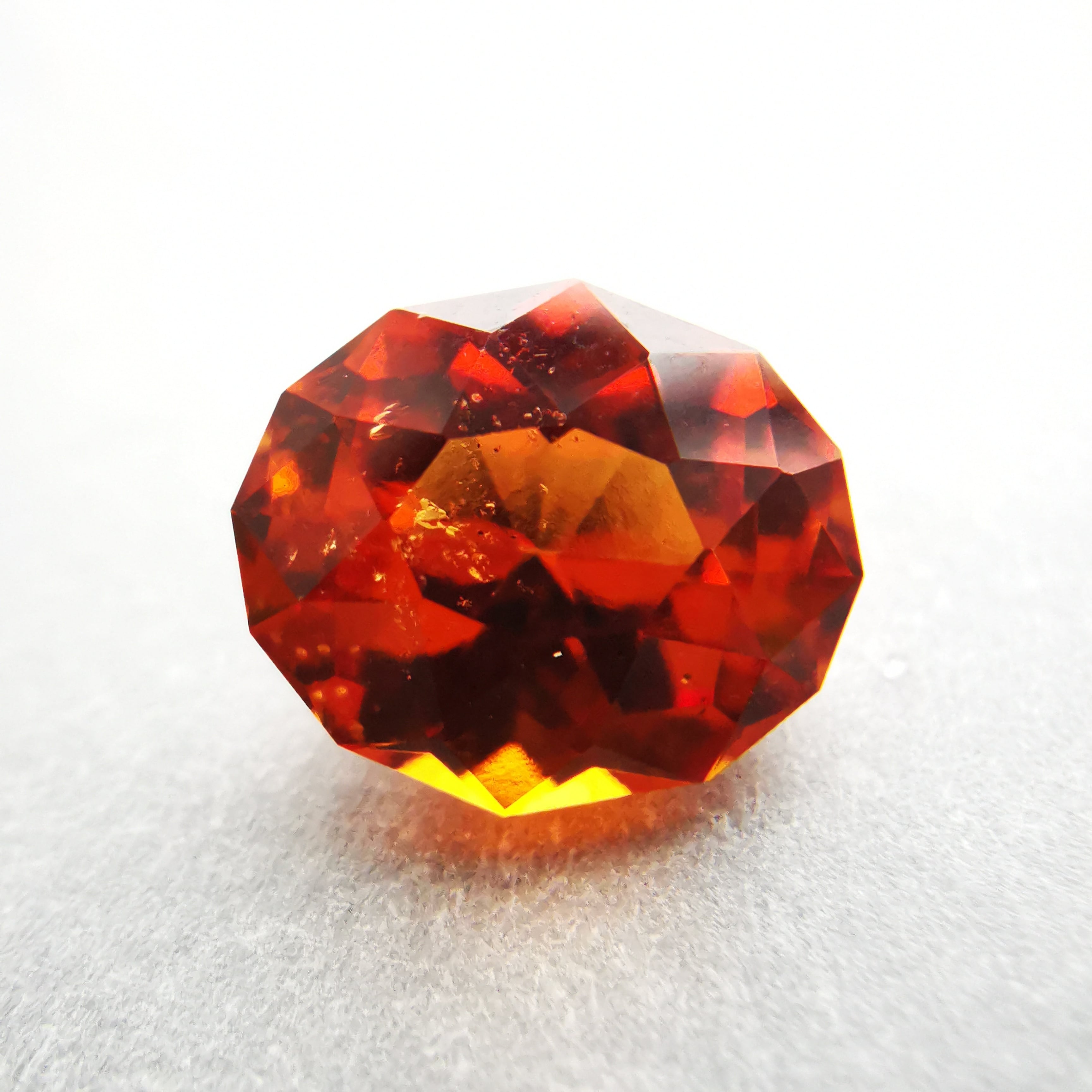 ヘソナイトガーネットと言えば、糖蜜状インクルージョンにより、きらめきは控えめなイメージでしたが、こちらはスペサルティンかと思うような強くきらめくフレッシュカラーです。