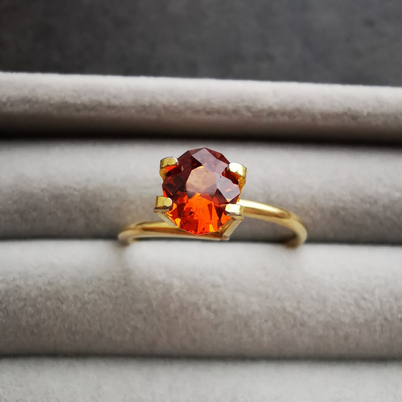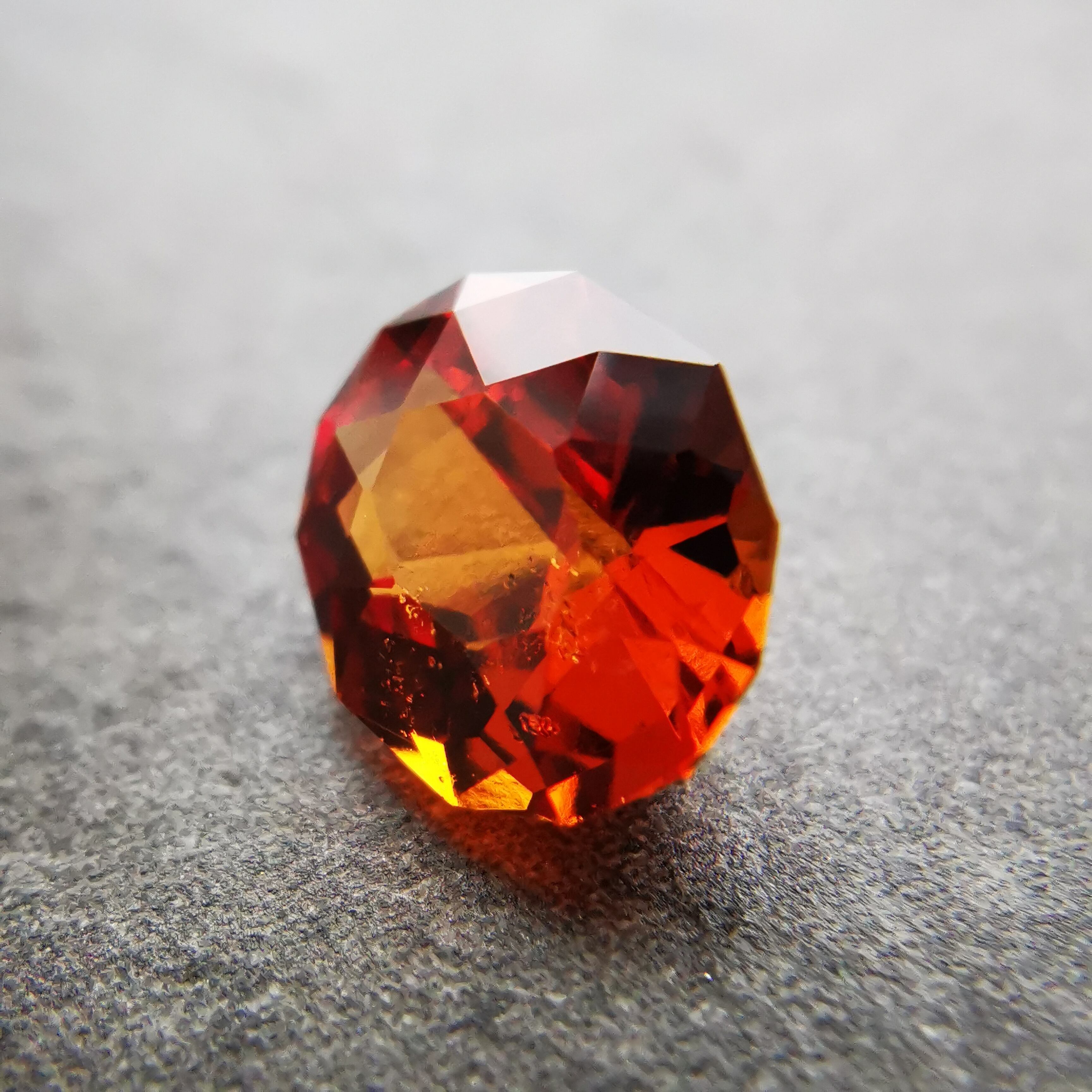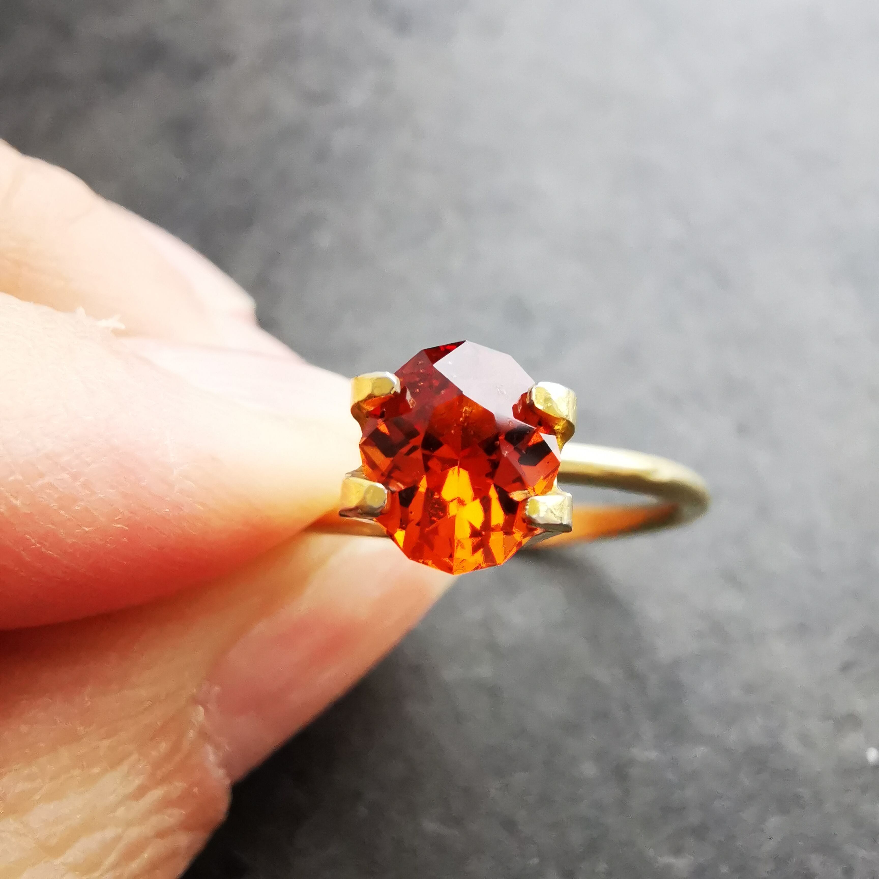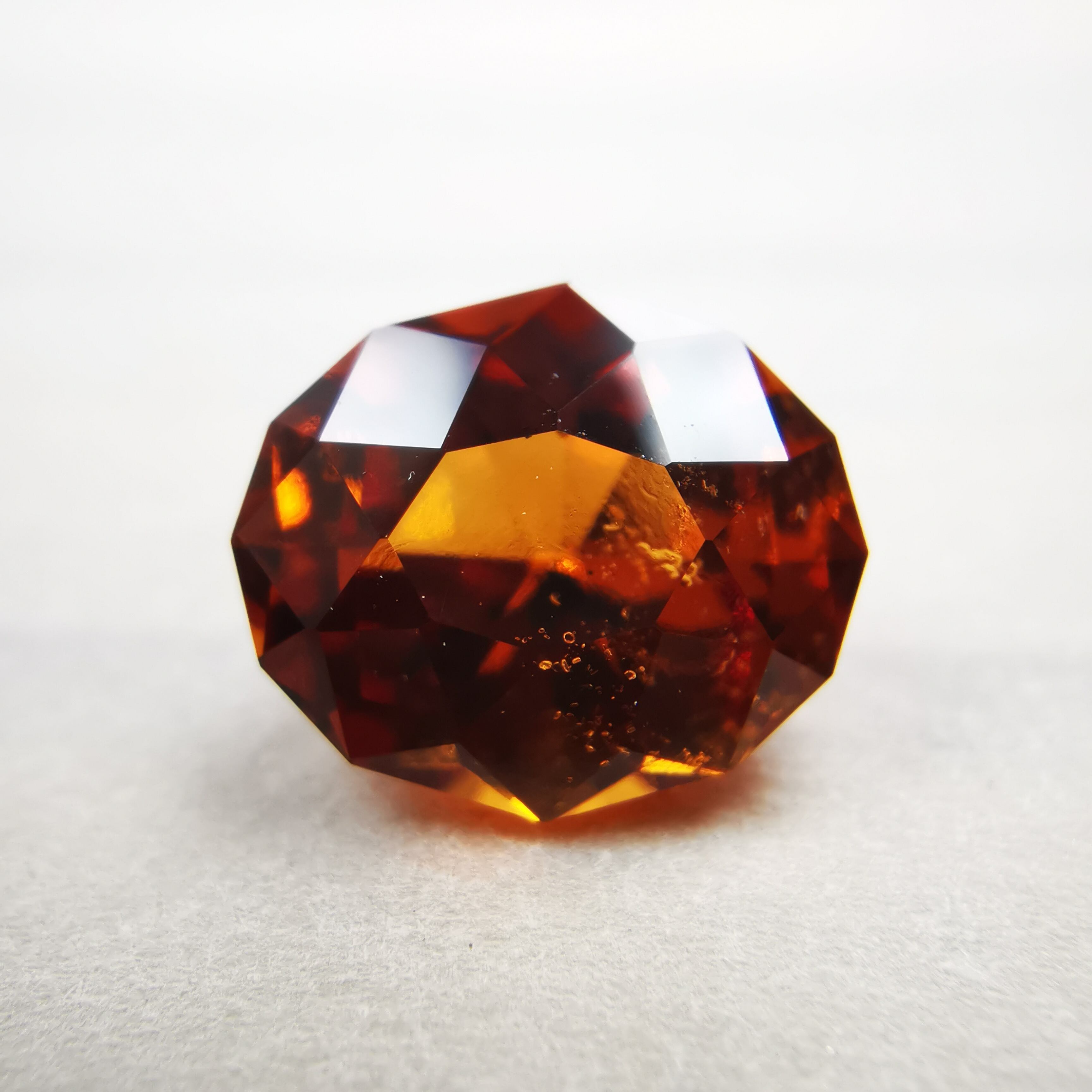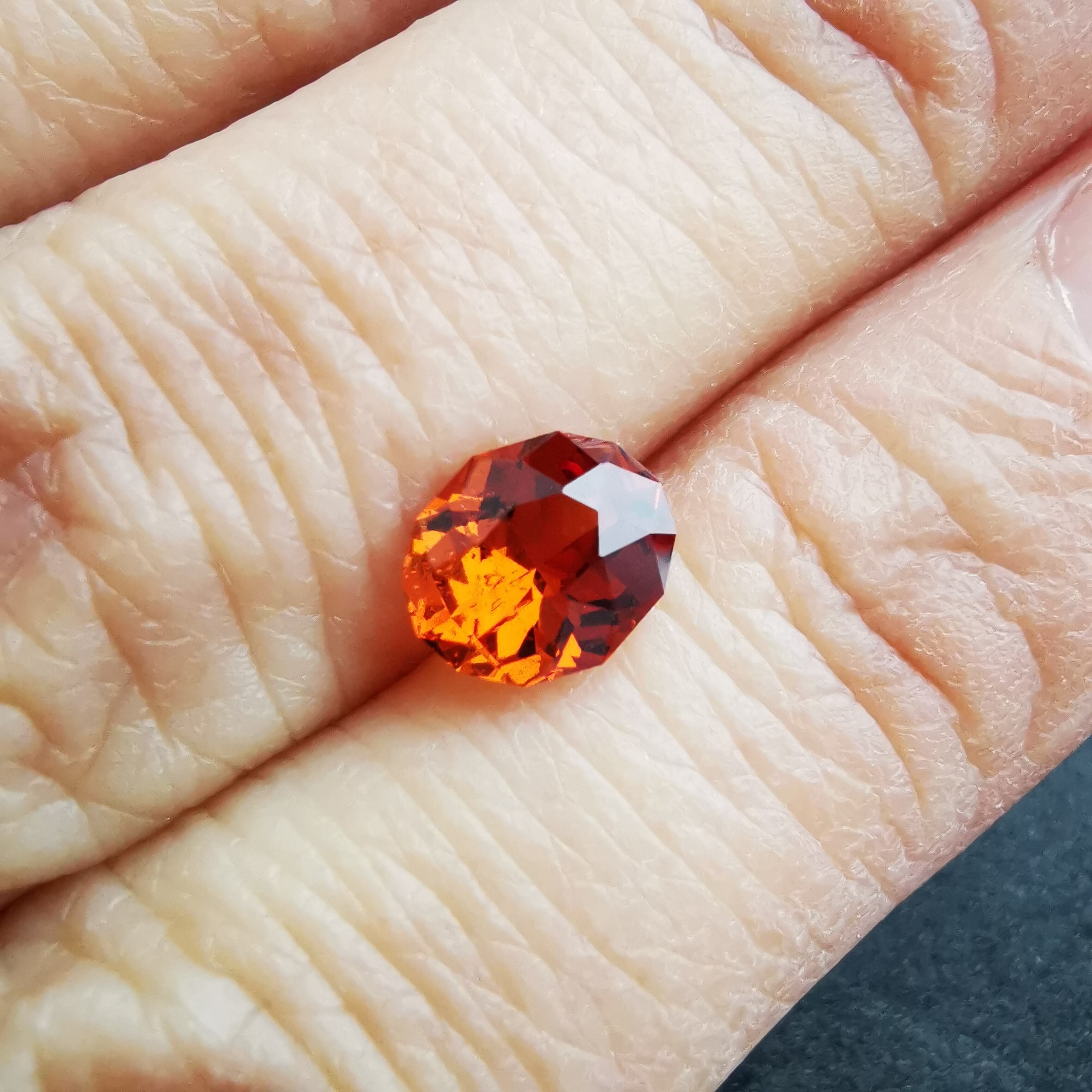 ヘソナイトガーネットと言えば、糖蜜状インクルージョンにより、きらめきは控えめなイメージでしたが、こちらはスペサルティンかと思うような強くきらめくフレッシュカラーです。