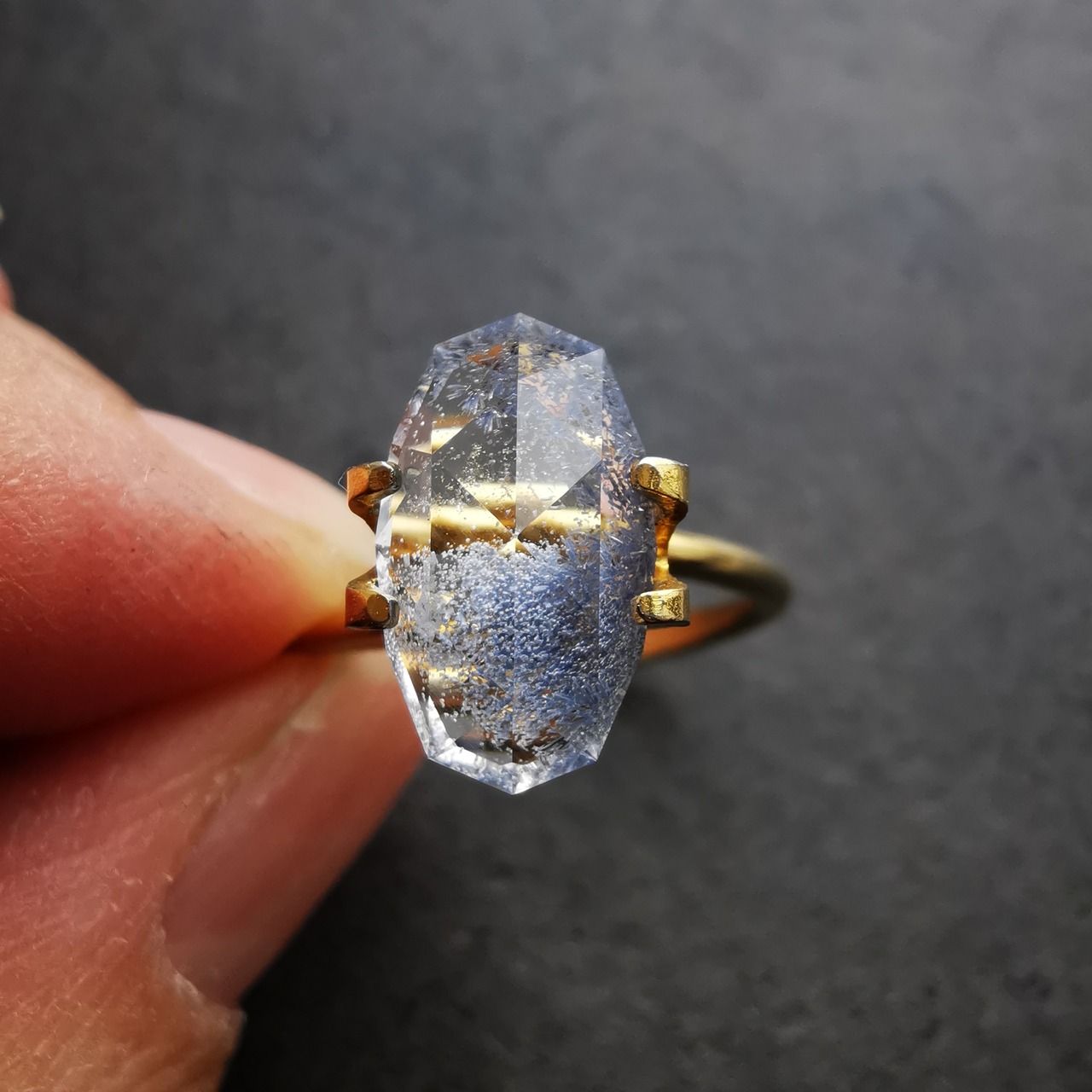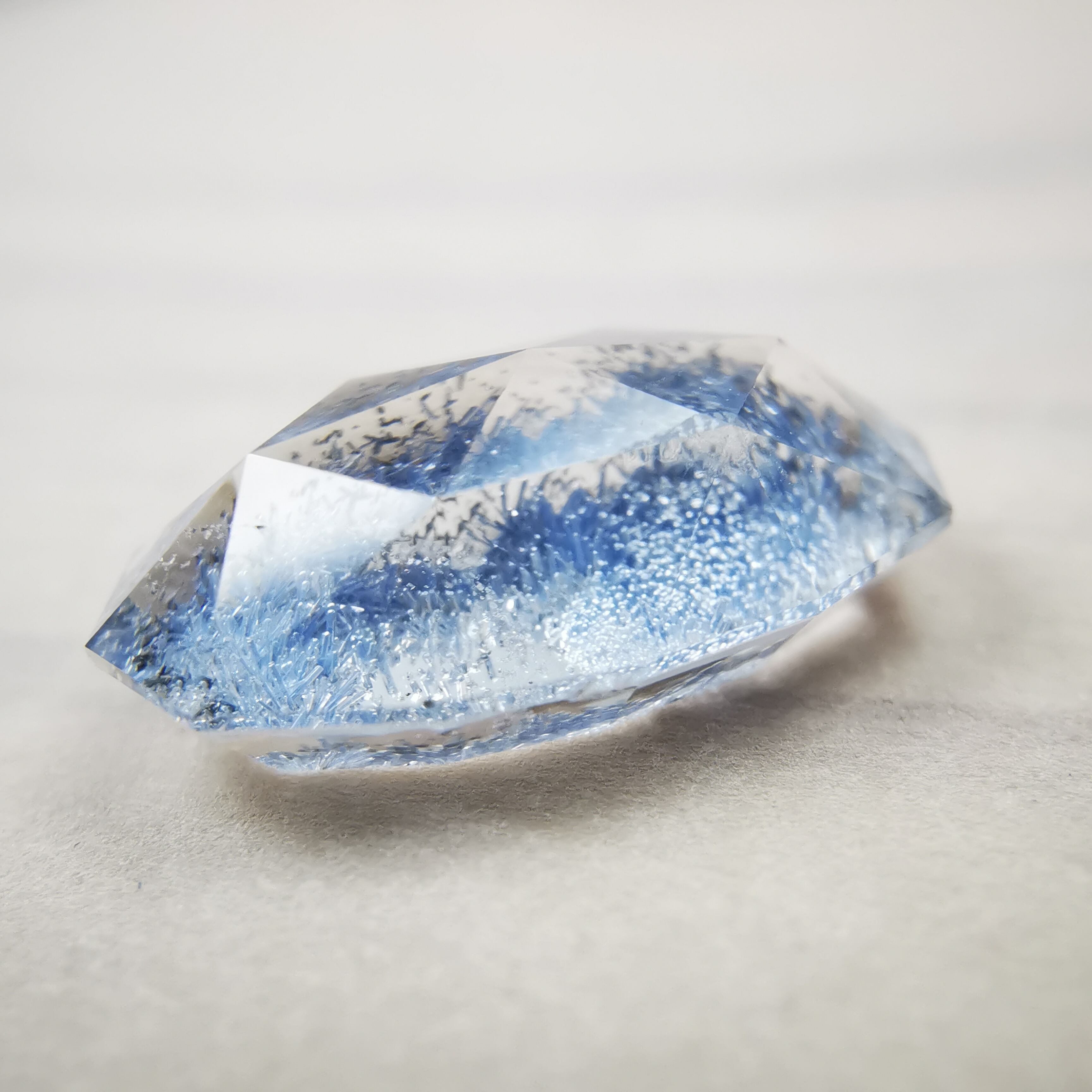 小さな青い花の絨毯が風に大きく煽られ、花々が空に巻き上がる瞬間を、クォーツのドームに閉じ込めたような景色です。