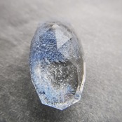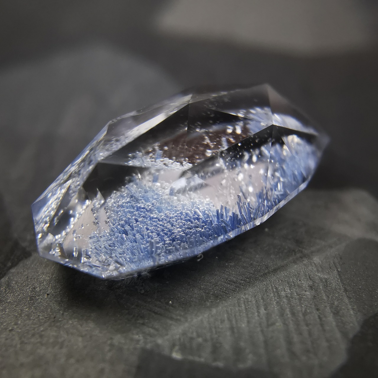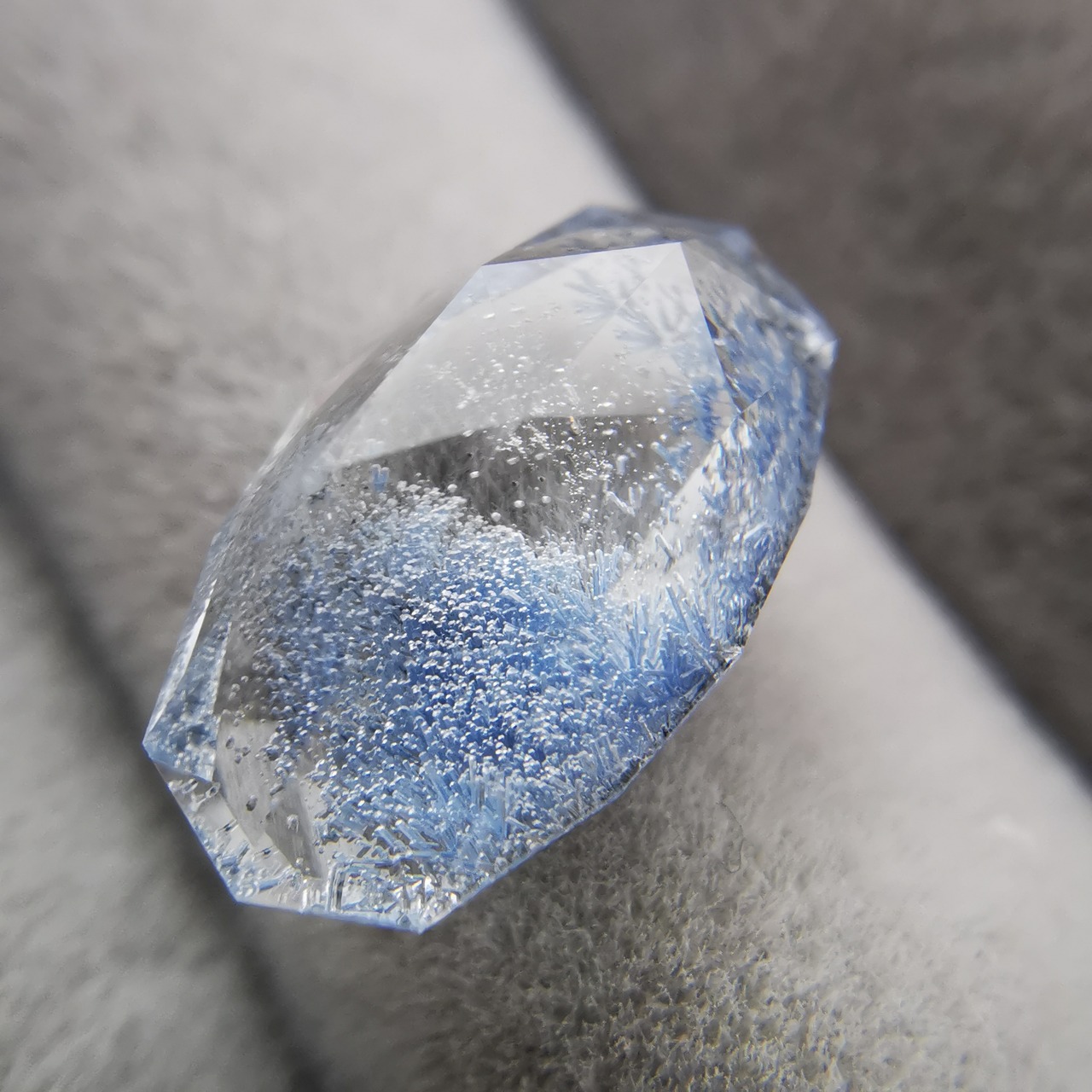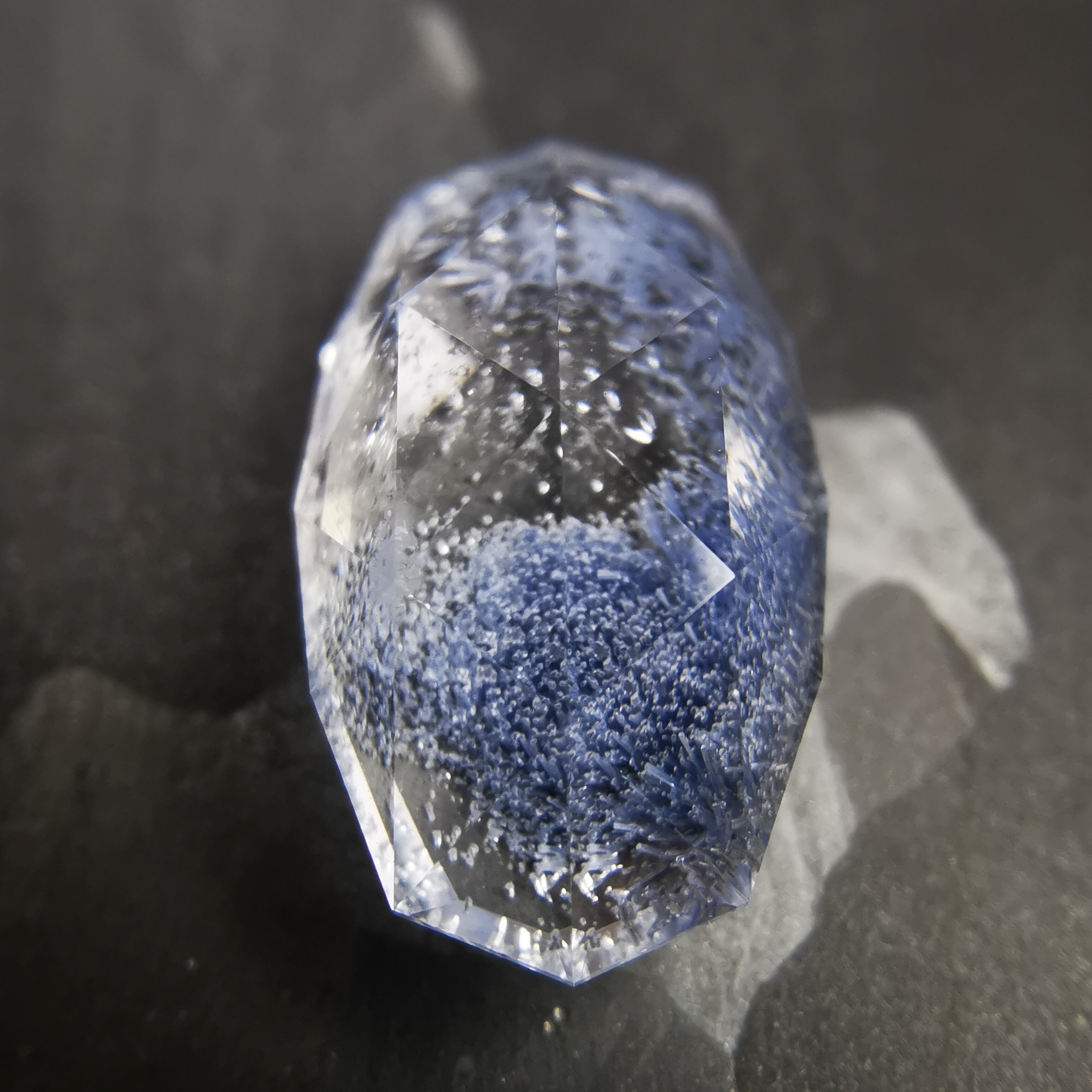 透明度の高いクォーツに、くすんだブルー/ヒヤシンス色のデュモルチェライトの結晶が点在しています。