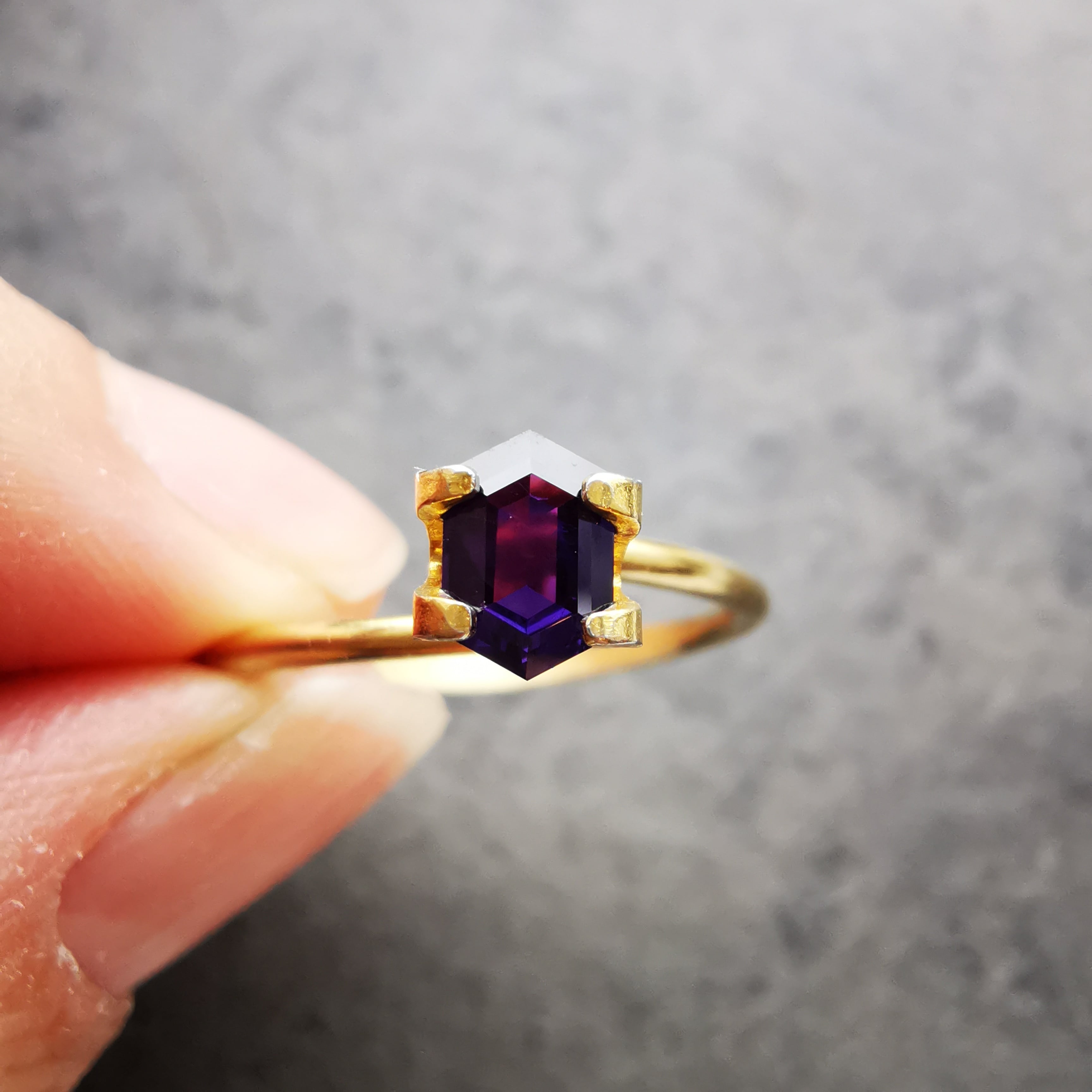 正面からは、ほぼ黒に近い石の端の方にギラリとバイオレットが覗きます。