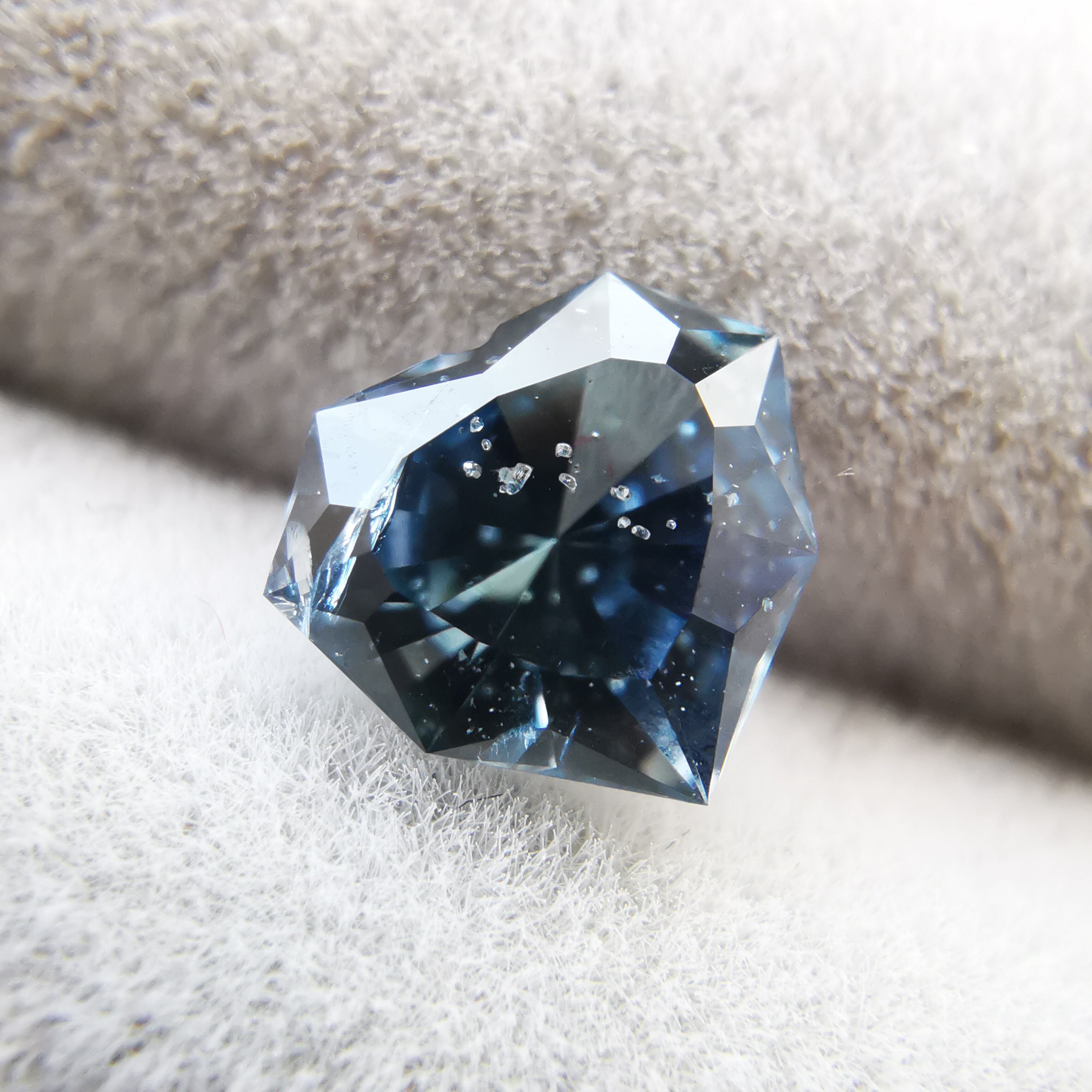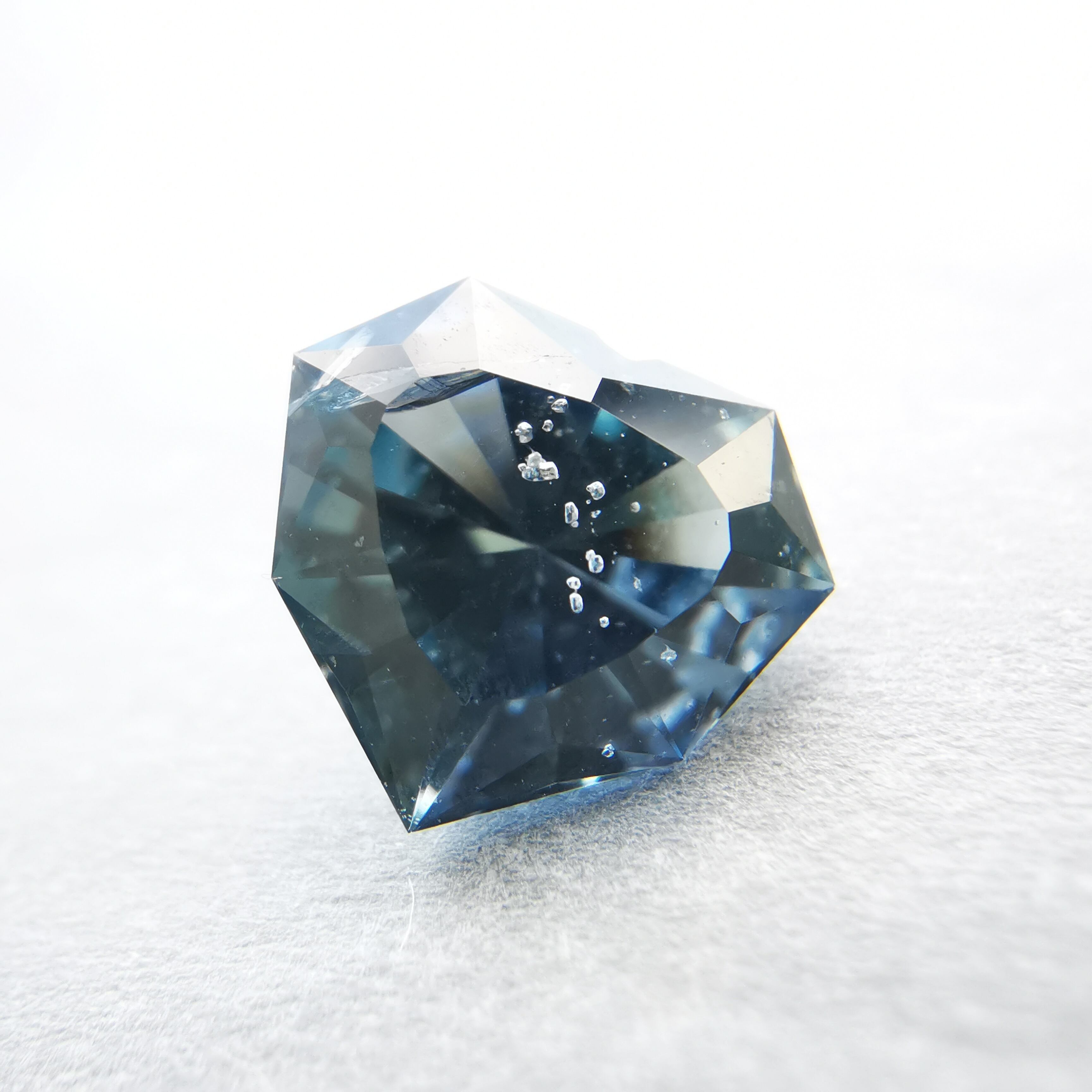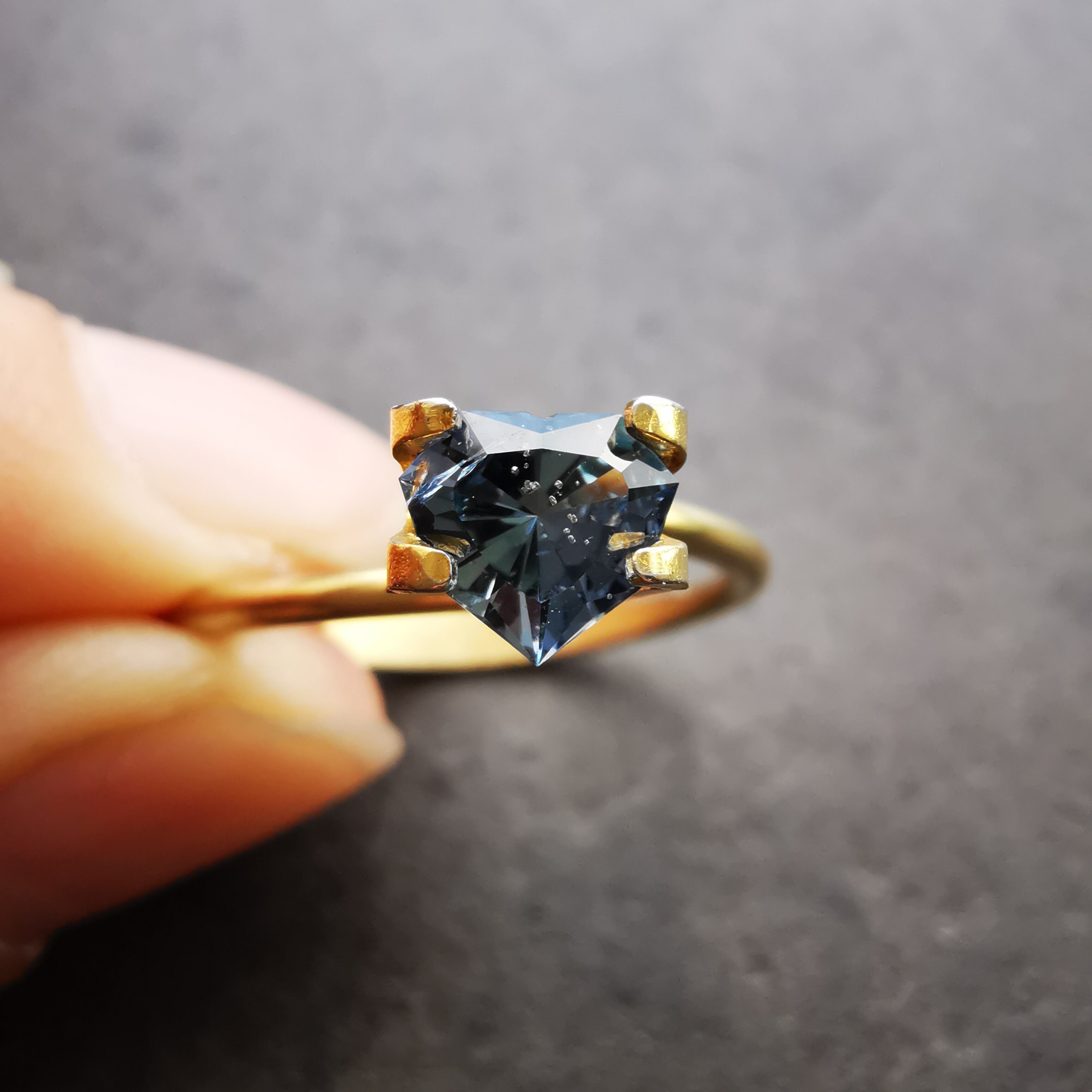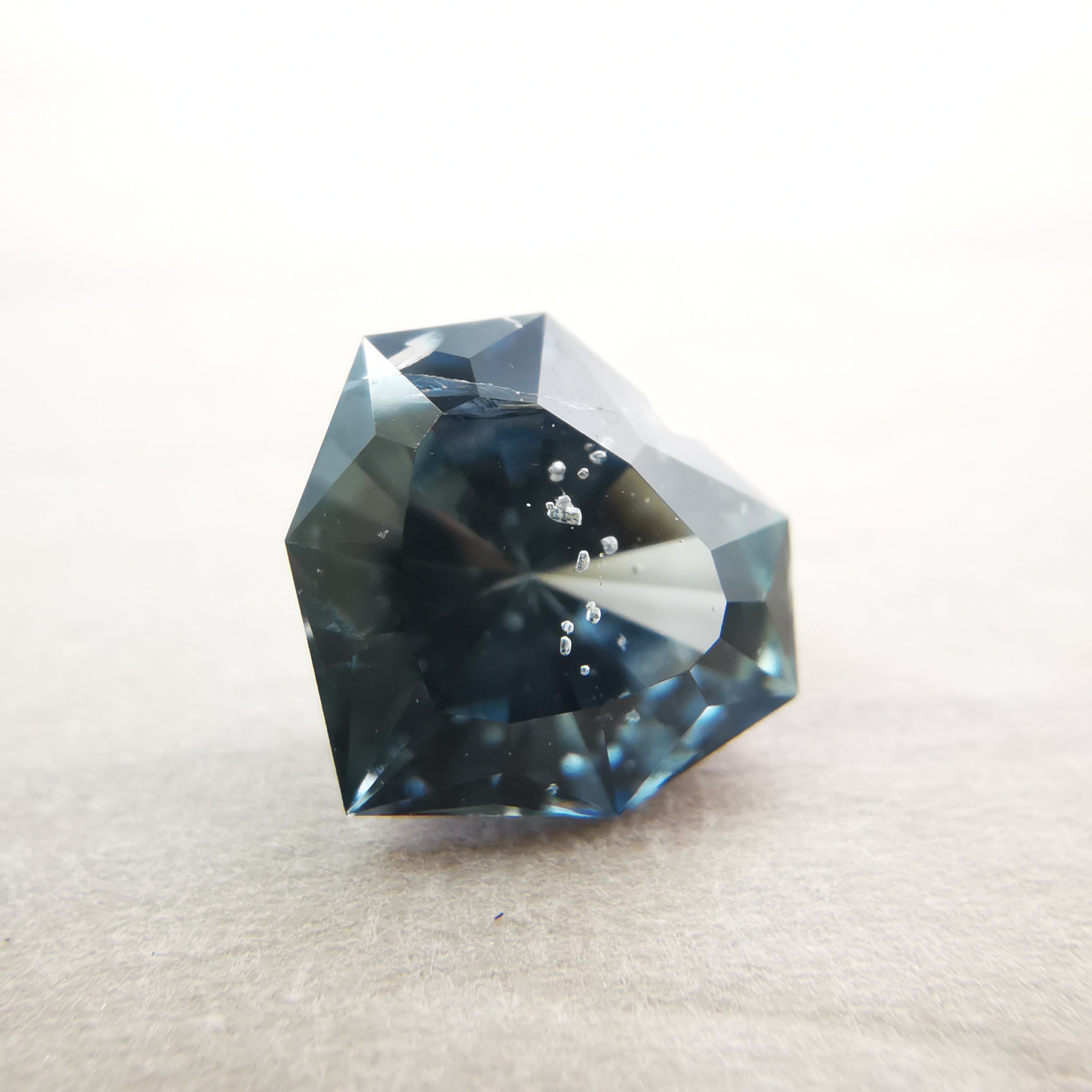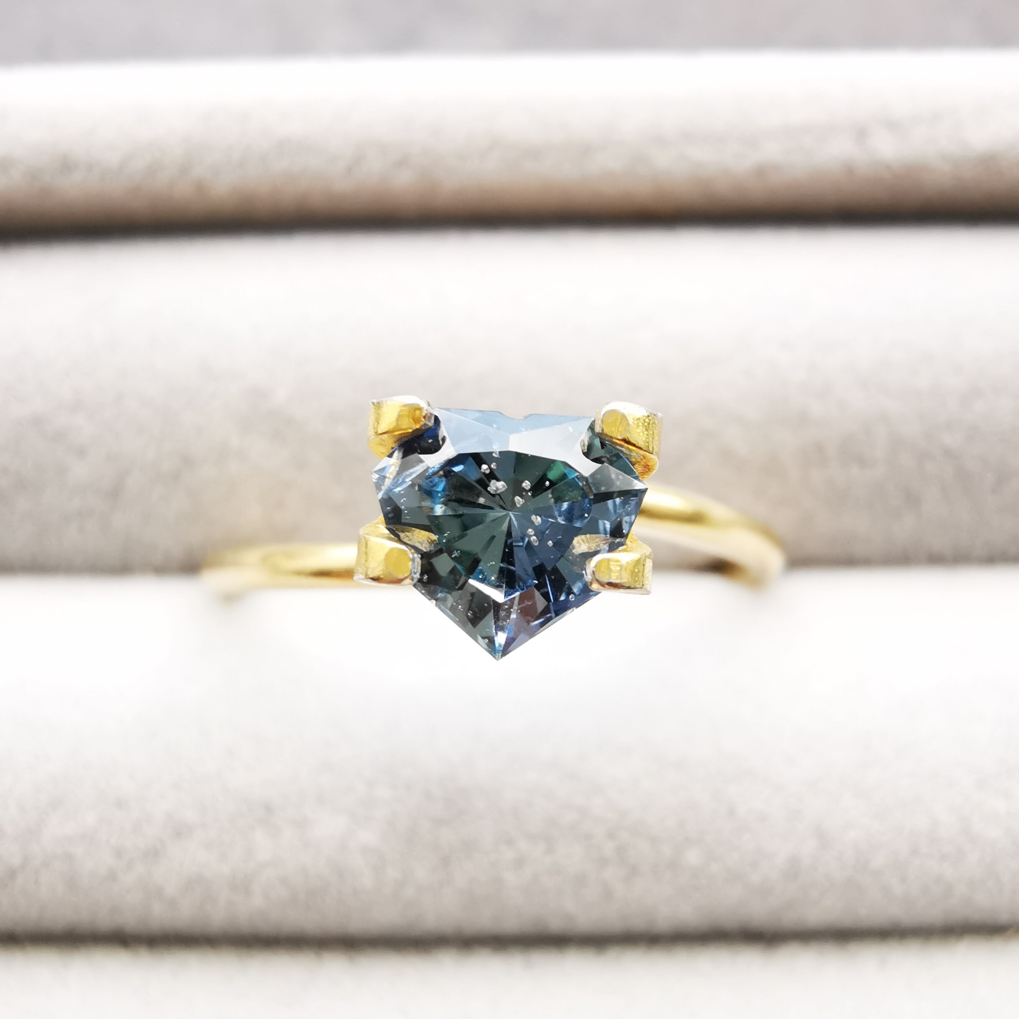 暗く澄んだグレーの石の中から、ブルーグレーのきらめきが鋭く光るサファイアです。