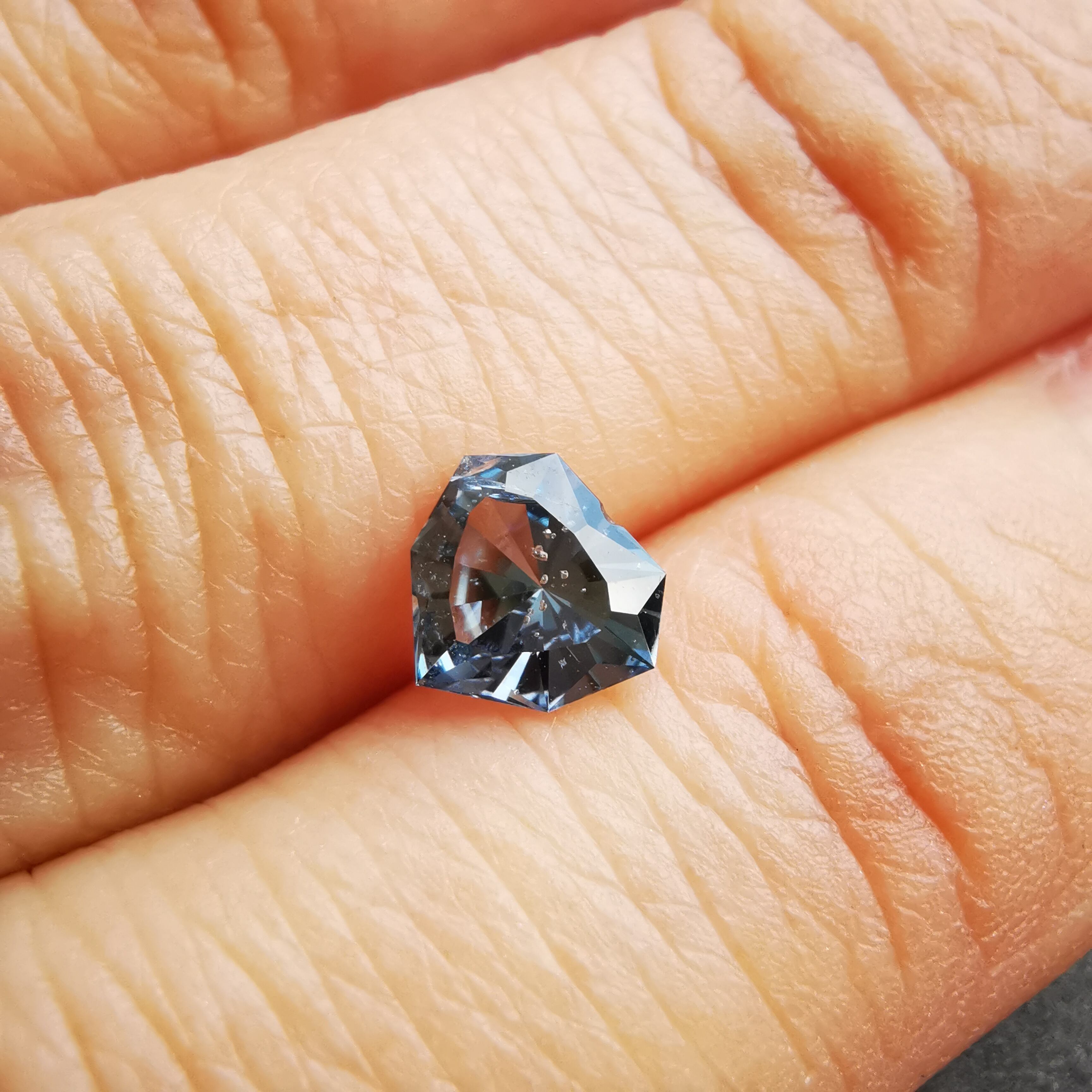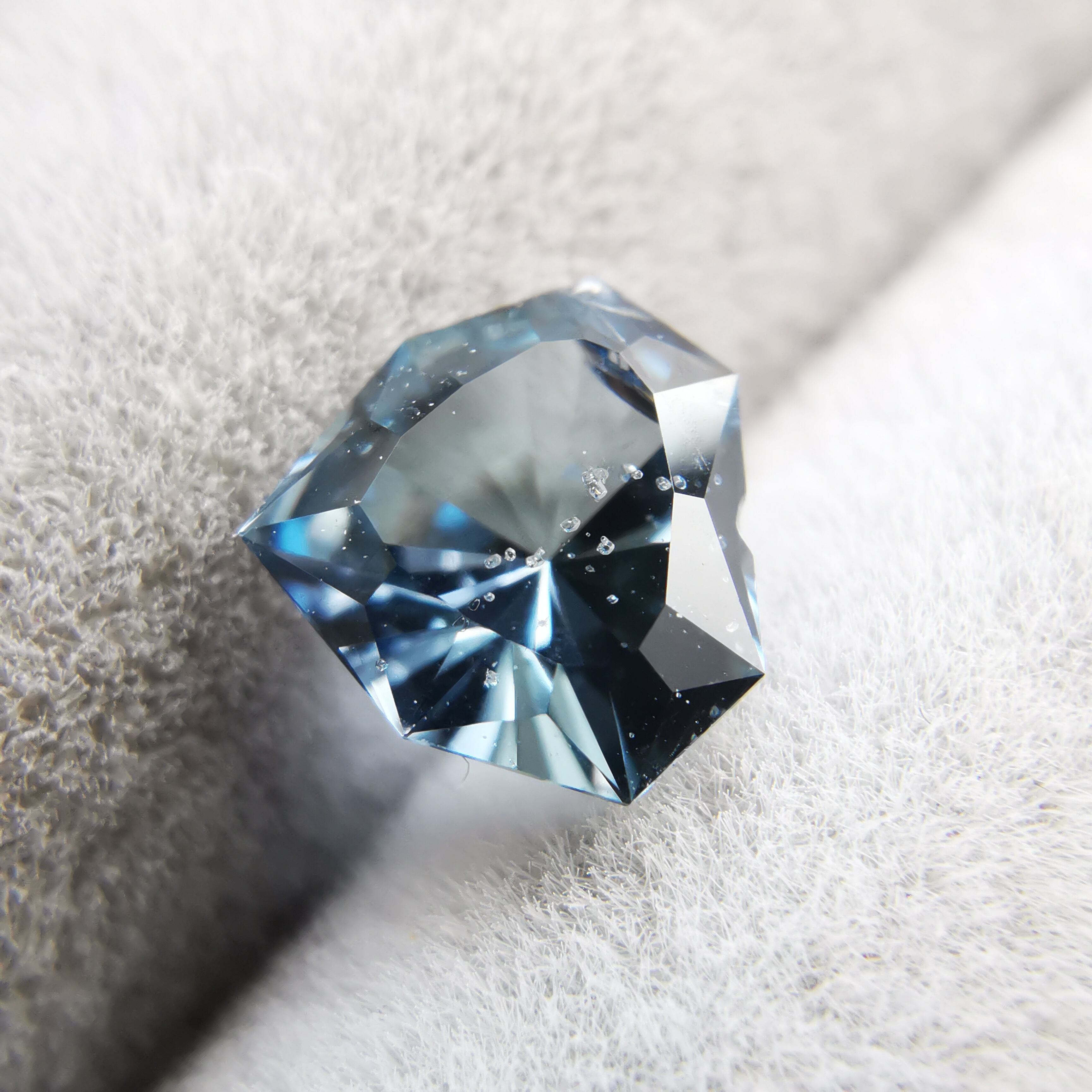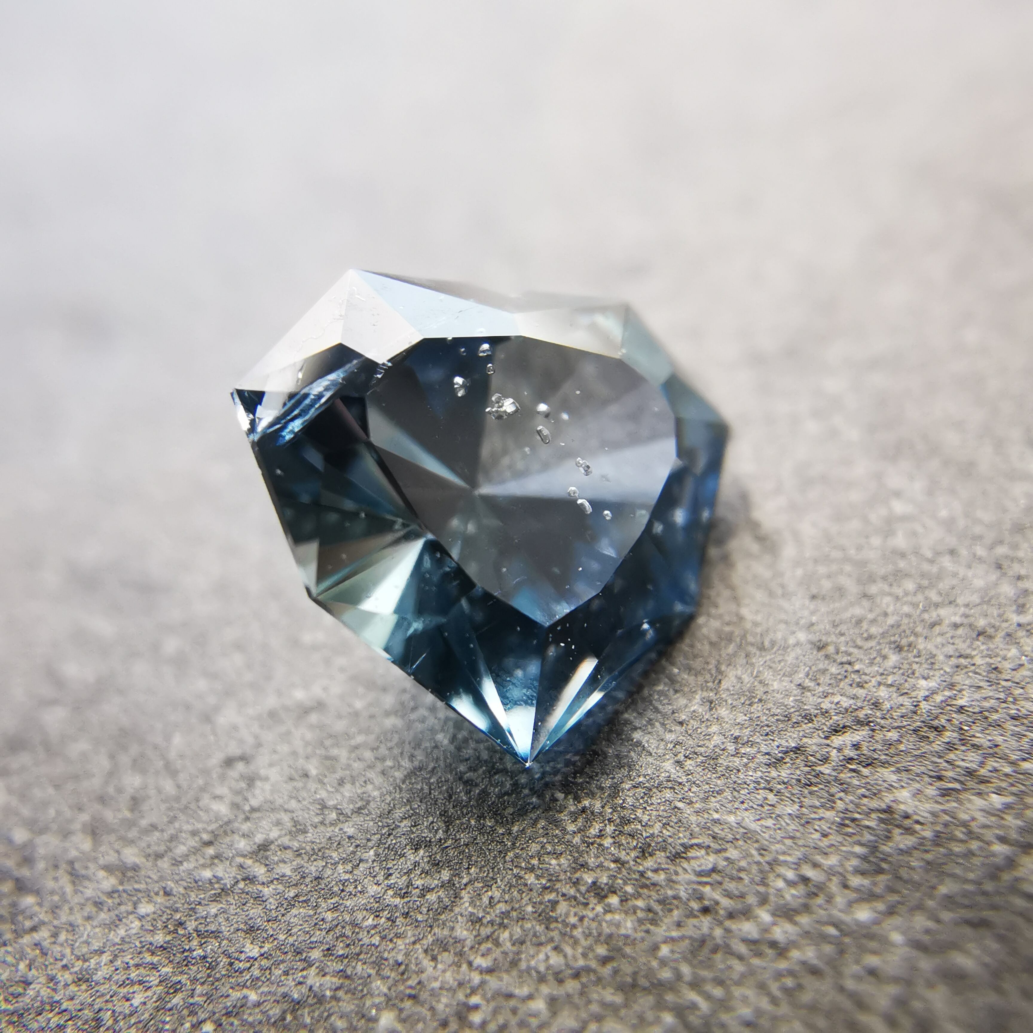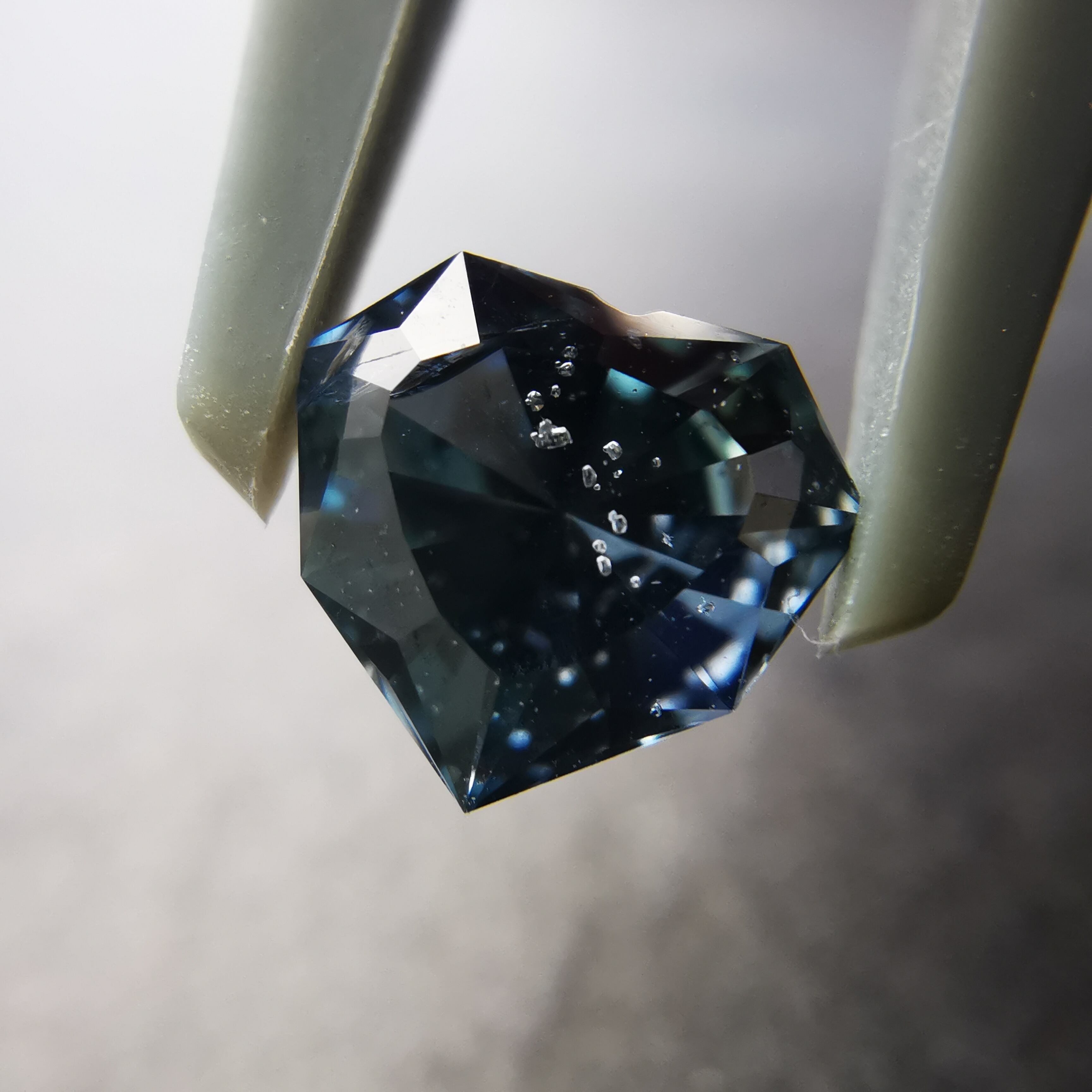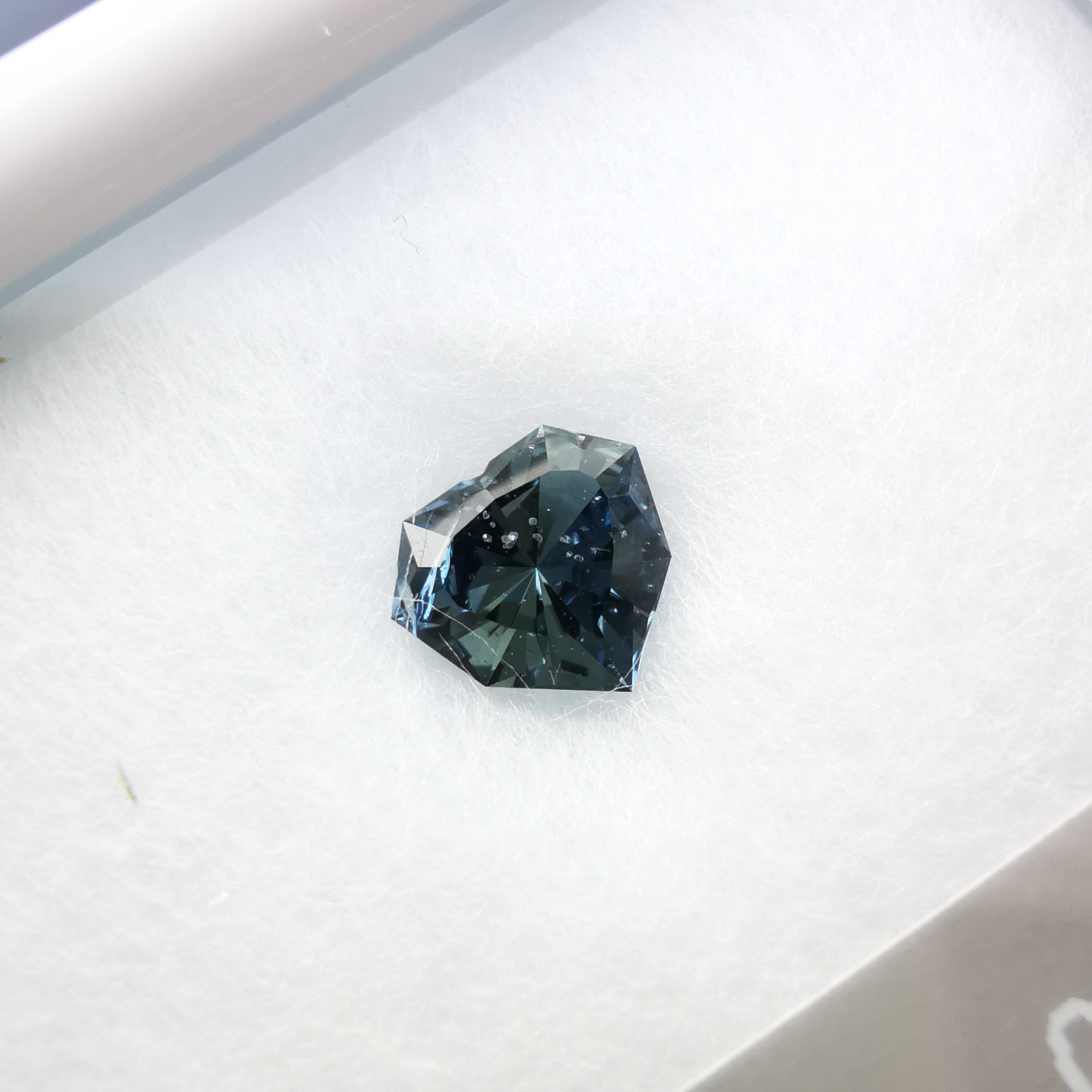 暗く澄んだグレーの石の中から、ブルーグレーのきらめきが鋭く光るサファイアです。