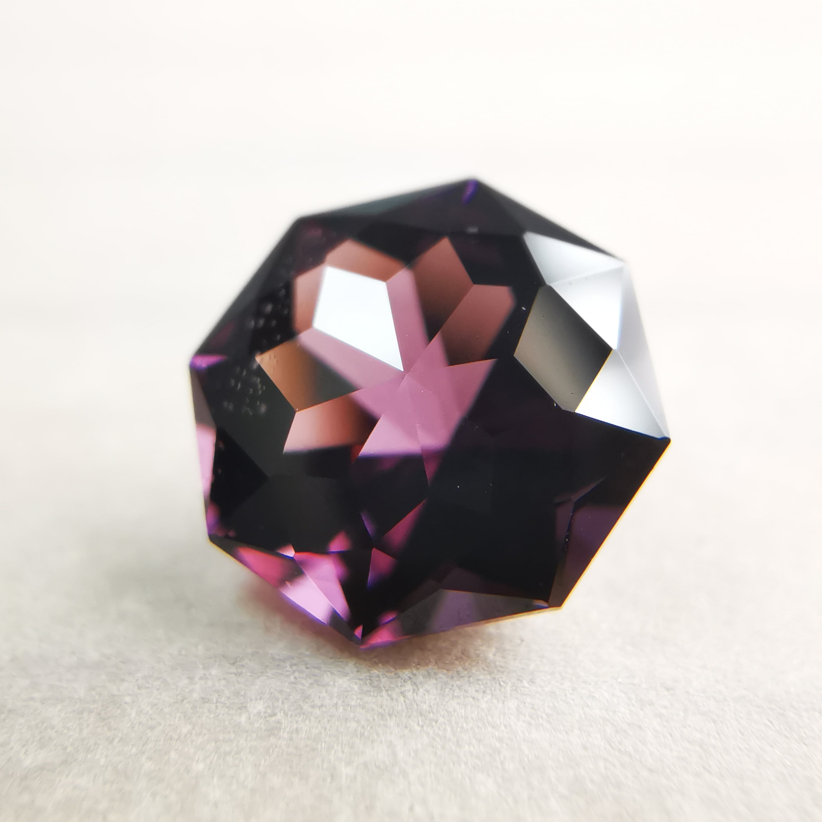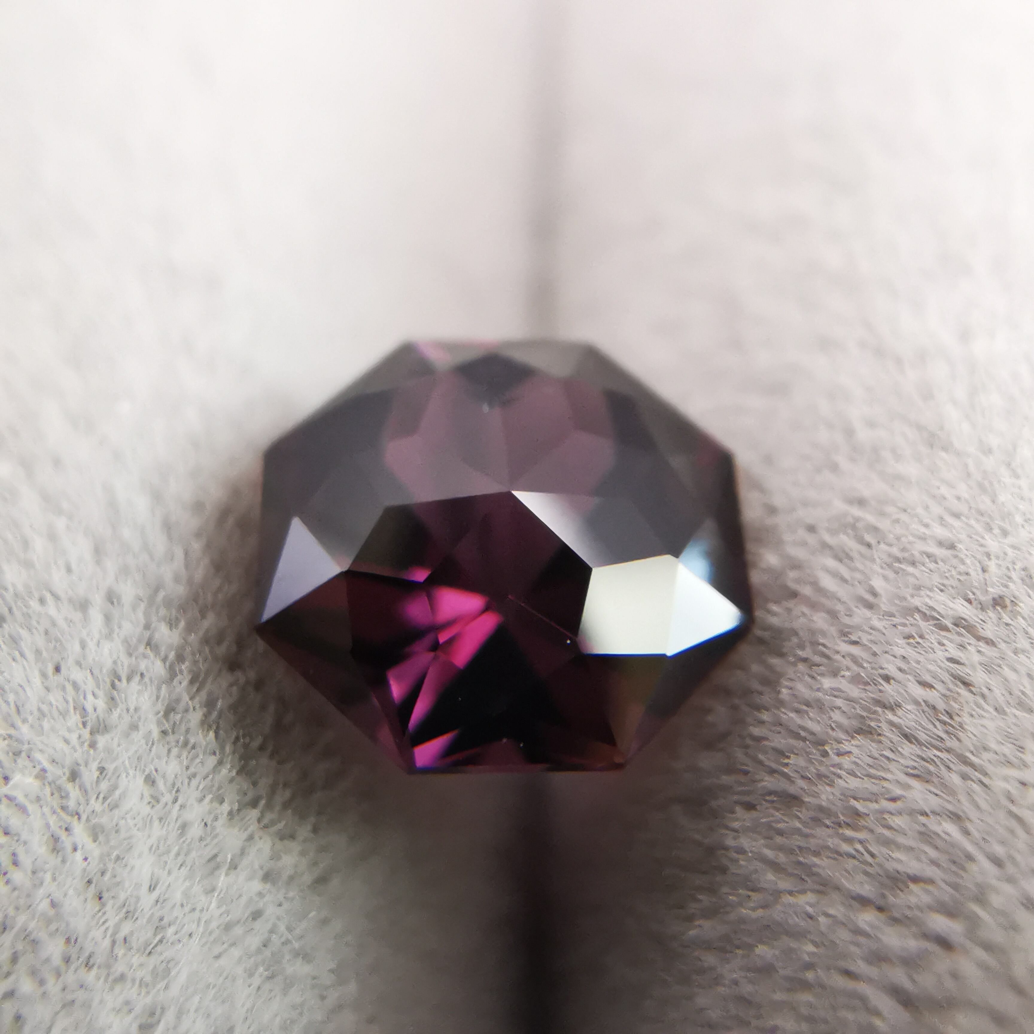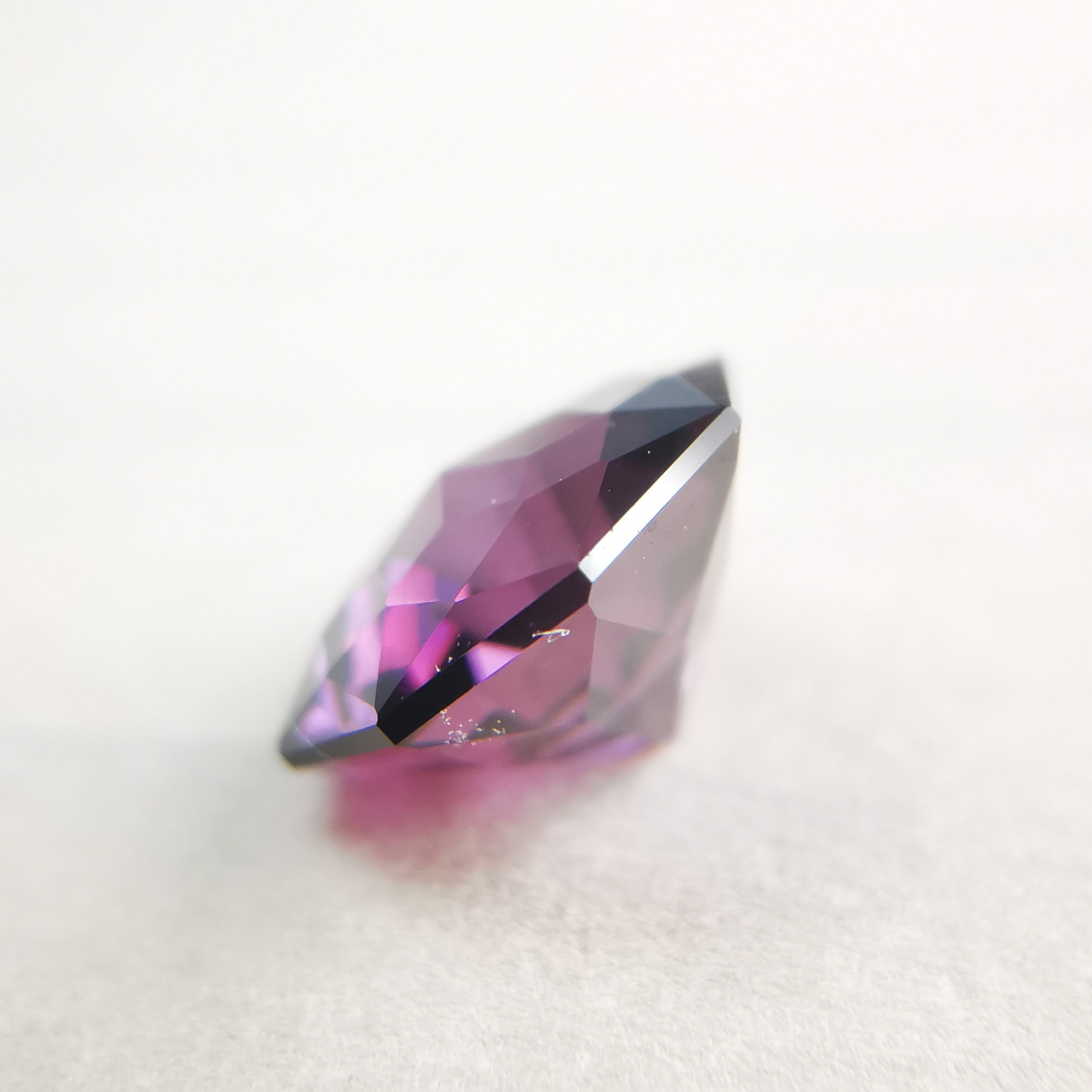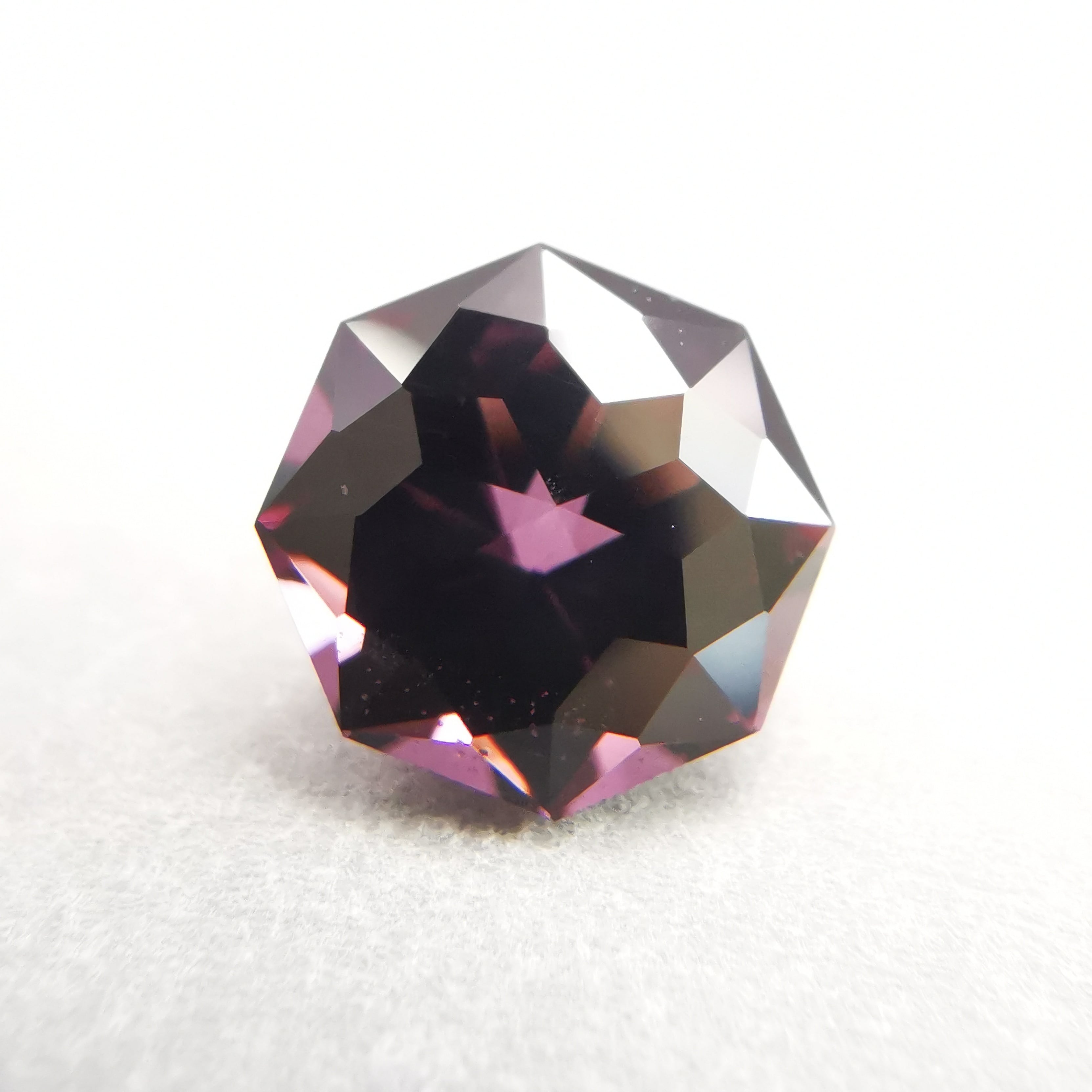 ごく暗いパープルピンク/バーガンディーカラーから、ローズピンクがきらめくスピネルです。