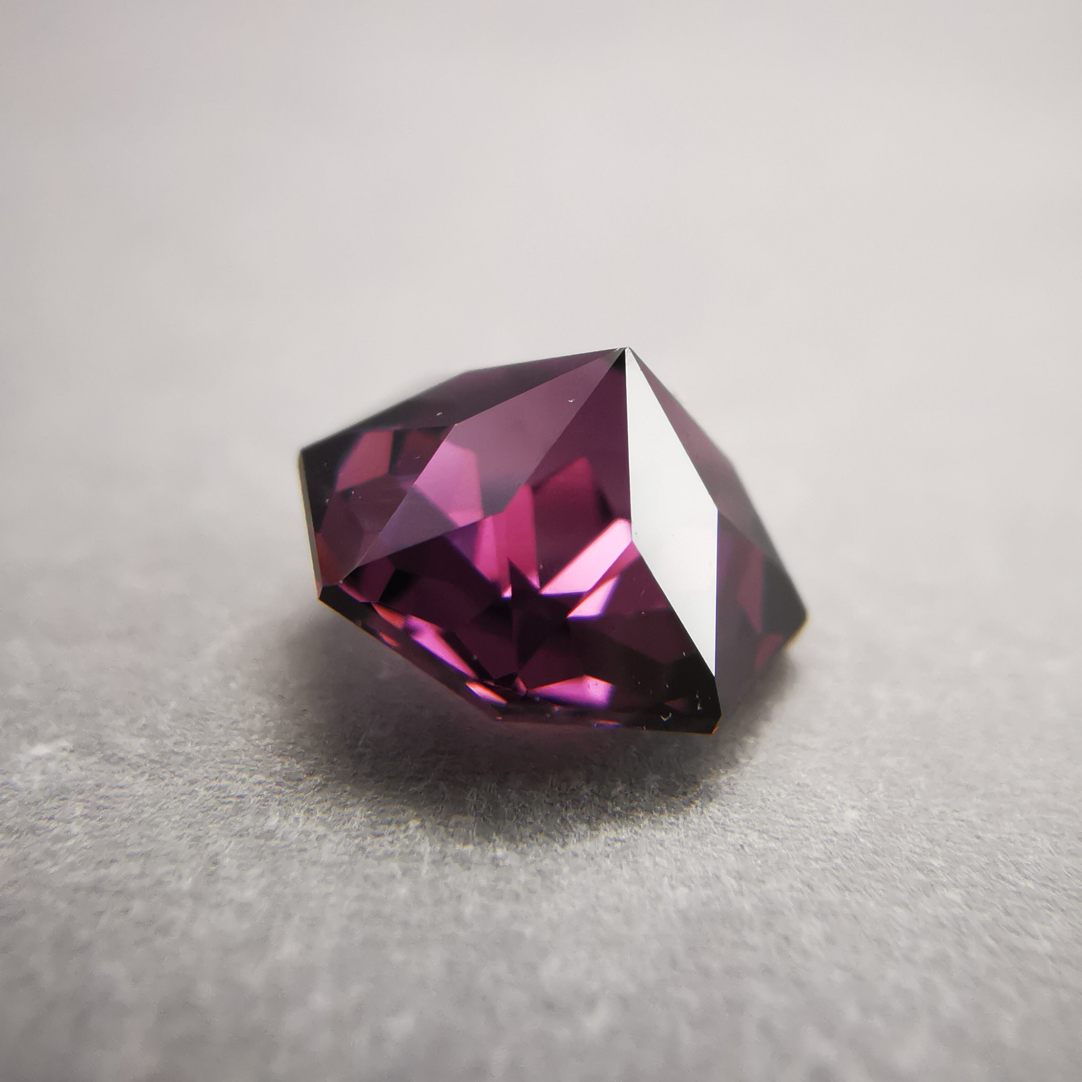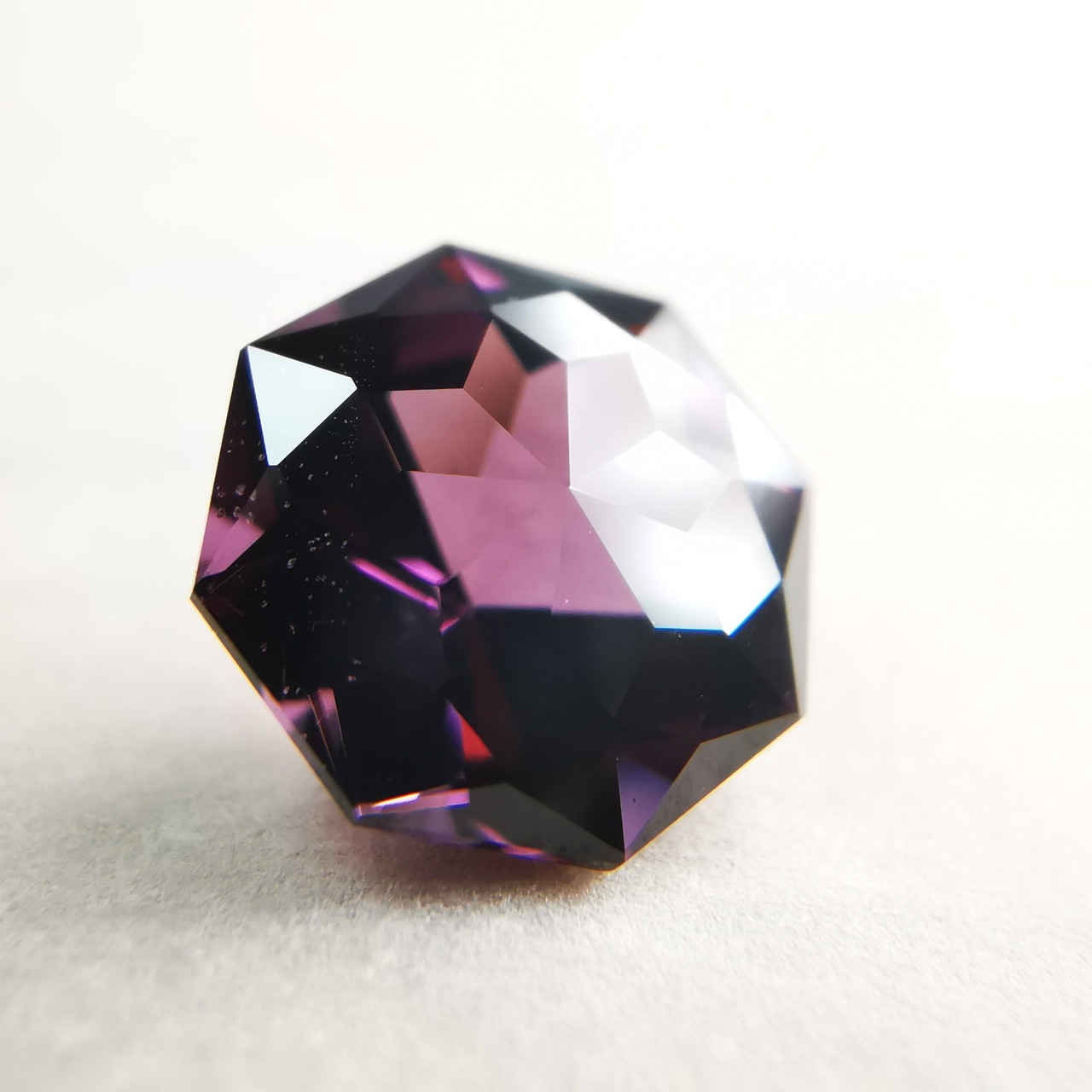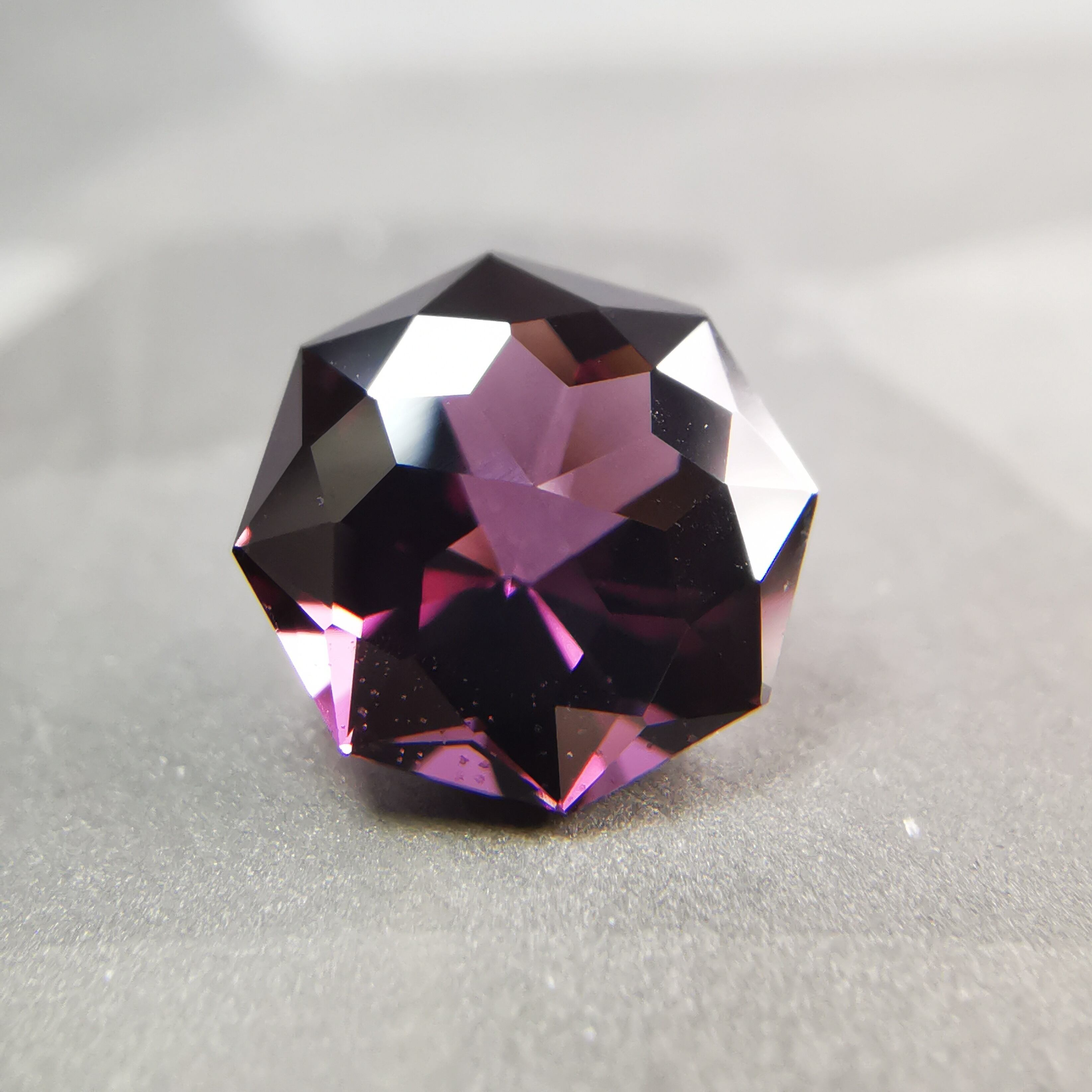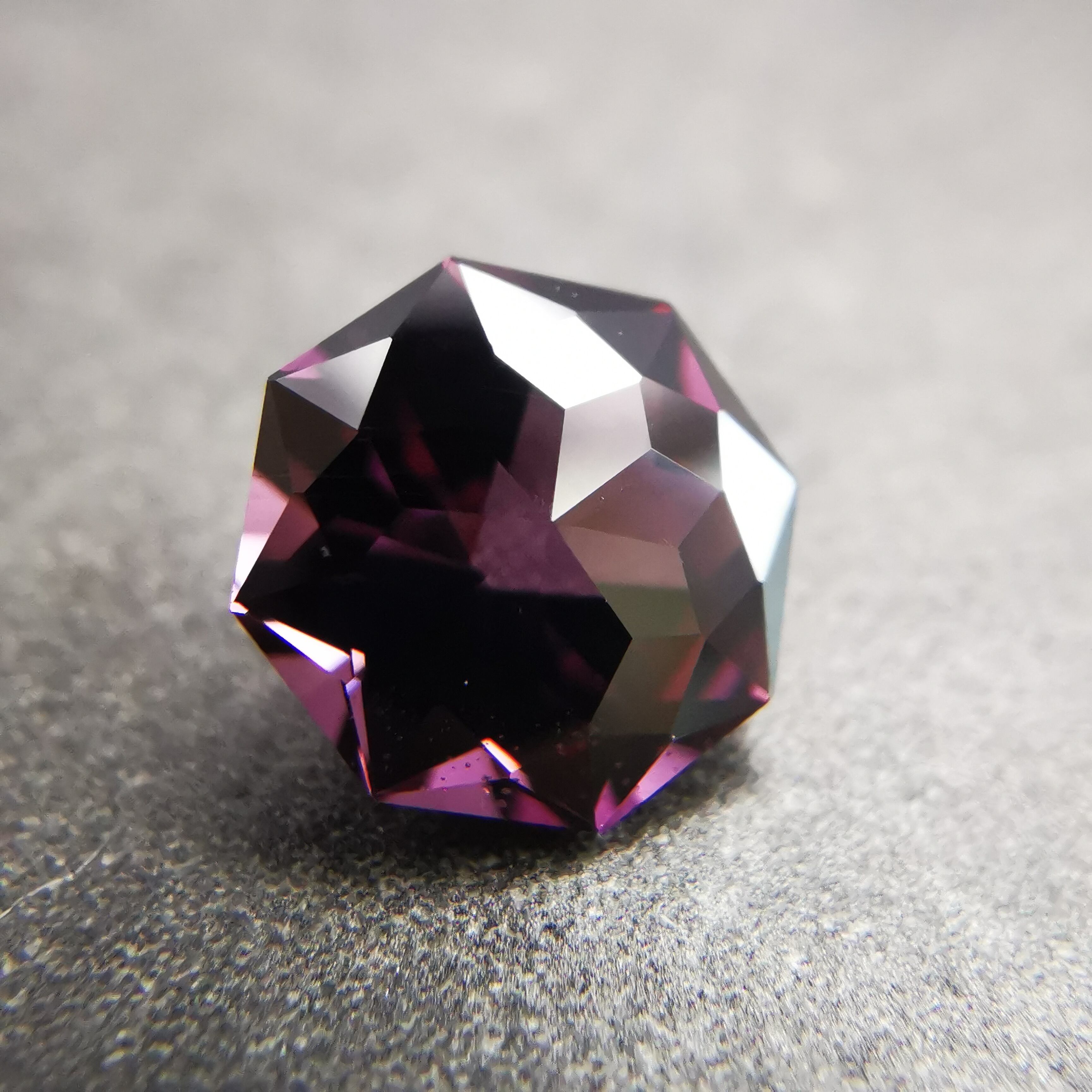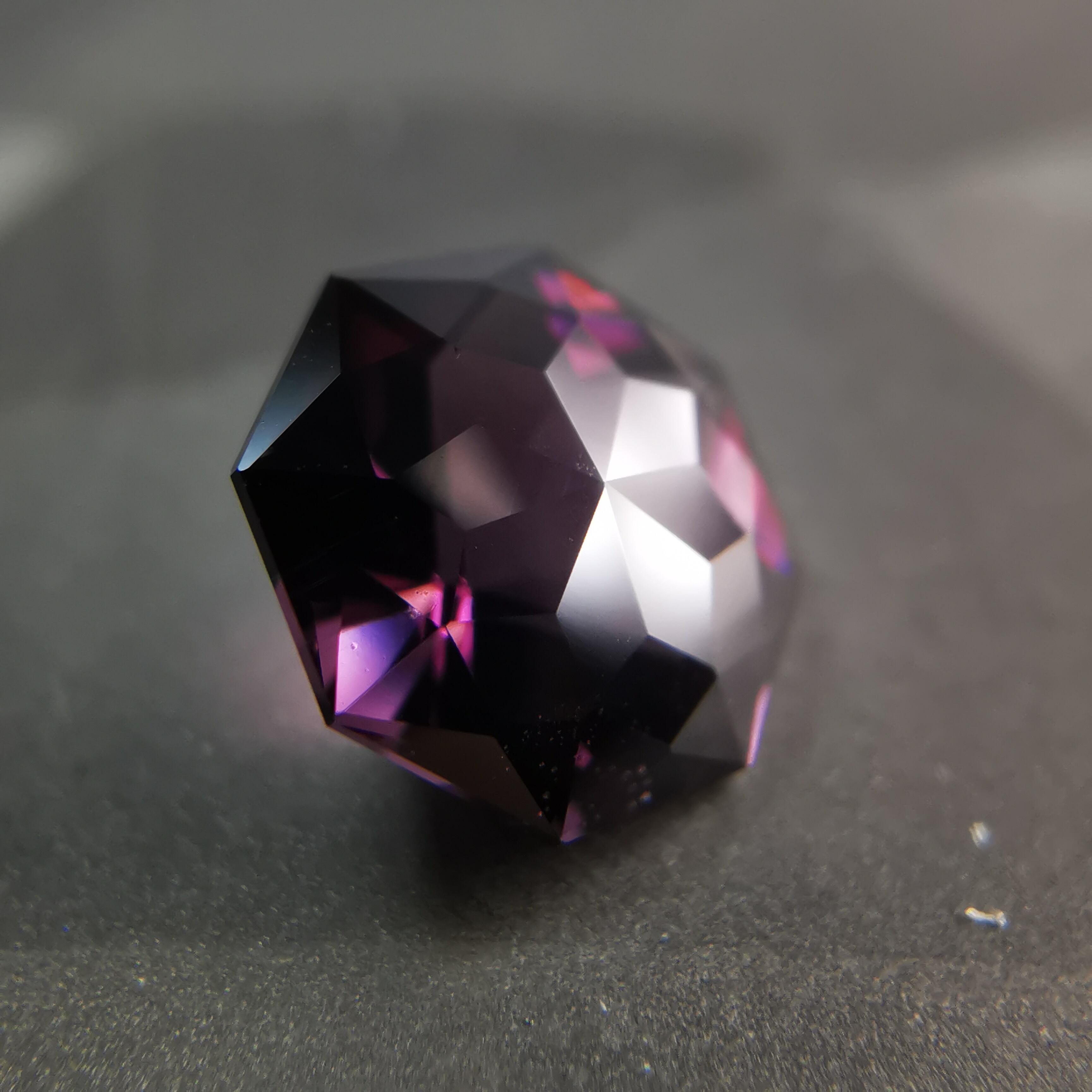 ごく暗いパープルピンク/バーガンディーカラーから、ローズピンクがきらめくスピネルです。