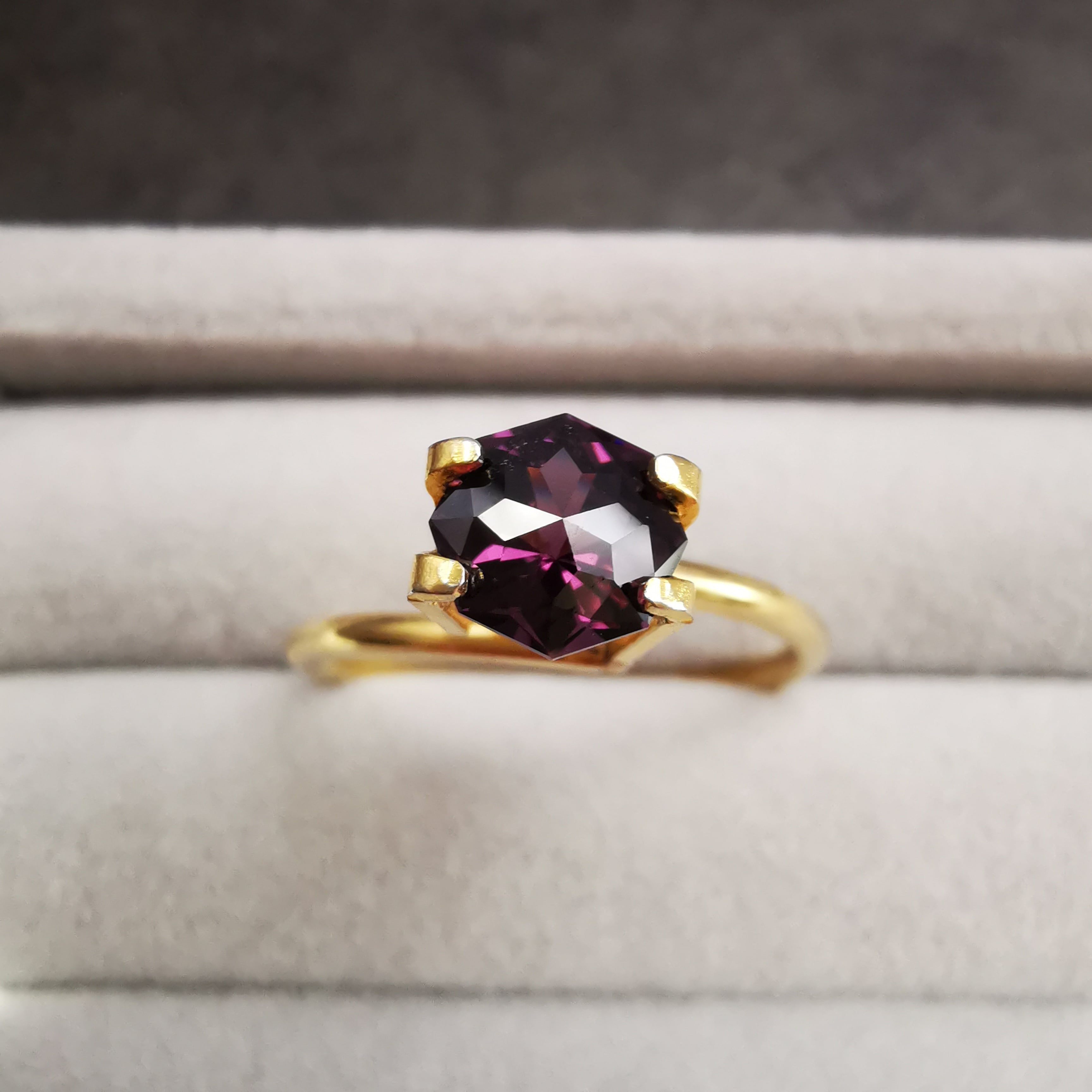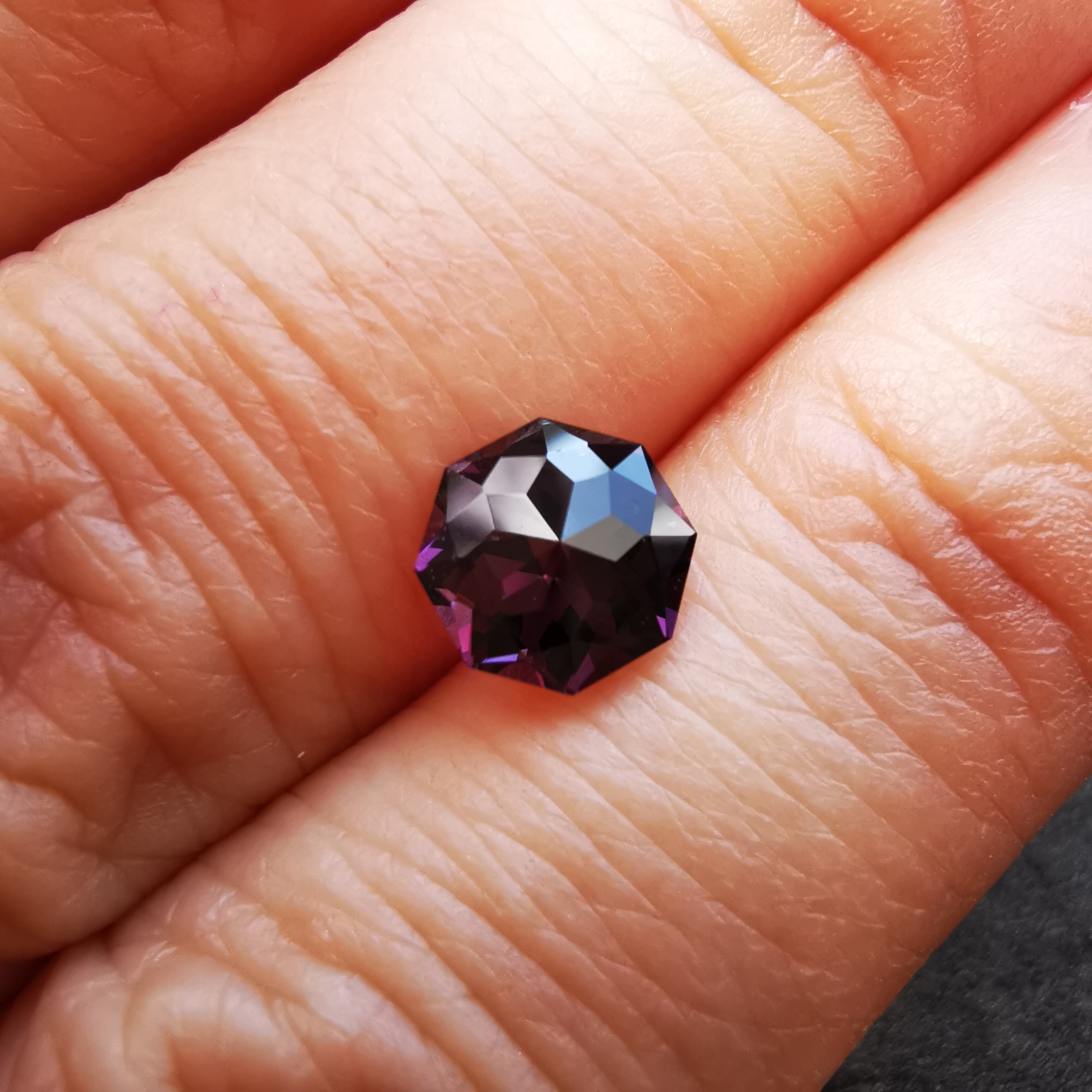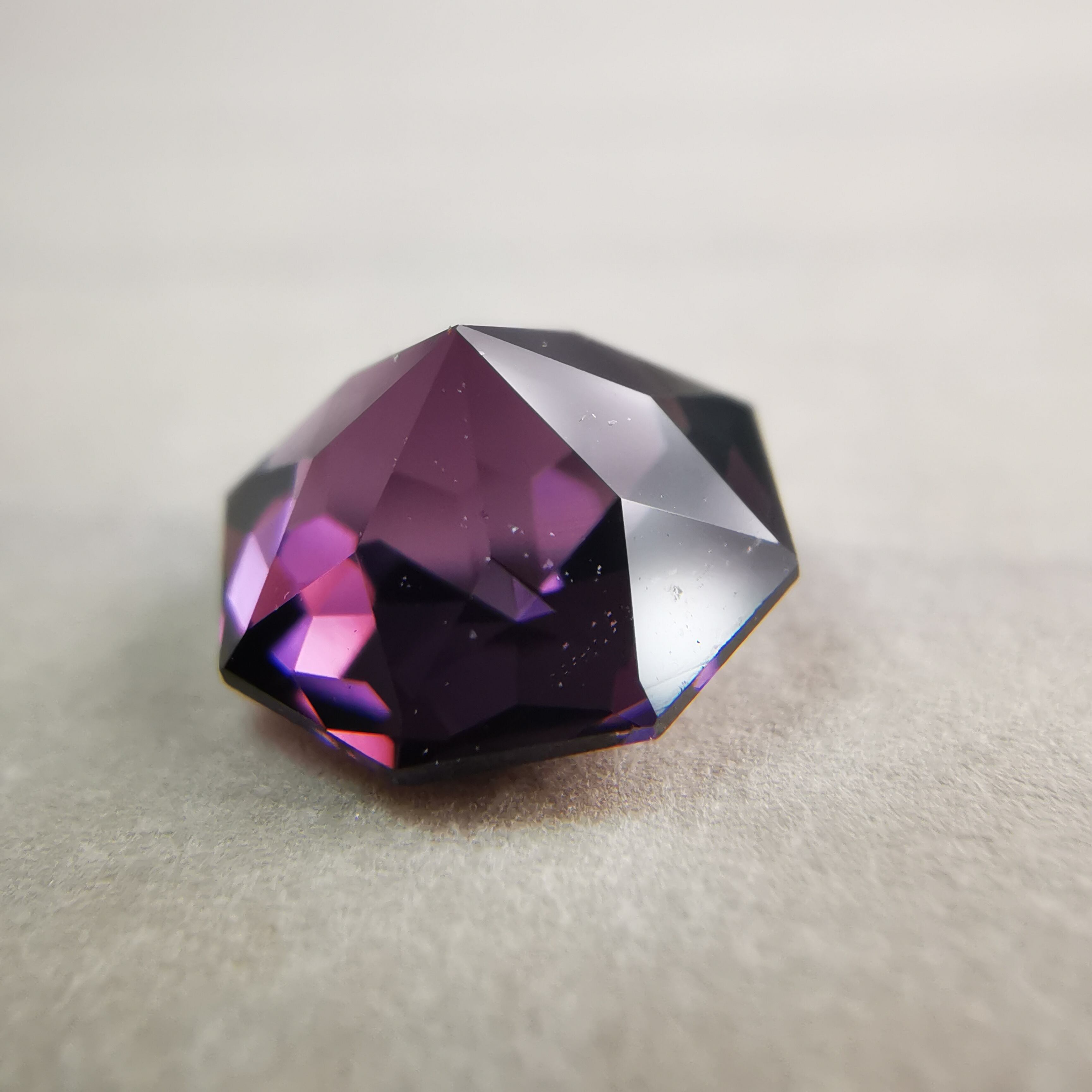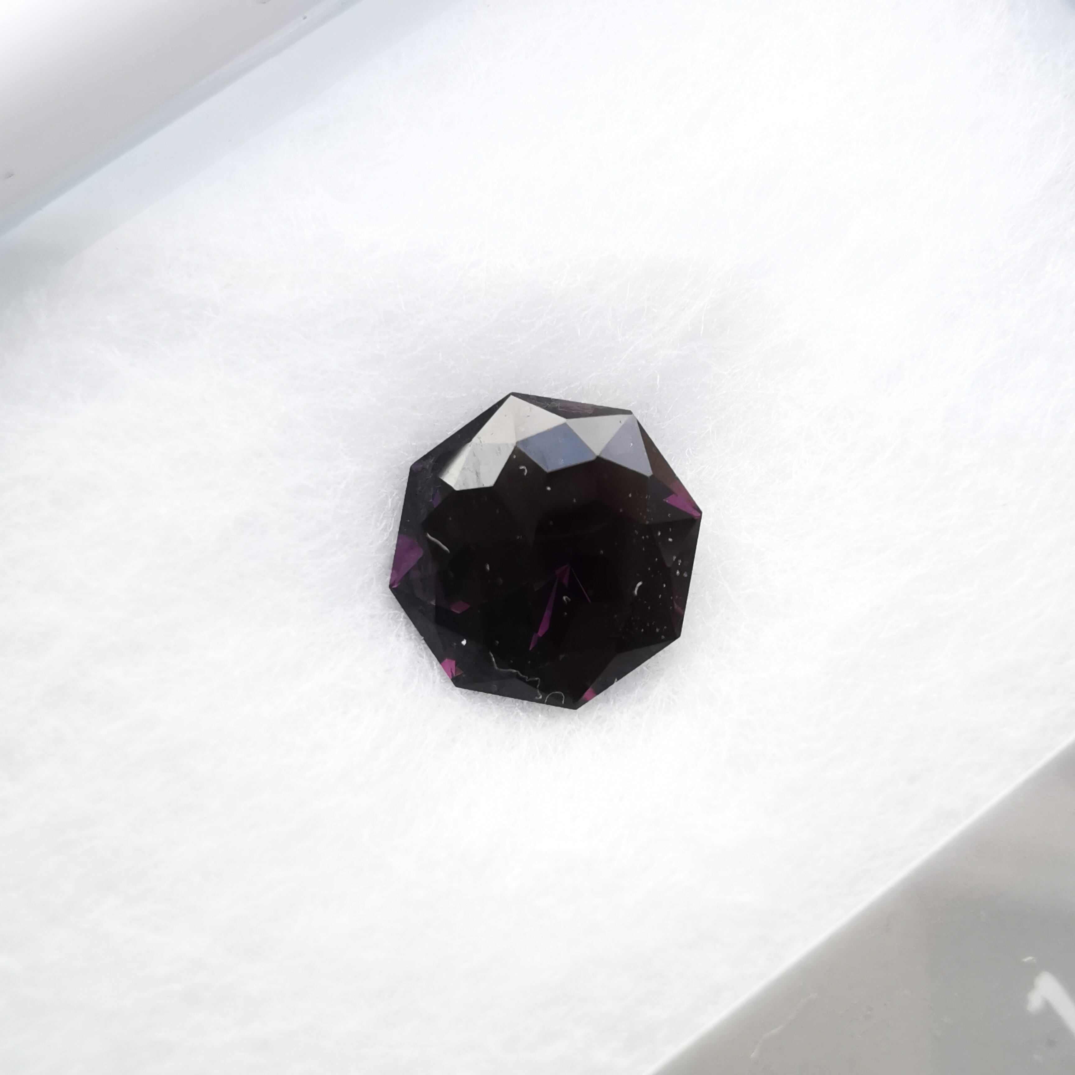 ごく暗いパープルピンク/バーガンディーカラーから、ローズピンクがきらめくスピネルです。
