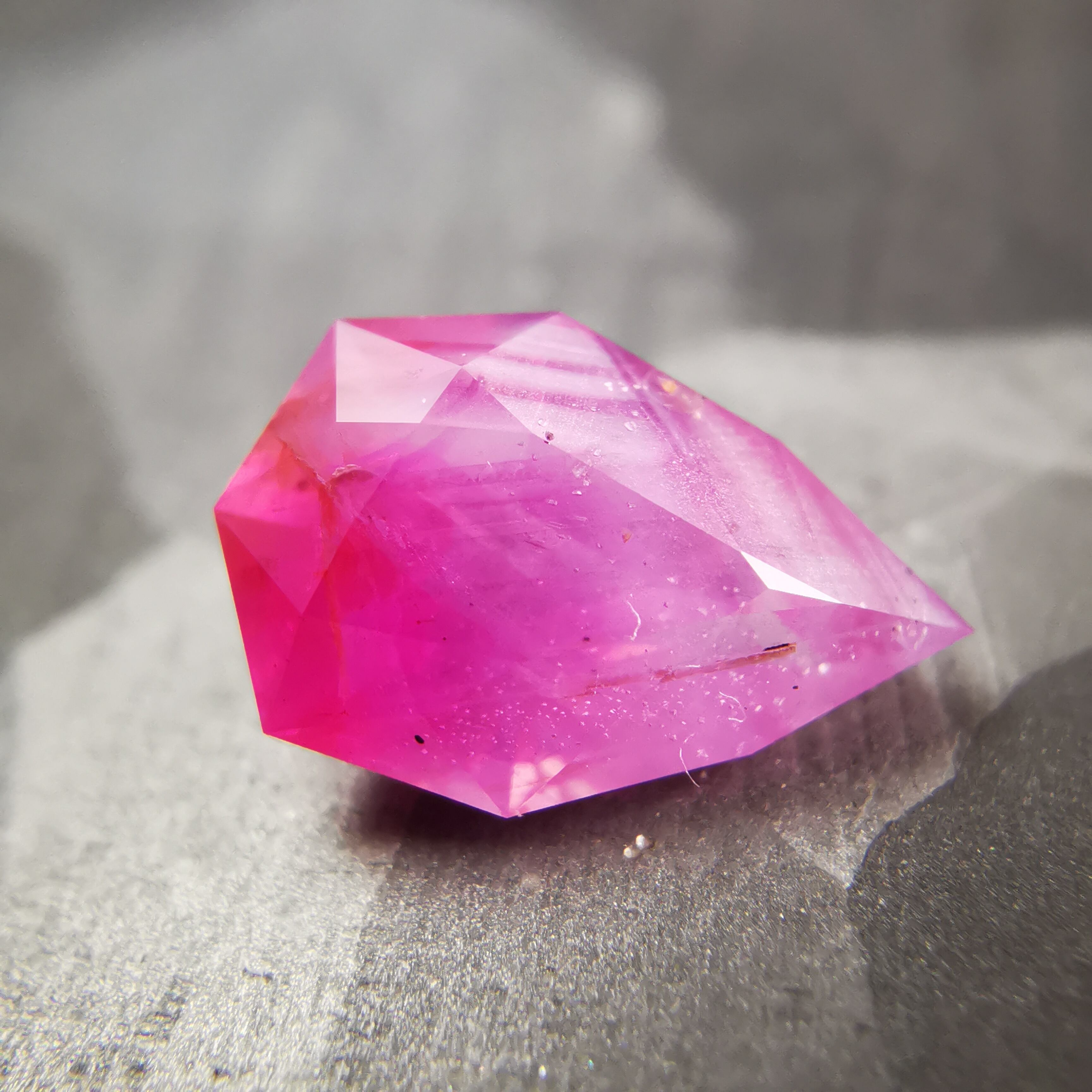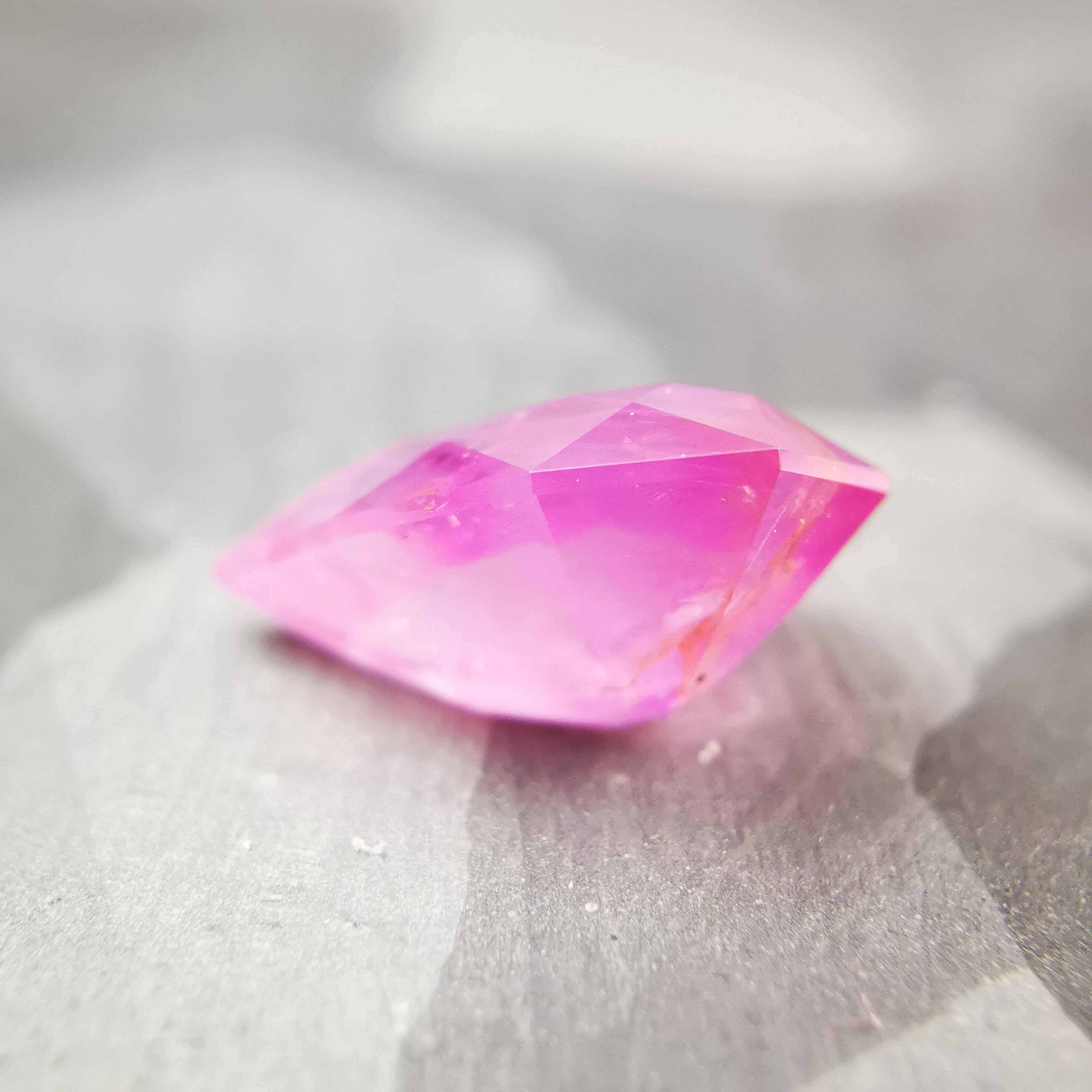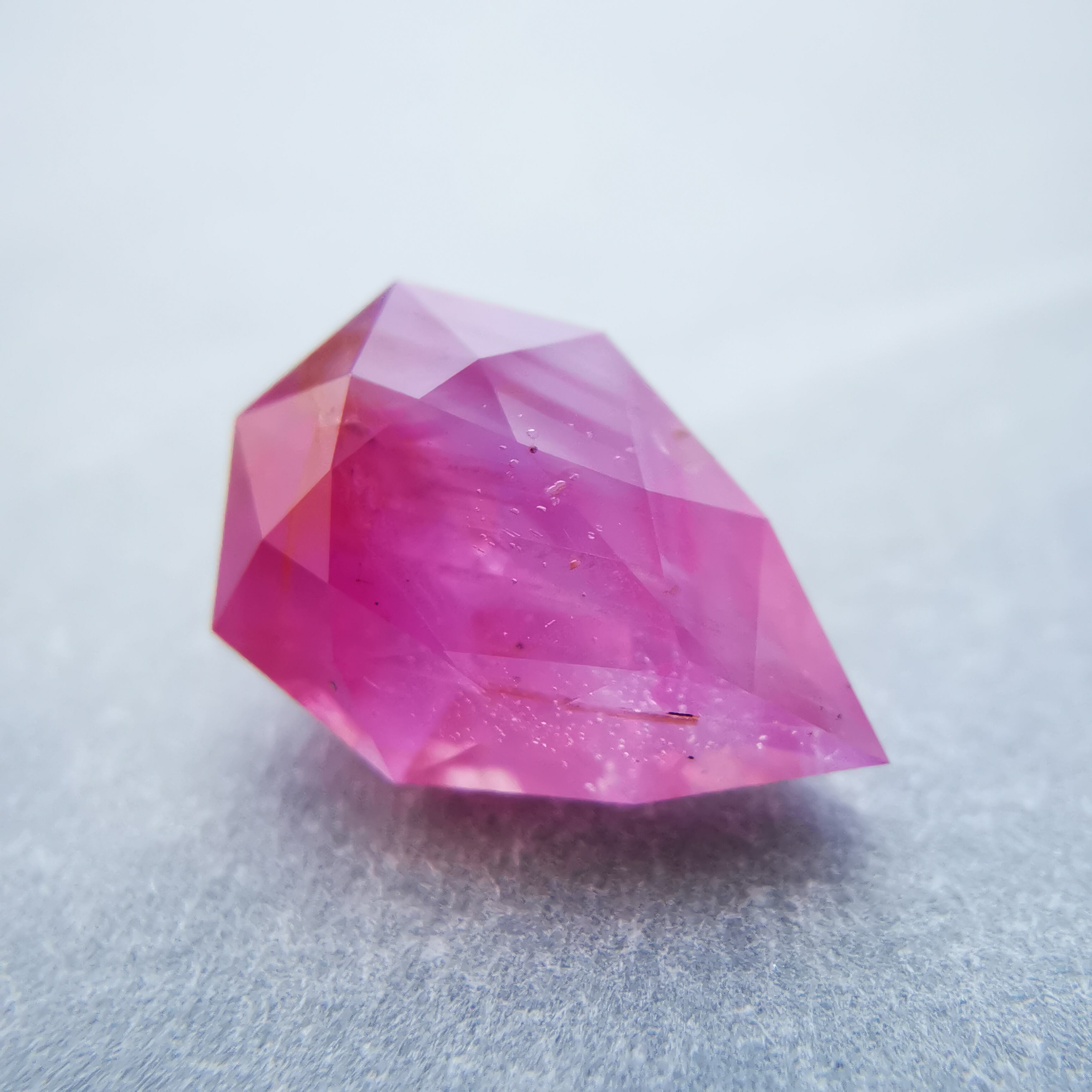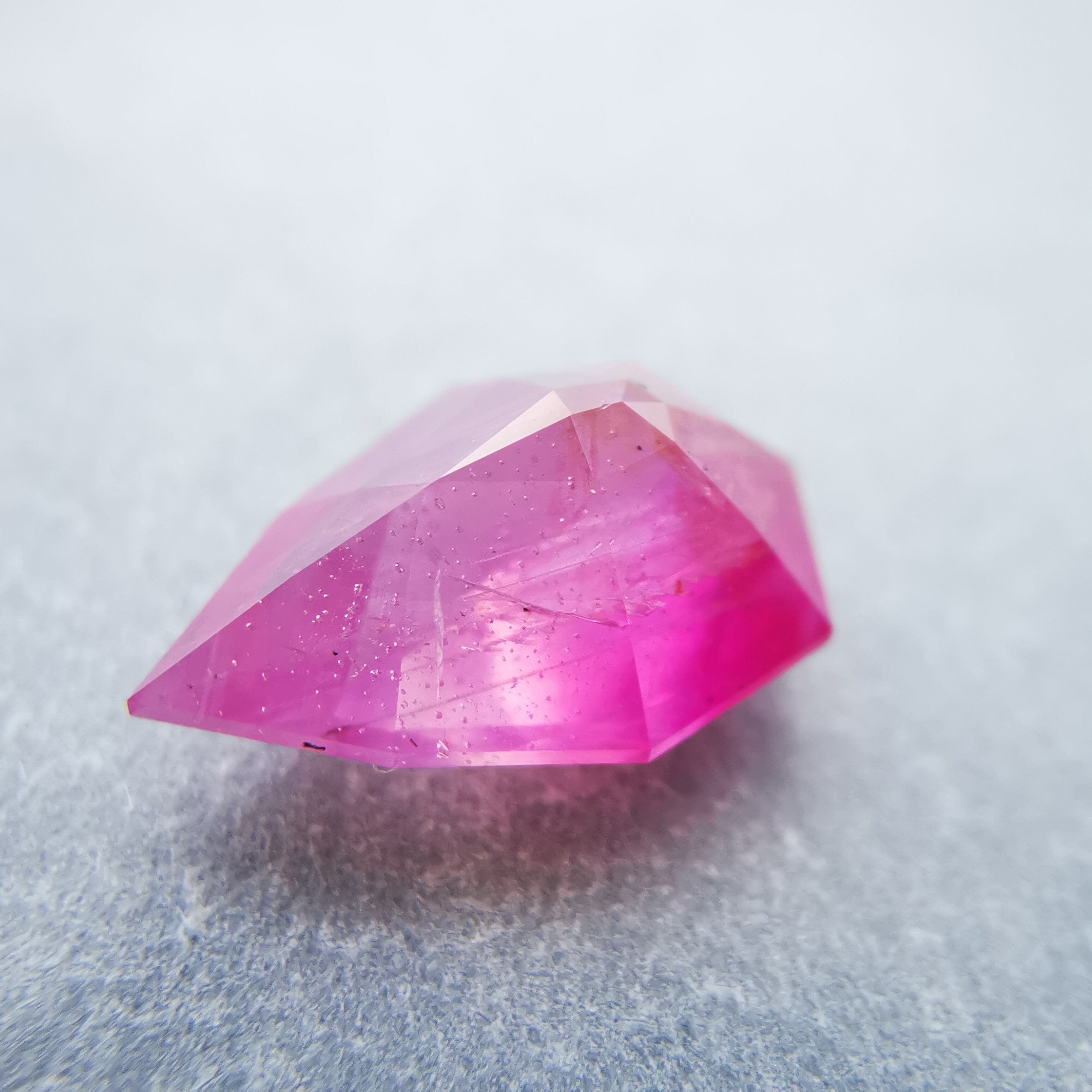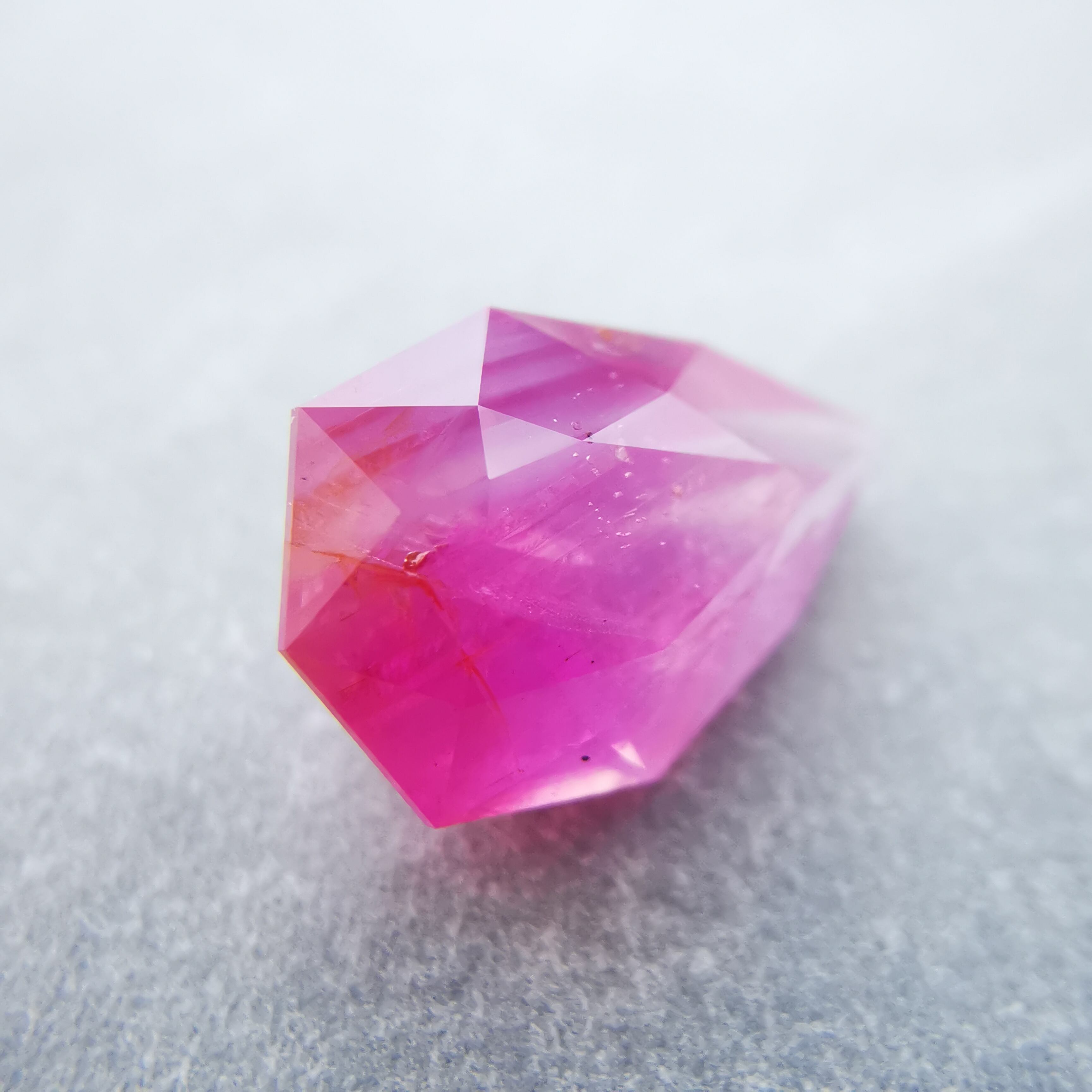 ペアシェイプの先端の方はシクラメンピンク/柔らかなピンク、おしりの片側はマゼンタピンク/鮮やかなピンクへ、グラデーションがキャンディーのようなサファイアです。