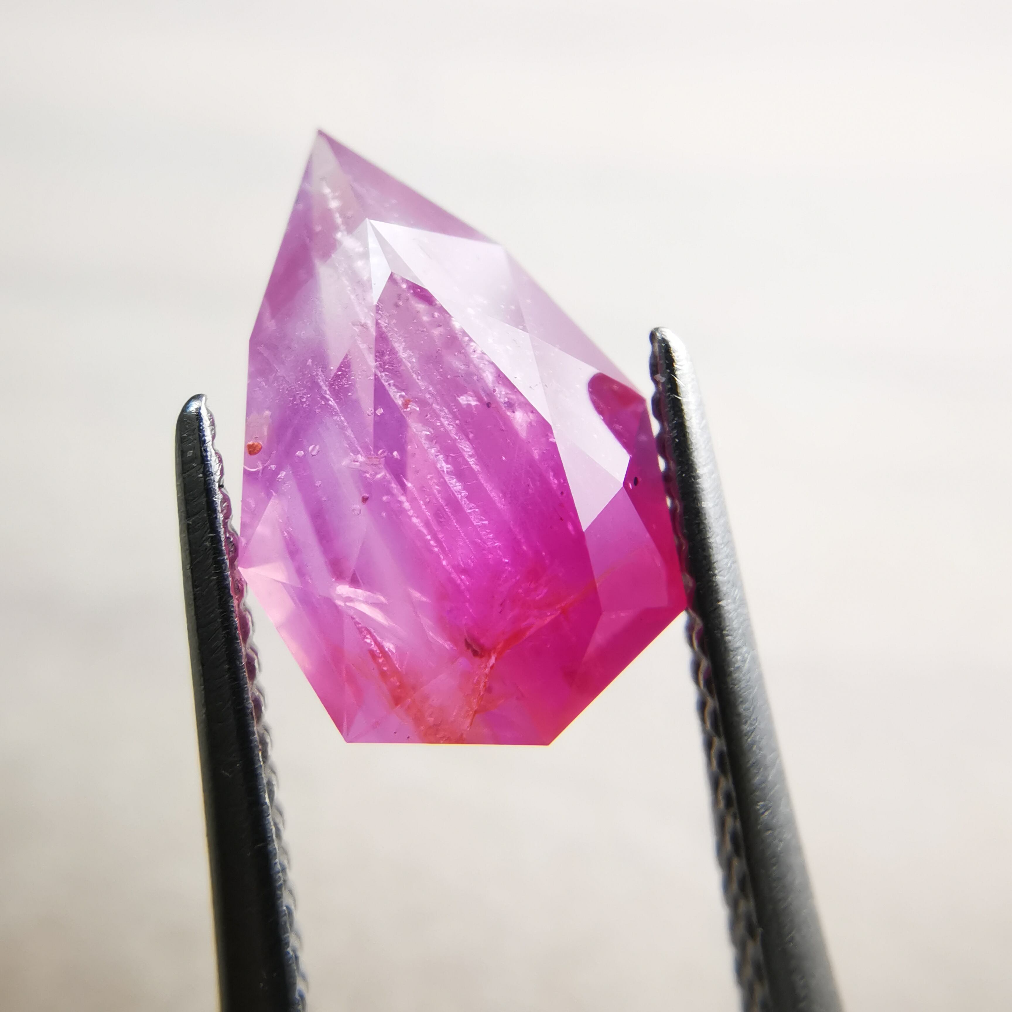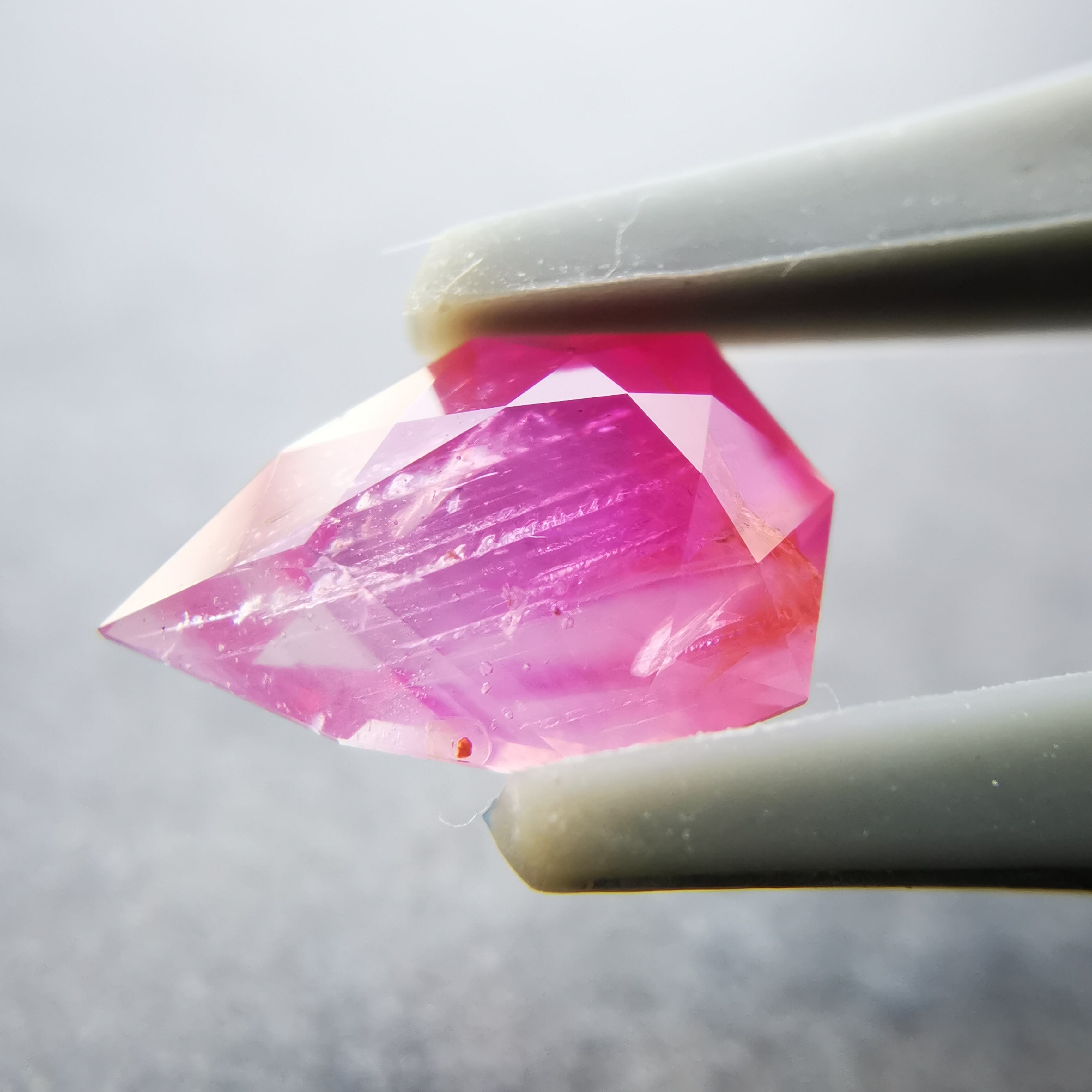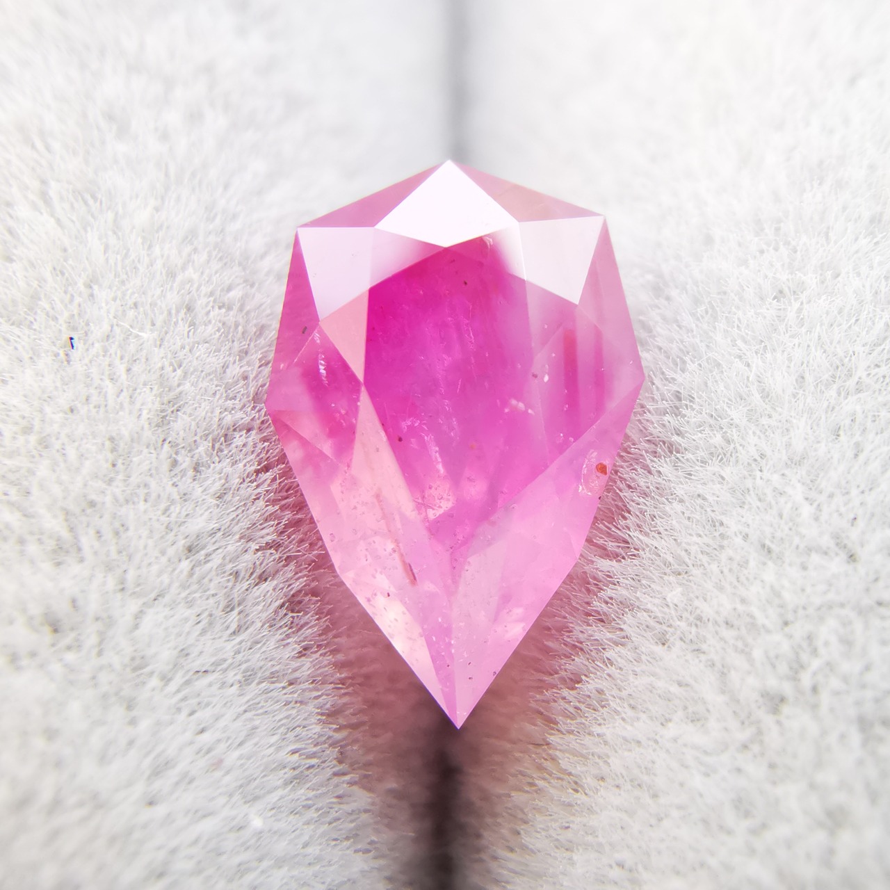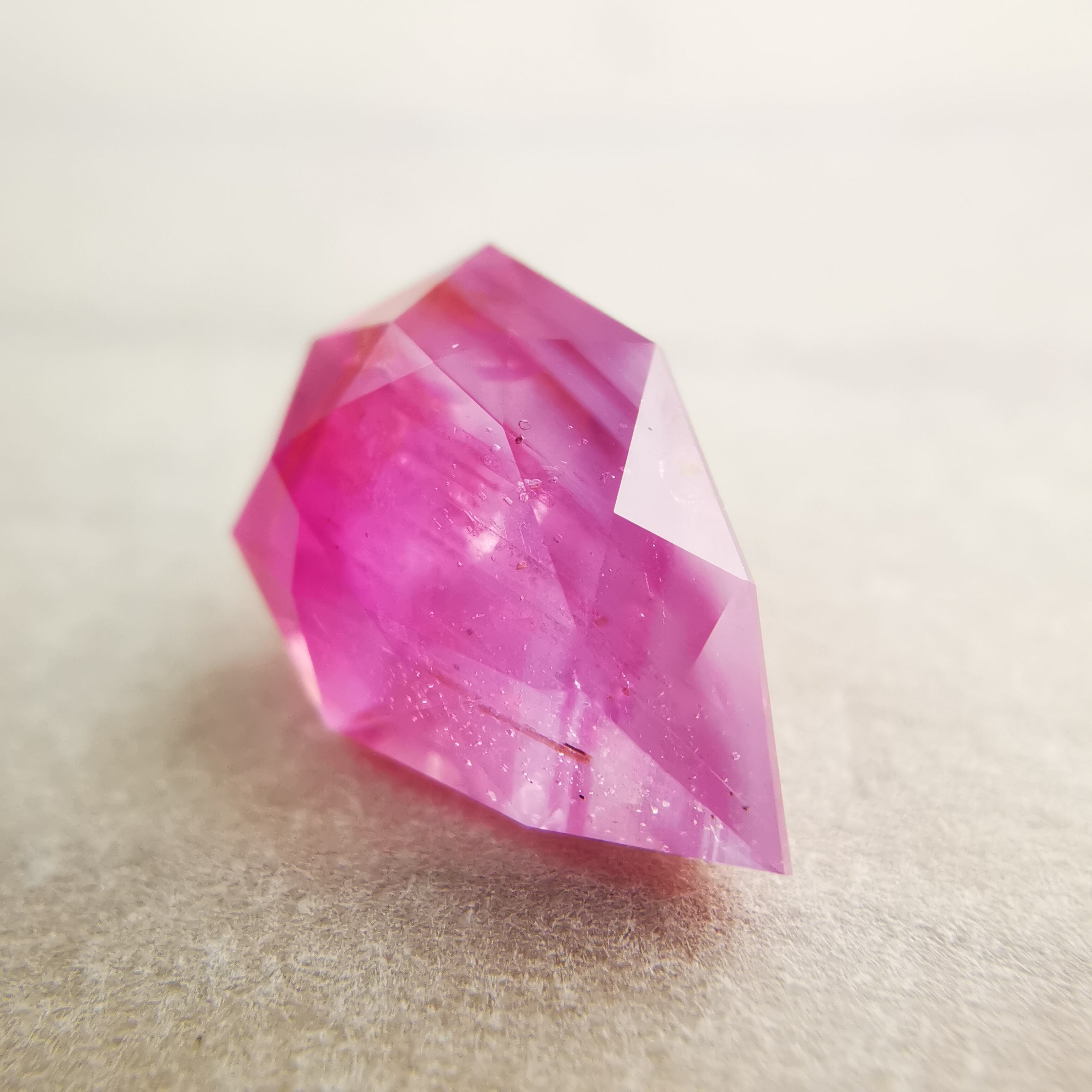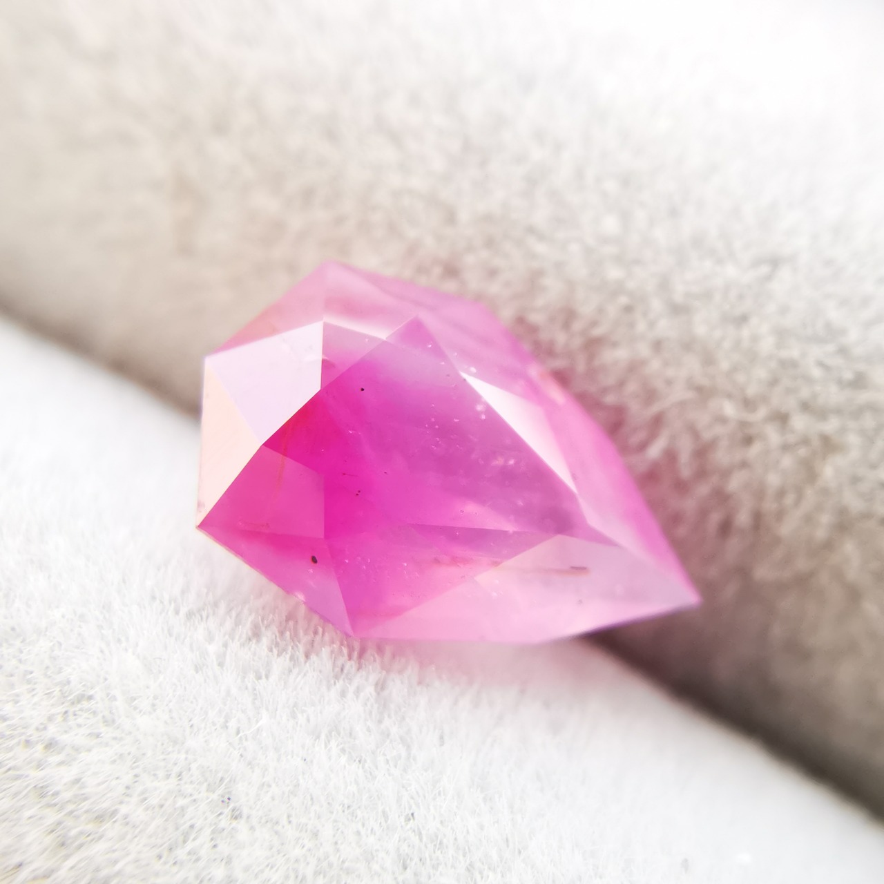 ペアシェイプの先端の方はシクラメンピンク/柔らかなピンク、おしりの片側はマゼンタピンク/鮮やかなピンクへ、グラデーションがキャンディーのようなサファイアです。