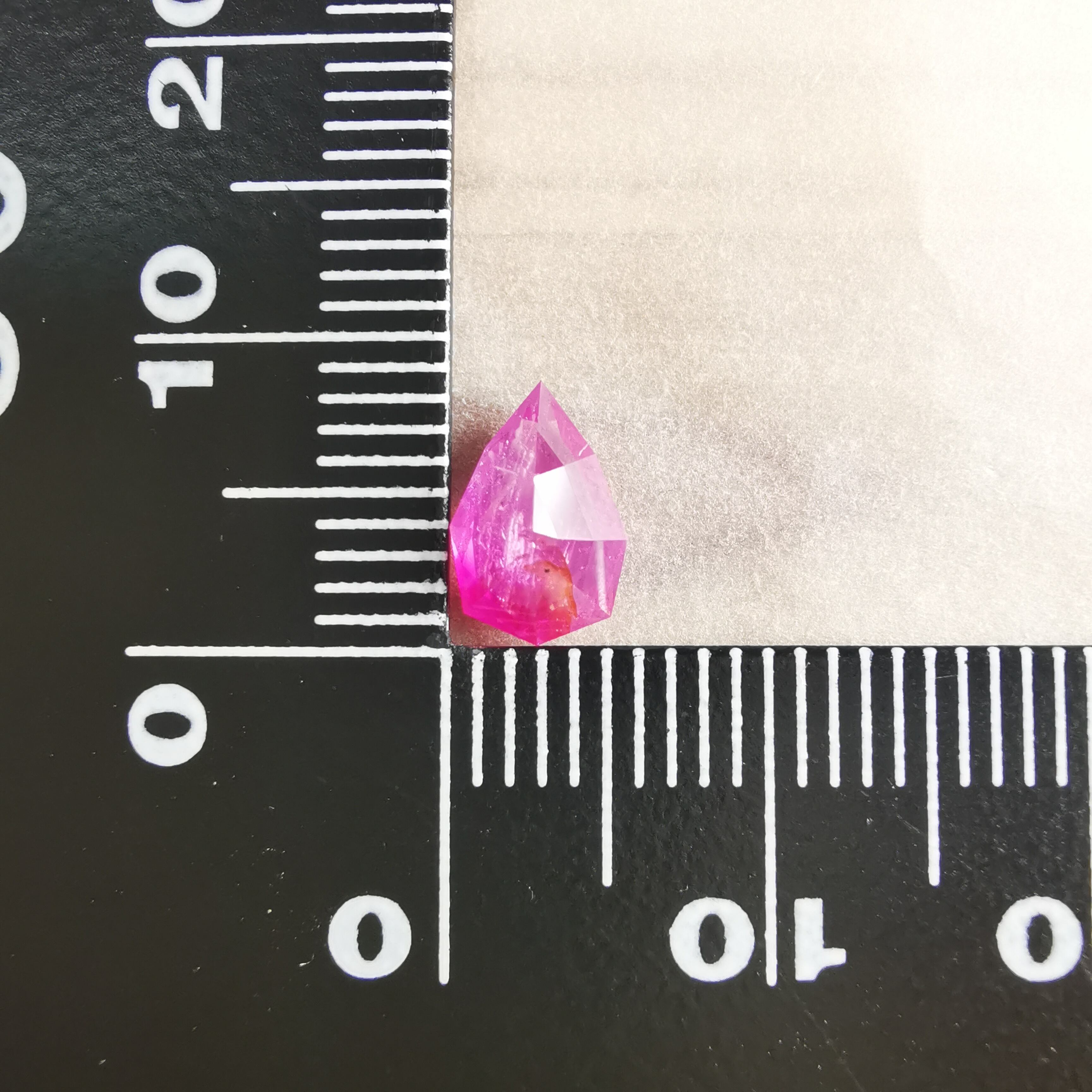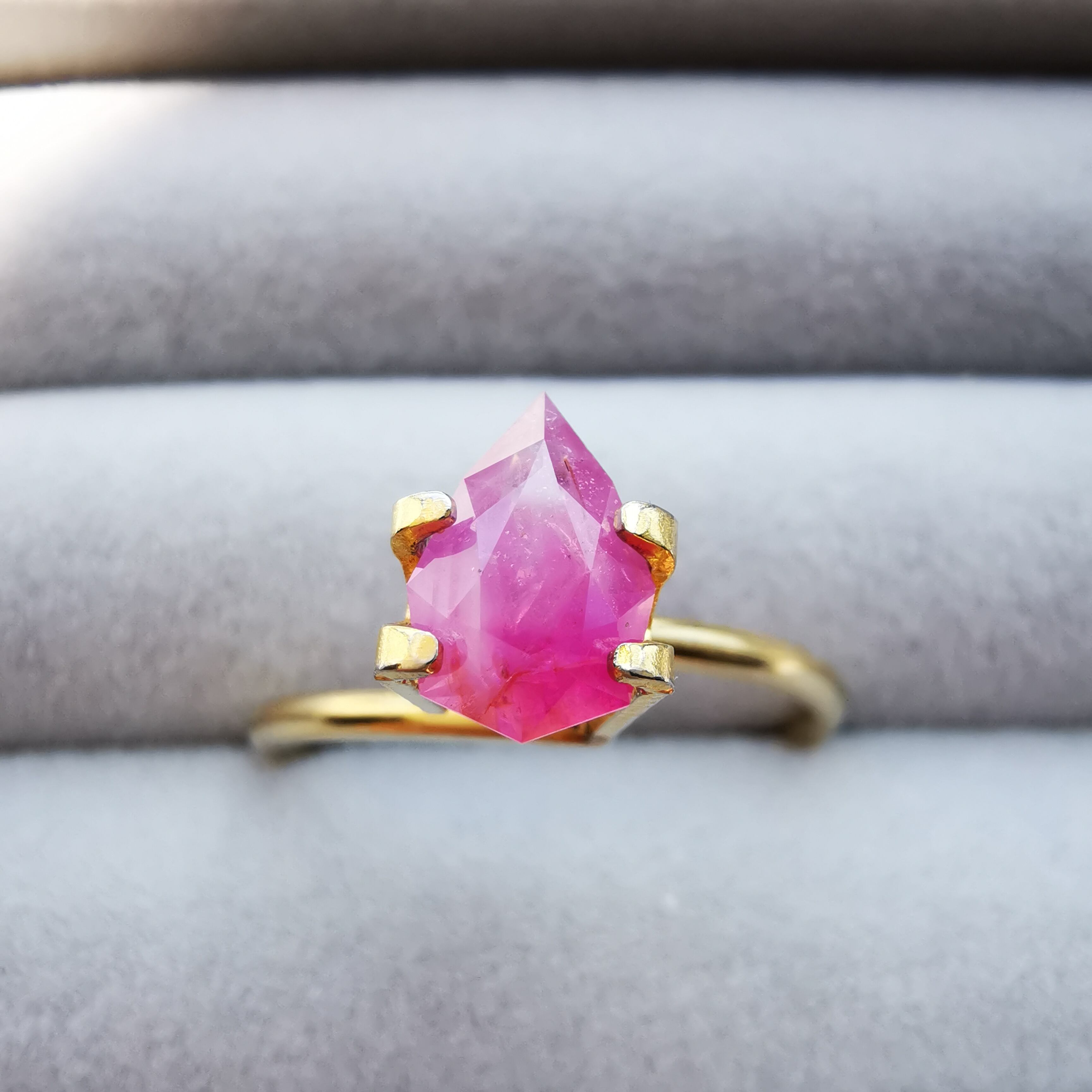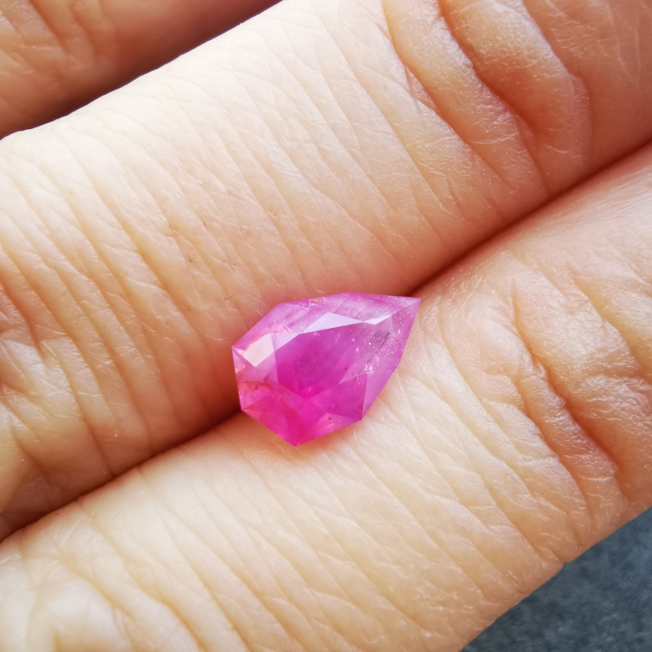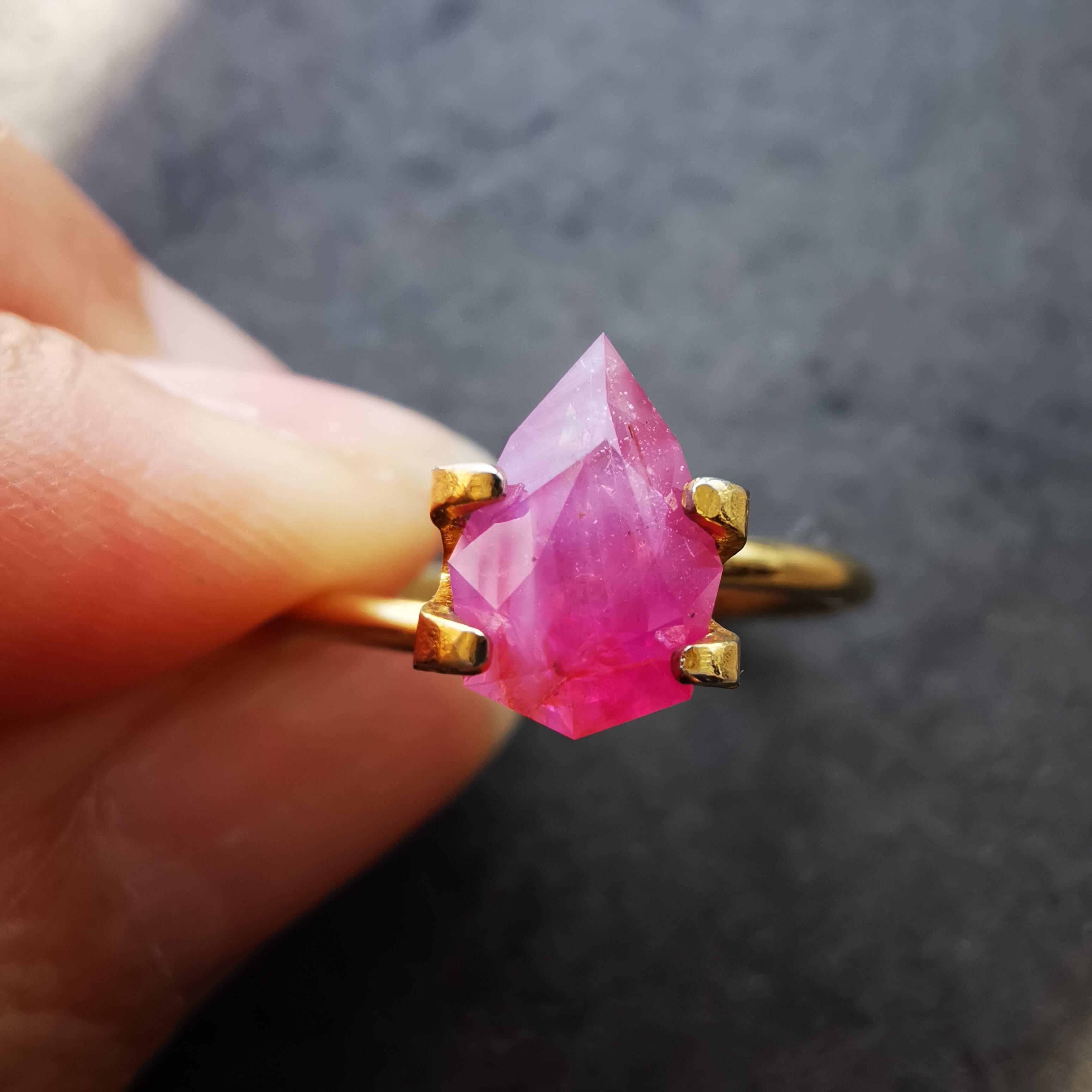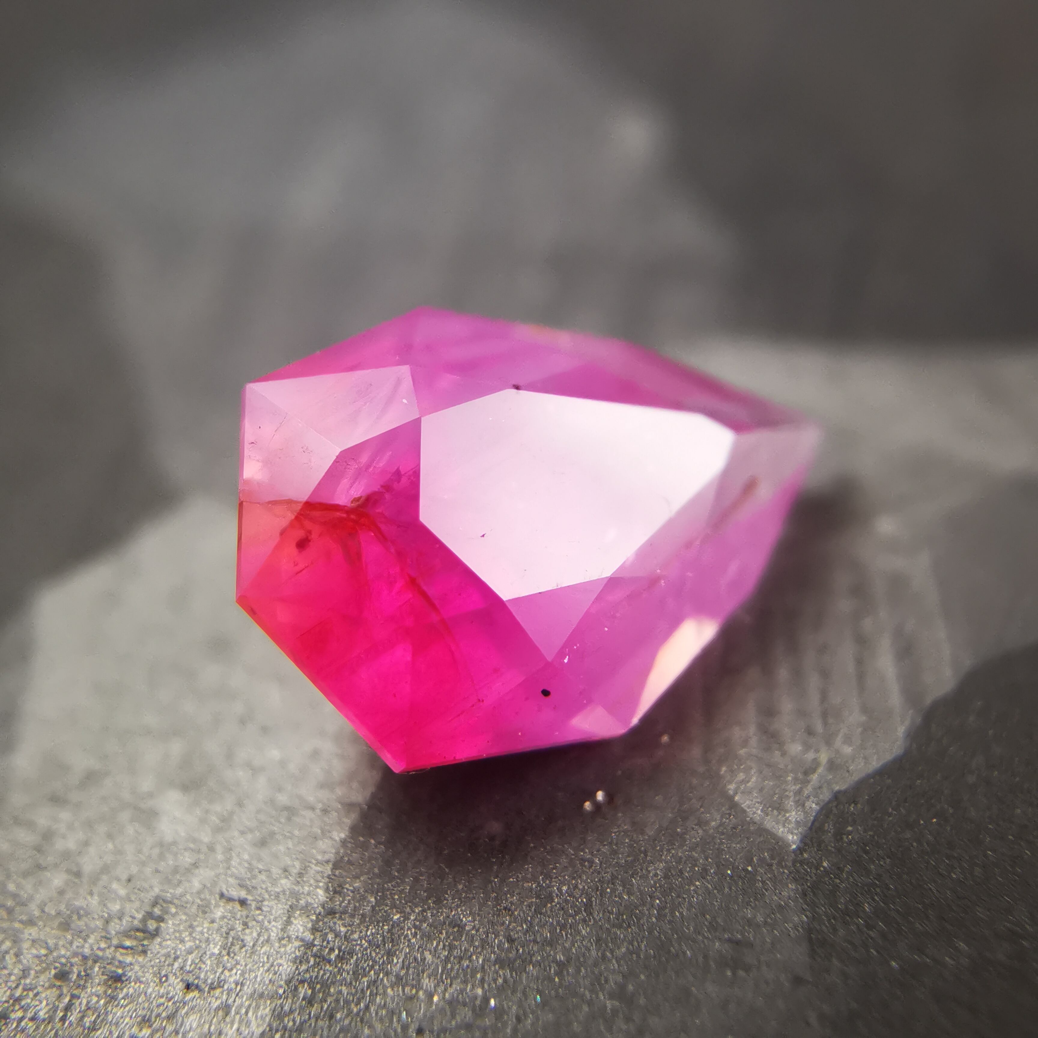 ペアシェイプの先端の方はシクラメンピンク/柔らかなピンク、おしりの片側はマゼンタピンク/鮮やかなピンクへ、グラデーションがキャンディーのようなサファイアです。
